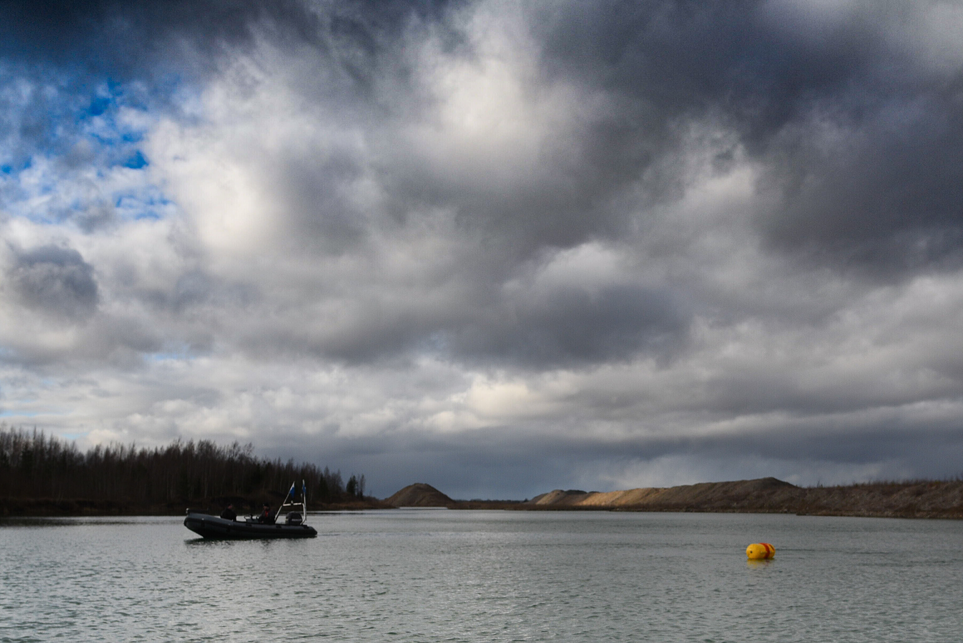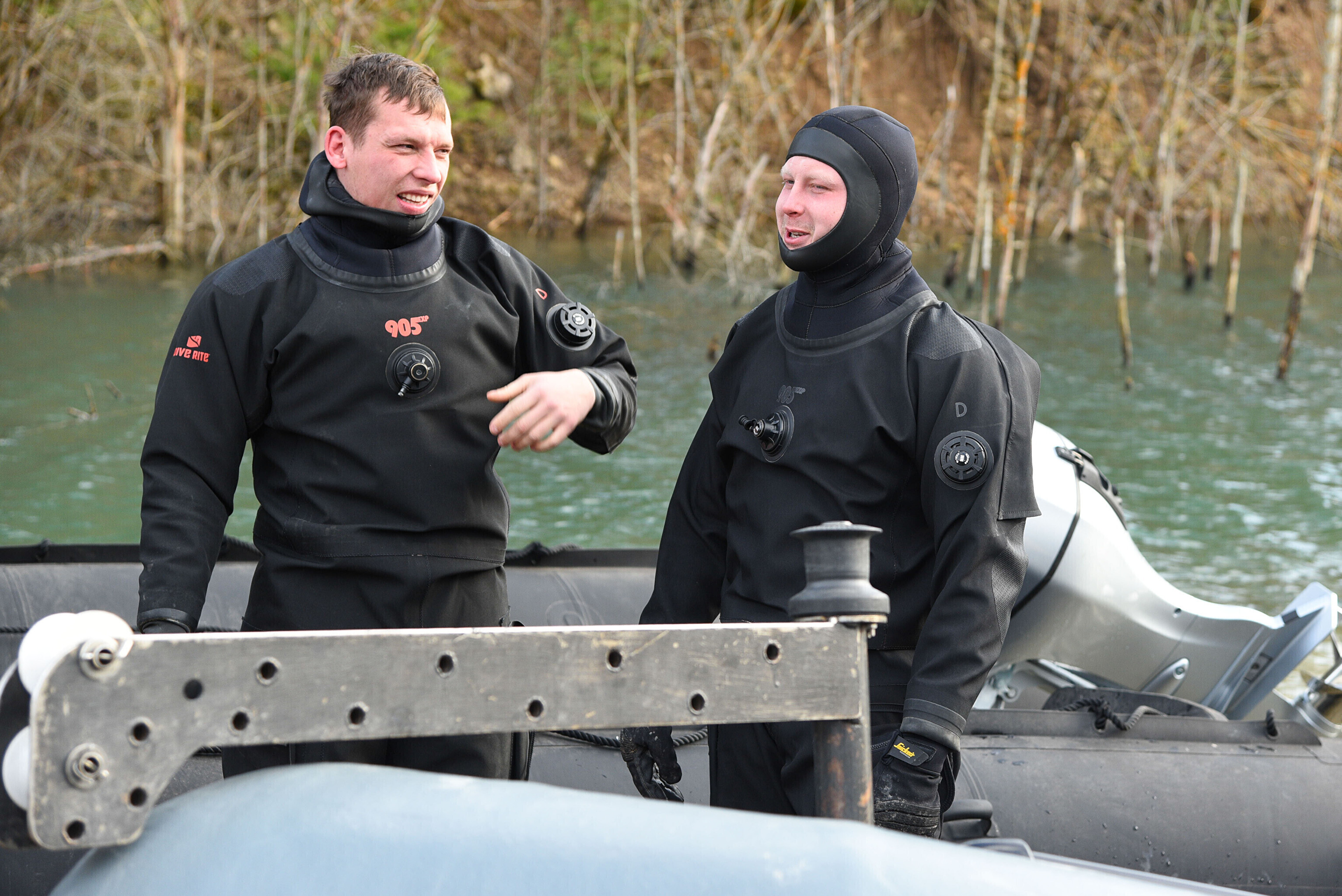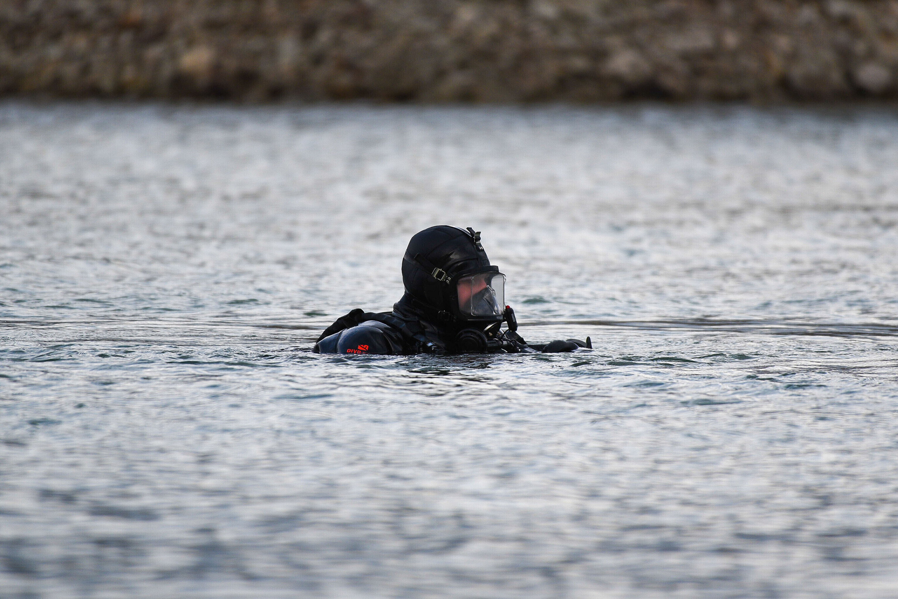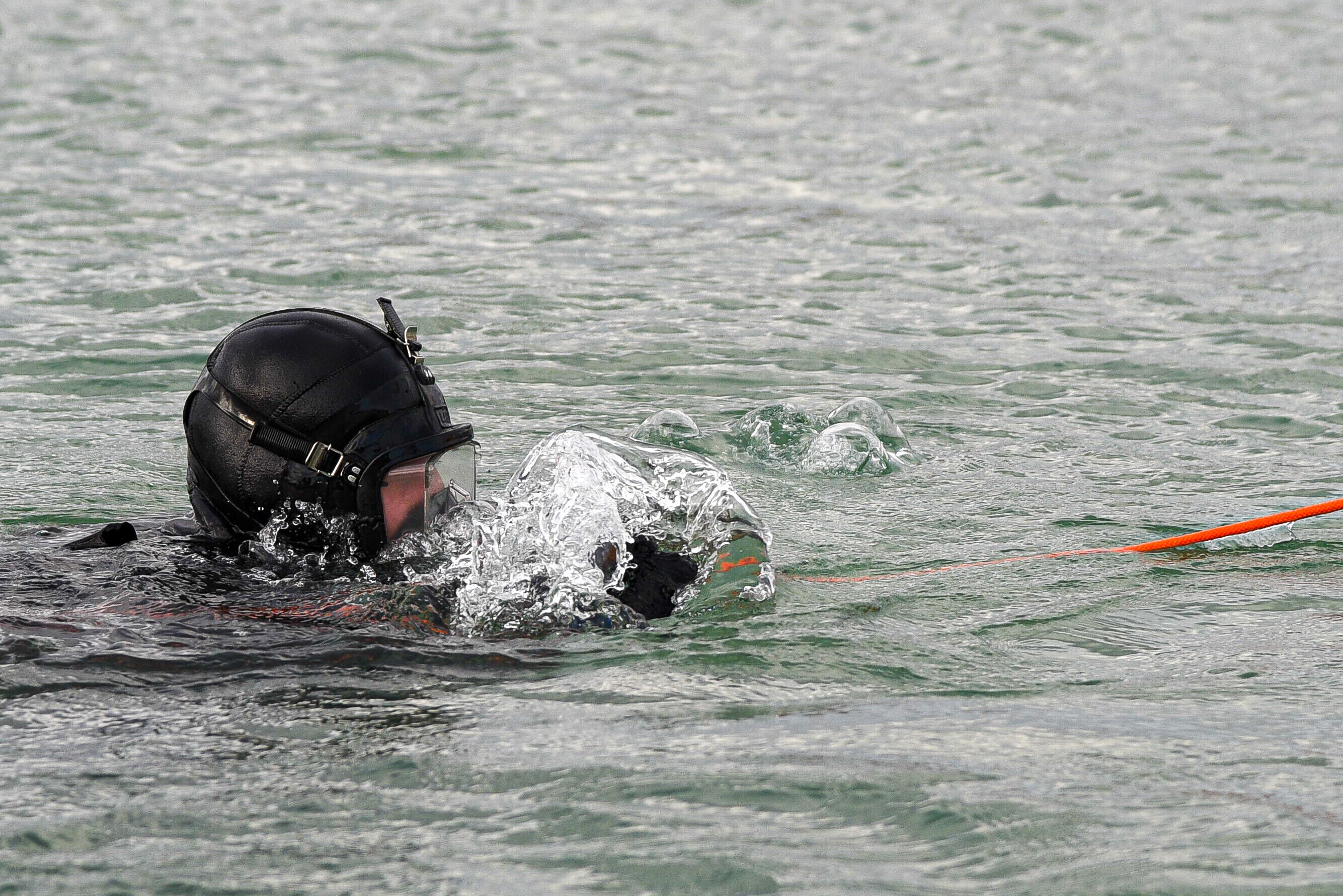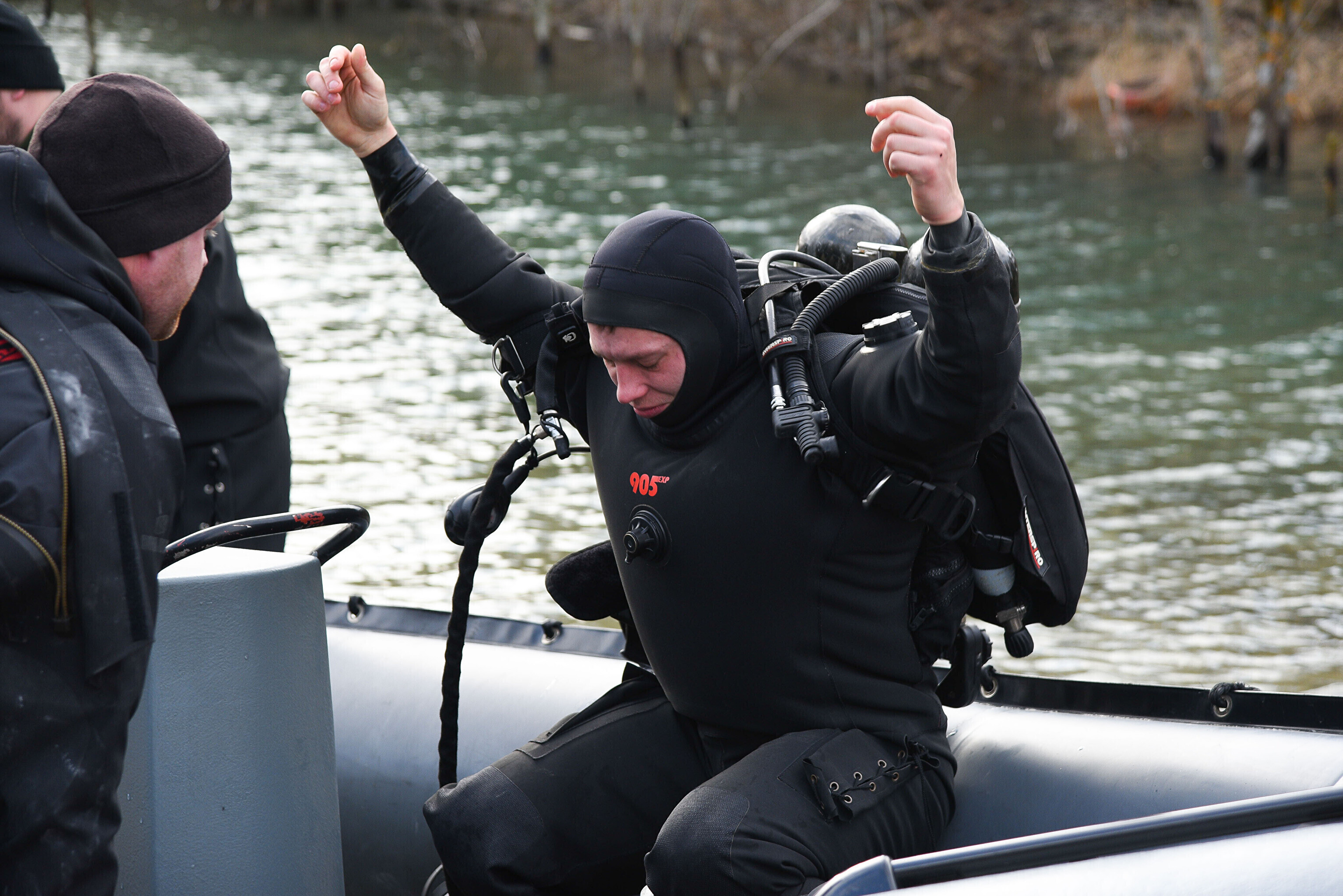 На воде нет льда, а основной целью лагеря была отработка действий подо льдом. Несмотря на это, достаточная глубина карьера все-таки позволяет водолазам отрабатывать поставленные задачи.