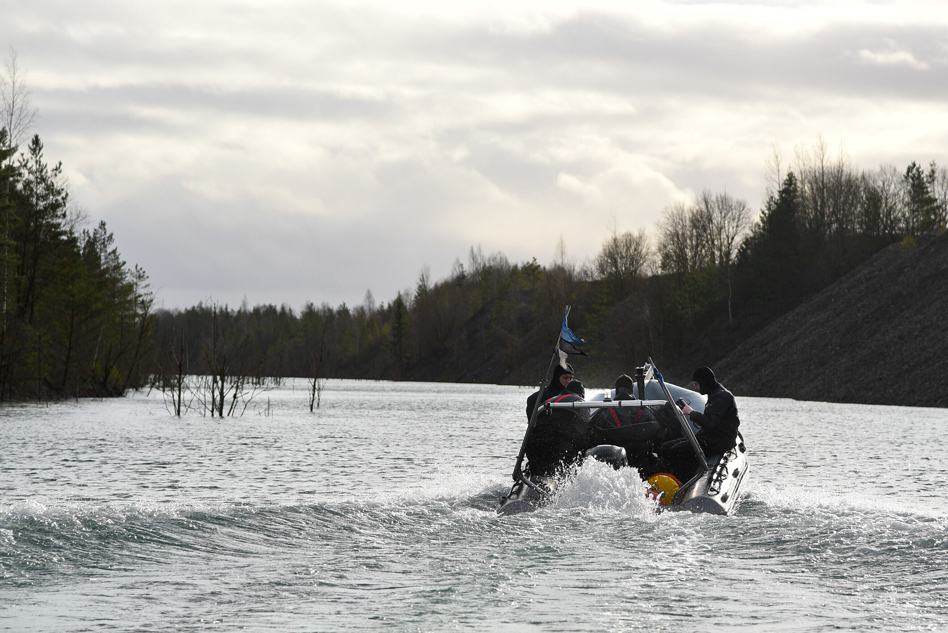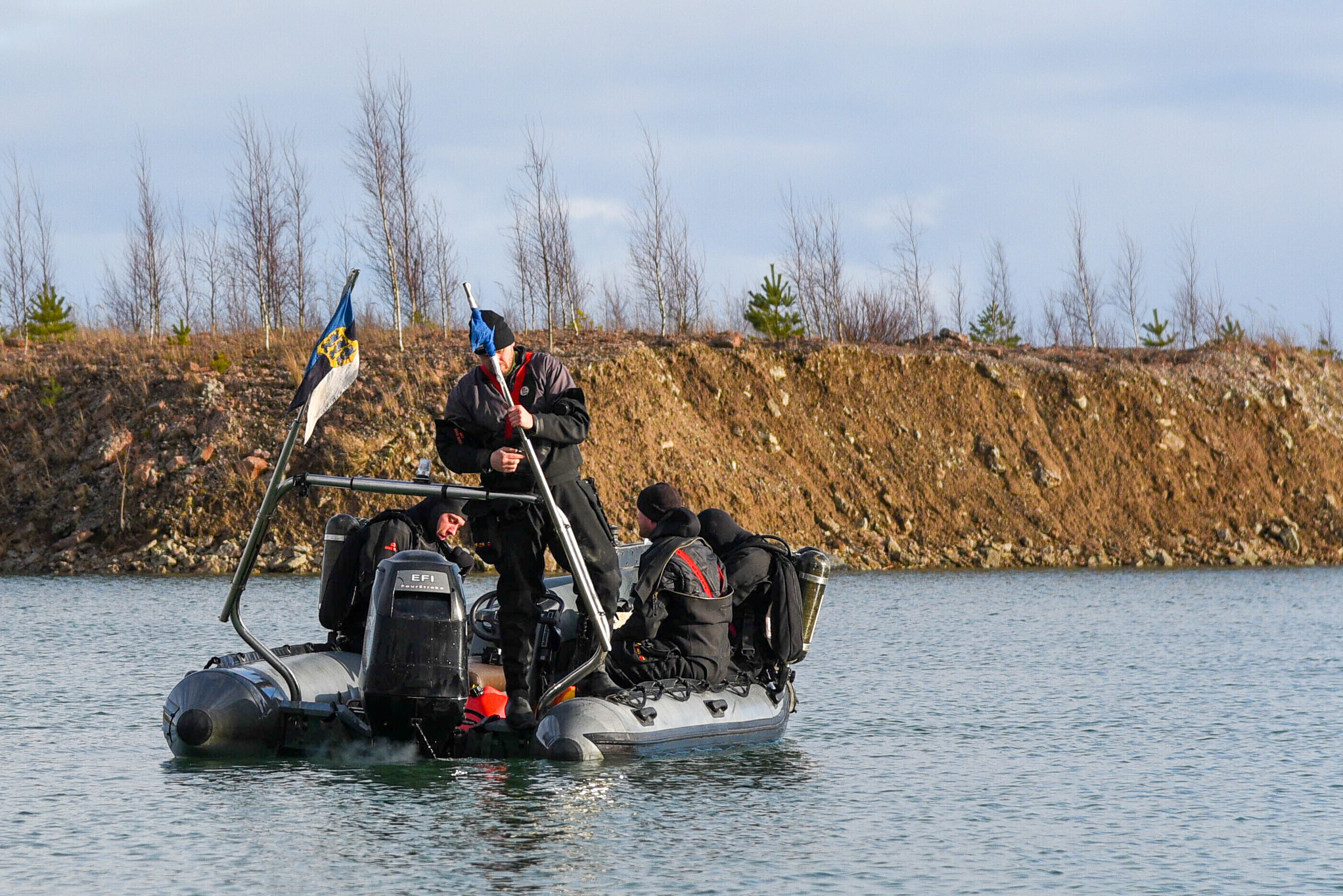 Водолазы военно-морских сил Эстонии на территории заполненного водой бывшего сланцевого карьера Айду в Ида-Вирумаа проводят зимние учения по подводному разминированию.