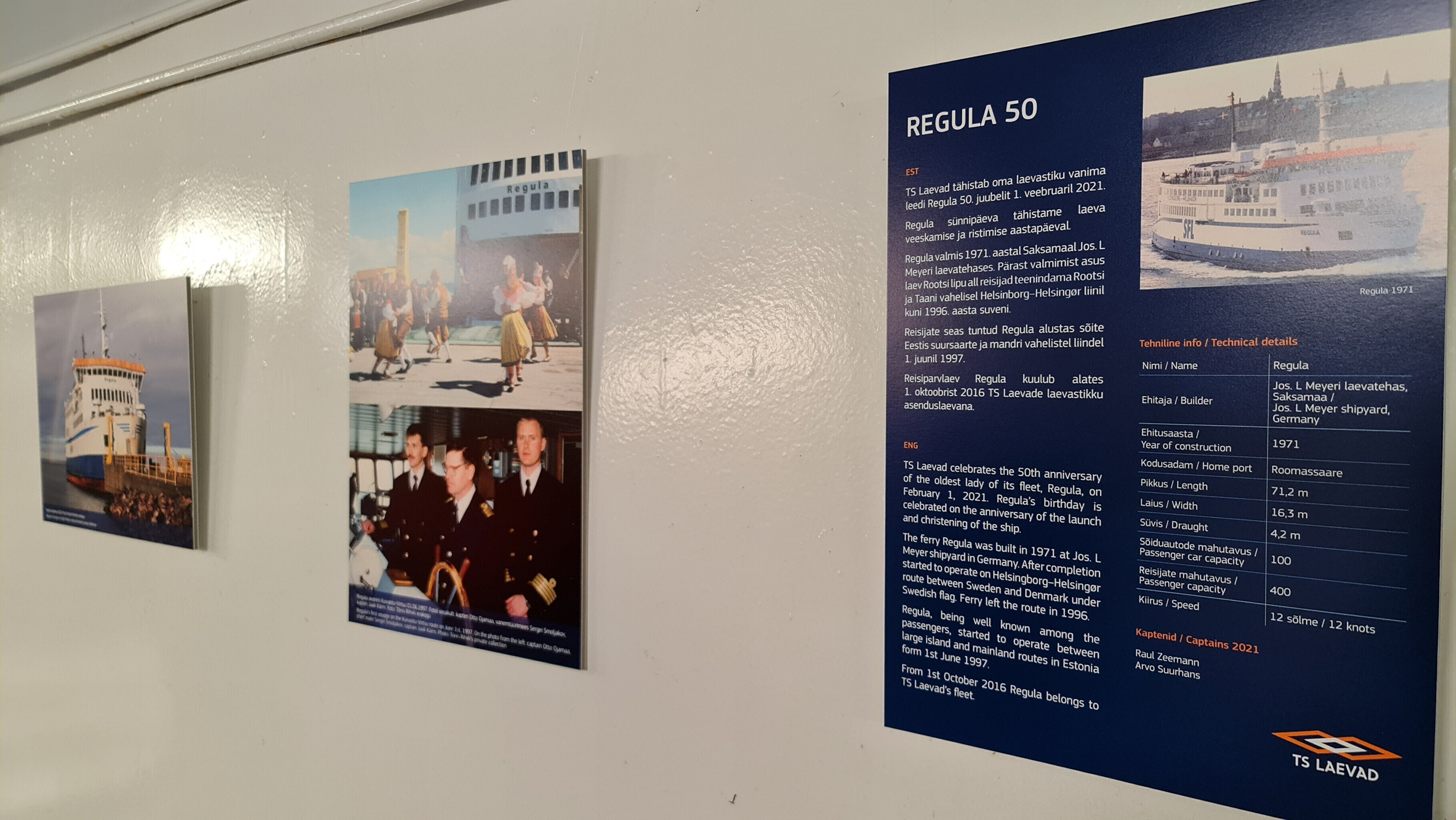 Старейшему судну флота компании TS Laevad парому Regula 1 февраля исполнилось 50 лет. По случаю круглой даты на палубе собрались бывшие члены экипажа, также была открыта выставка о пароме.