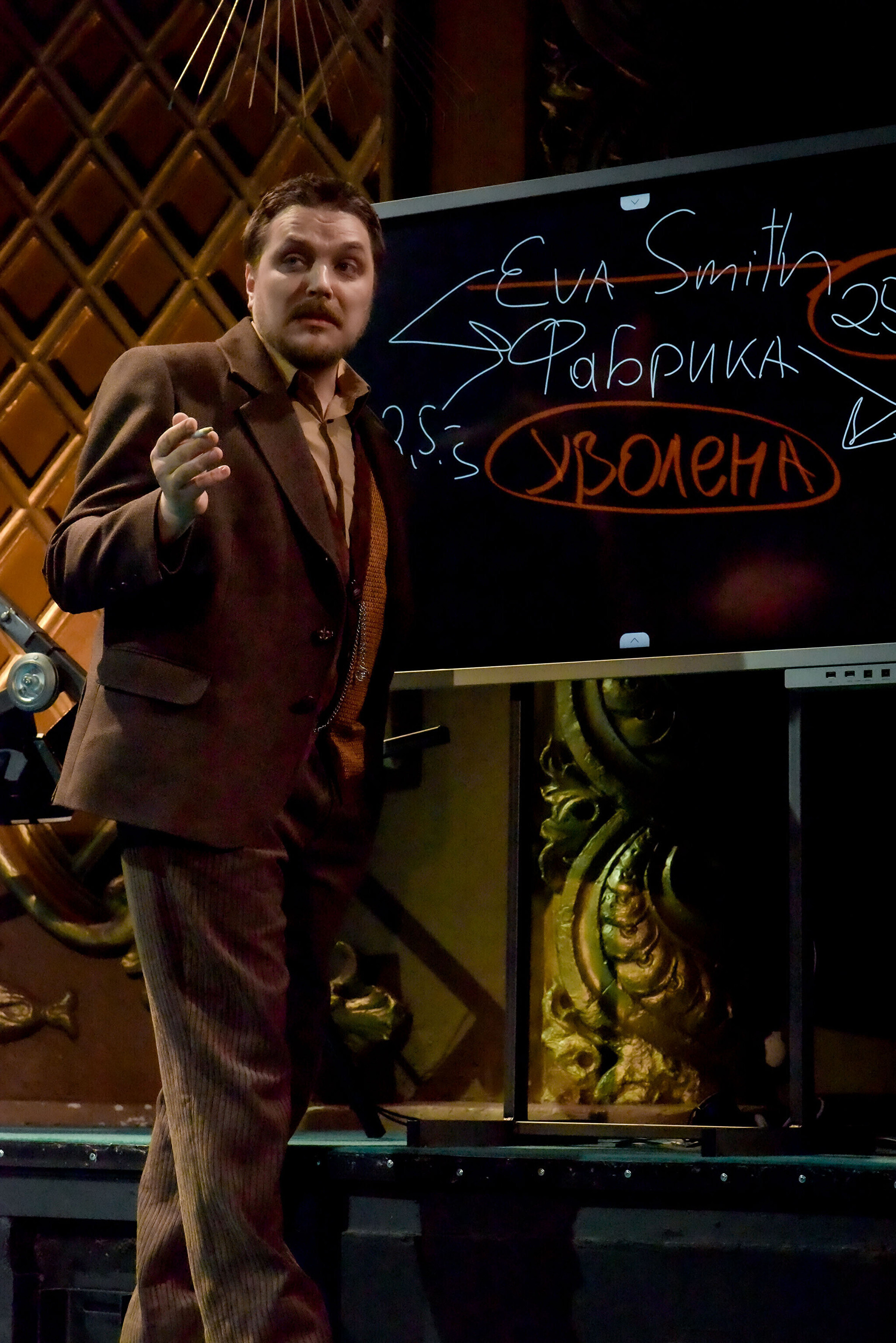 С доской связан и самый забавный момент премьеры, когда инспектор написал слово "помощ" без мягкого знака, и в зале начались перешептывания, а кое-где и смешки. Гул нарастал, и инспектор Гул в лице Гареева почуял, в чем подвох, и под бурные аплодисменты вписал недостающую букву. Мощь! Подобный успех может вдохновить режиссера Филиппа Лося и оставить этот ход.