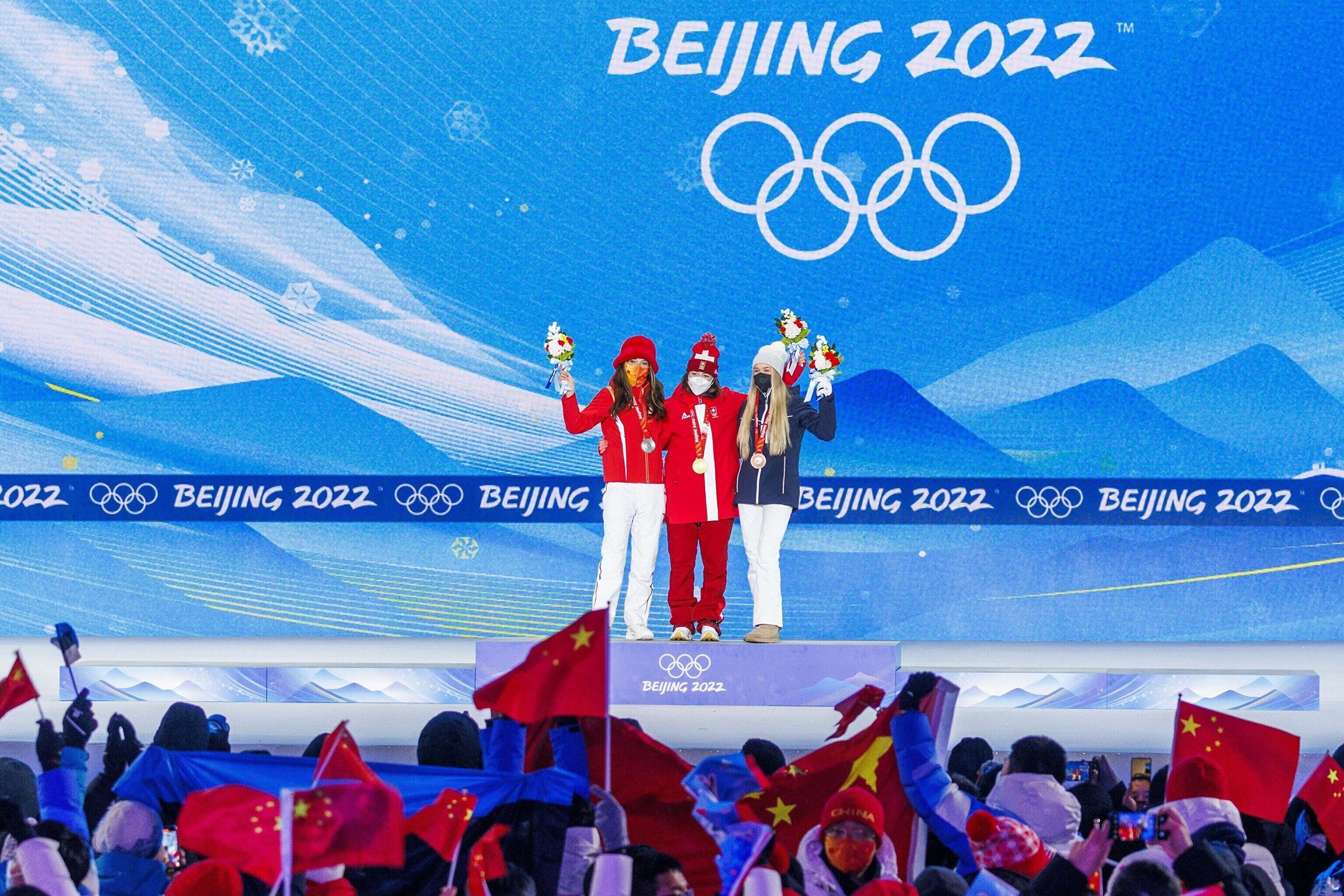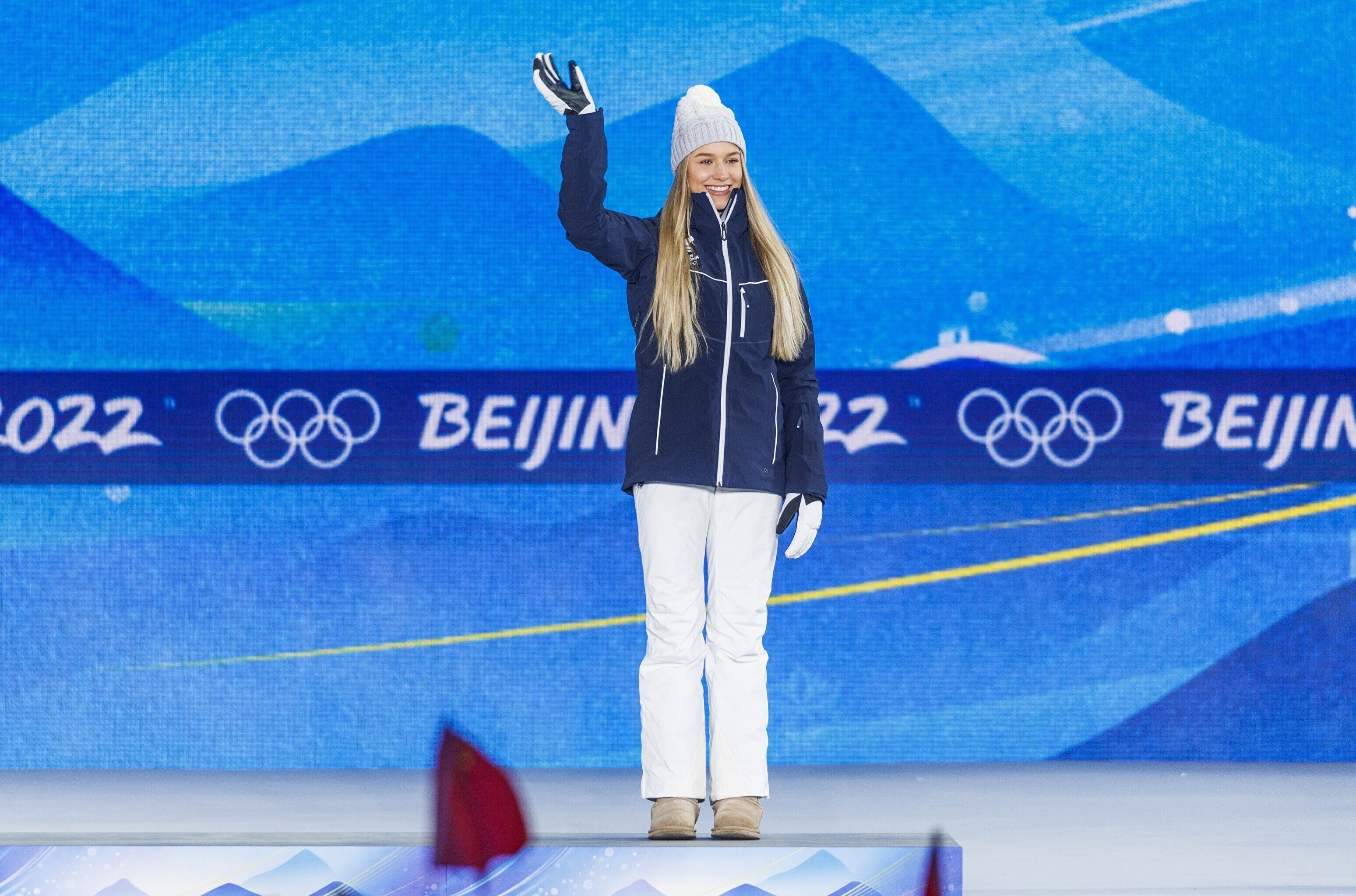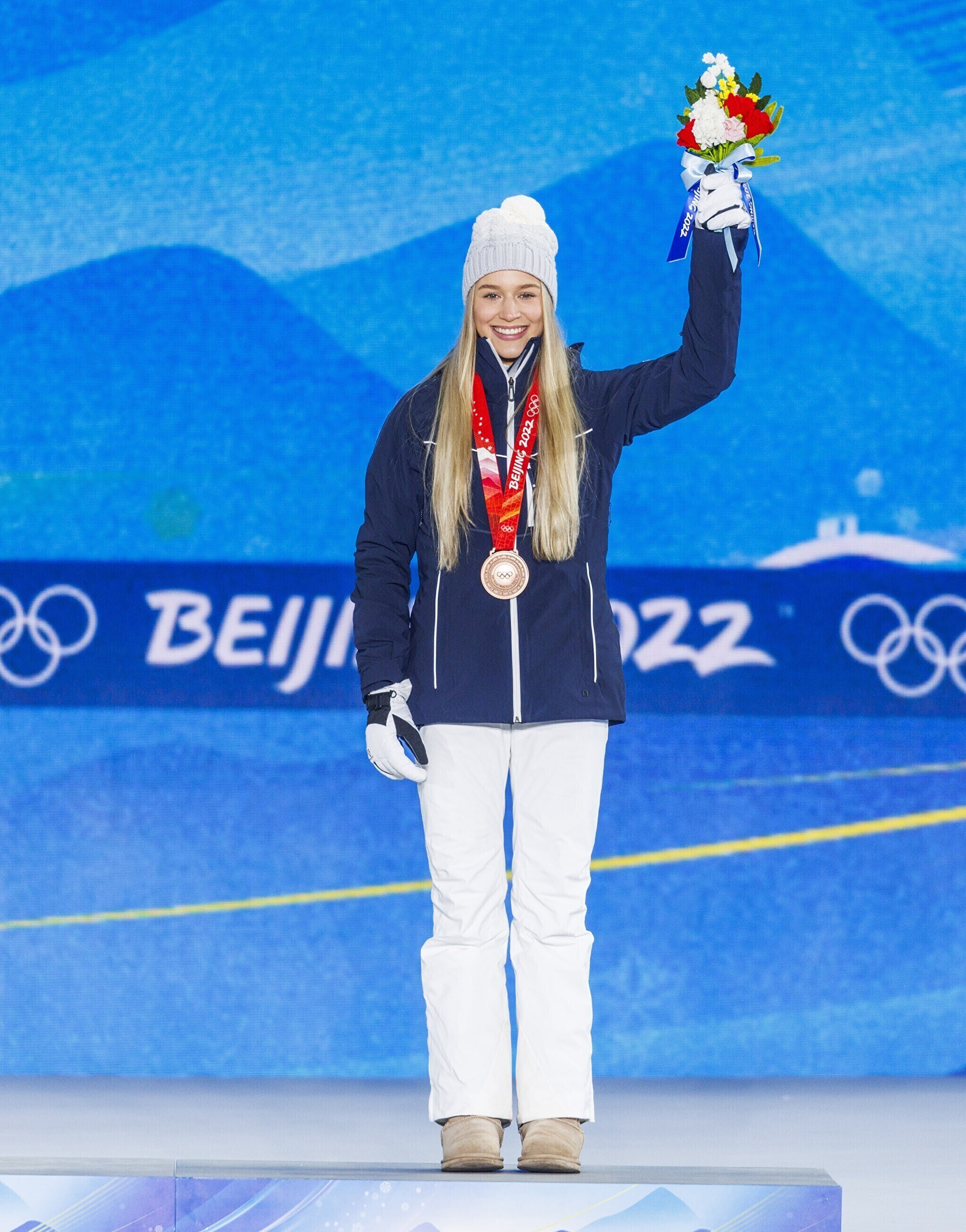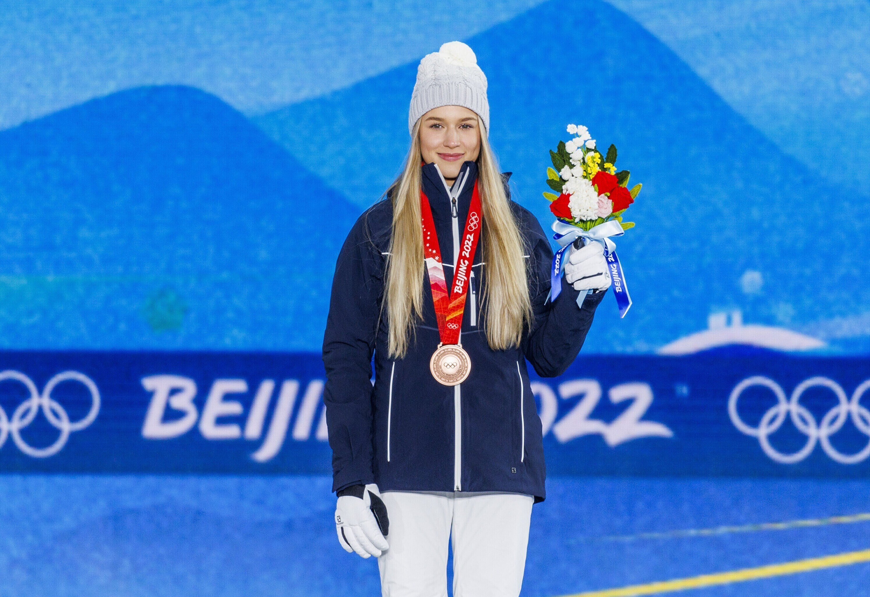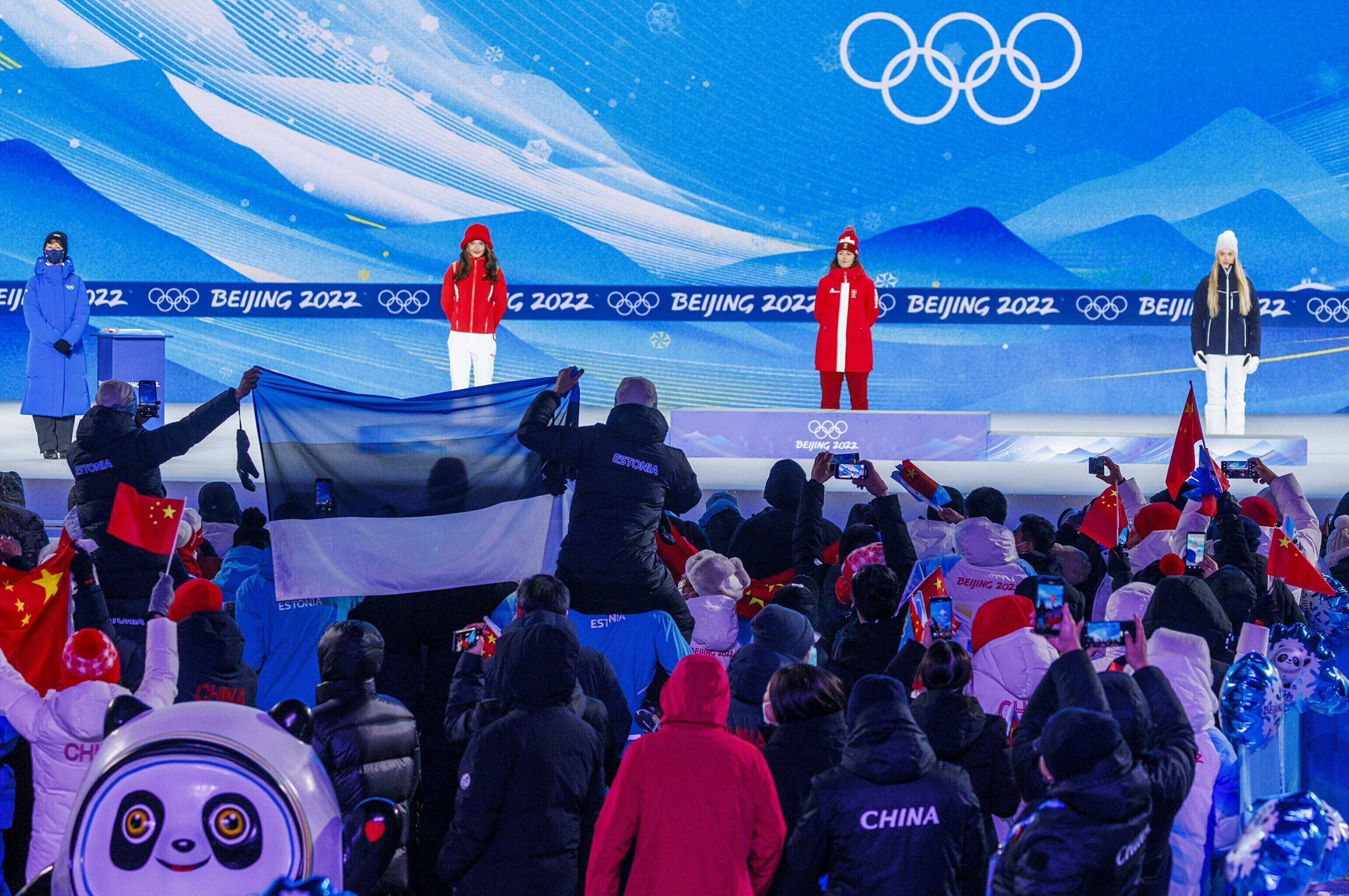 Эстонская фристайлистка Келли Сильдару на торжественной церемонии получила бронзовую медаль за третье место на соревнованиях по слоупстайлу на Олимпийских играх в Пекине.
