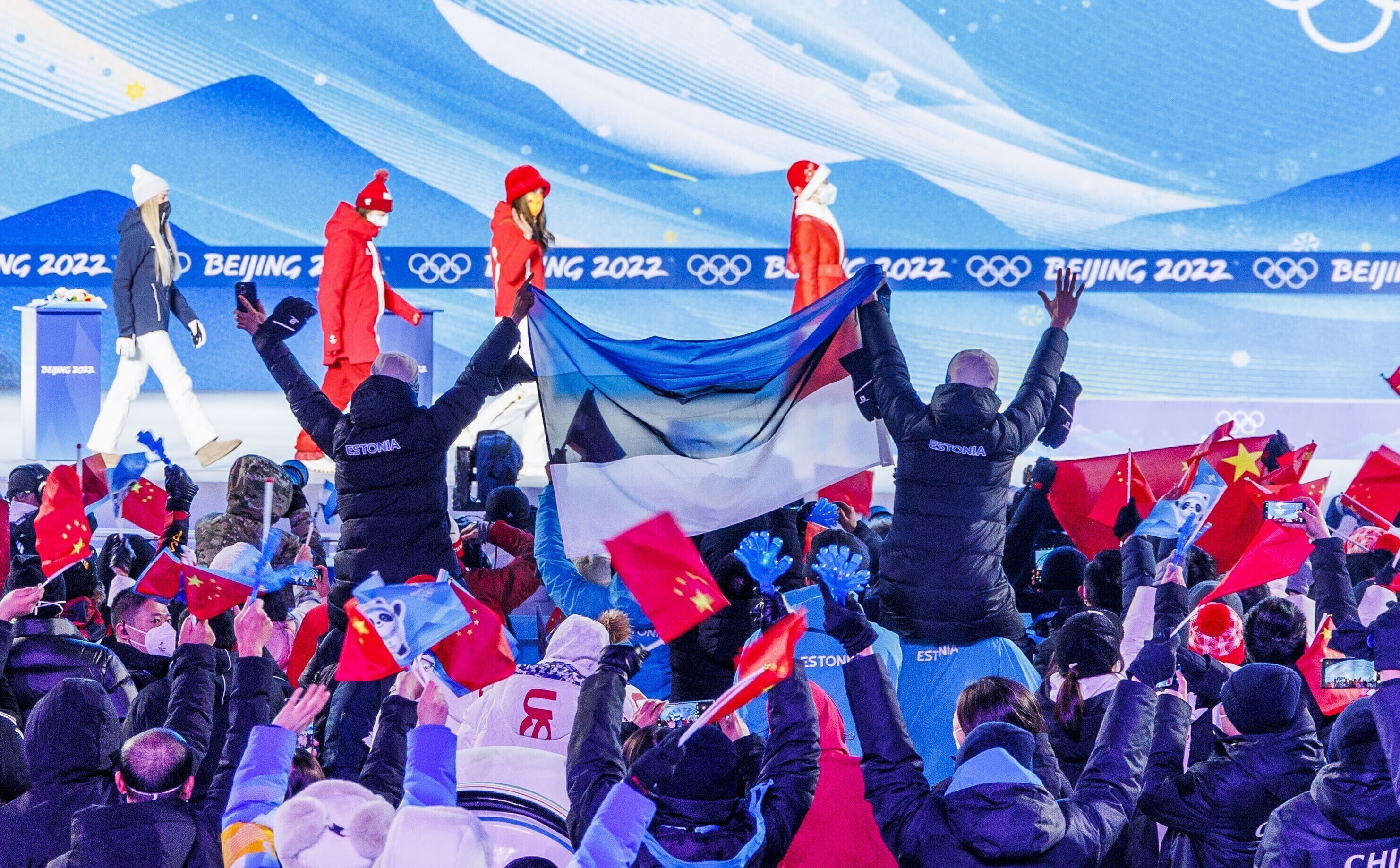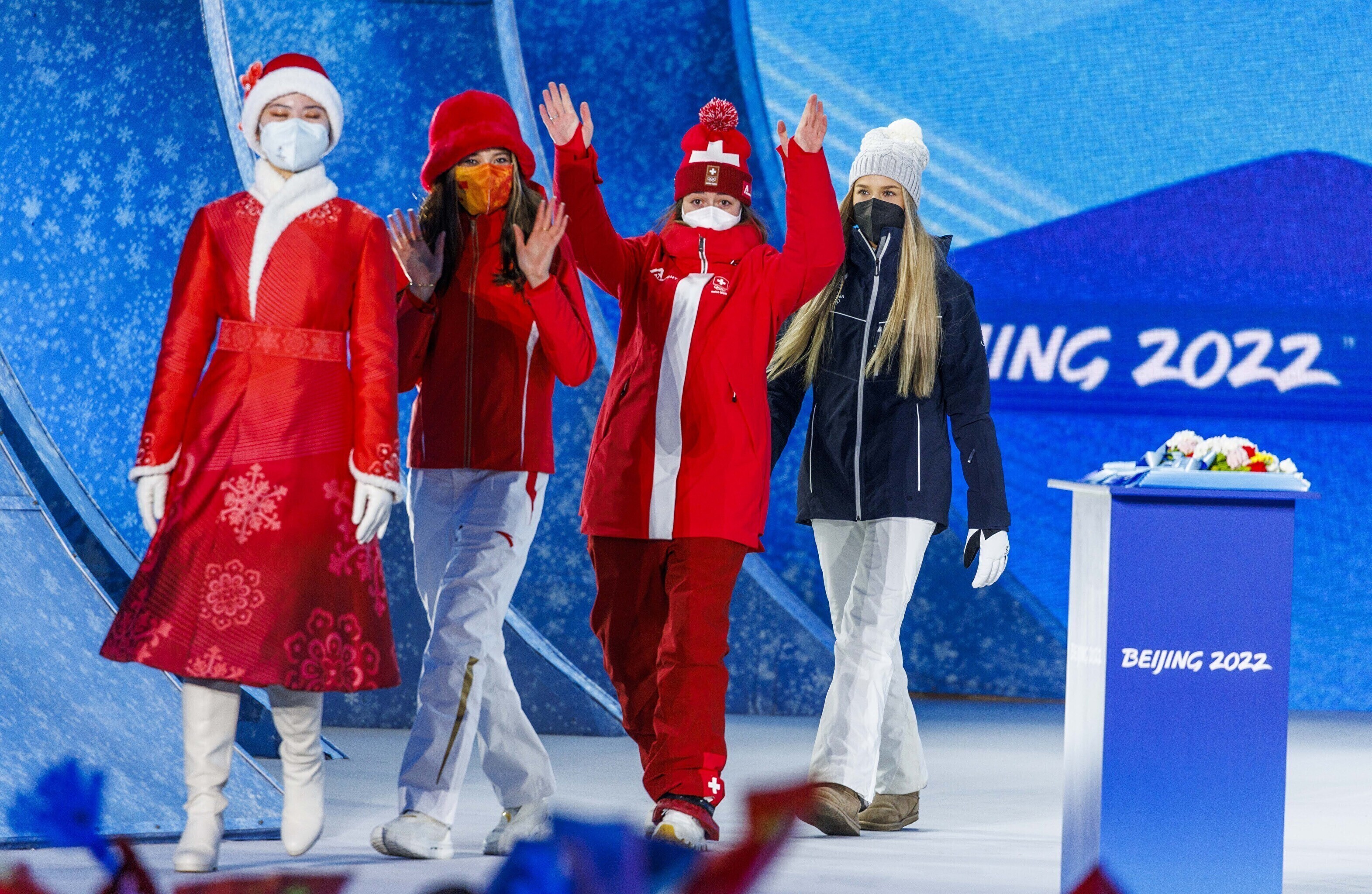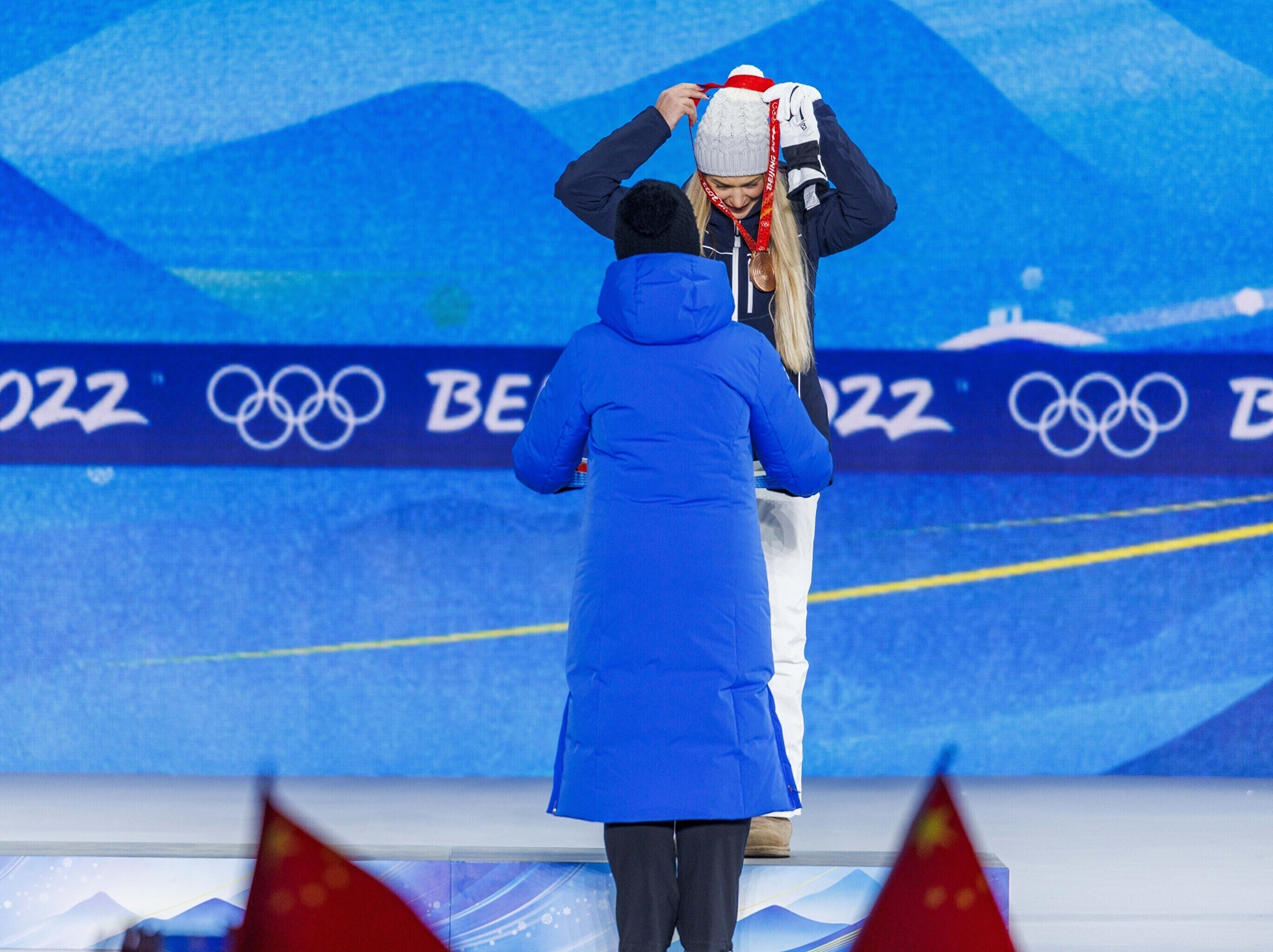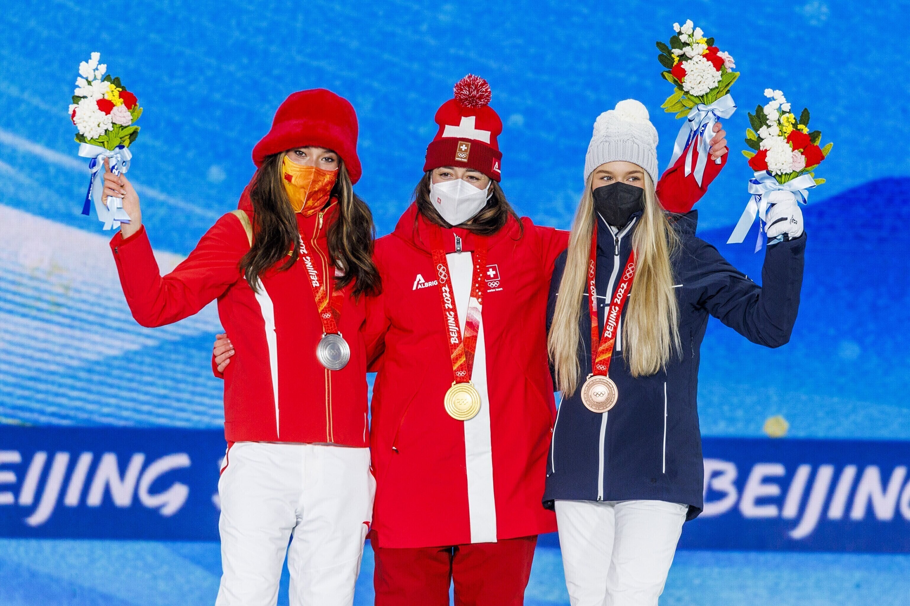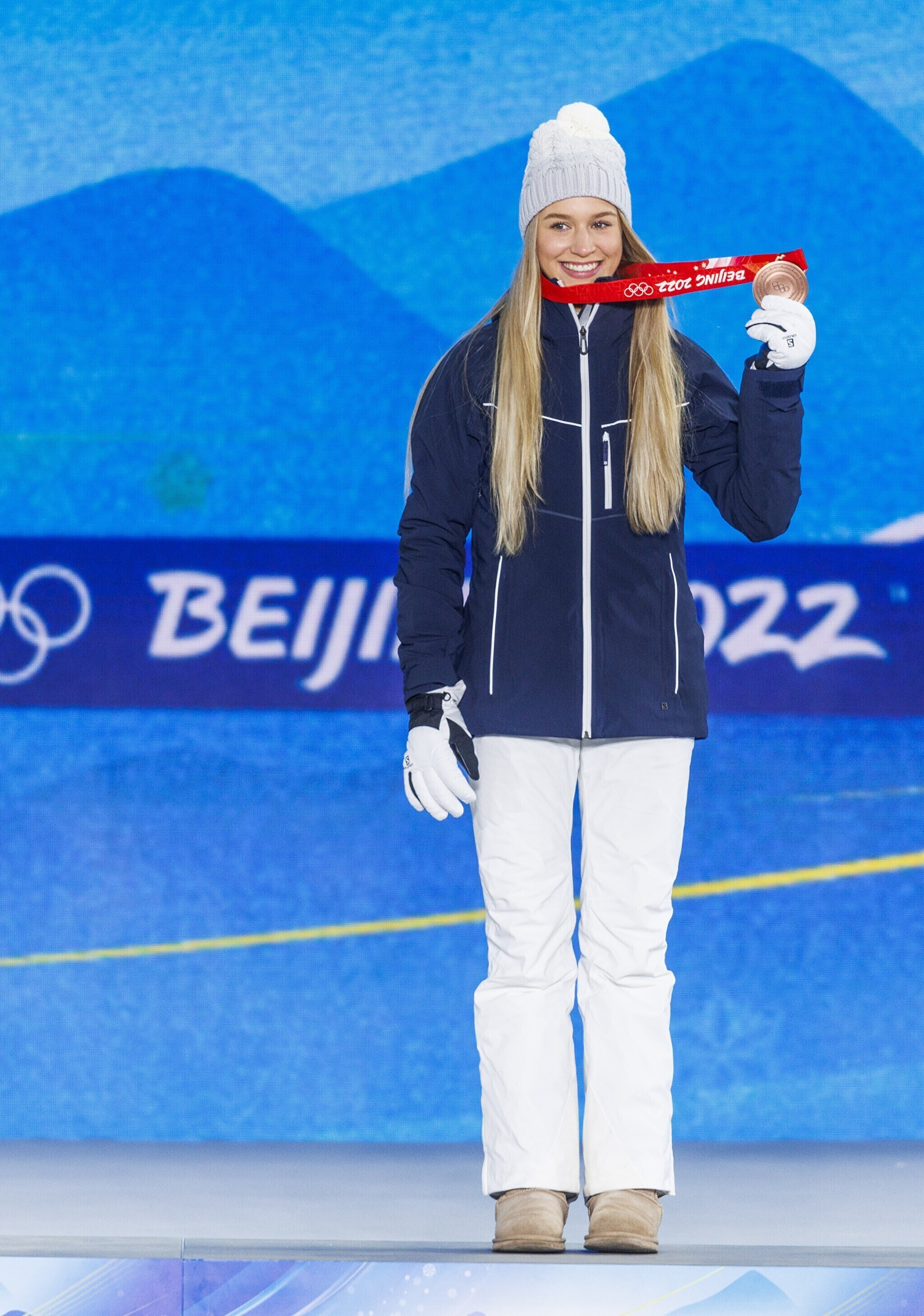 Эстонская фристайлистка Келли Сильдару на торжественной церемонии получила бронзовую медаль за третье место на соревнованиях по слоупстайлу на Олимпийских играх в Пекине.