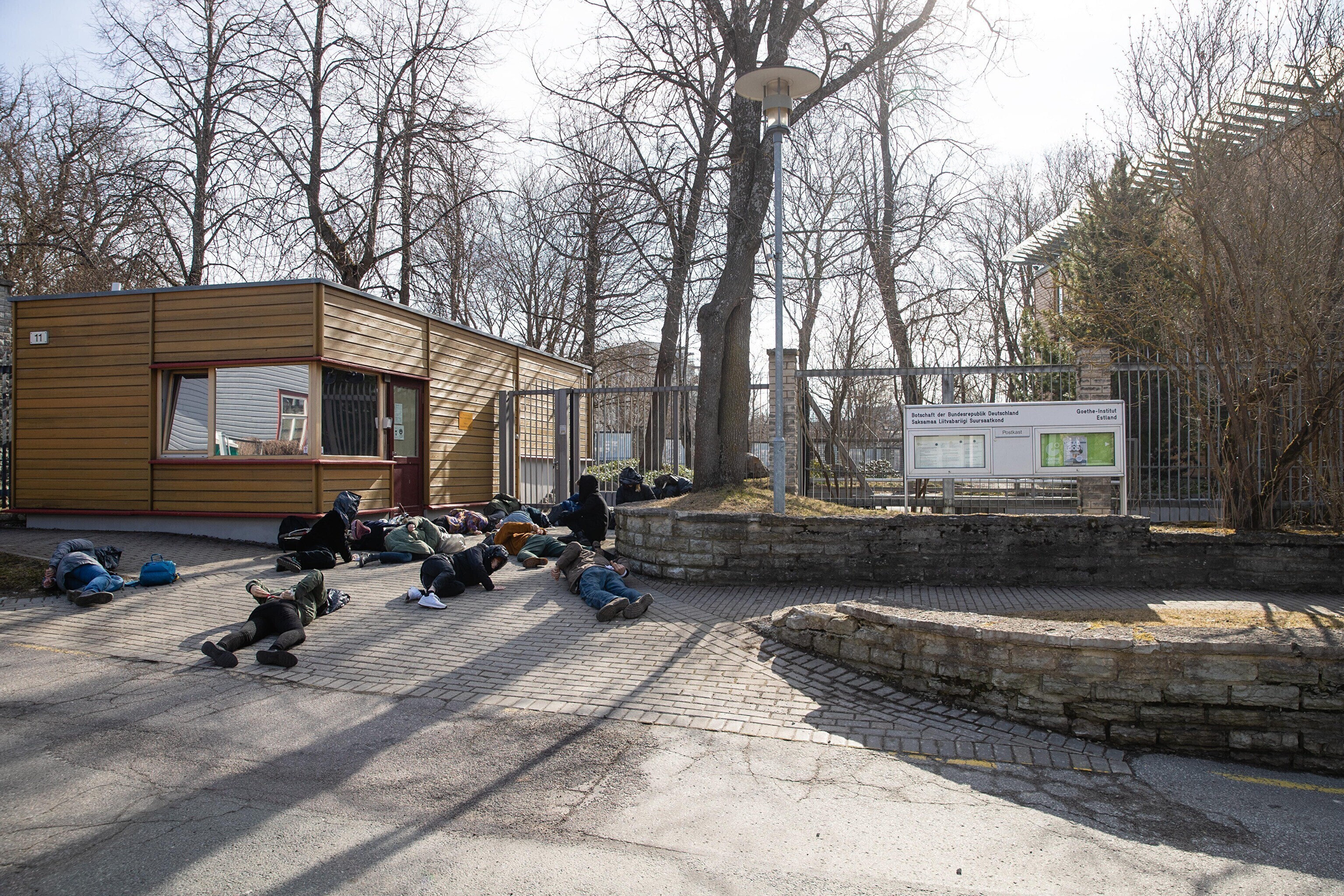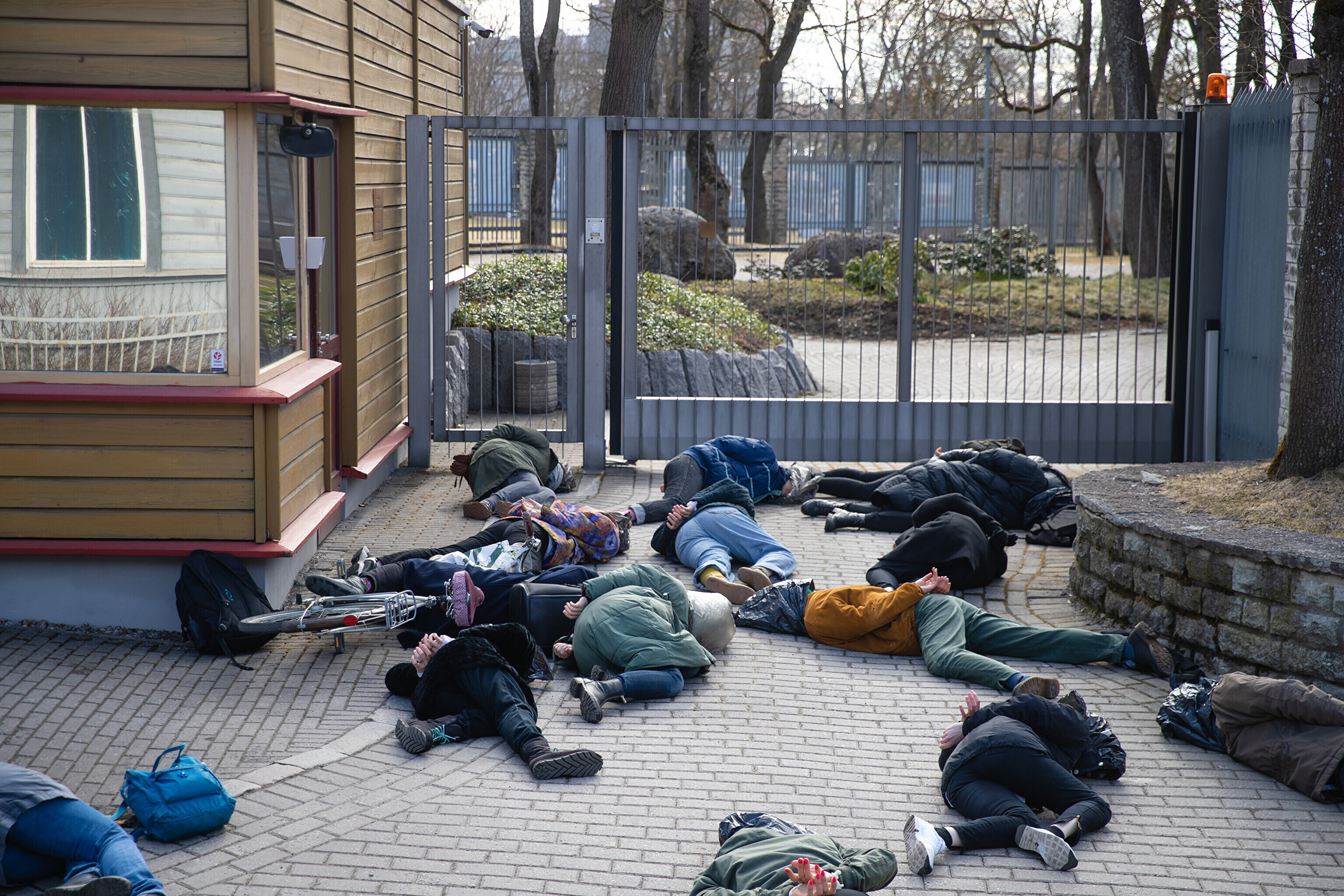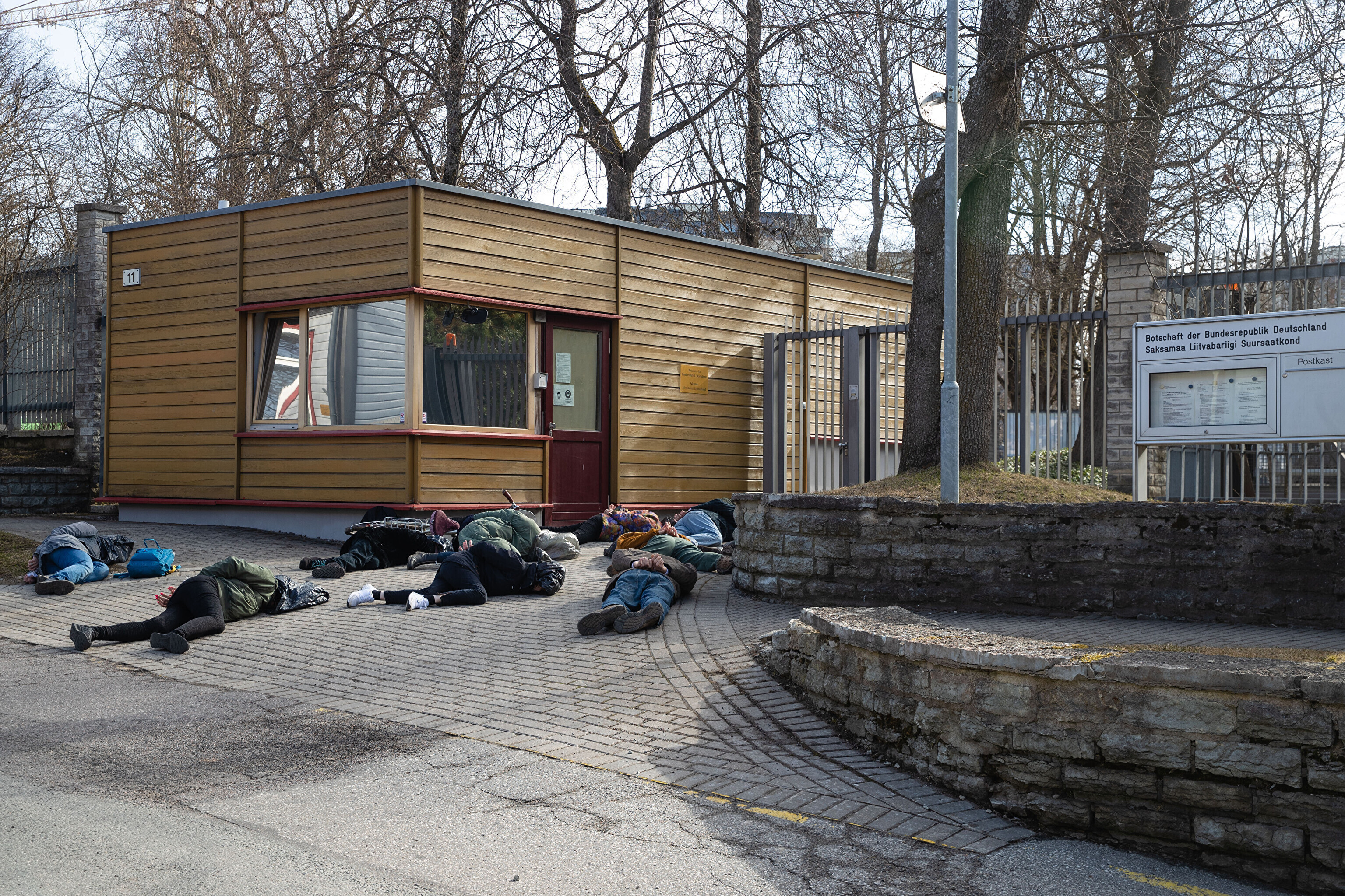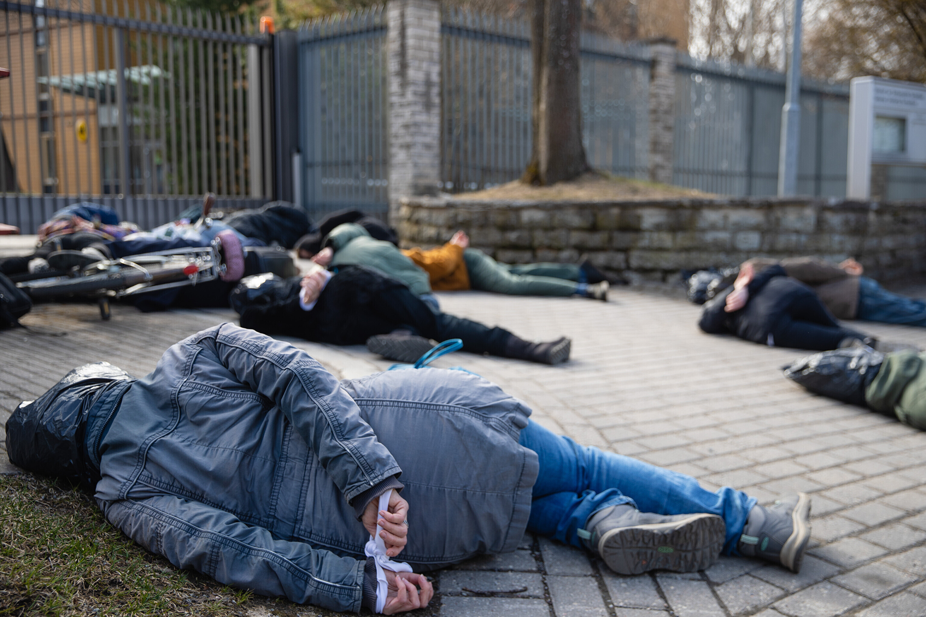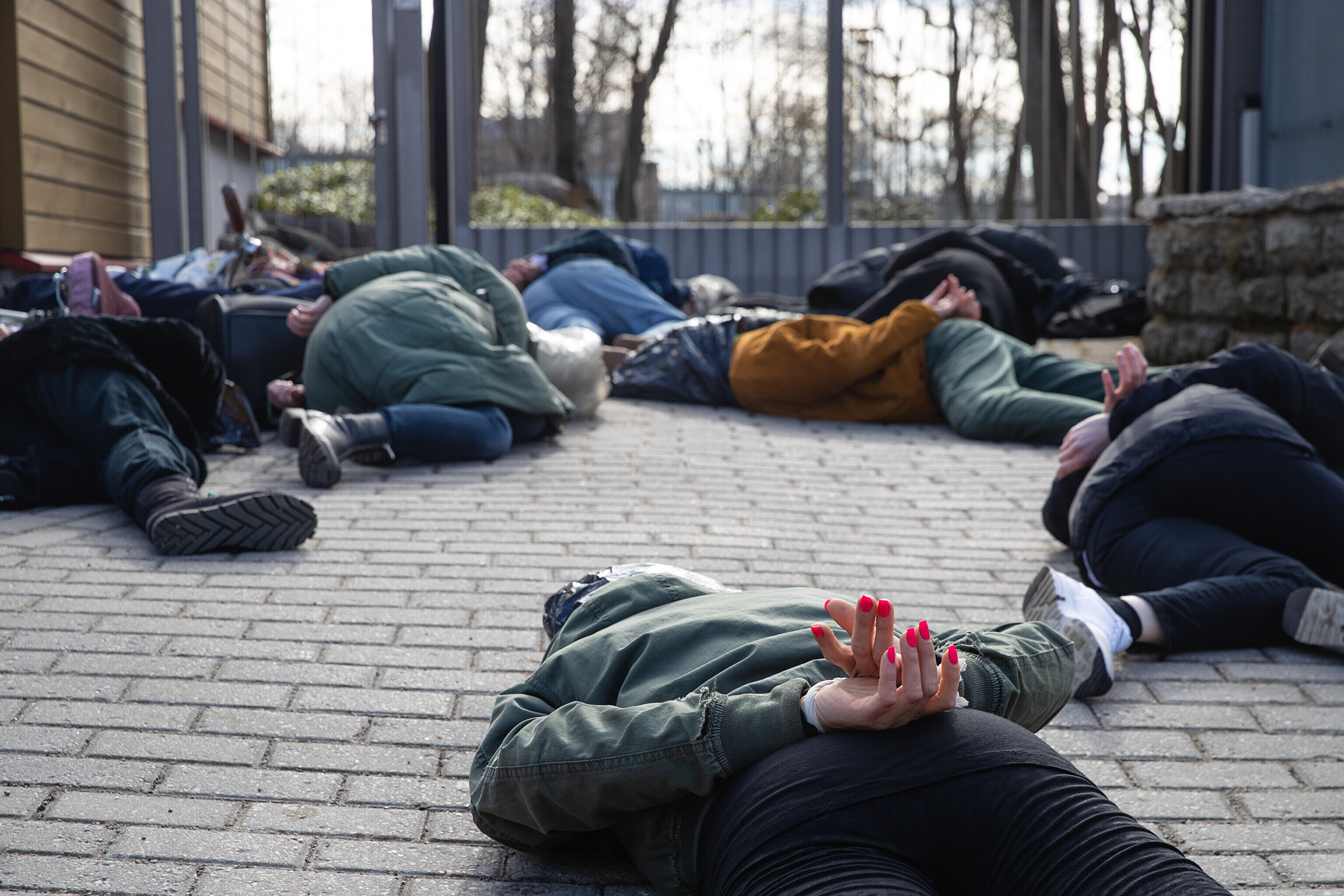 Сначала участники акции легли перед воротами посольства Германии с целью показать, что в политике Германии в отношении Украины нет подвижек, а также напомнить о необходимости помочь Украине оружием и прекратить использование российских энергоносителей.