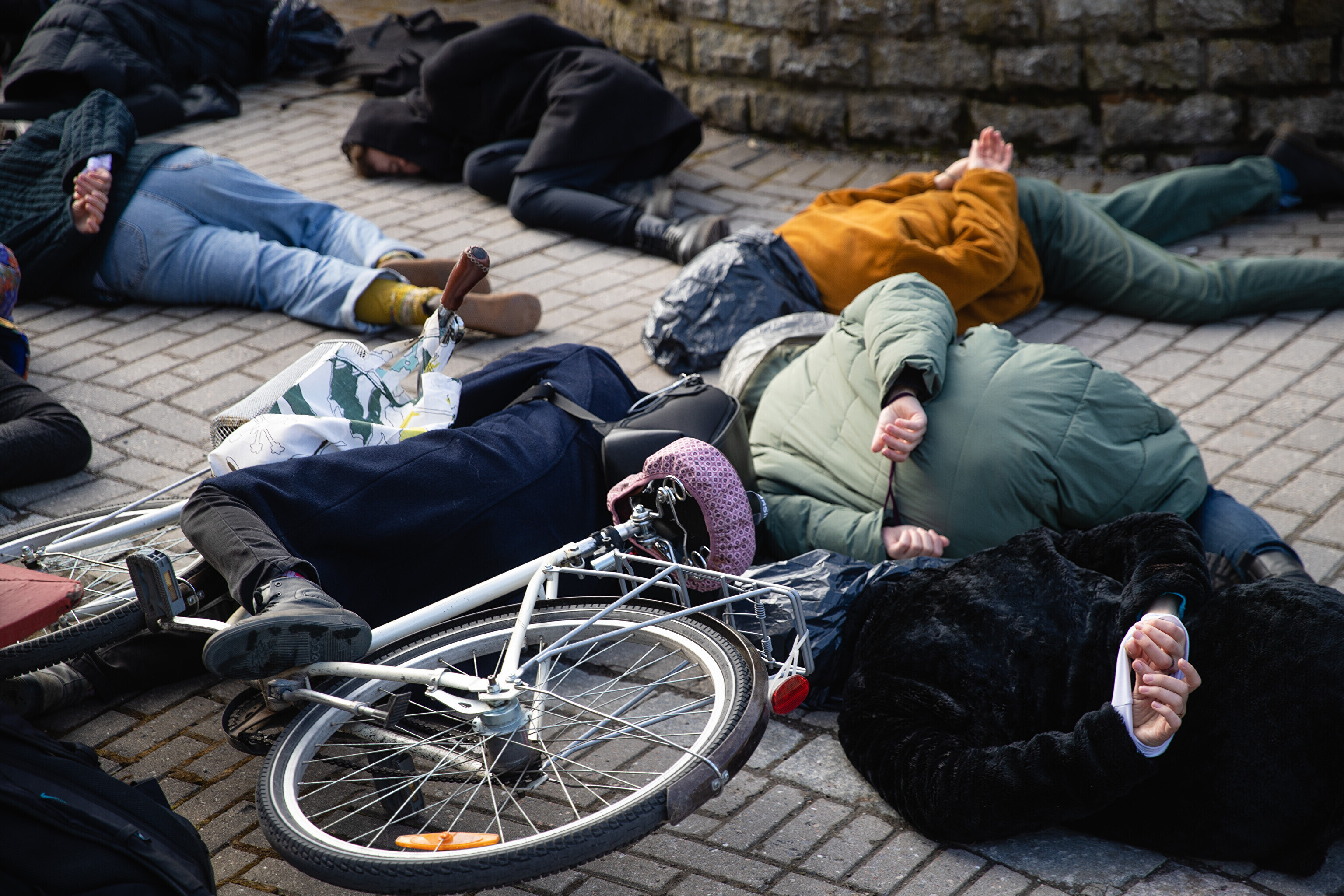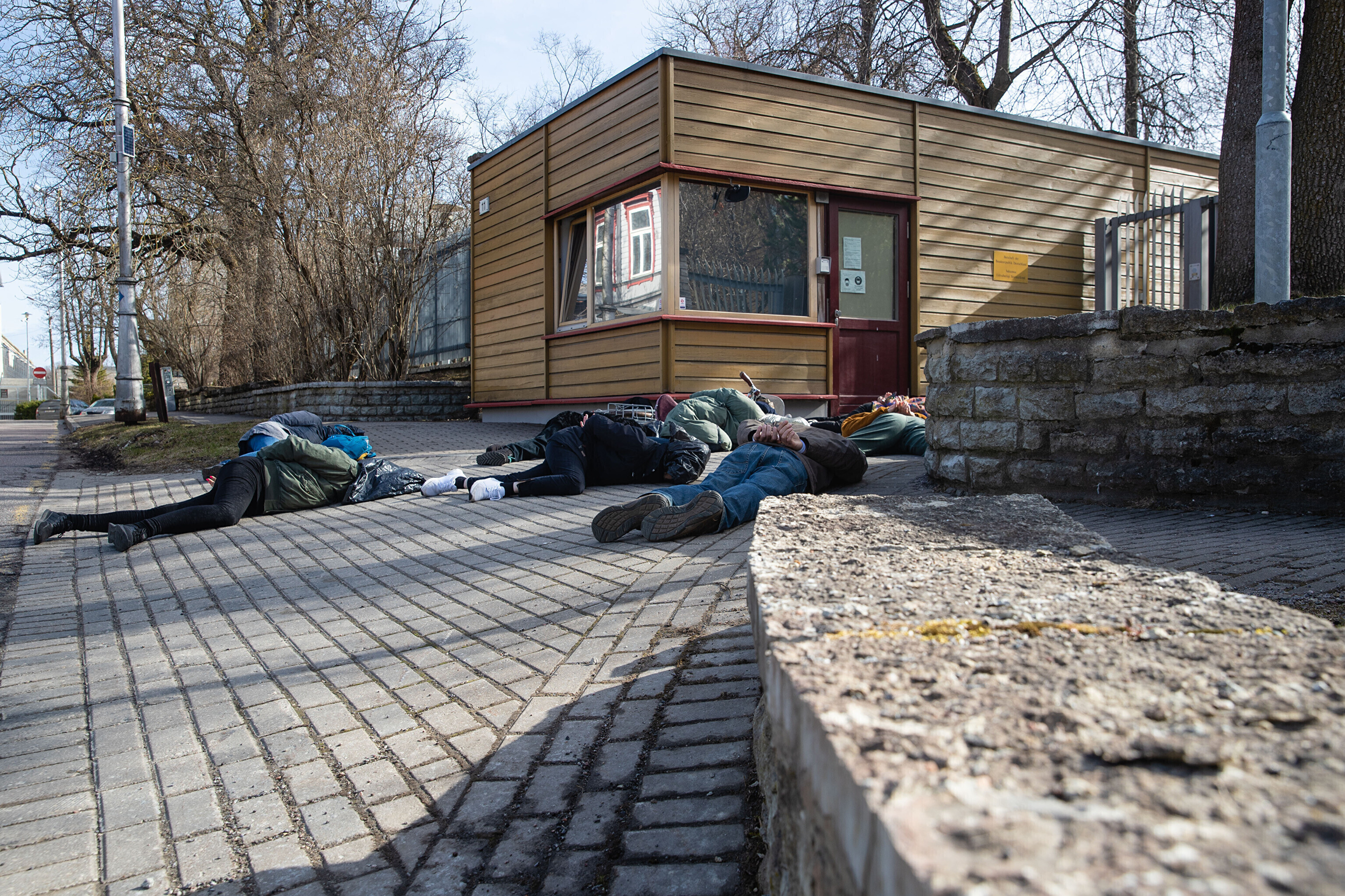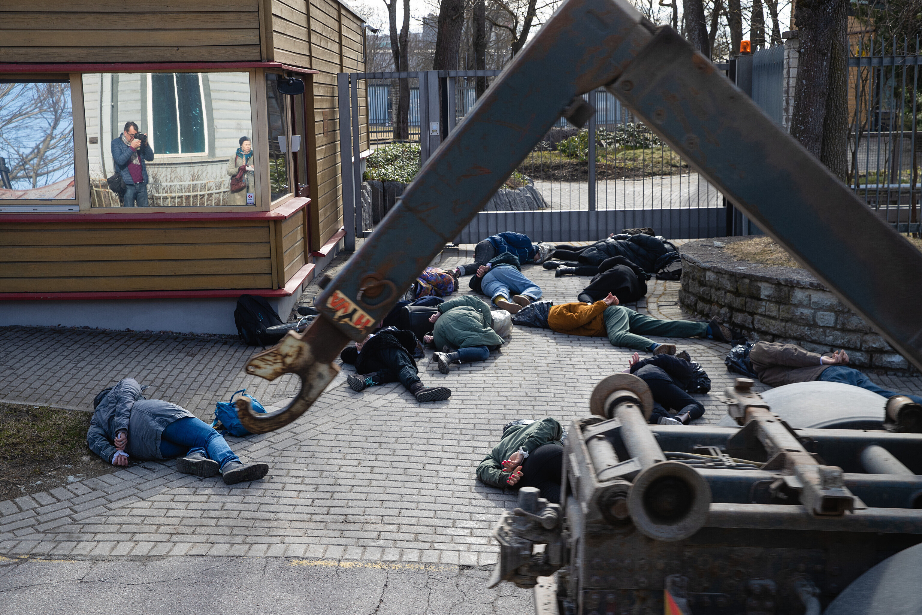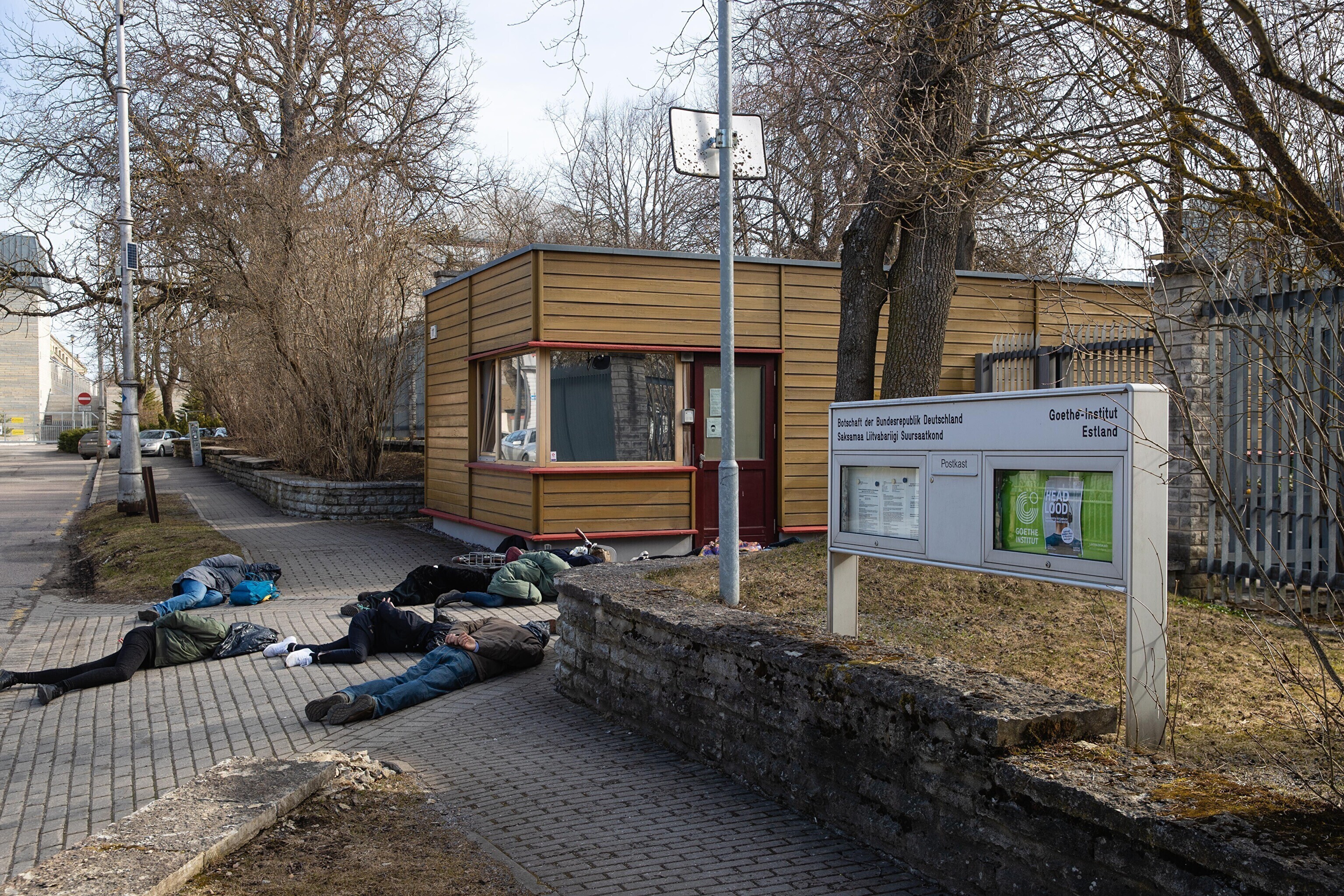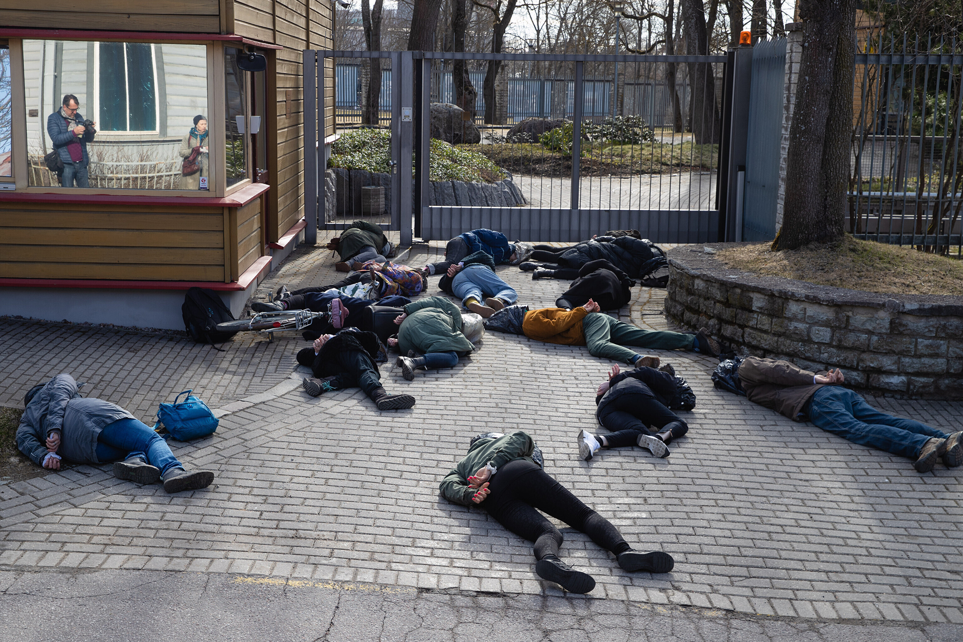 Сначала участники акции легли перед воротами посольства Германии с целью показать, что в политике Германии в отношении Украины нет подвижек, а также напомнить о необходимости помочь Украине оружием и прекратить использование российских энергоносителей.