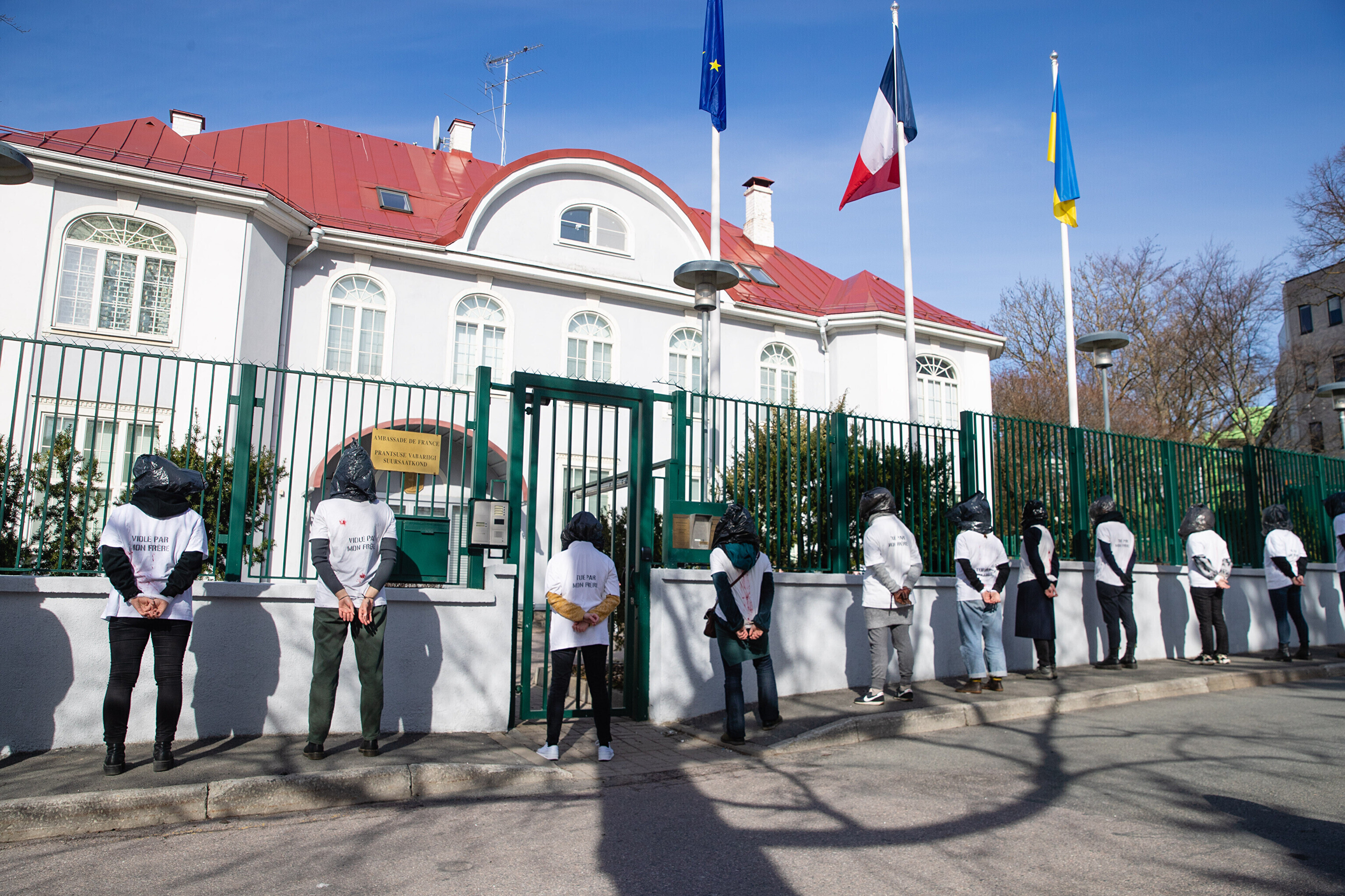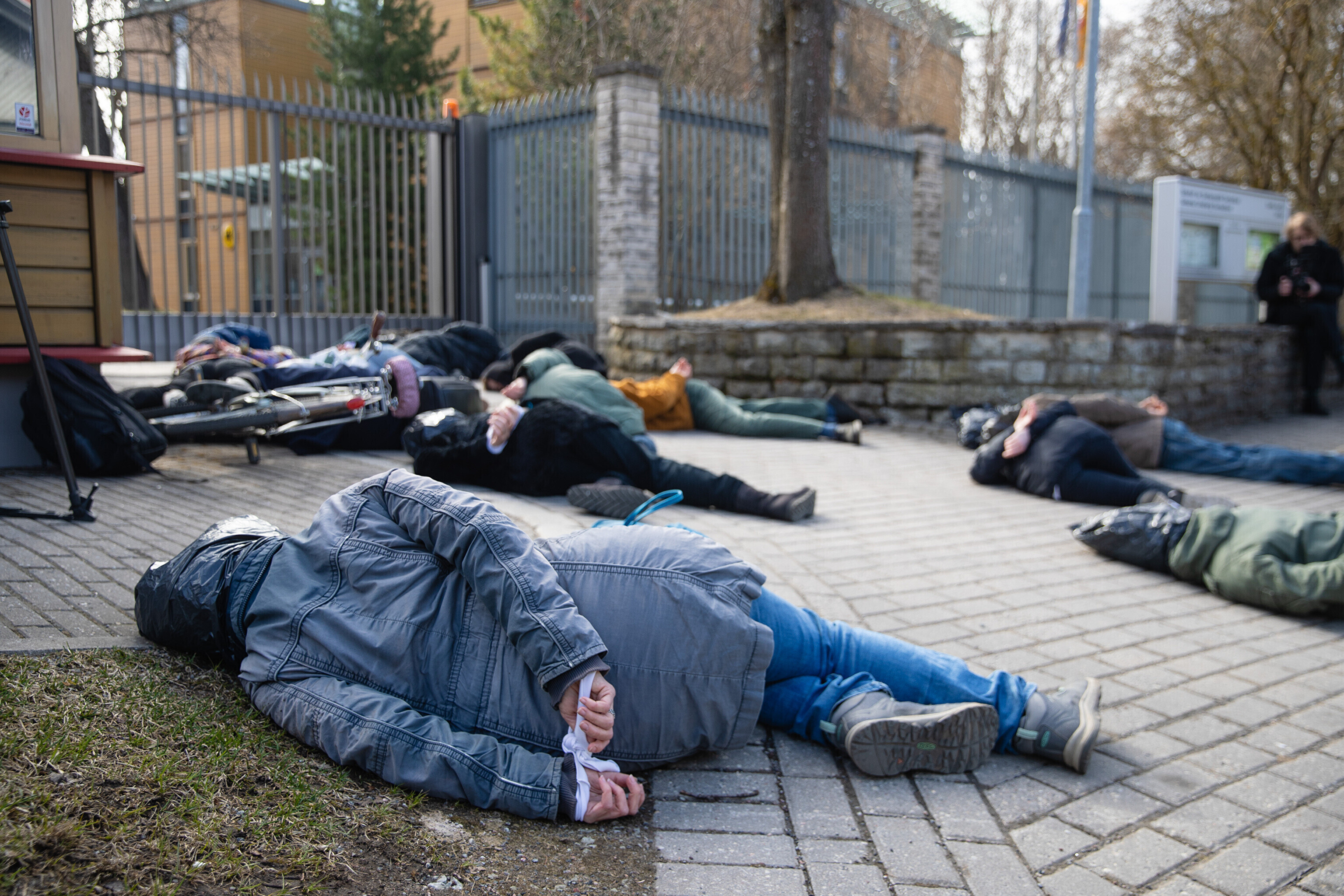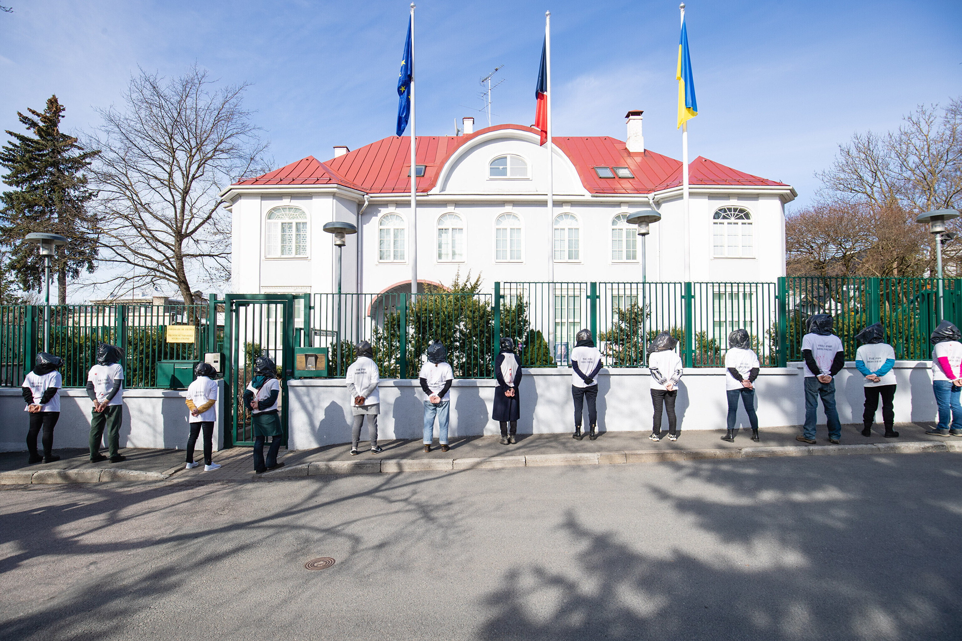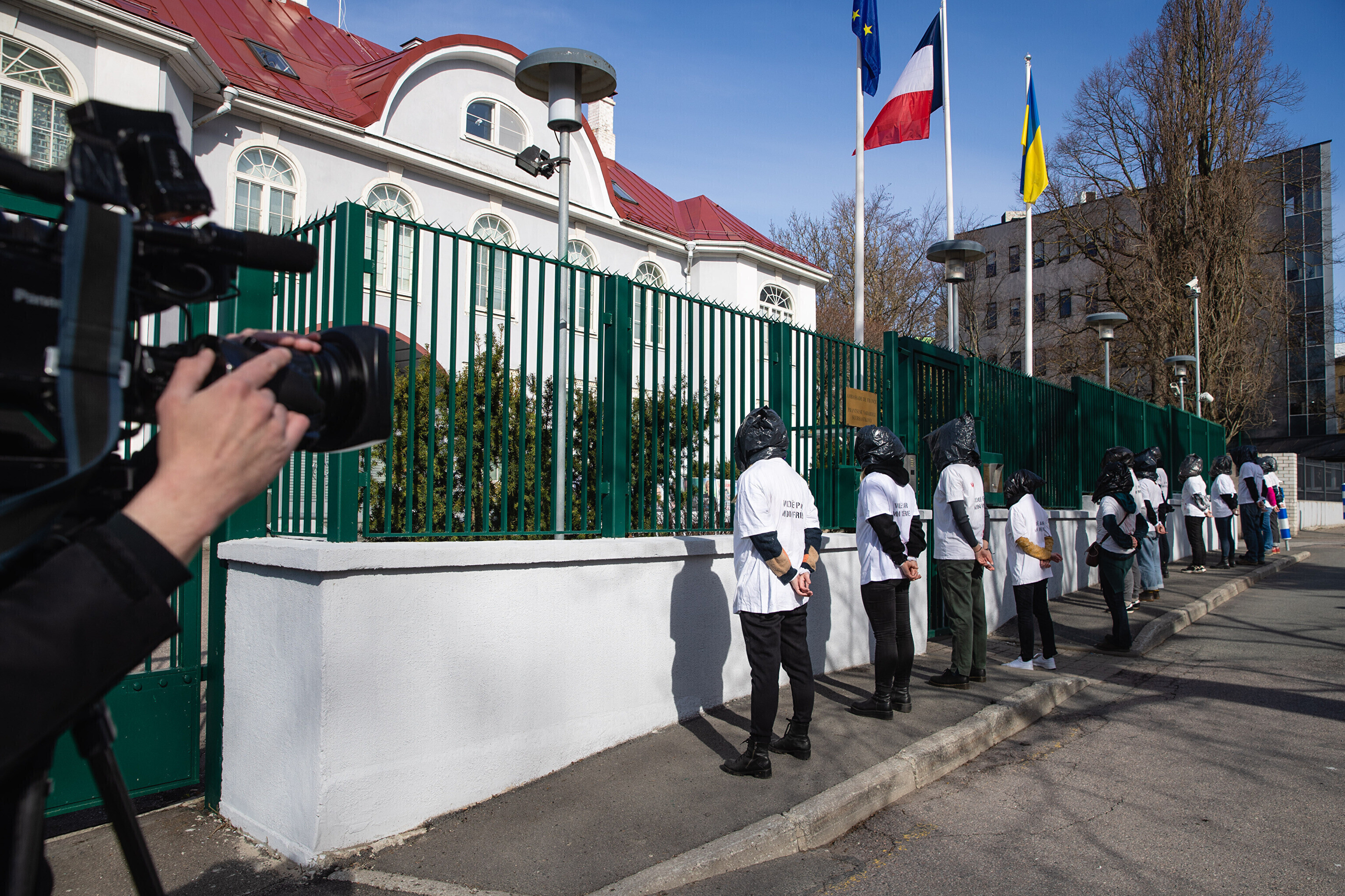 Антивоенные протесты в Таллинне, начавшиеся на прошлой неделе, продолжились в понедельник: более десяти человек со связанными руками и черными полиэтиленовыми пакетами на головах собрались перед посольствами Германии и Франции на акции "молчаливого протеста".