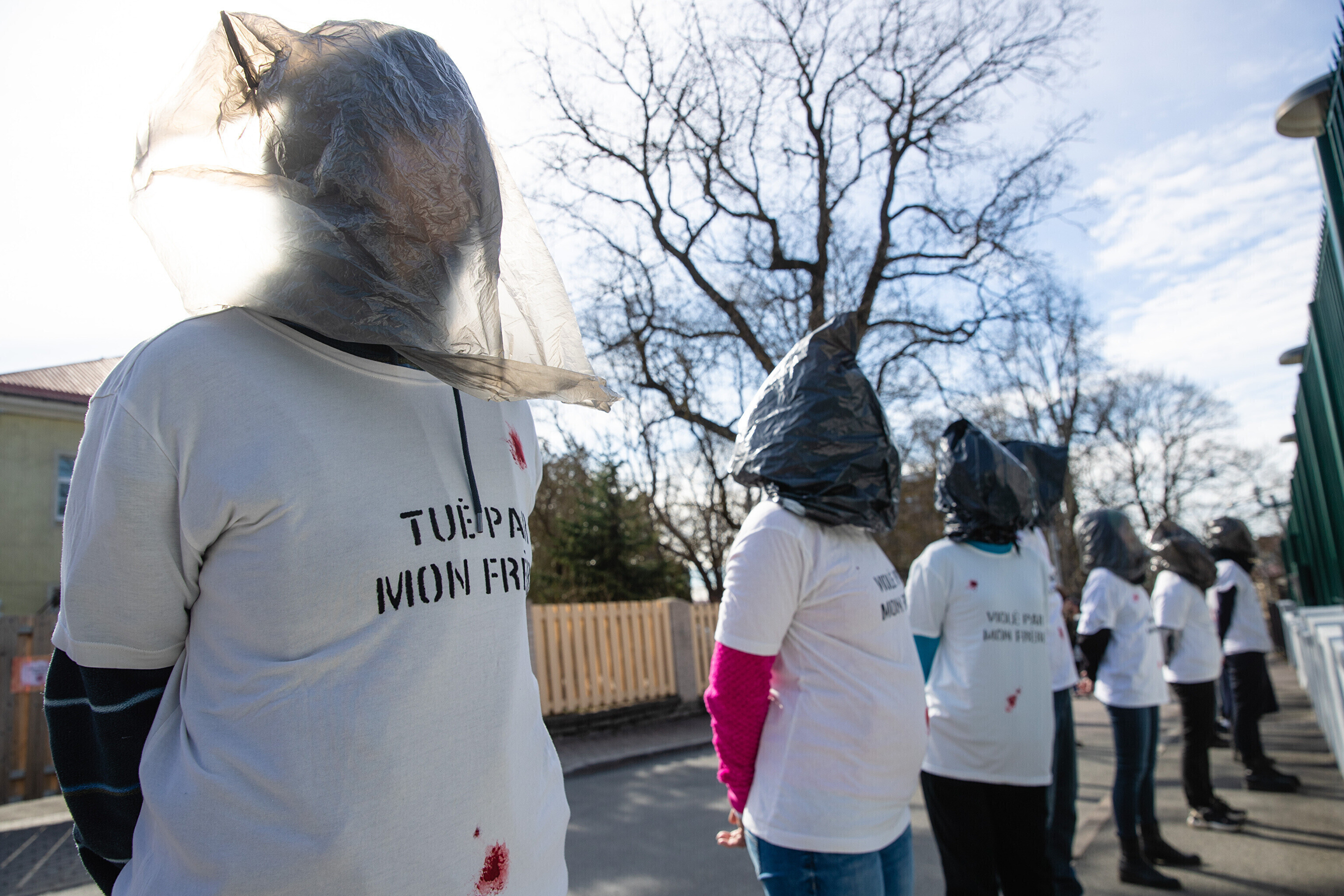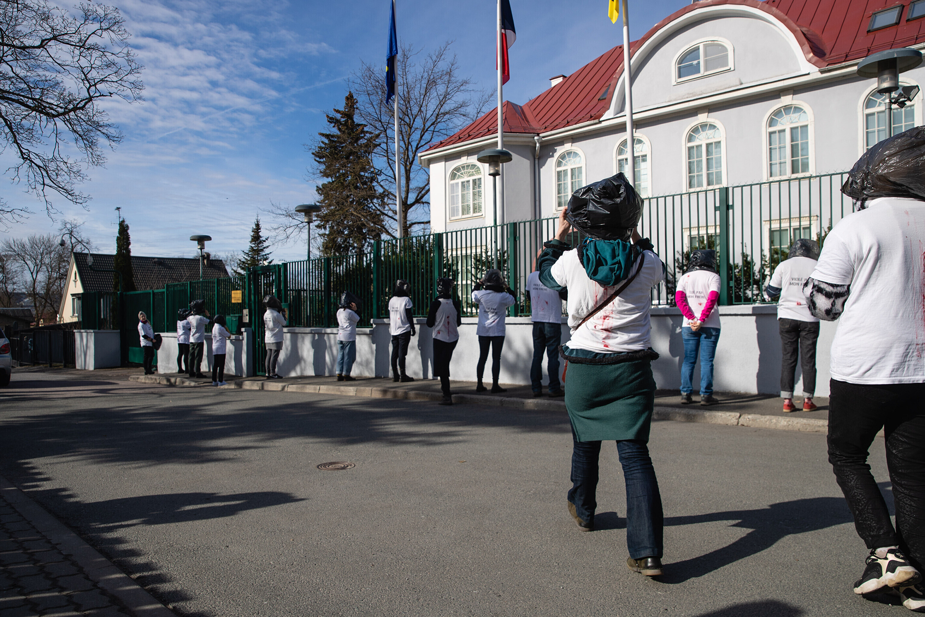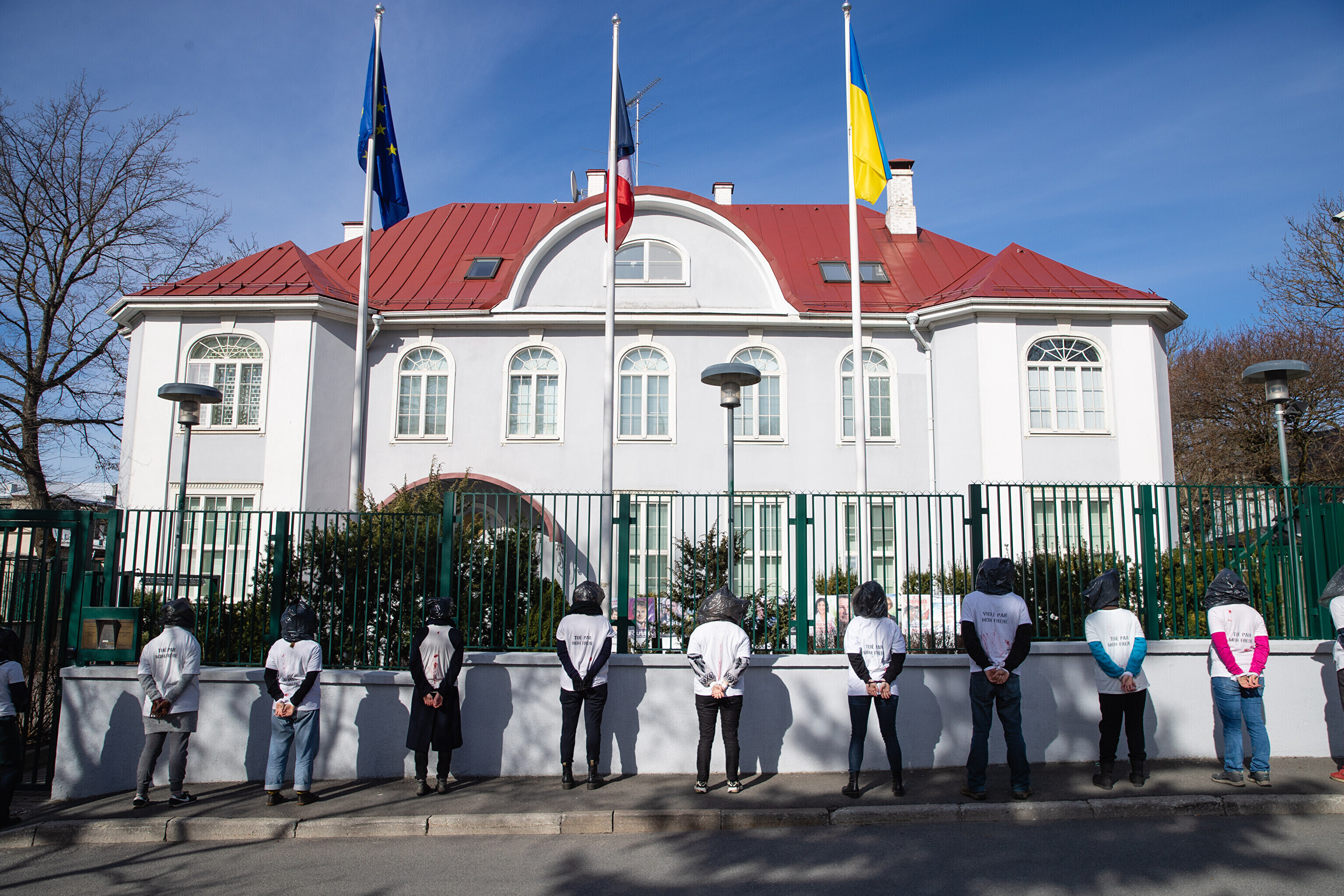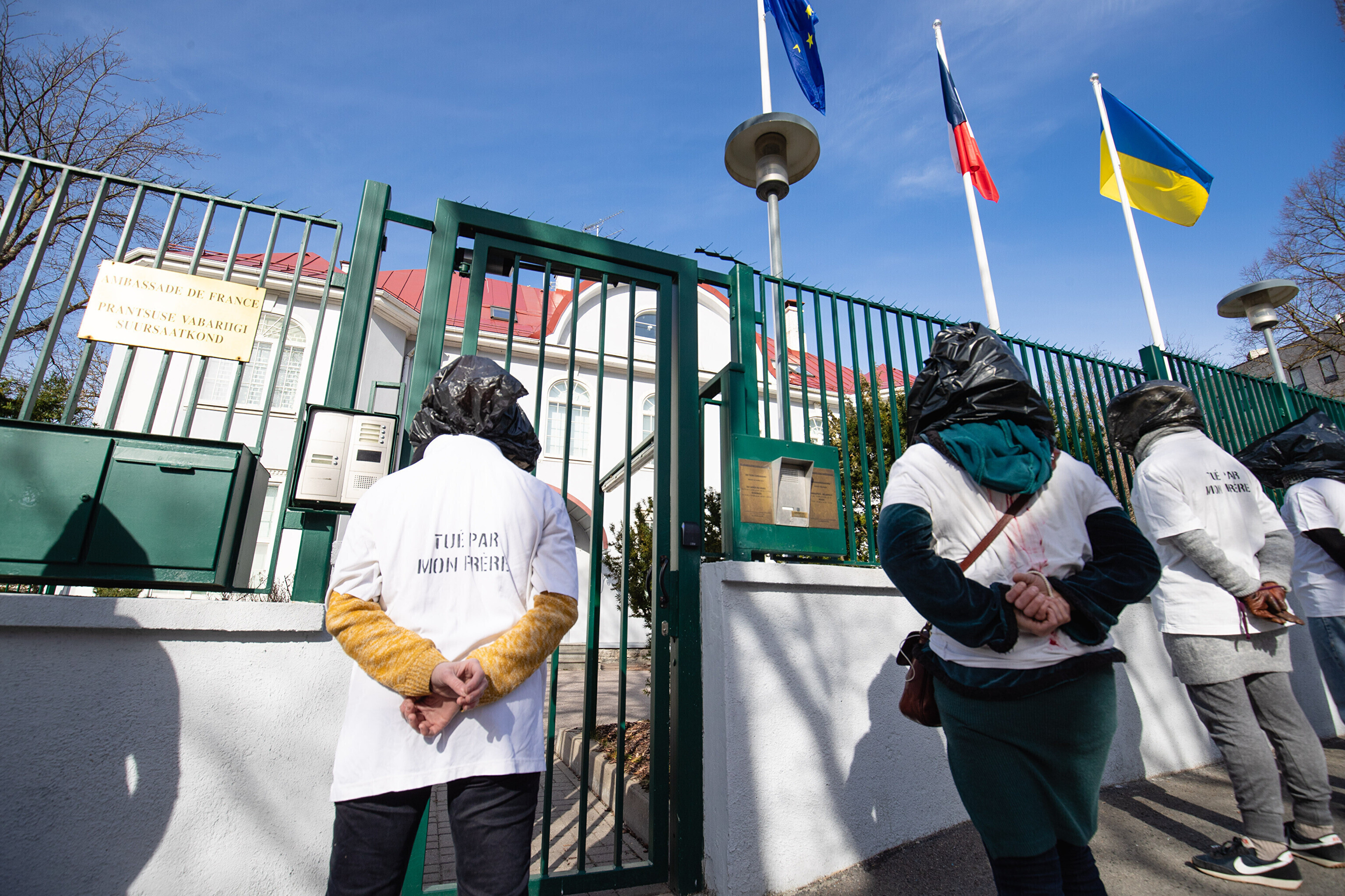 Антивоенные протесты в Таллинне, начавшиеся на прошлой неделе, продолжились в понедельник: более десяти человек со связанными руками и черными полиэтиленовыми пакетами на головах собрались перед посольствами Германии и Франции на акции "молчаливого протеста".
