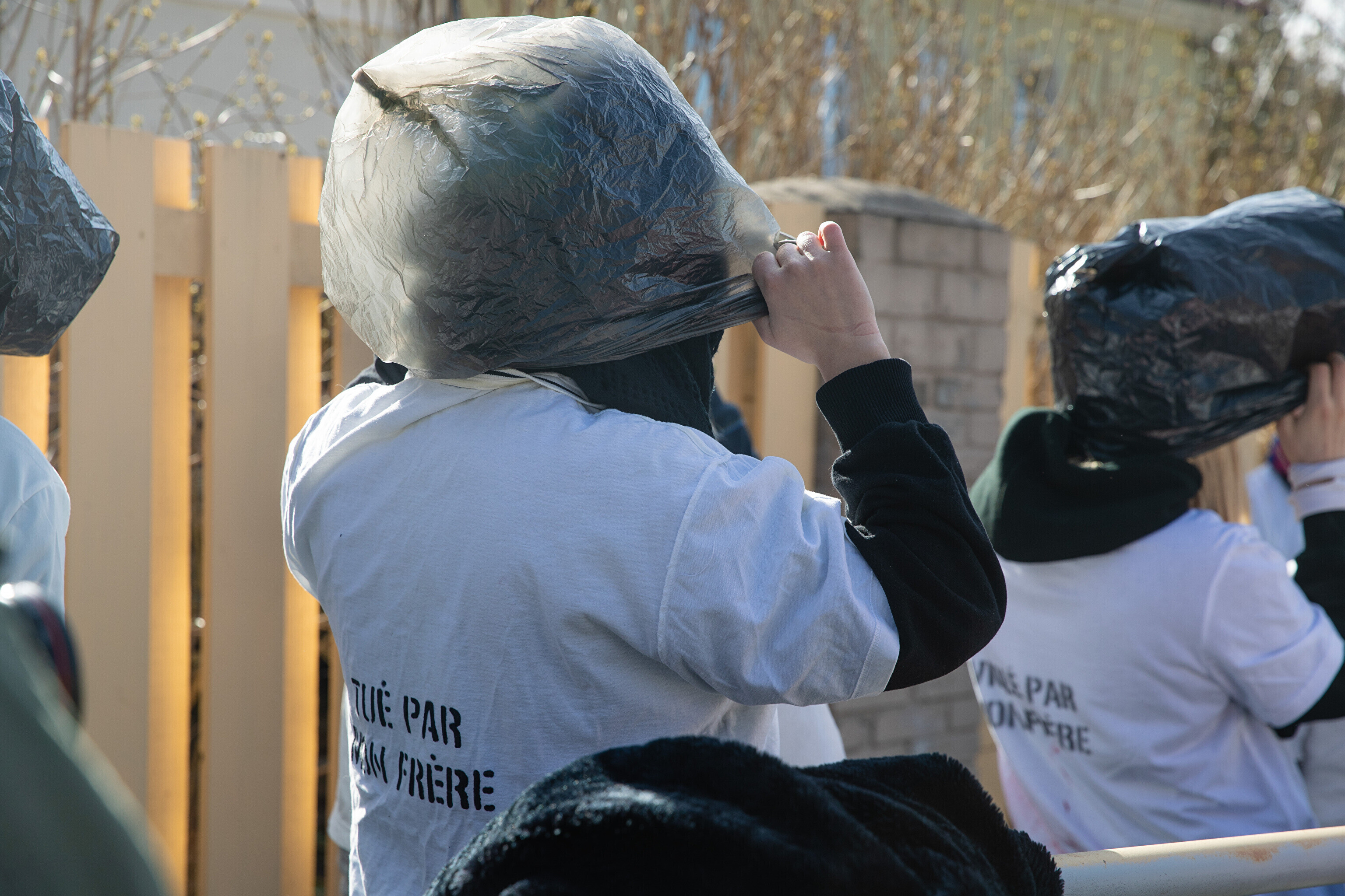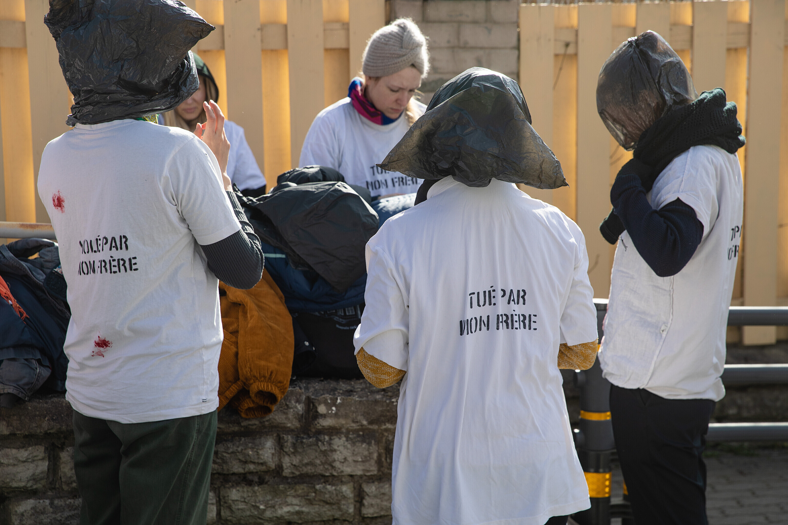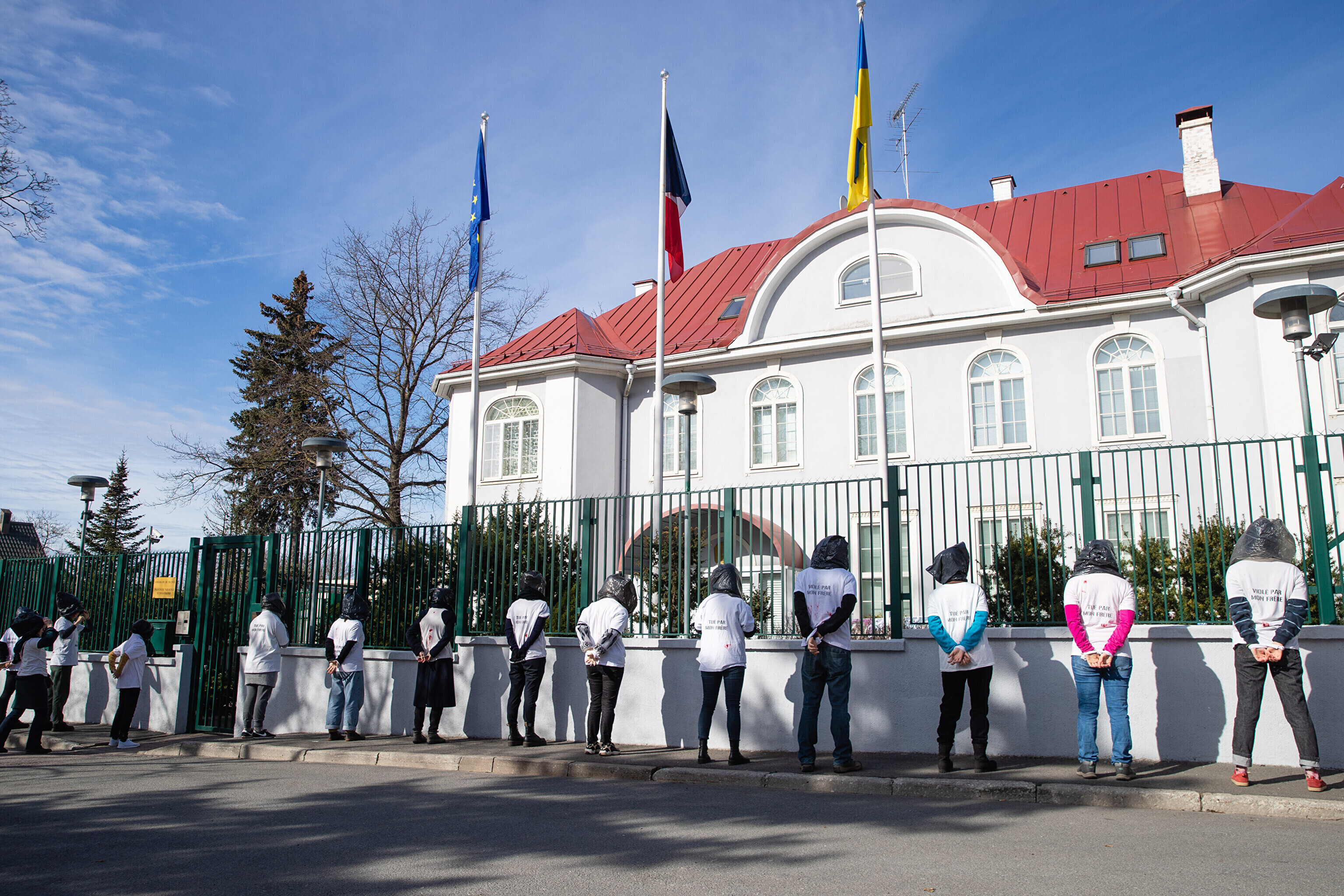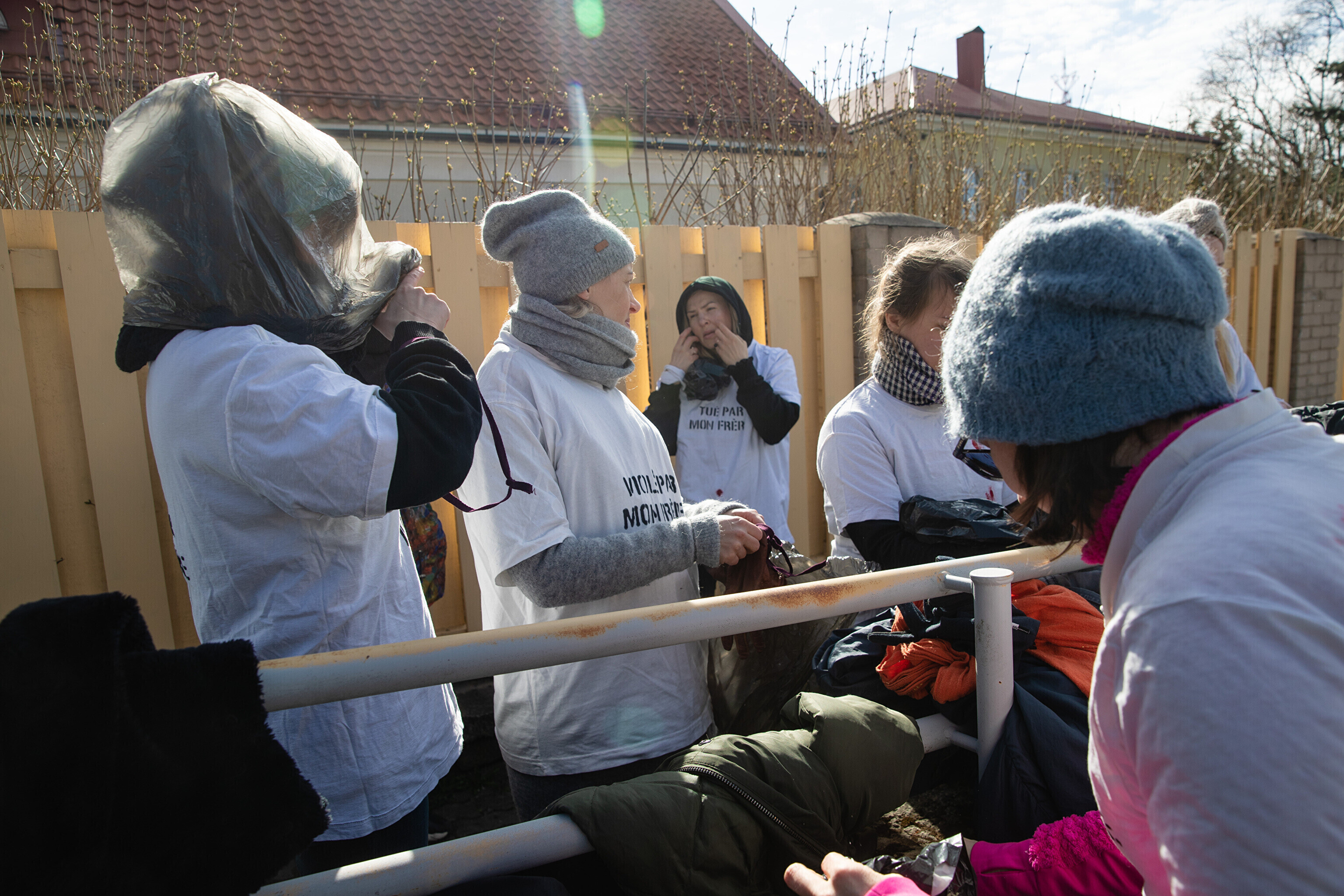 Антивоенные протесты в Таллинне, начавшиеся на прошлой неделе, продолжились в понедельник: более десяти человек со связанными руками и черными полиэтиленовыми пакетами на головах собрались перед посольствами Германии и Франции на акции "молчаливого протеста".