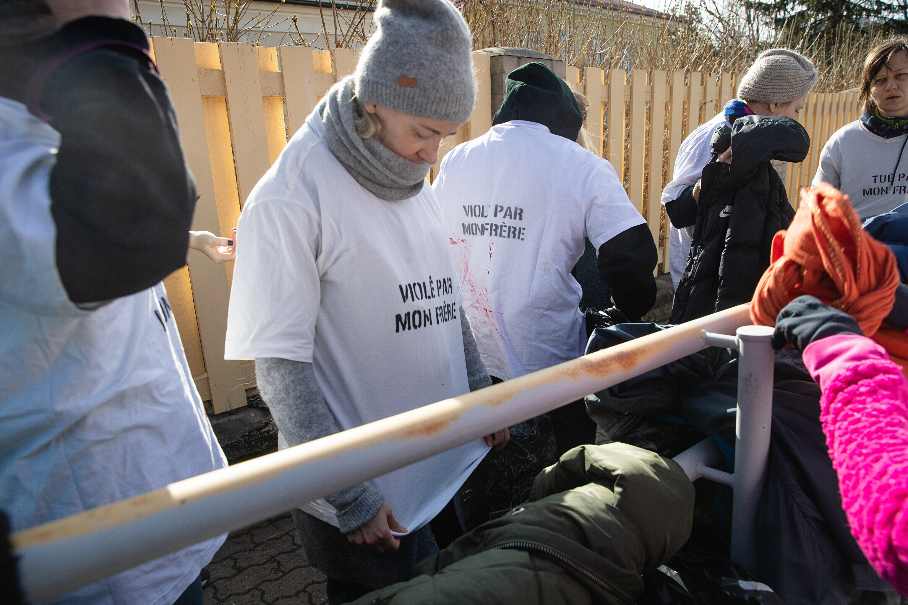 В понедельник участники акции протеста в Таллинне надели футболки с надписью "Изнасилована братом". По мнению протестующих, для понимания такого посыла консультироваться с юристами Макрону не нужно.