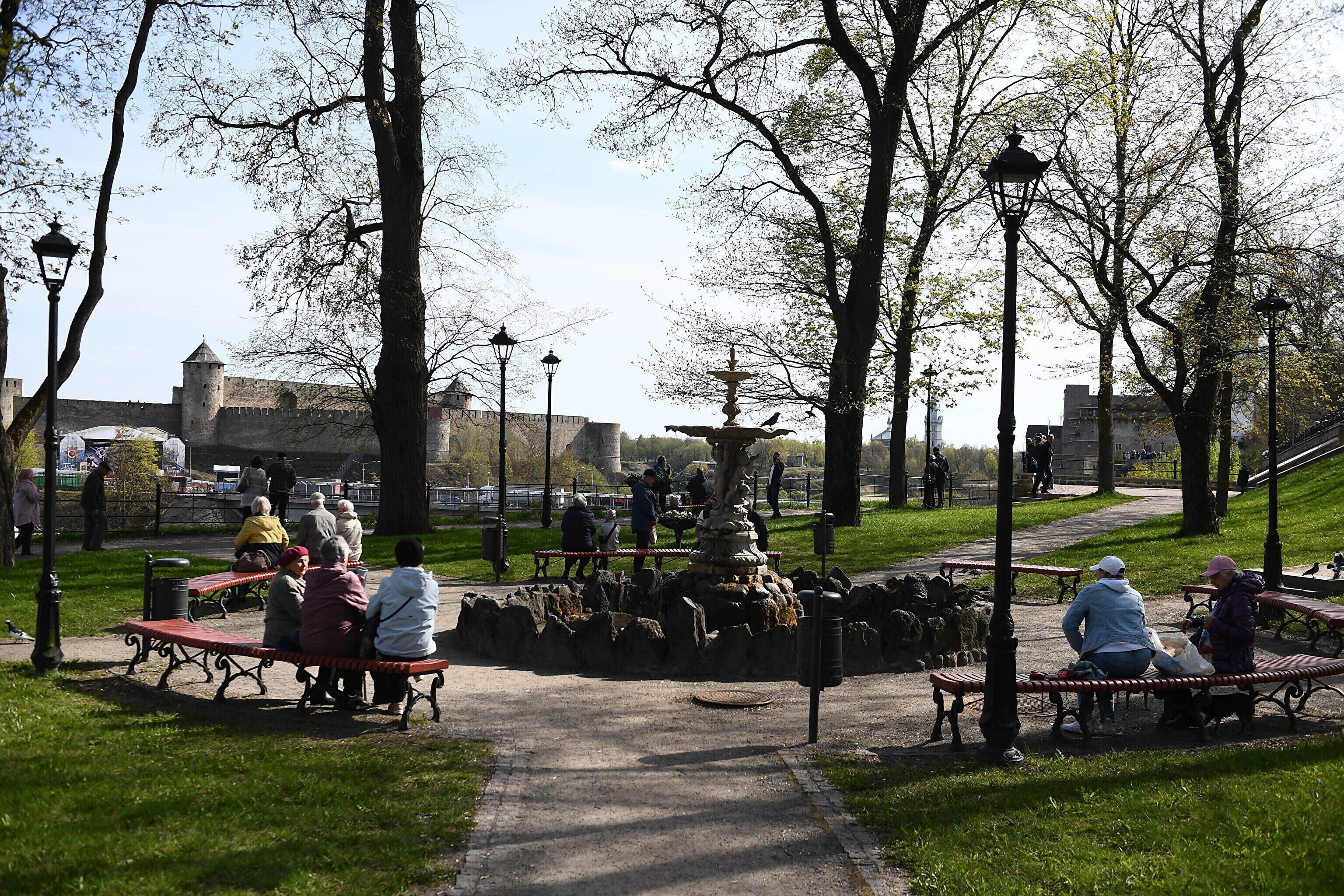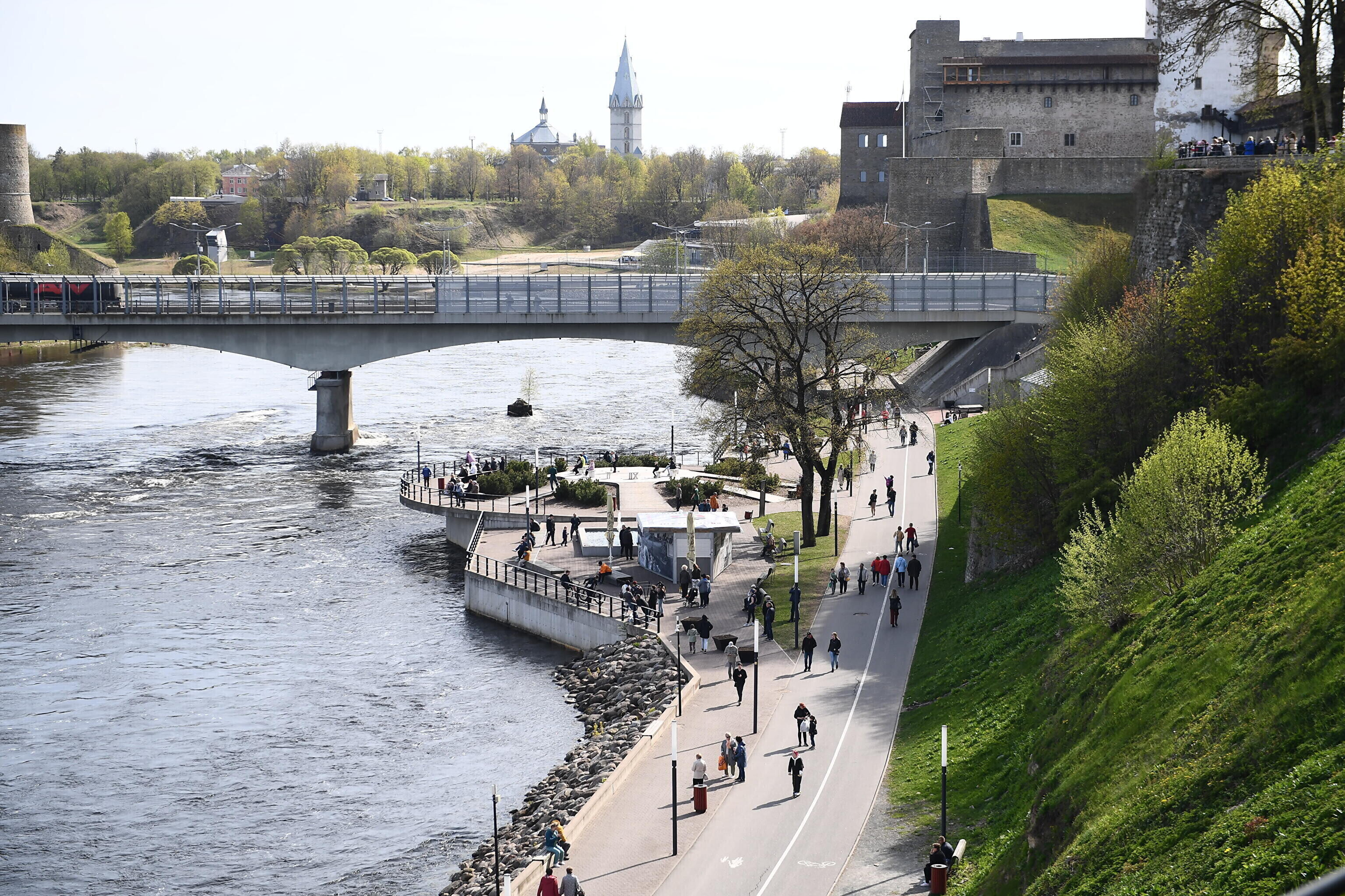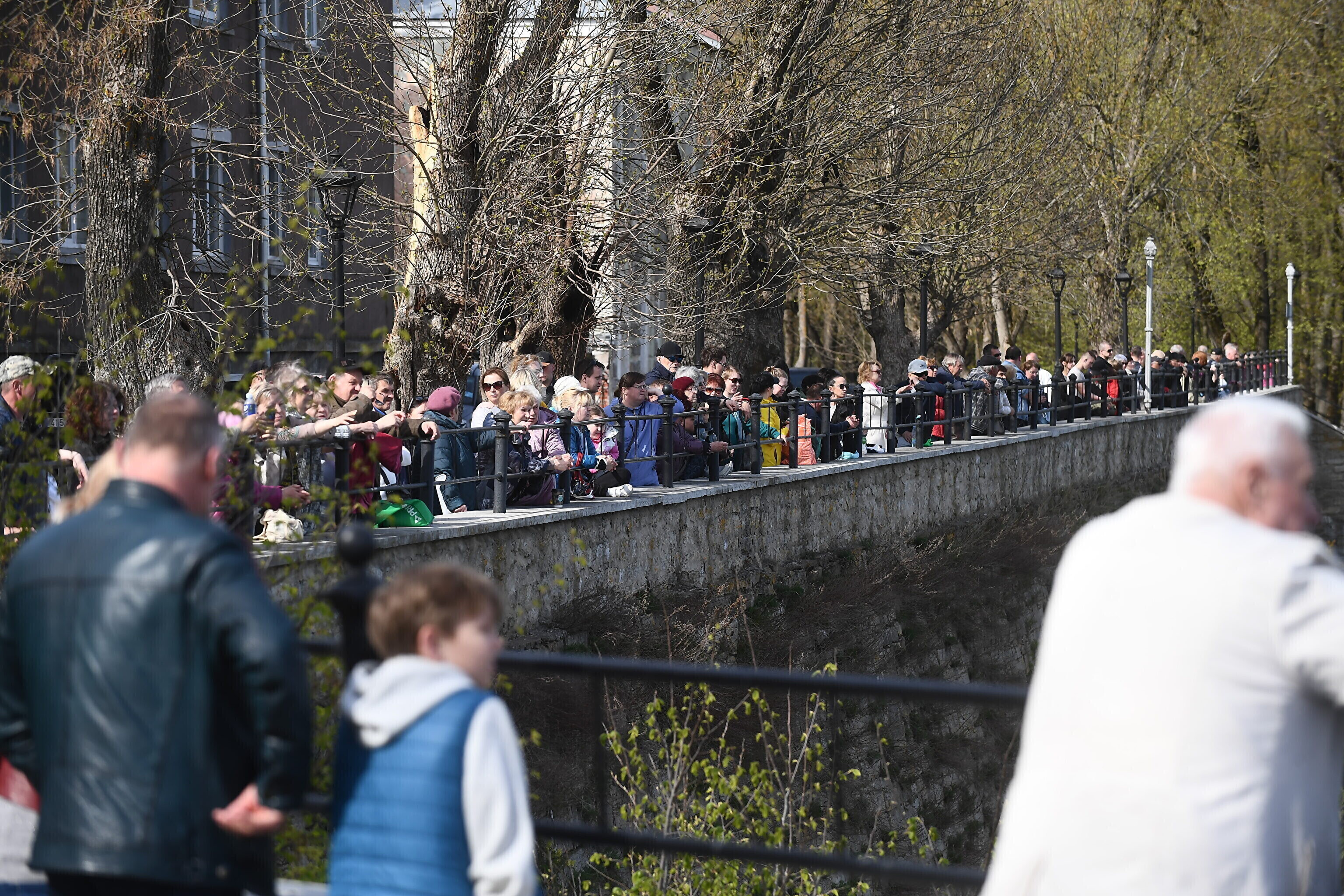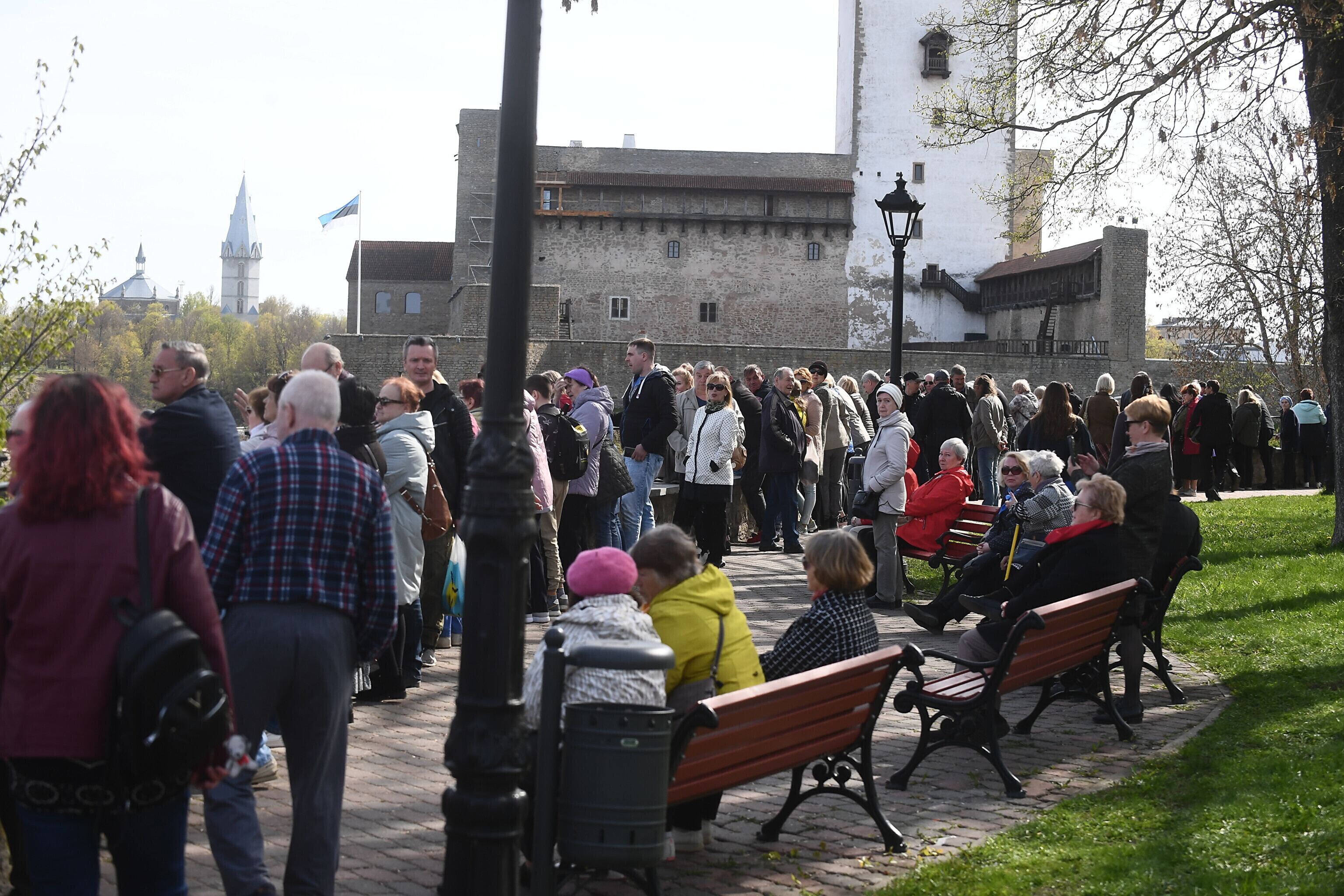 Около четырех часов дня на Нарвском променаде собрались несколько сотен человек, сообщил корреспондент ERR Сергей Степанов. В это время на Ивангородской стороне планировали начать концерт в честь 9 мая.