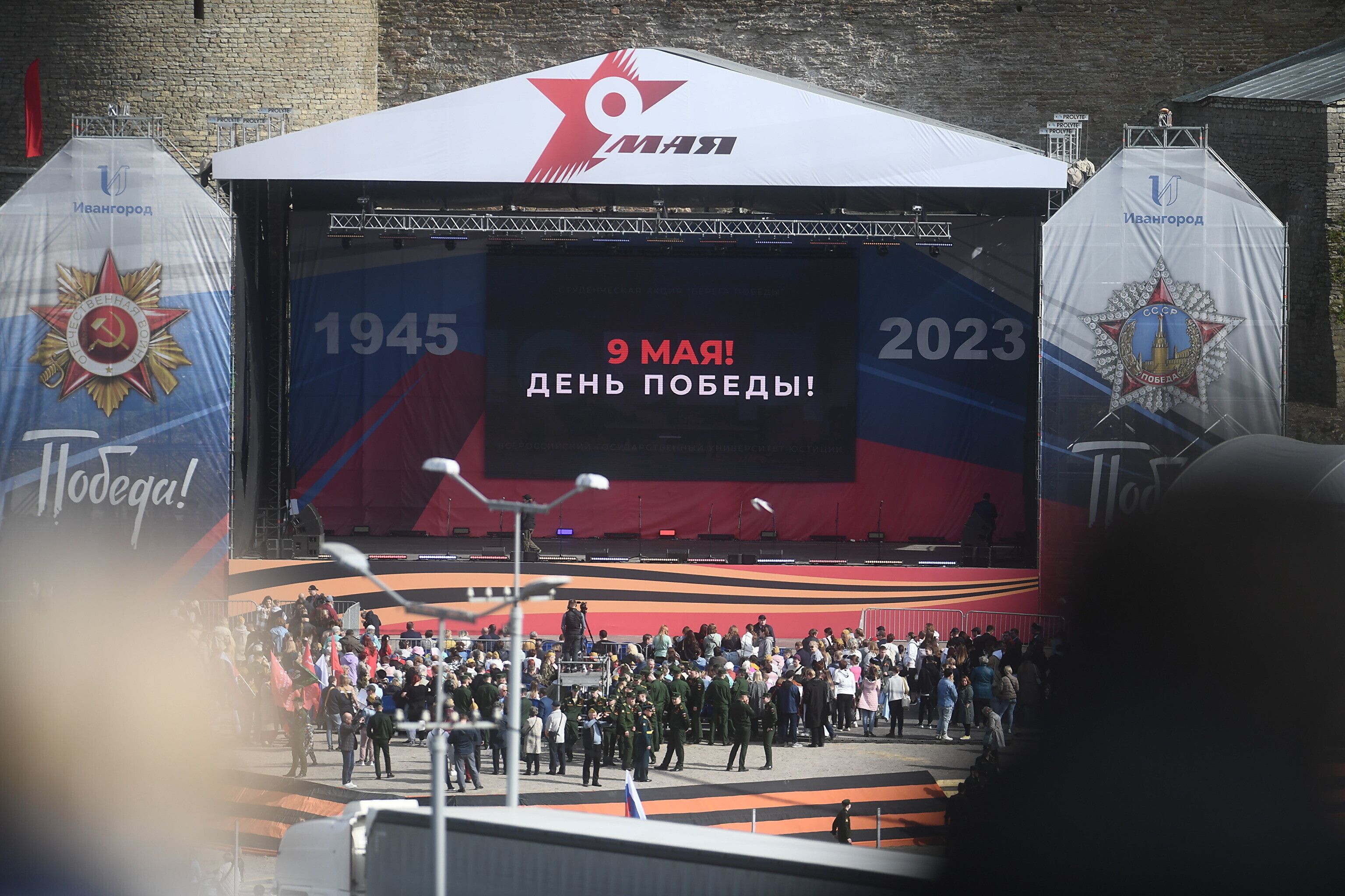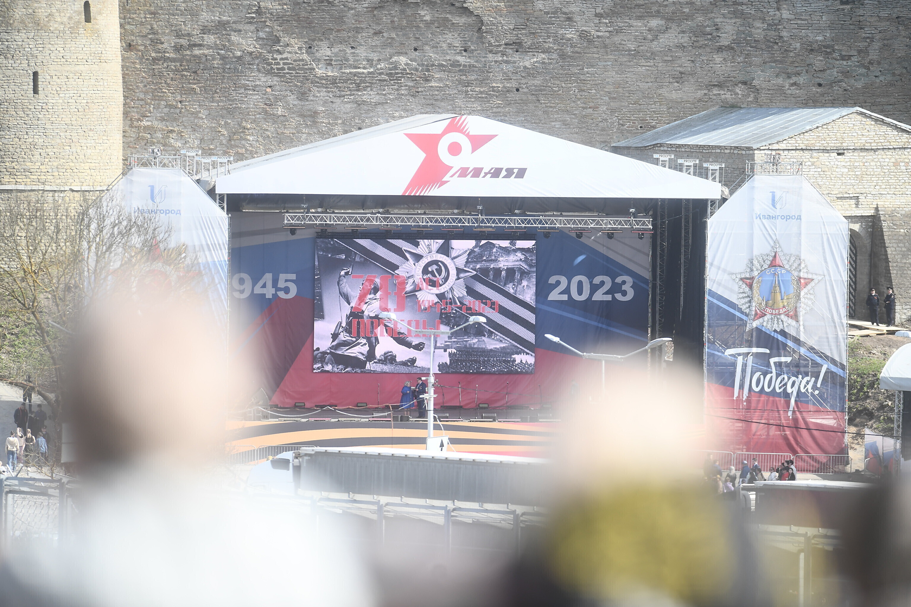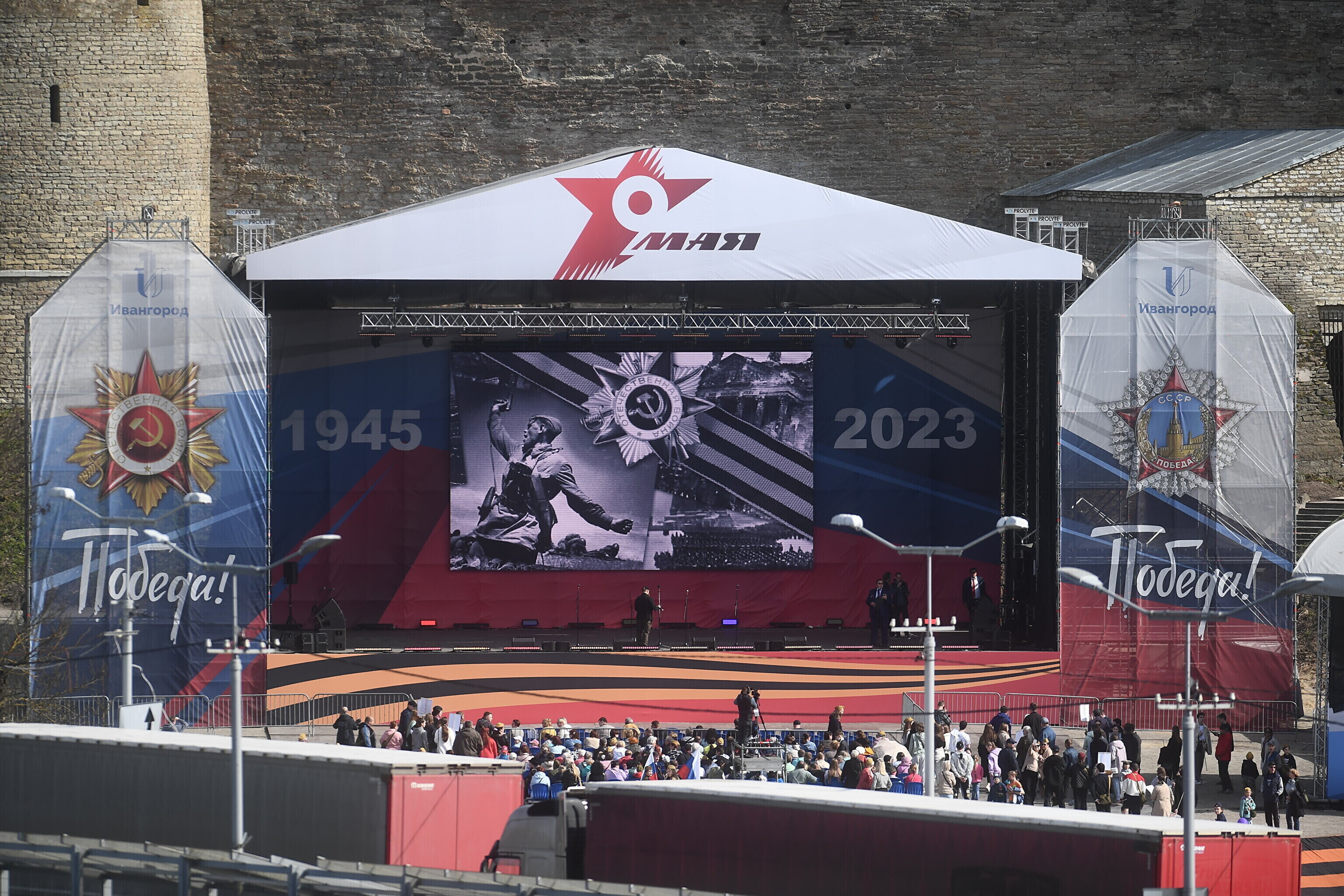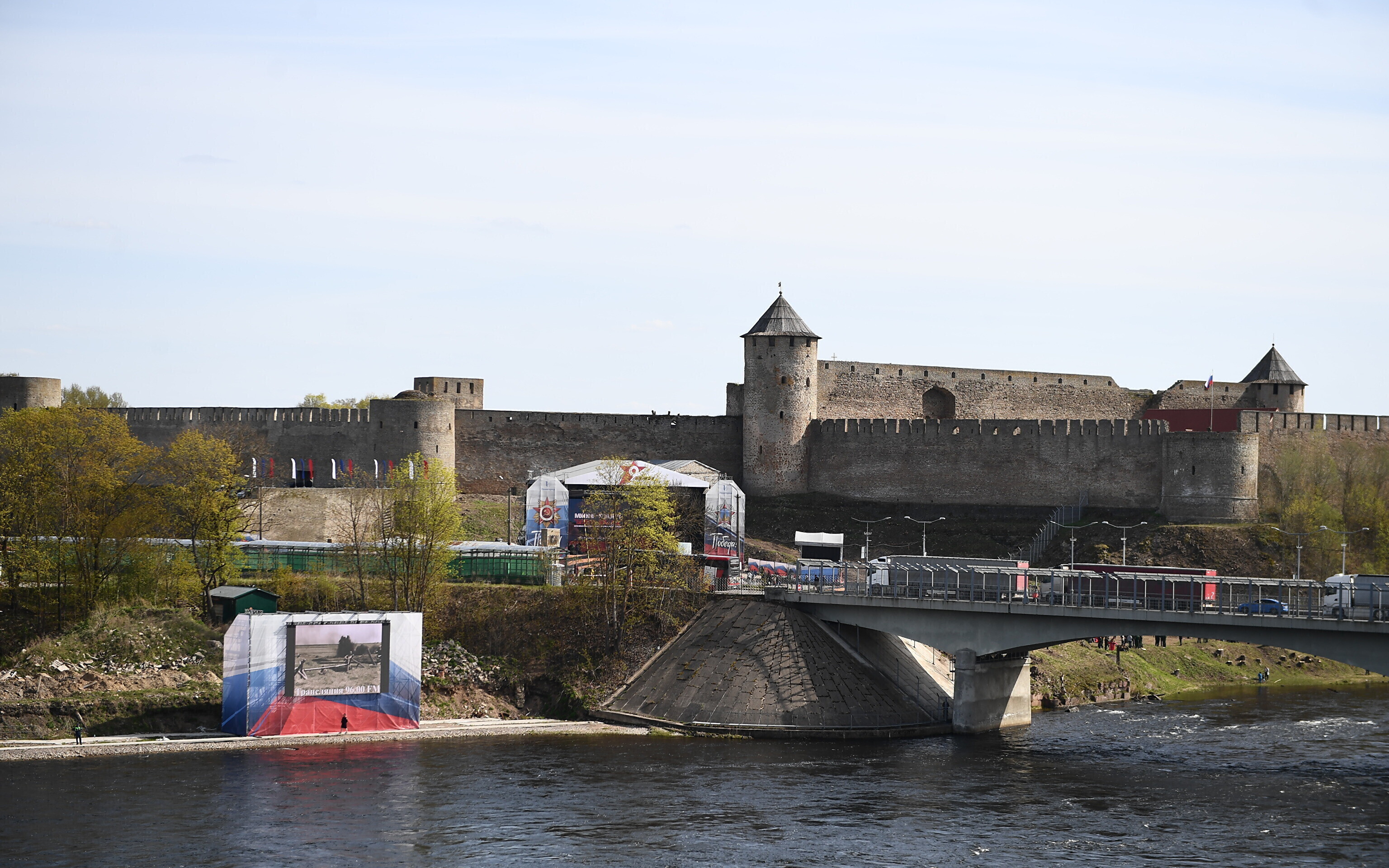 В воскресенье Rus.ERR сообщал, что возле реки Нарвы полным ходом идут работы по установке большого экрана, на котором восточные соседи намерены 9 мая транслировать для нарвитян концерт. Этот экран будет видно с речного променада у границы в Нарве. По планам, концерт в Ивангороде должен пройти с 16:00 до 19:00.