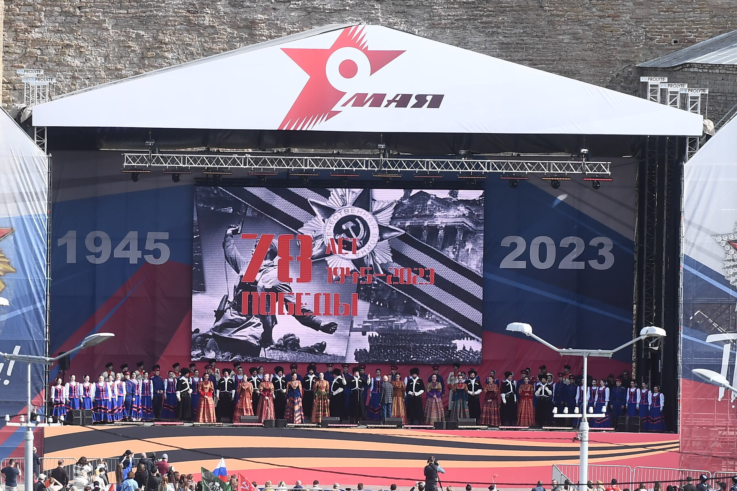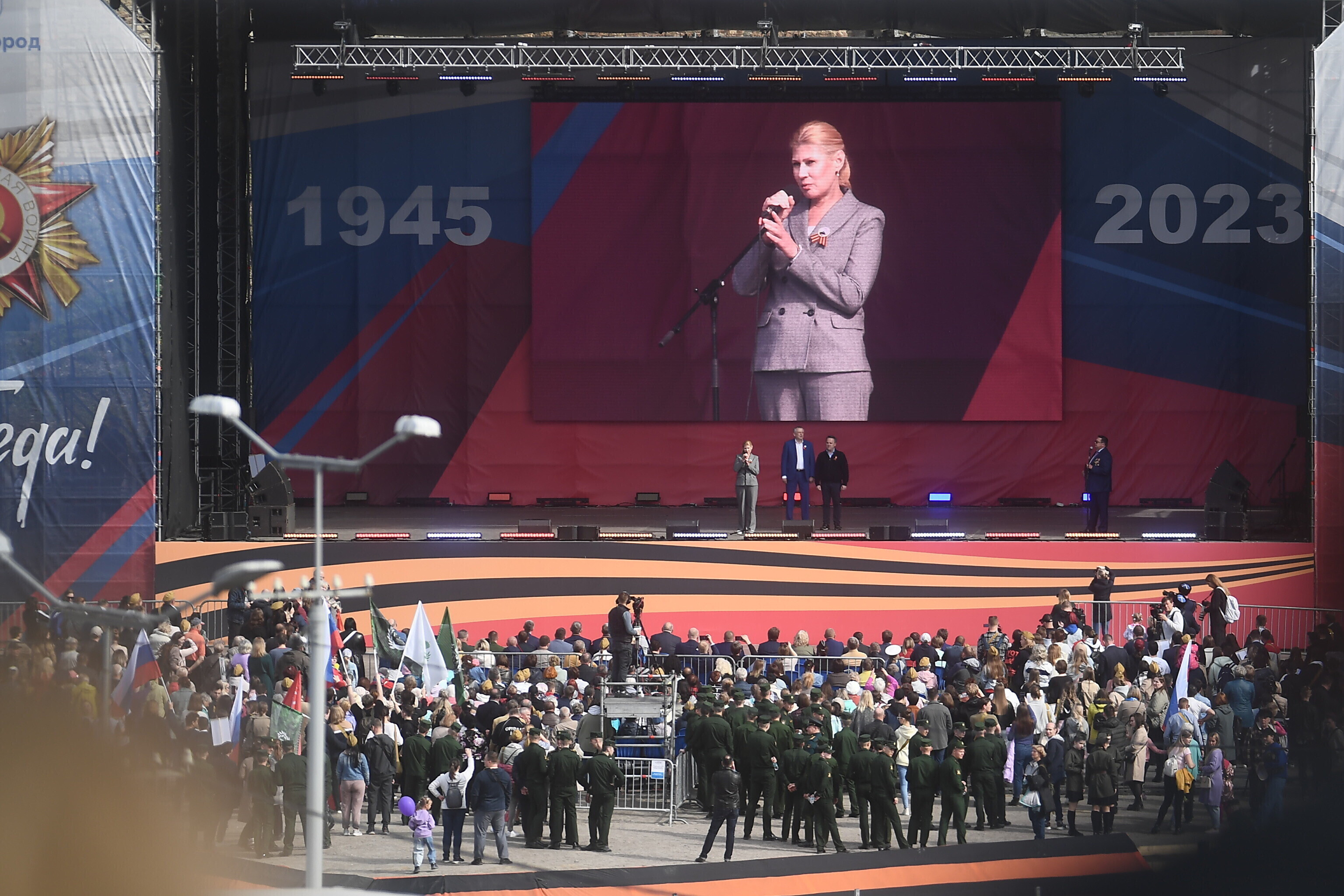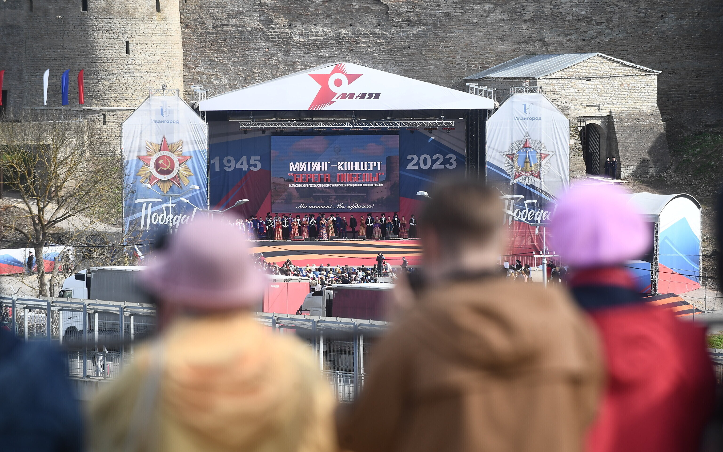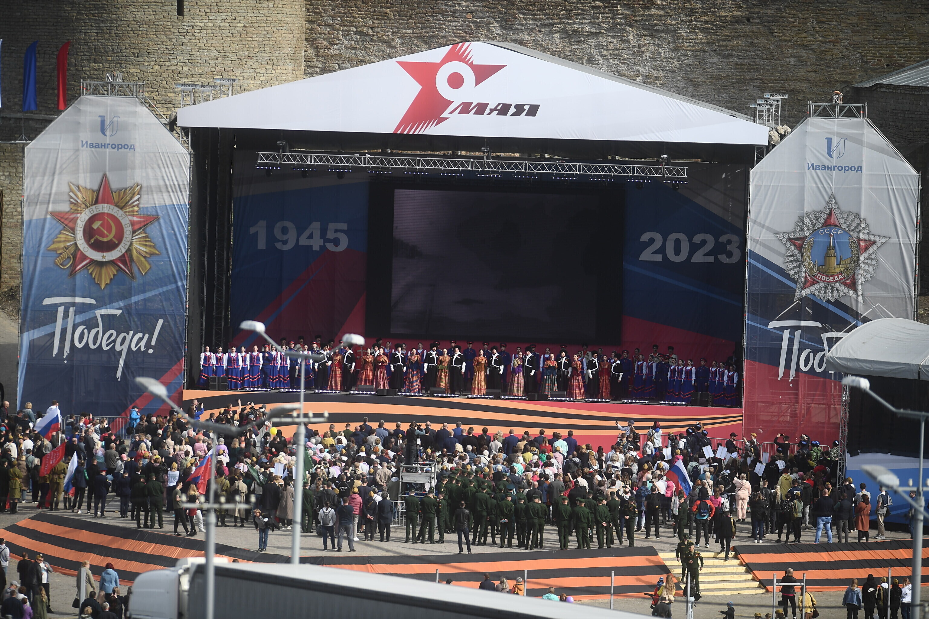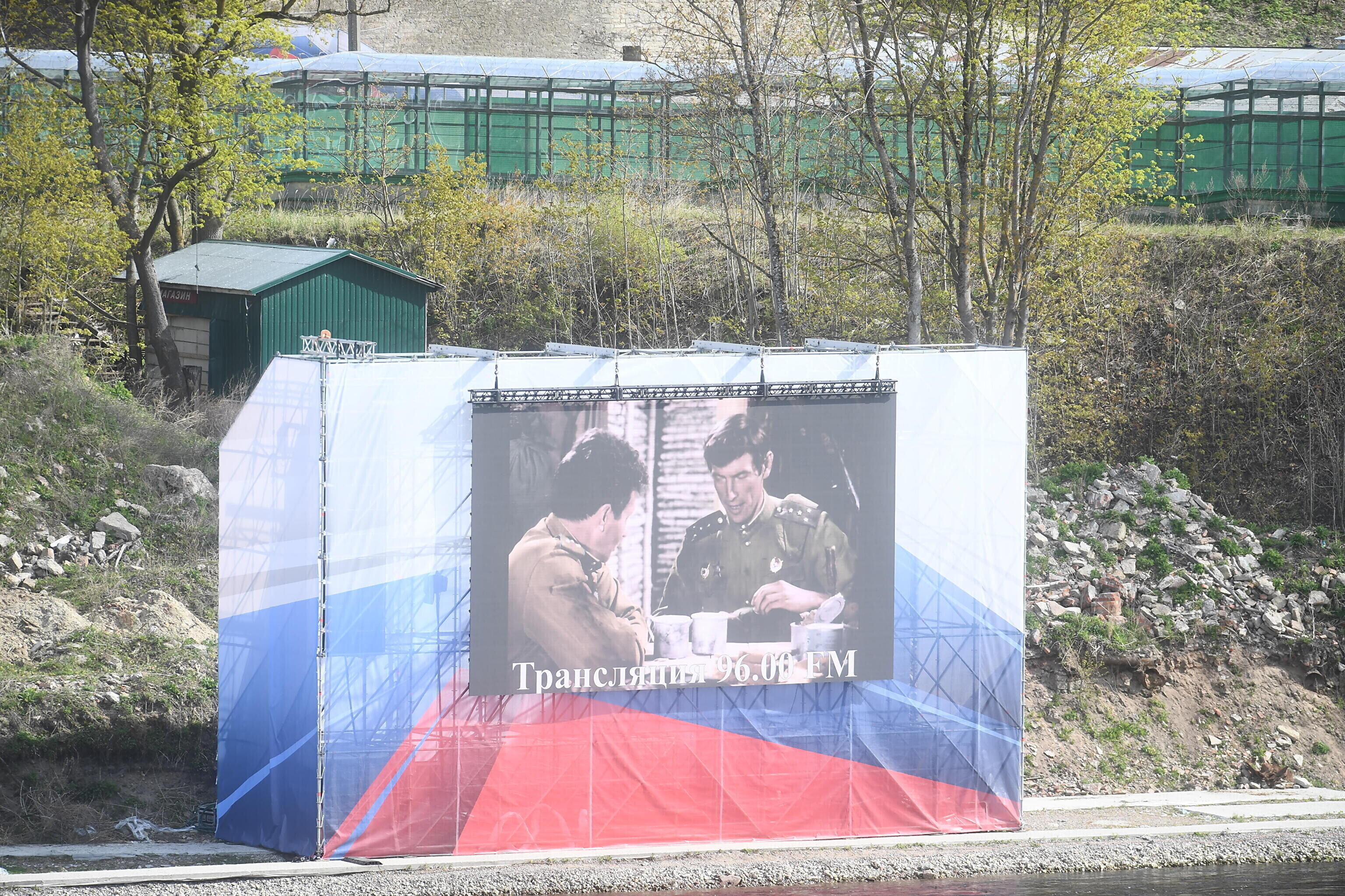 В воскресенье Rus.ERR сообщал, что возле реки Нарвы полным ходом идут работы по установке большого экрана, на котором восточные соседи намерены 9 мая транслировать для нарвитян концерт. Этот экран будет видно с речного променада у границы в Нарве. По планам, концерт в Ивангороде должен пройти с 16:00 до 19:00.