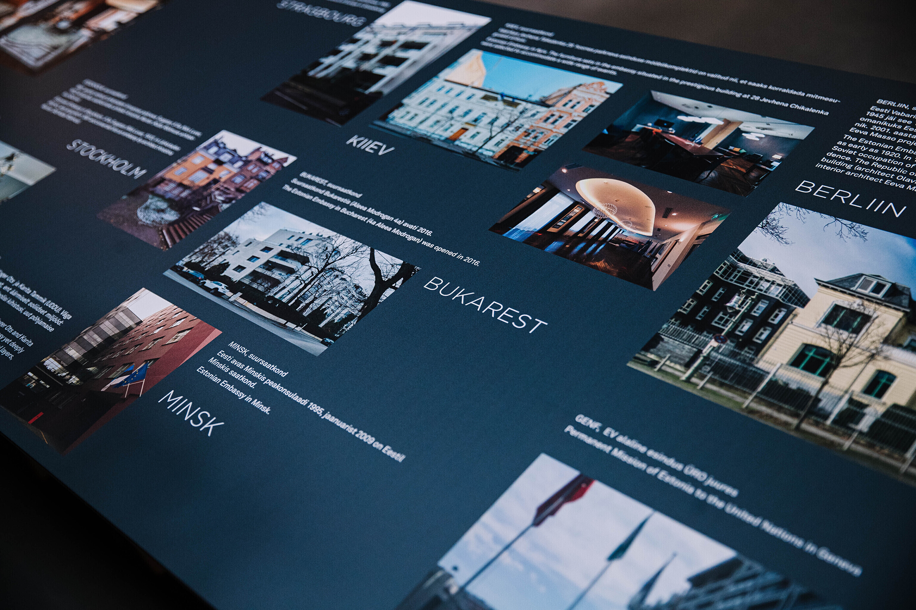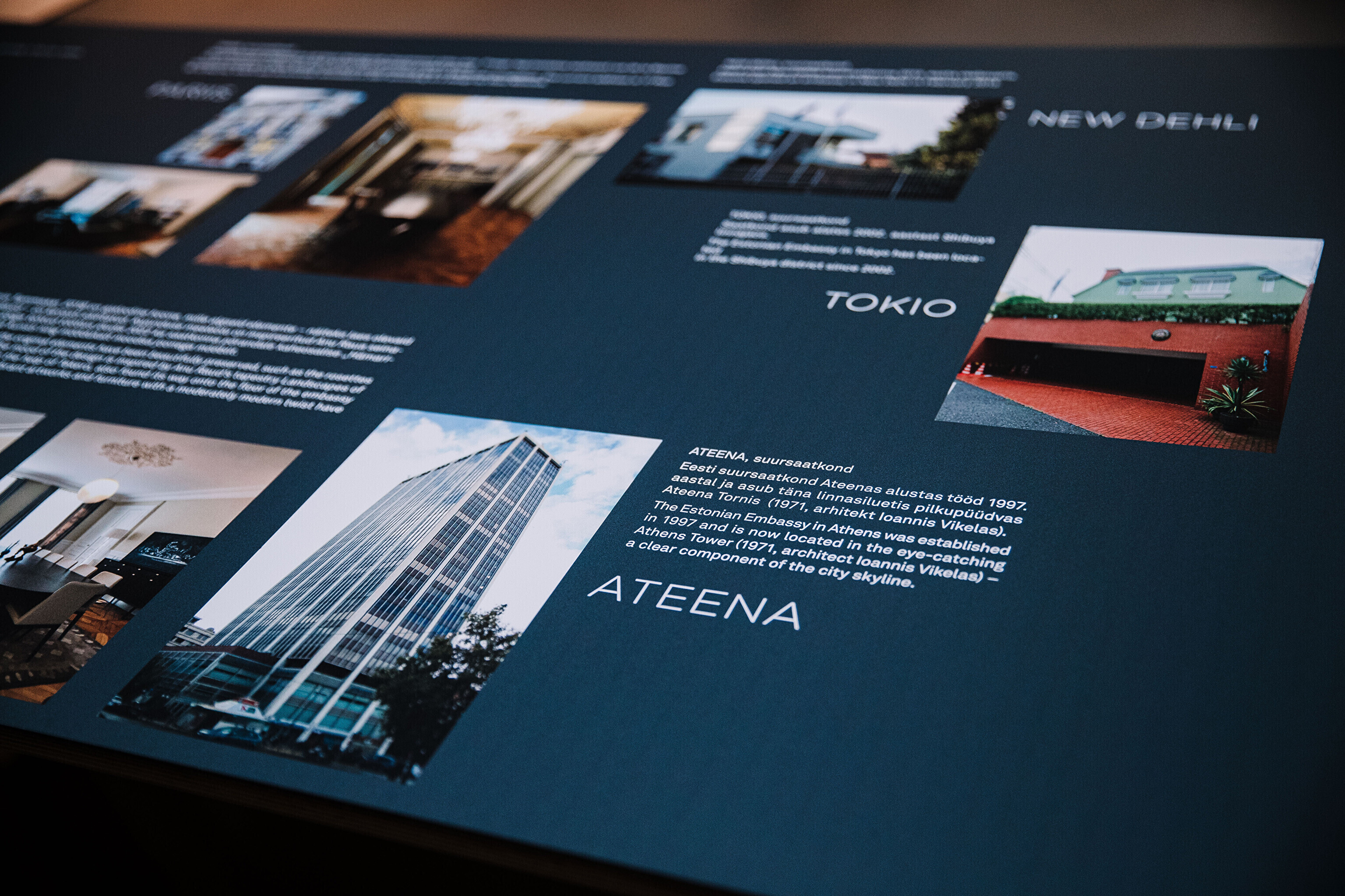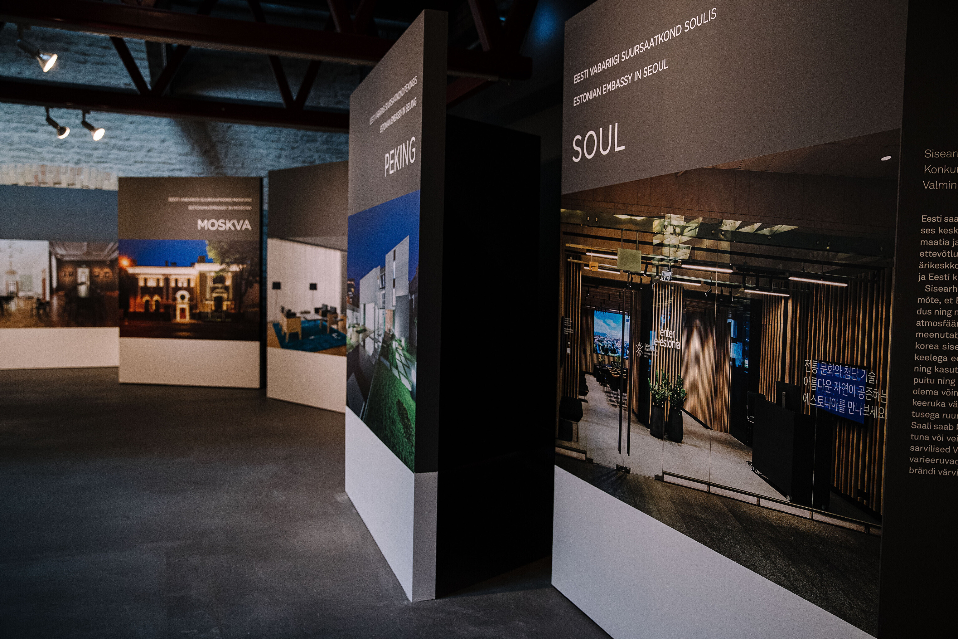 Самое первое новое здание посольства ЭР было построено в Хельсинки по проекту Константина Бёлау. Один за другим как в исторических, так и новых посольствах Эстонии появлялись выдающиеся интерьеры. На выставке "Пространственная дипломатия" представлены интересные интерьеры Маргит Аргус, Ээро Юргенсона, Пилле Лаусмяэ-Лыоке, Лийзы Пыйме, Кадри Тамме, Тийу Труус и других. На выставке также представлена экспозиция эстонского дизайна и прикладного искусства, используемого в зарубежных представительствах.