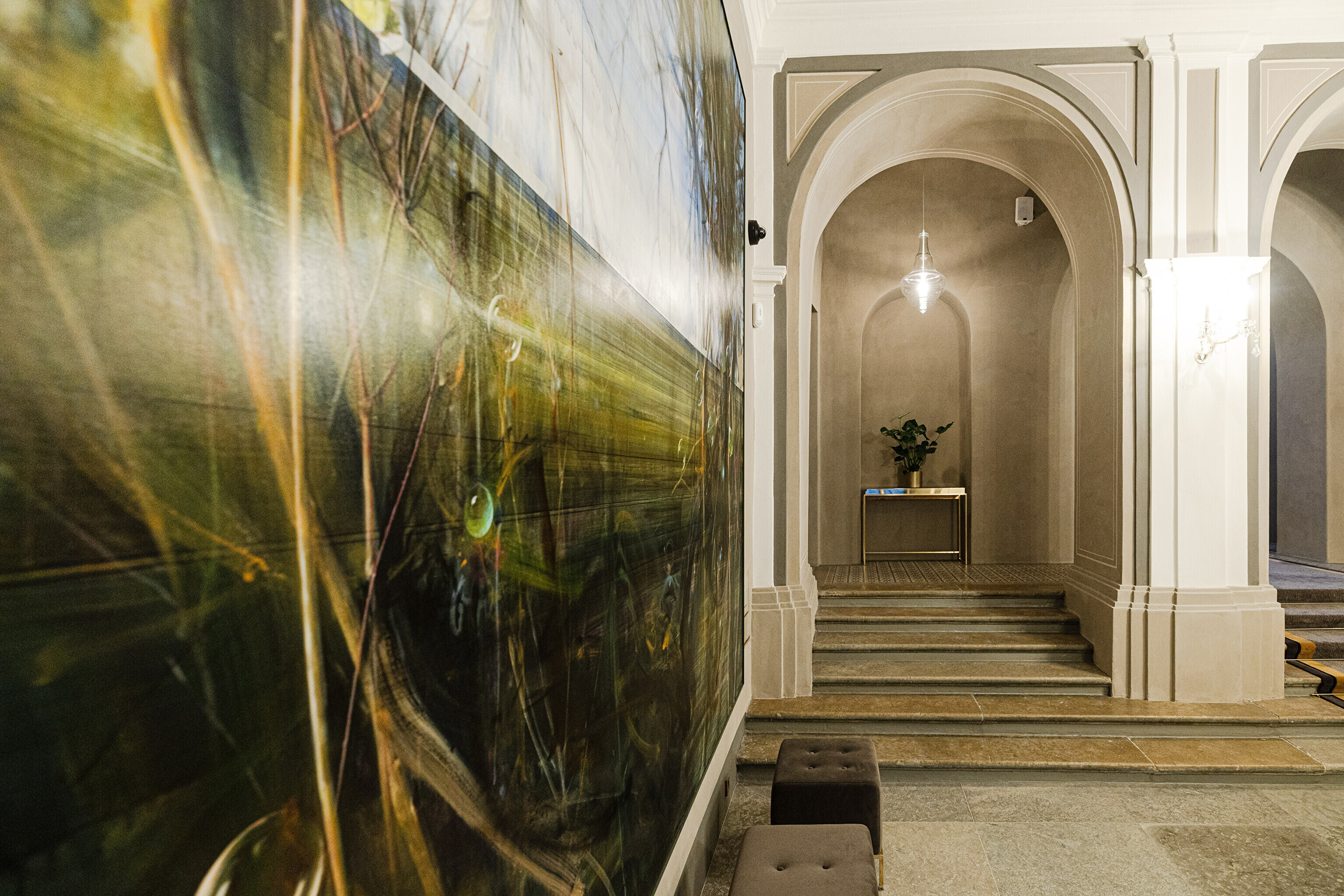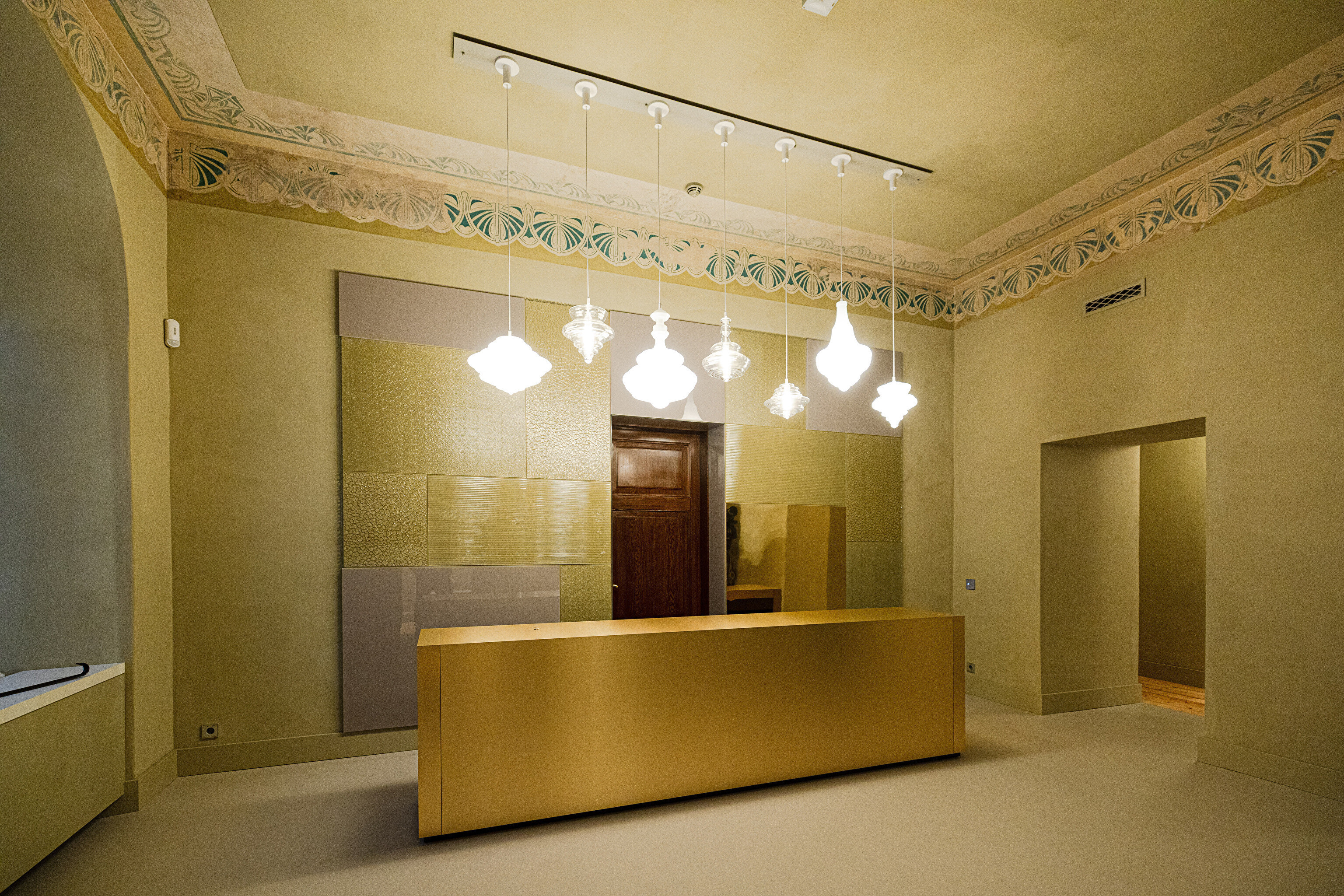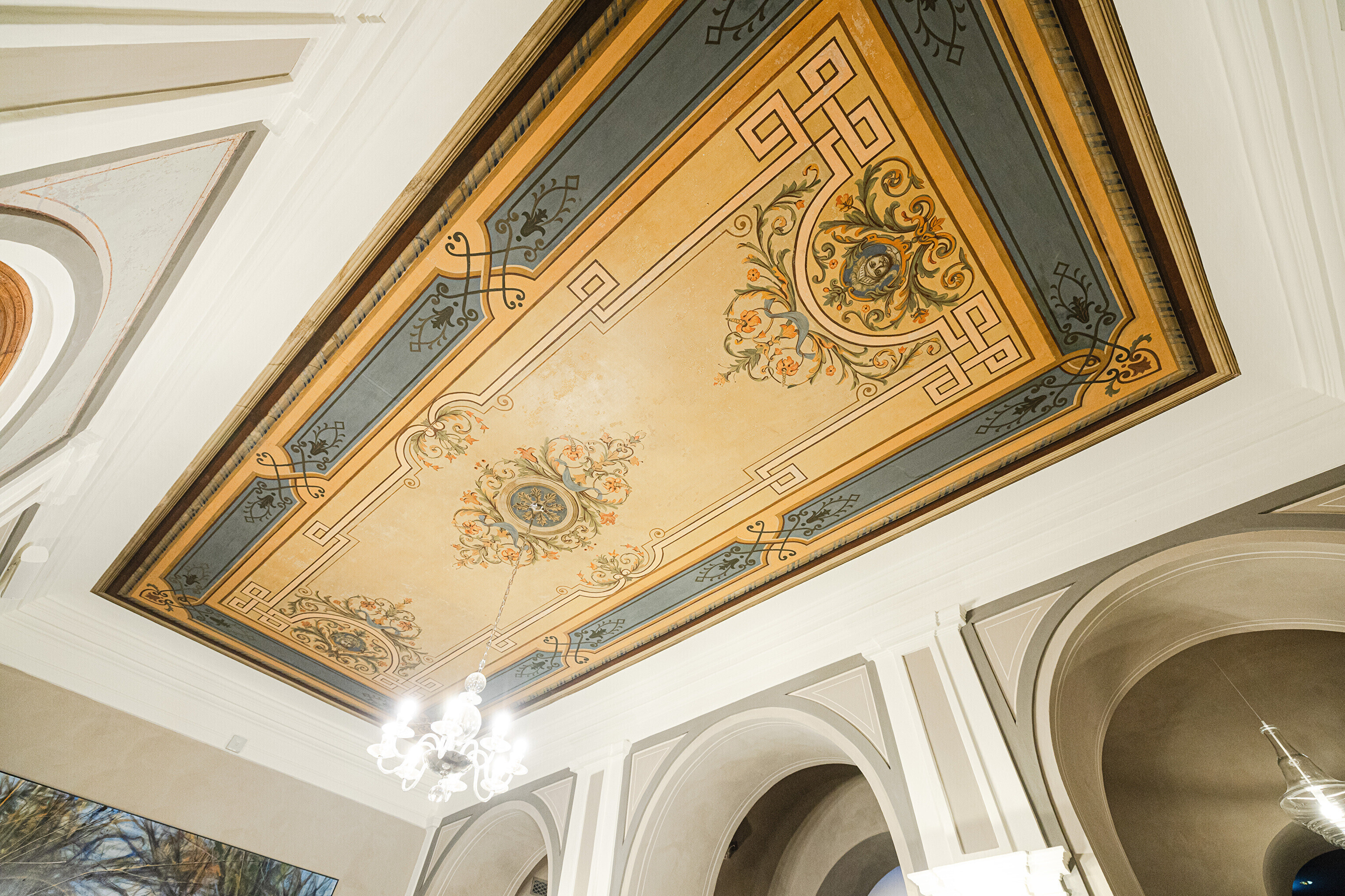 В этом же здании строителей ожидал и главный сюрприз – они наткнулись и на натяжной потолок с росписями того же 17-го века. О его существовании уже давно никто и не догадывался. Возможность украсить интерьеры своими работами представилась и некоторым современным художникам. Масштабное полотно сразу же привлекает внимание вошедших в здание с парадного входа.
