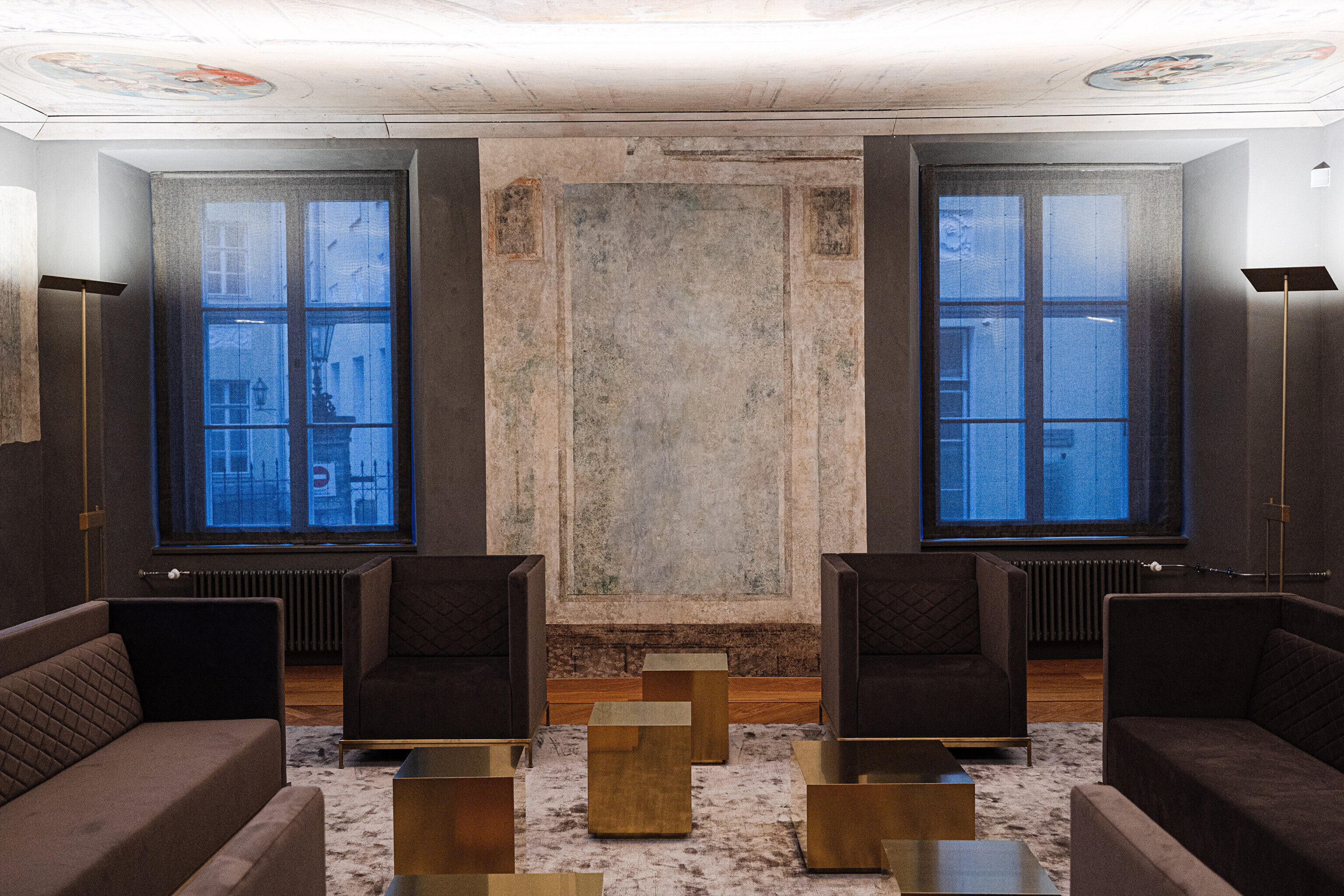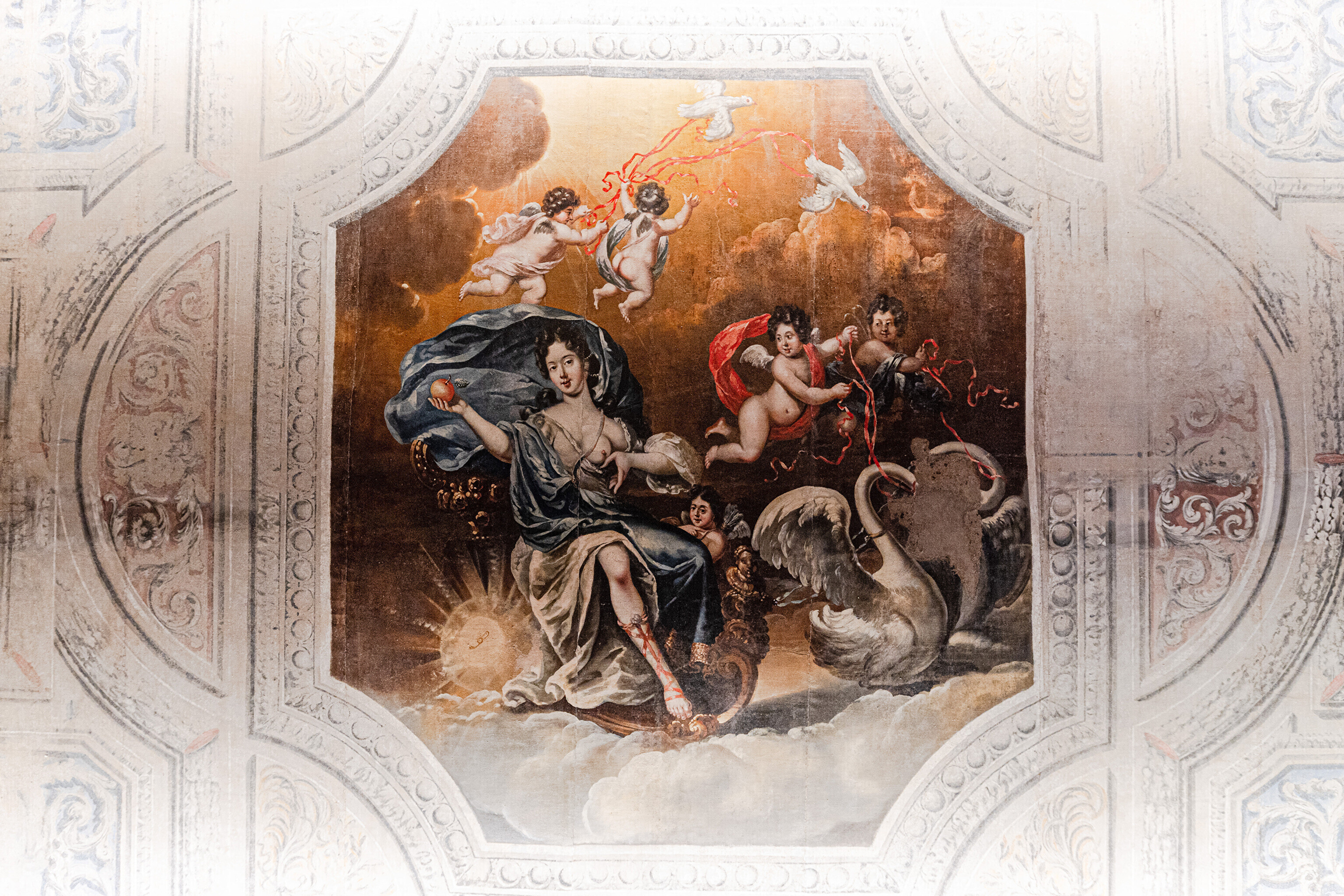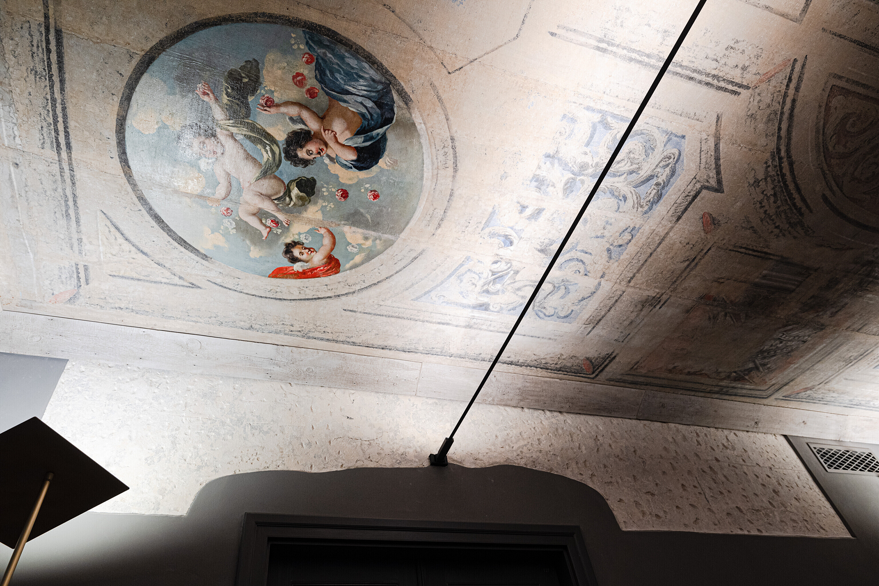 В этом же здании строителей ожидал и главный сюрприз – они наткнулись и на натяжной потолок с росписями того же 17-го века. О его существовании уже давно никто и не догадывался. Возможность украсить интерьеры своими работами представилась и некоторым современным художникам. Масштабное полотно сразу же привлекает внимание вошедших в здание с парадного входа.