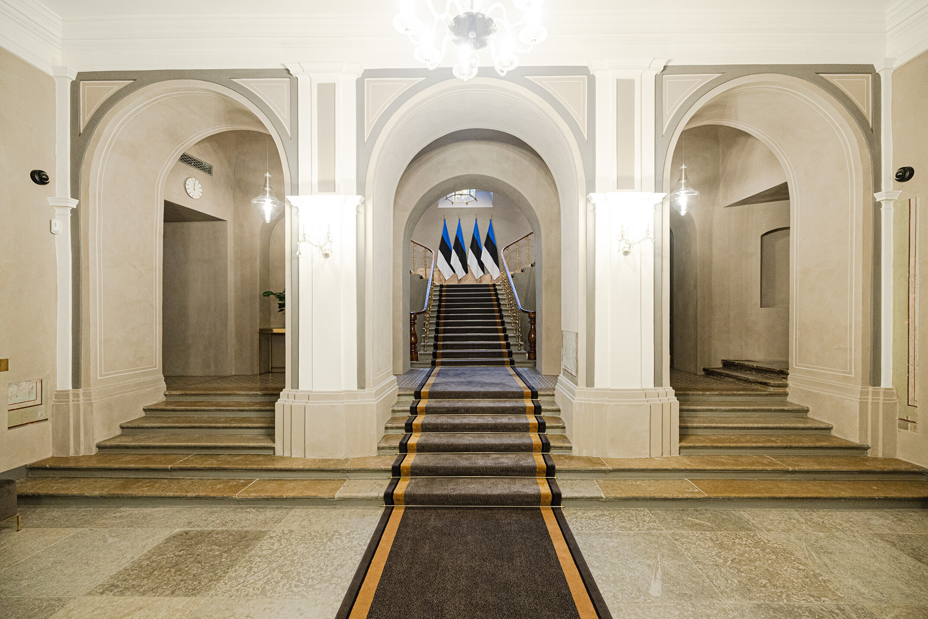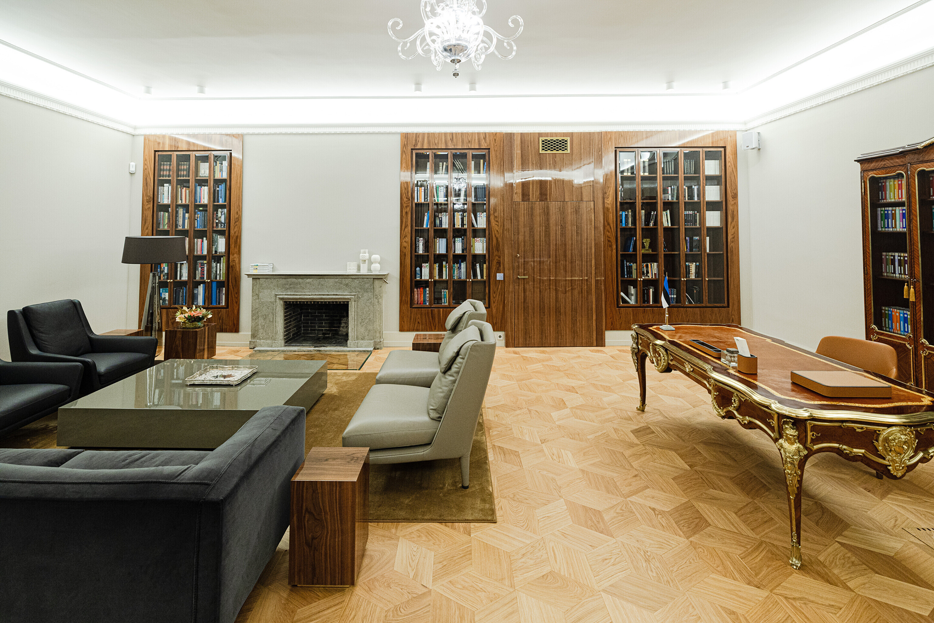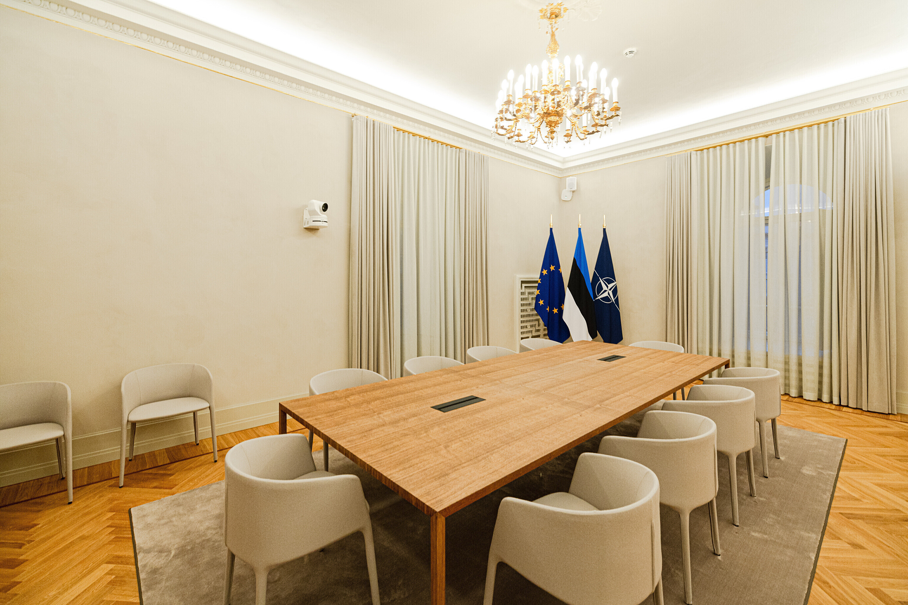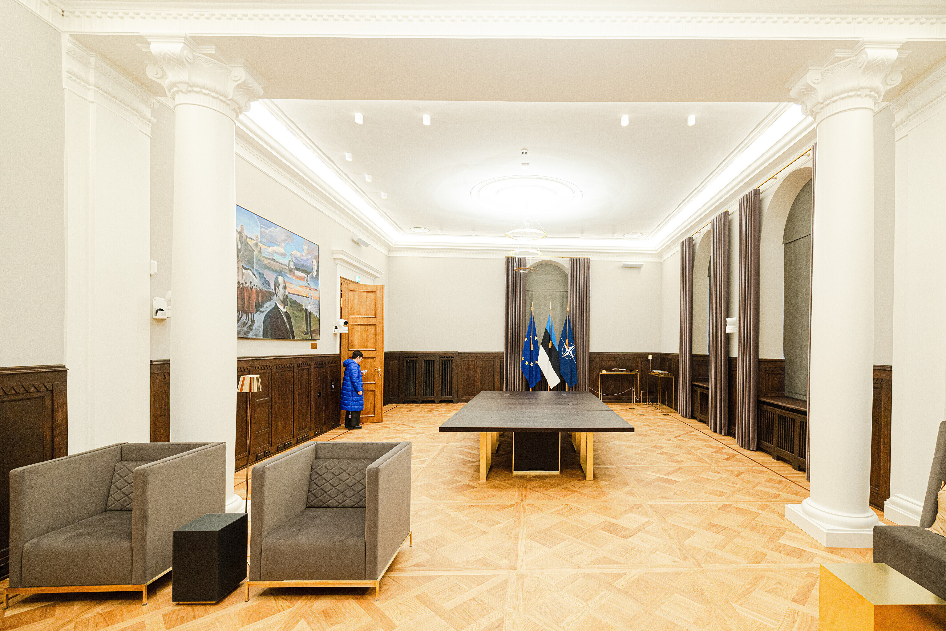 В здании, некогда принадлежавшем рыцарскому собранию, в годы довоенной Эстонской Республики размещалось Министерство иностранных дел, а в советскую эпоху его занимала Национальная библиотека. Несколько лет назад было решено превратить его в представительское здание, в котором можно будет принимать высоких зарубежных гостей, проводить пресс-конференции и разного рода совещания. И вот после реконструкции и скрупулезной реставрации импозантные залы предстали в былом великолепии, которое дополнено элегантной современной мебелью и дизайнерскими светильниками, а также ценными и даже уникальными артефактами, передает "Актуальная камера".