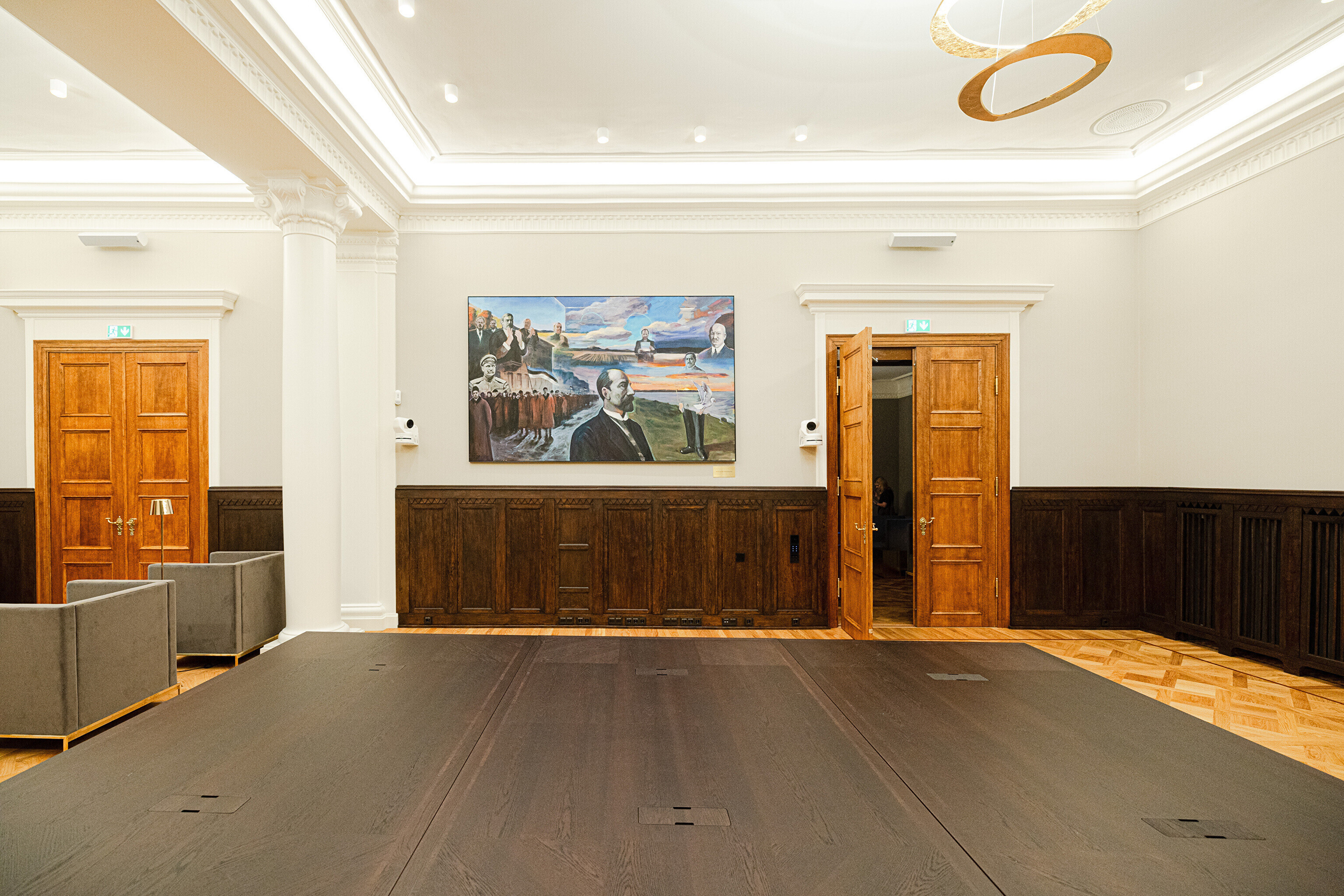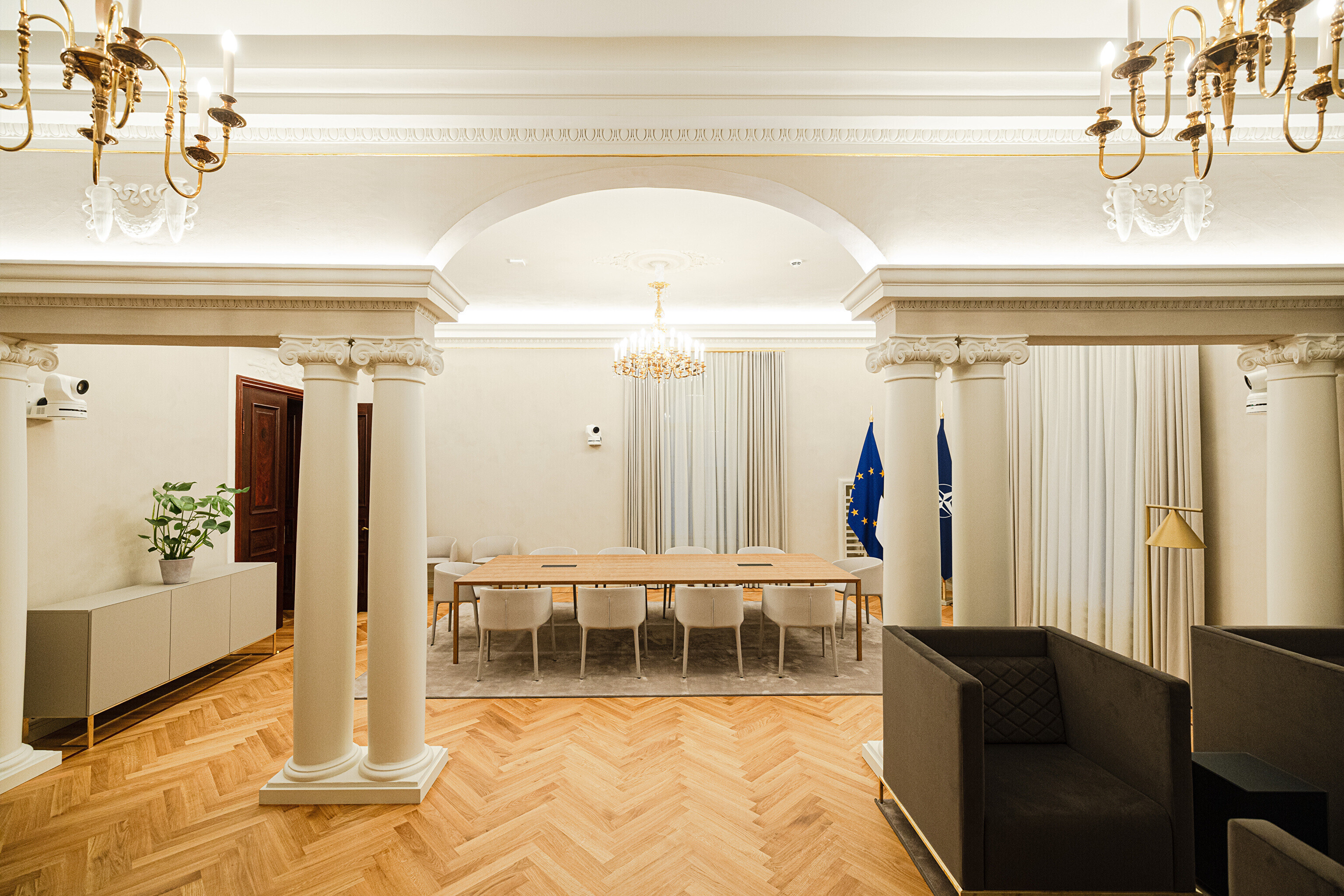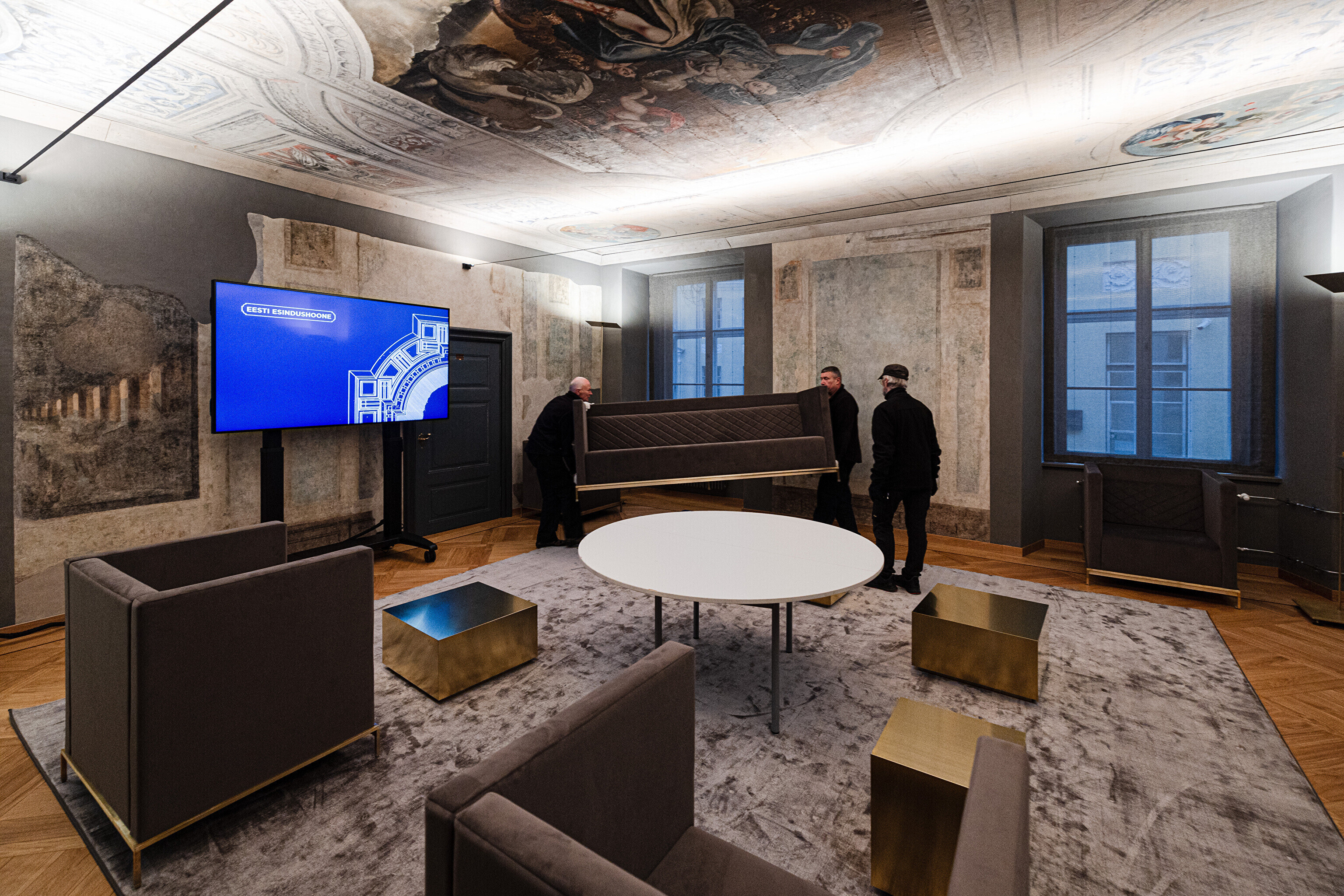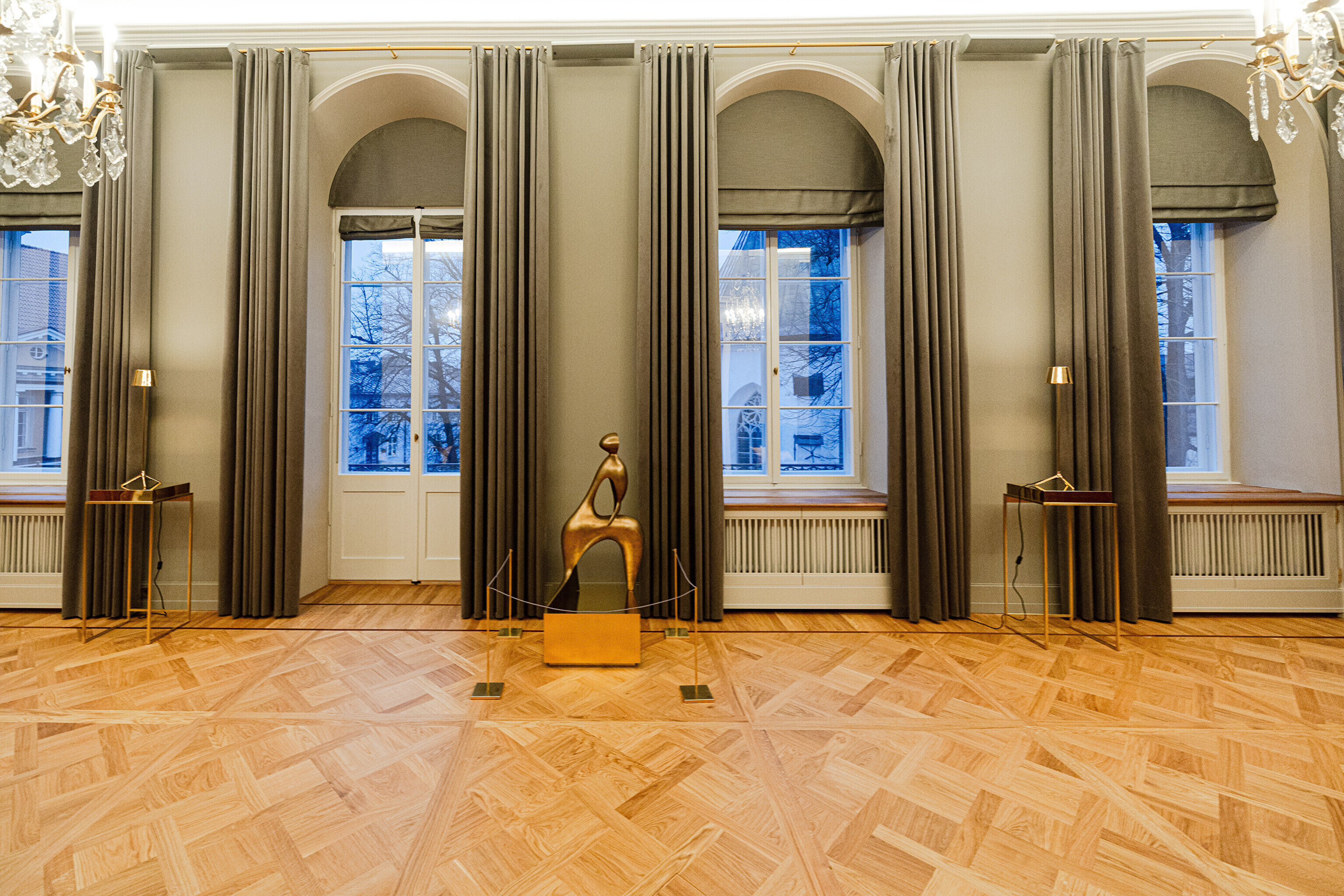 В здании, некогда принадлежавшем рыцарскому собранию, в годы довоенной Эстонской Республики размещалось Министерство иностранных дел, а в советскую эпоху его занимала Национальная библиотека. Несколько лет назад было решено превратить его в представительское здание, в котором можно будет принимать высоких зарубежных гостей, проводить пресс-конференции и разного рода совещания. И вот после реконструкции и скрупулезной реставрации импозантные залы предстали в былом великолепии, которое дополнено элегантной современной мебелью и дизайнерскими светильниками, а также ценными и даже уникальными артефактами, передает "Актуальная камера".