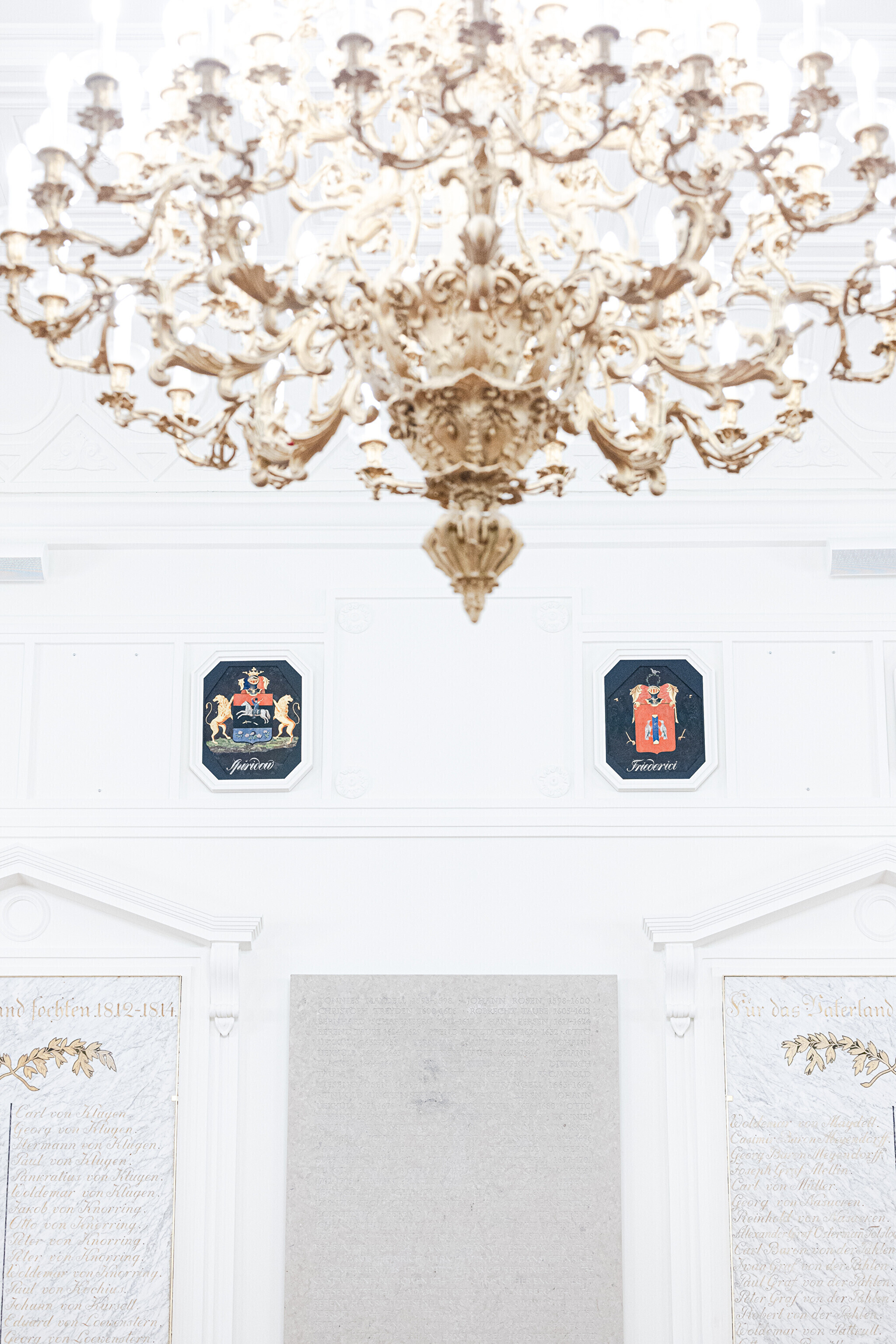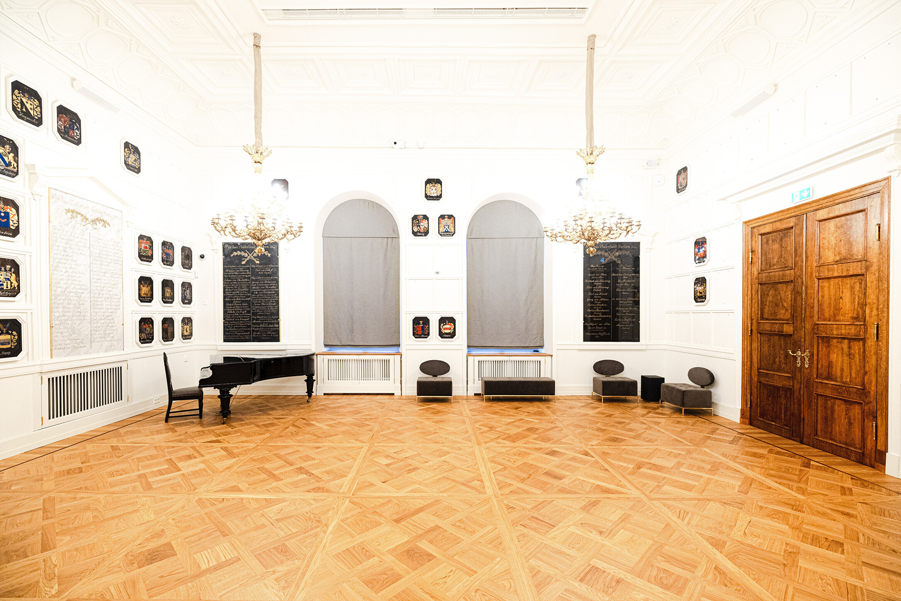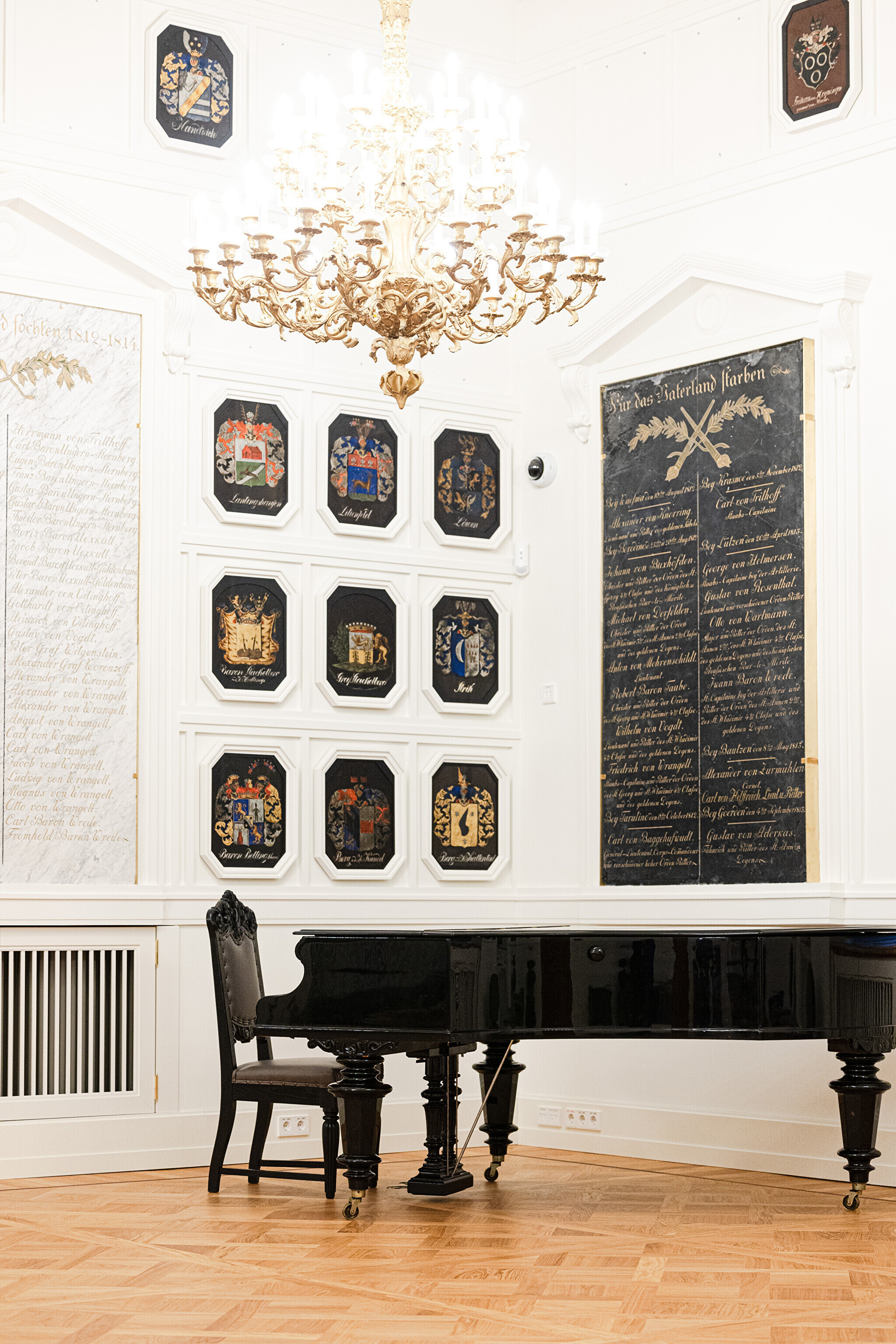 "Самыми важными компонентами этого зала являются, конечно, мемориальные доски с именами участников войн с Наполеоном, а также написанные на картоне дворянские гербы. Памятные плиты хранились до сих пор в Домском соборе, а гербы – в запасниках Художественного музея. Часть этих гербов ещё проходит реставрацию, но в итоге ими украшены все стены этого парадного зала", – рассказала дизайнер интерьеров Пилле Лаусмяэ-Лыоке.