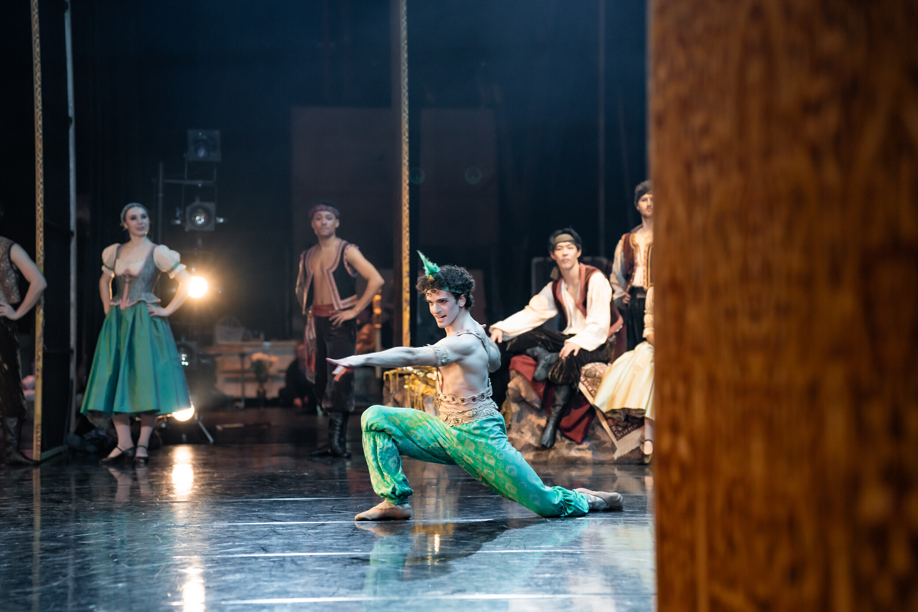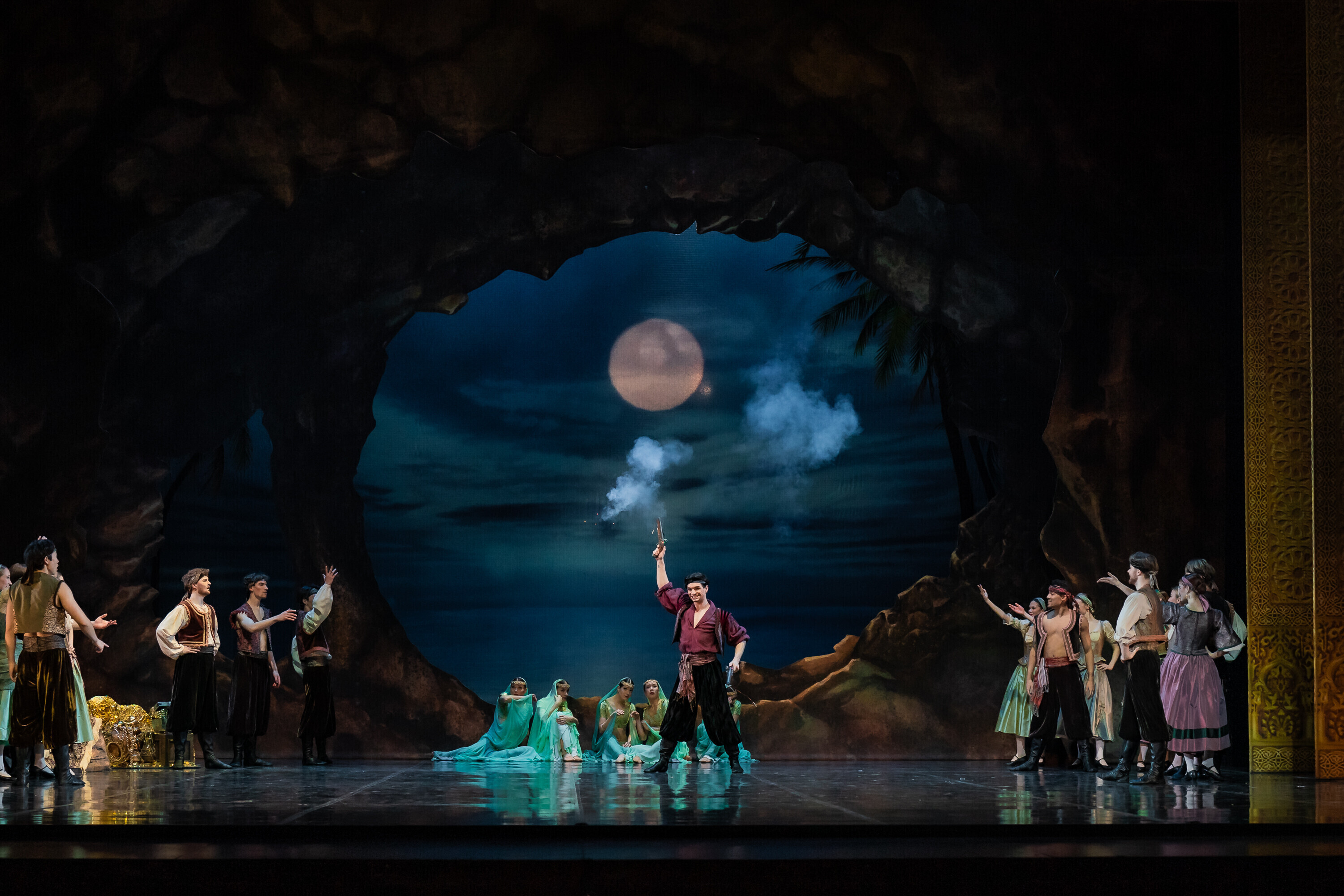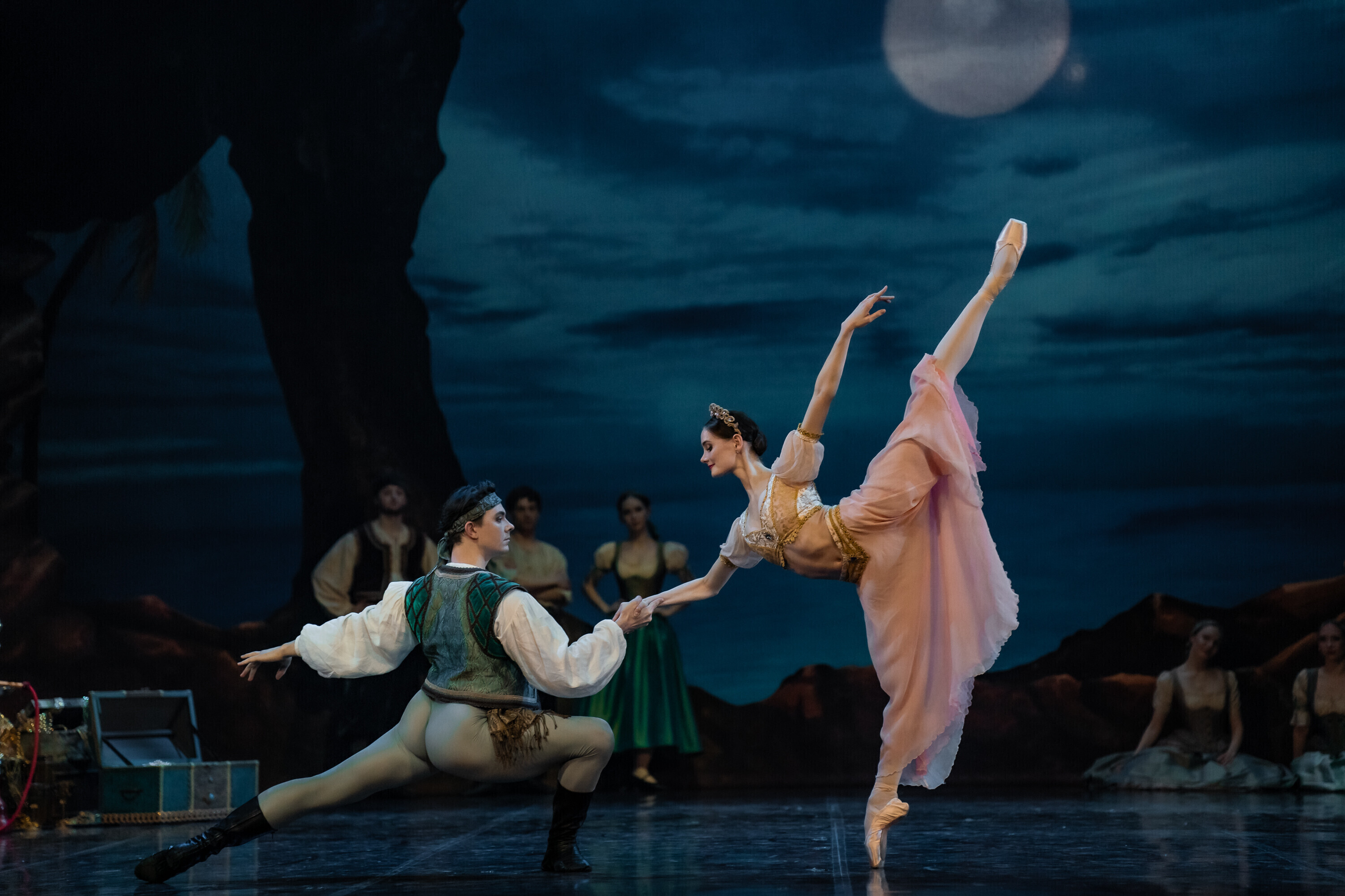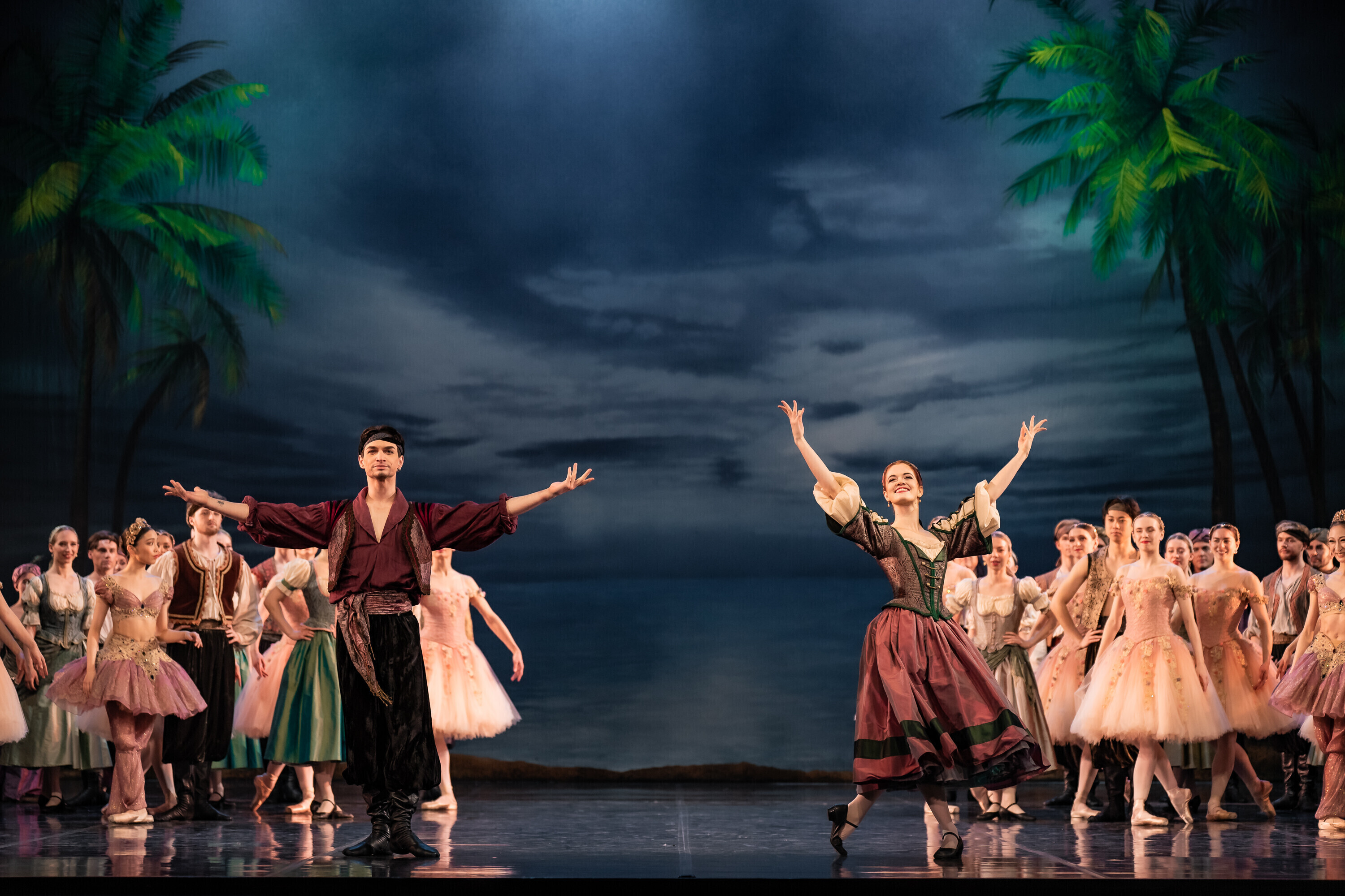 В Испанию отправилась команда из 84 человек, включая труппу и технический персонал. В главных ролях балета "Корсар" в Севилье выступили Анна Роберта, Ами Морита, Кетлин Оя, Лаура Майя, Аканэ Ичии, Джоэл Александр Калстар-Фишер, Уильям Ньютон, Али Урата, Финн Адамс и Кристиано Принчипато. Местным оркестром руководил дирижер Национальной оперы Эстонии Каспар Мянд.