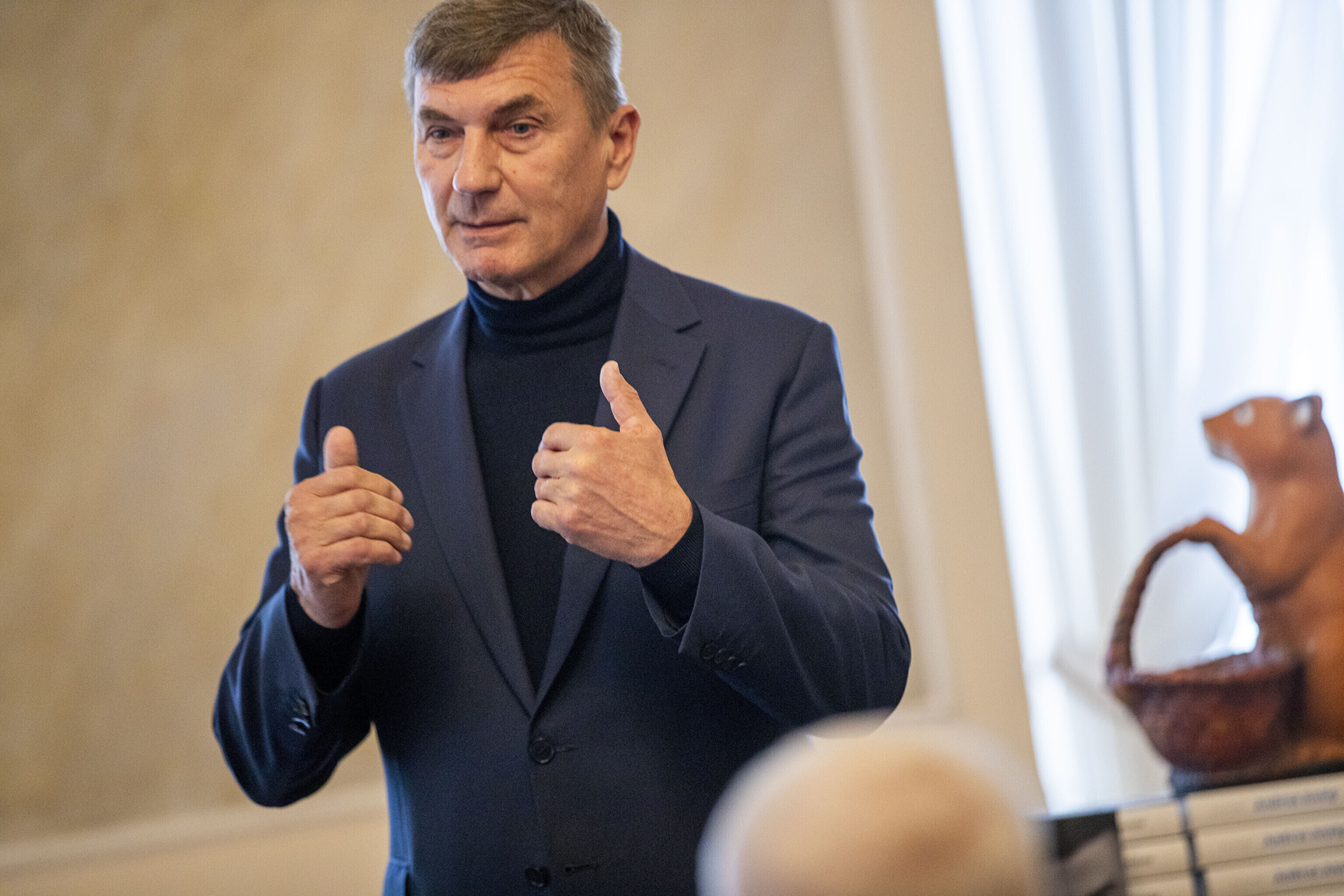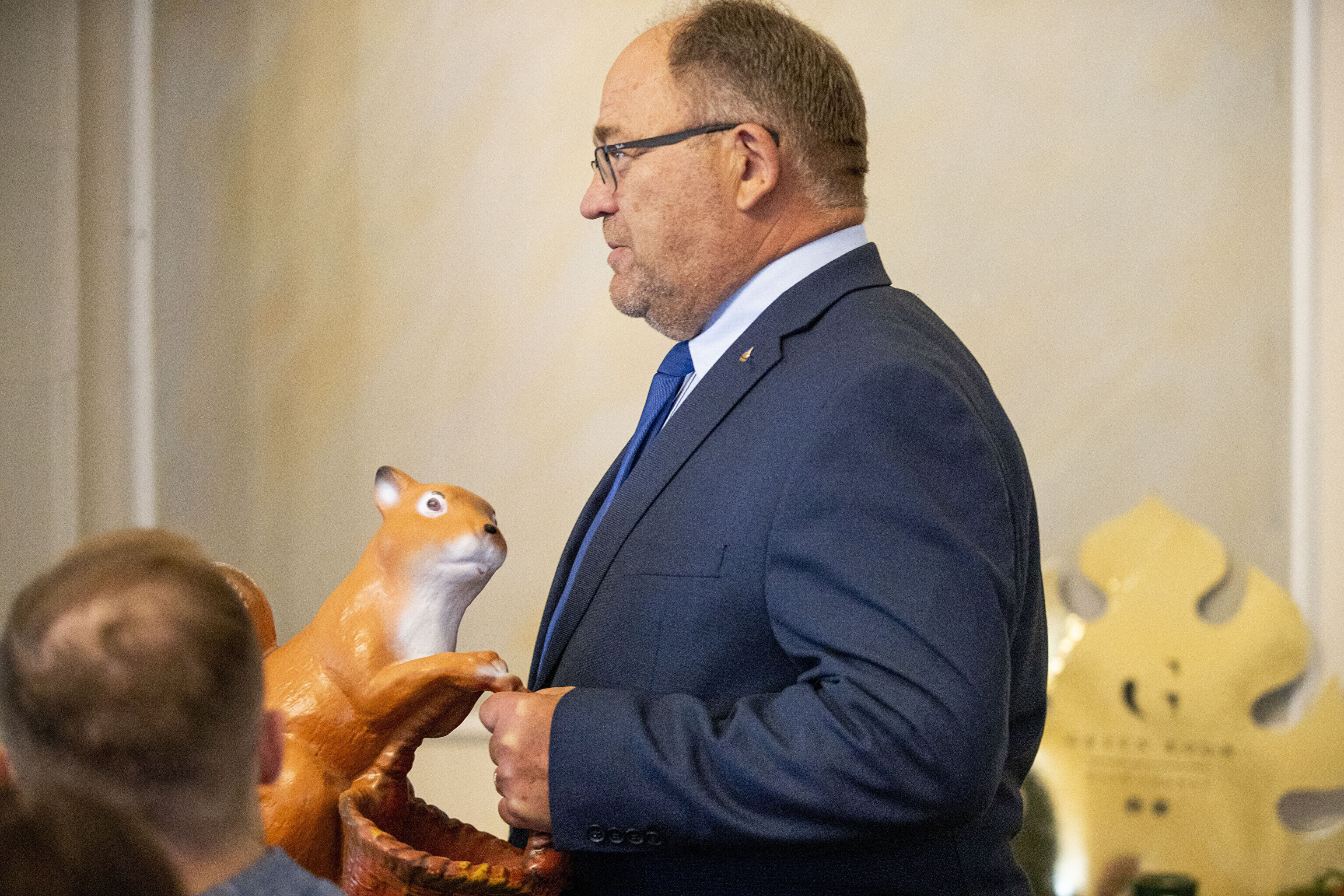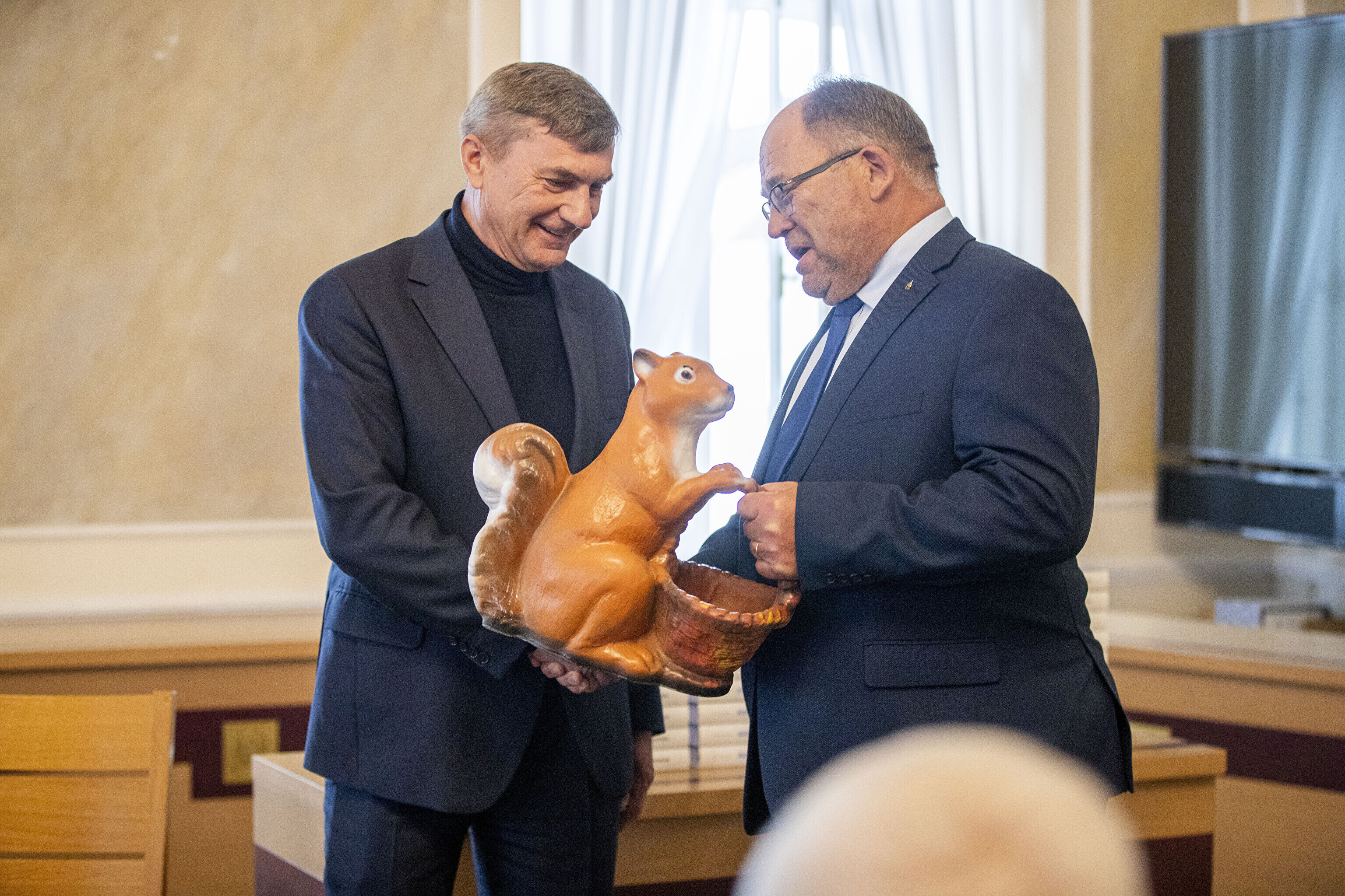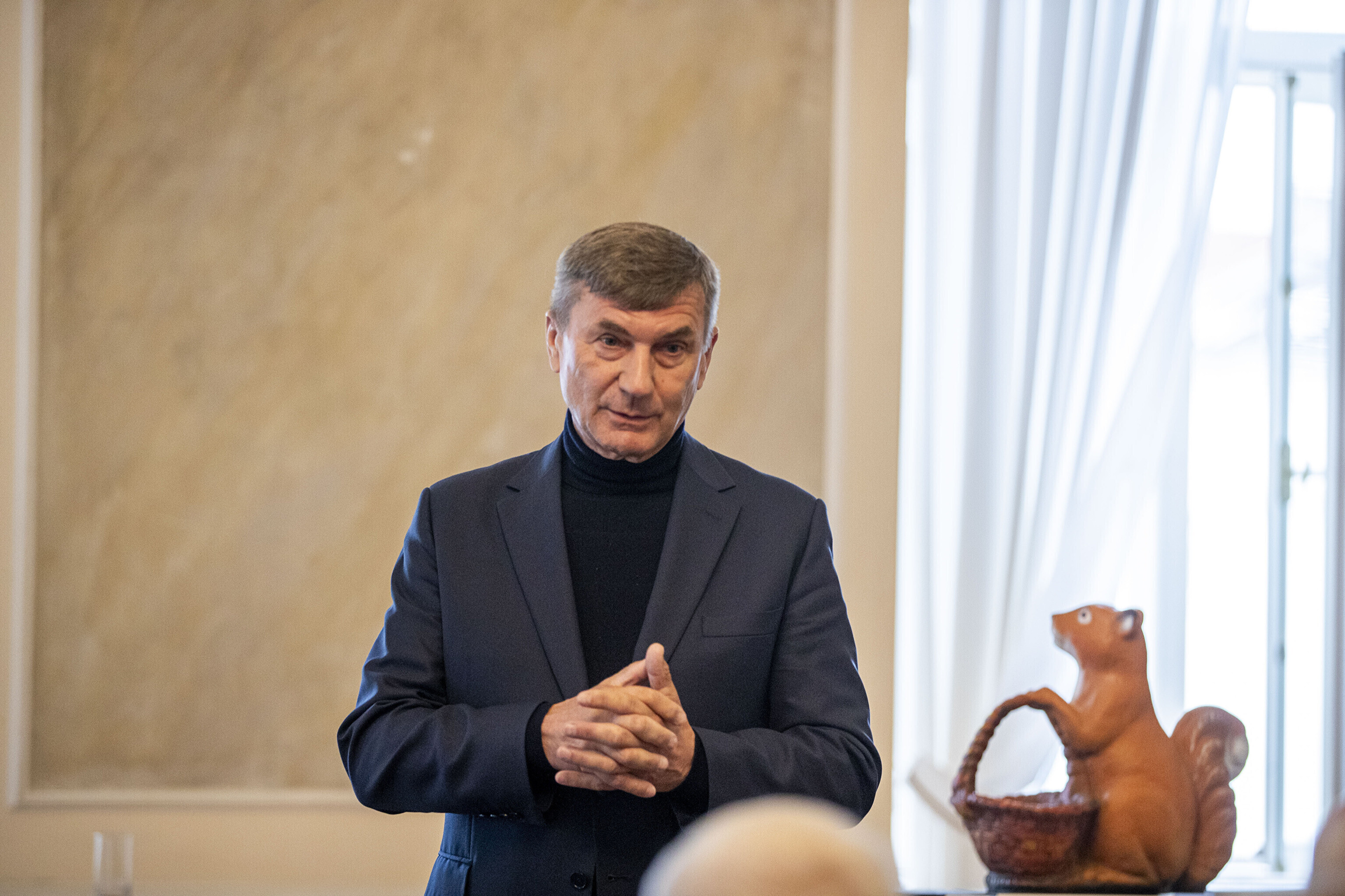 Предприниматель Нейнар Сели на презентации, прошедшей в Тартуской ратуше, подарил Ансипу статуэтку белки.