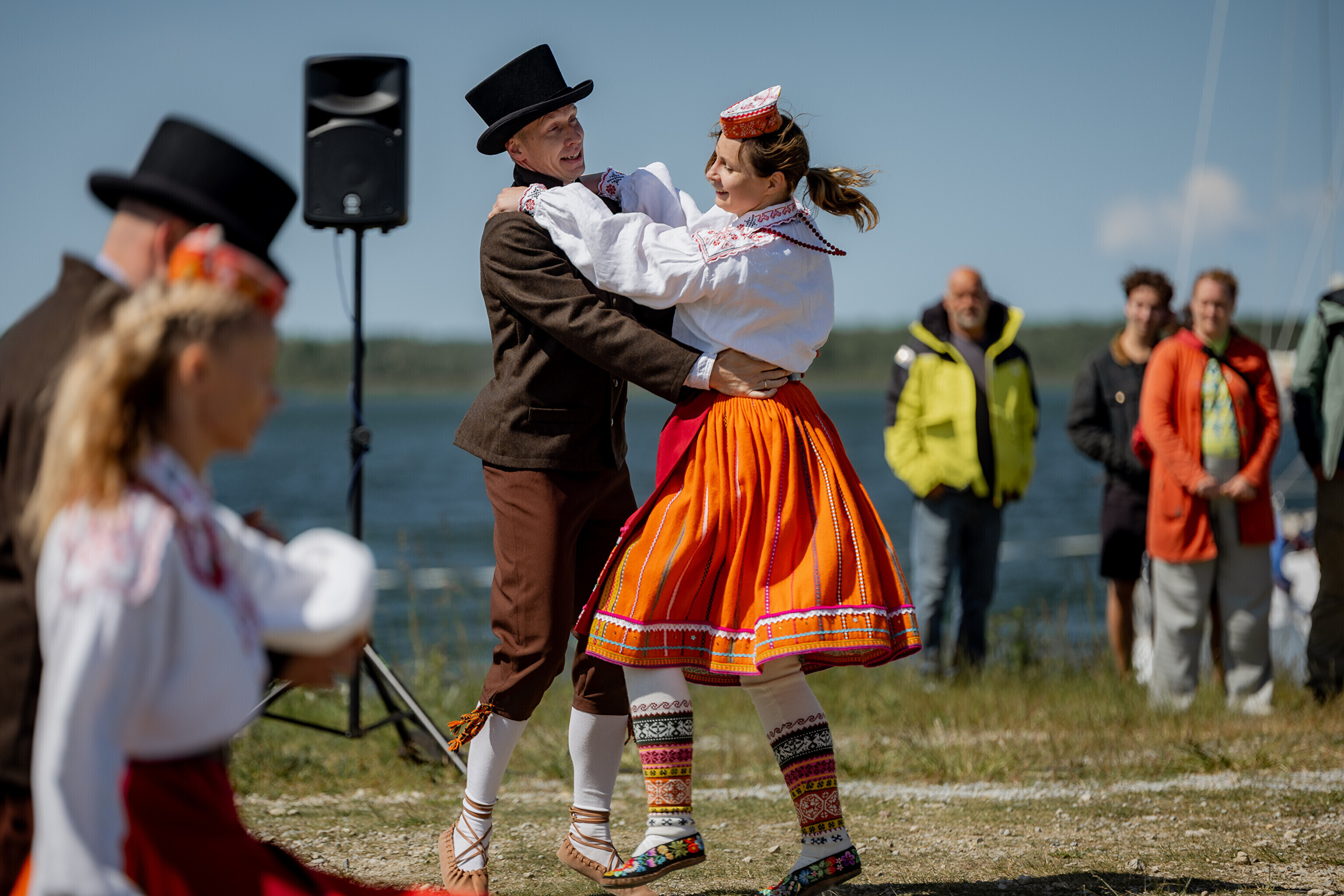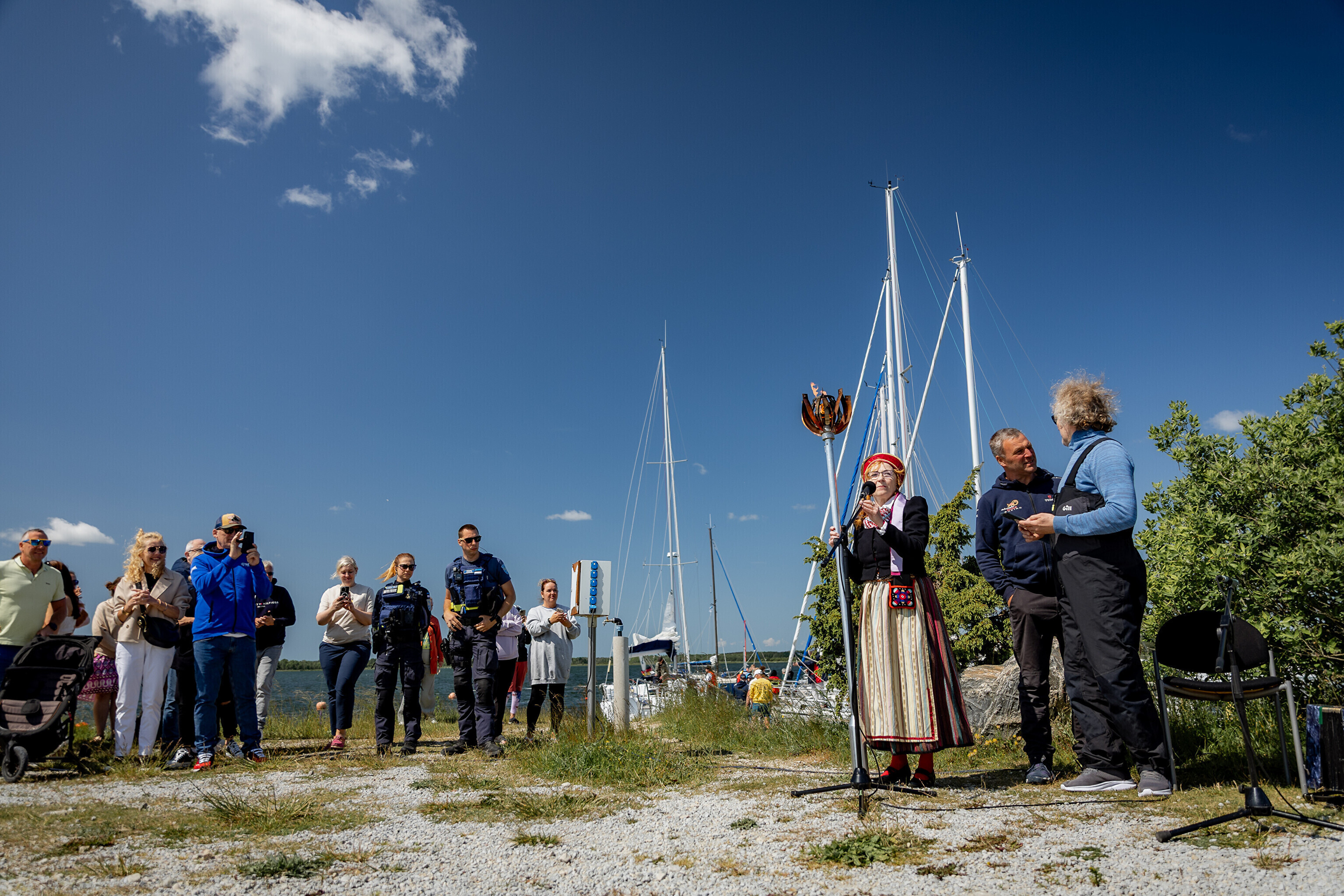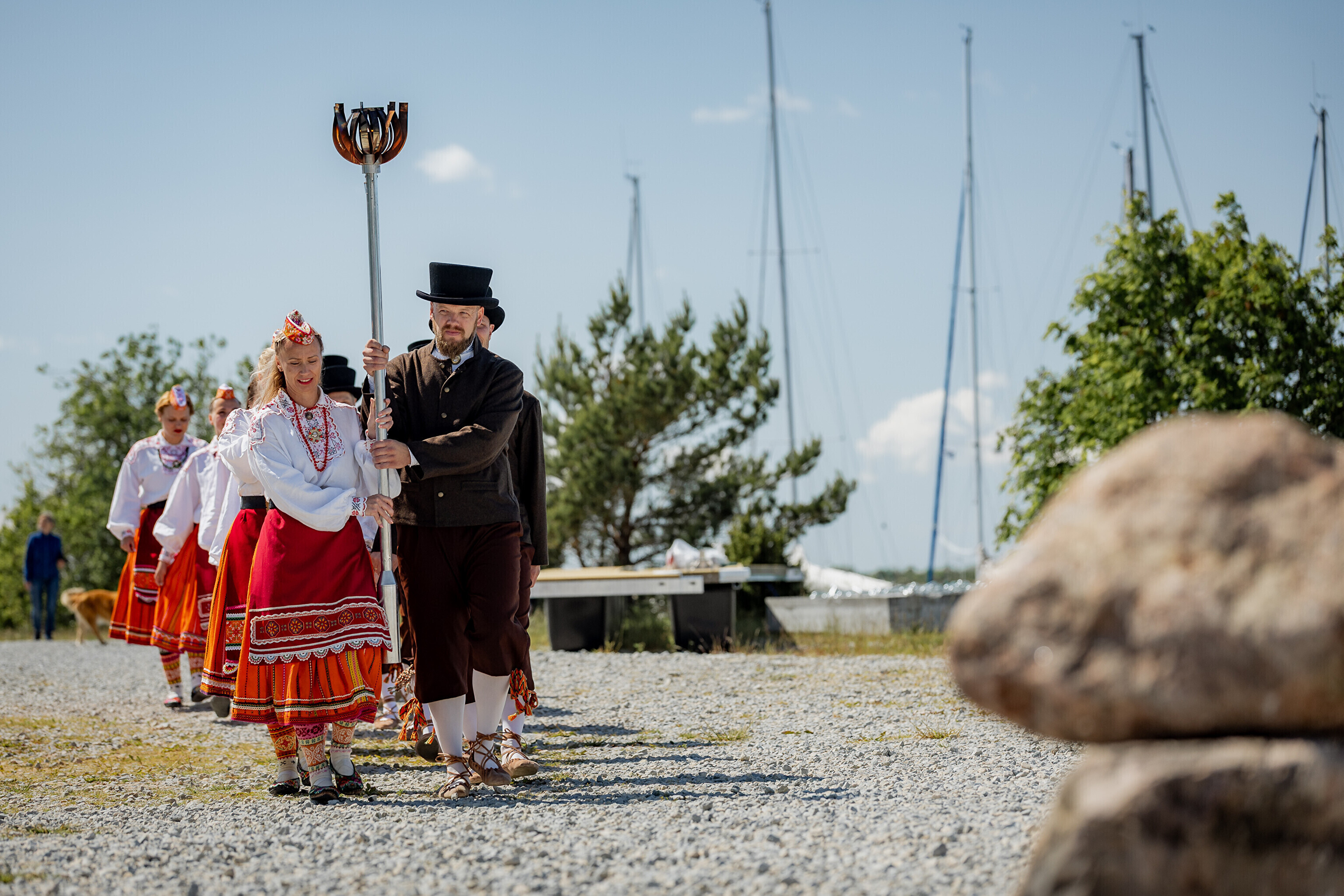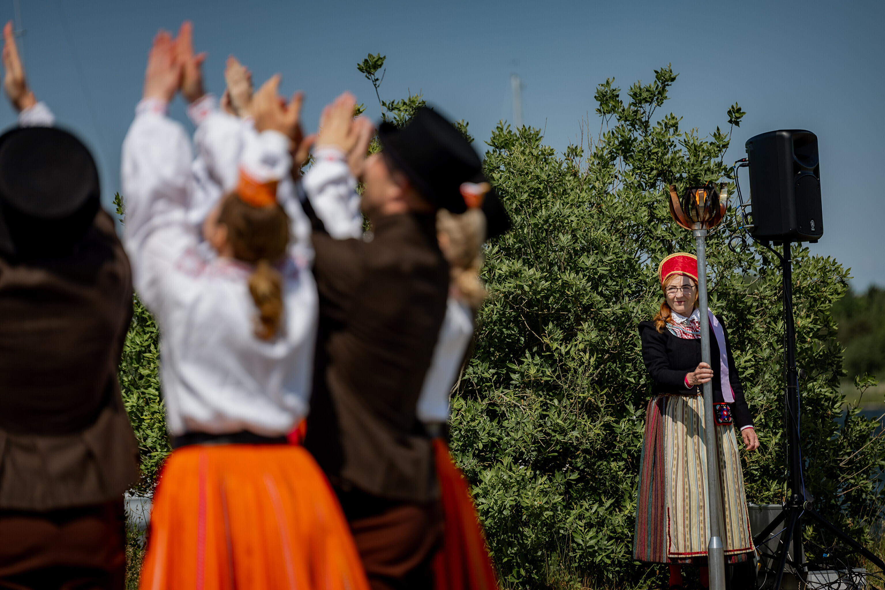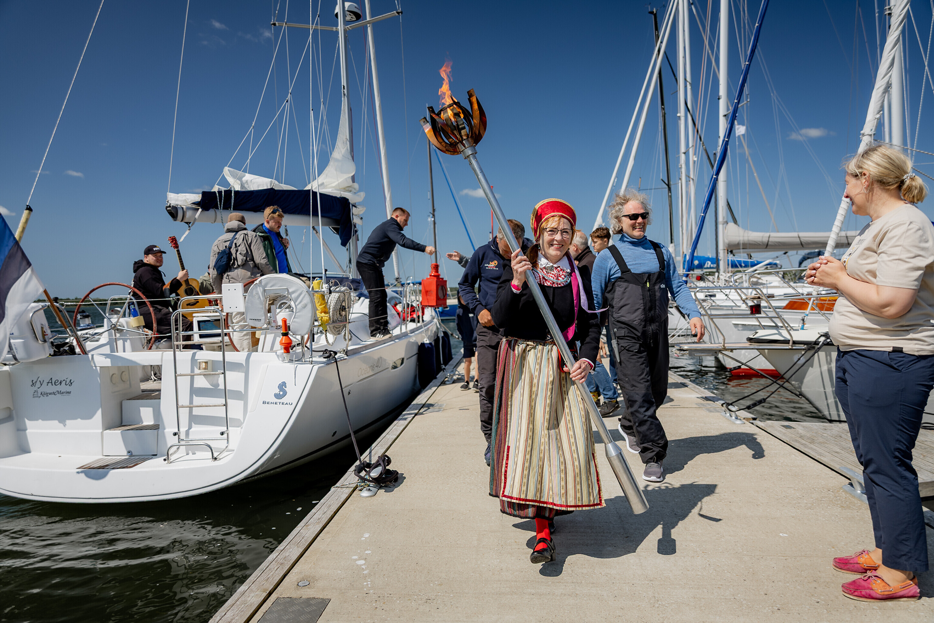 Праздничный огонь торжественно встретили на Сааремаа в порту Кыйгусте, где огонь приветствовала смешанная танцевальная группа Sõlesepad в народных костюмах Муху, а настроение создавал аккордеонист Матис Простанг.