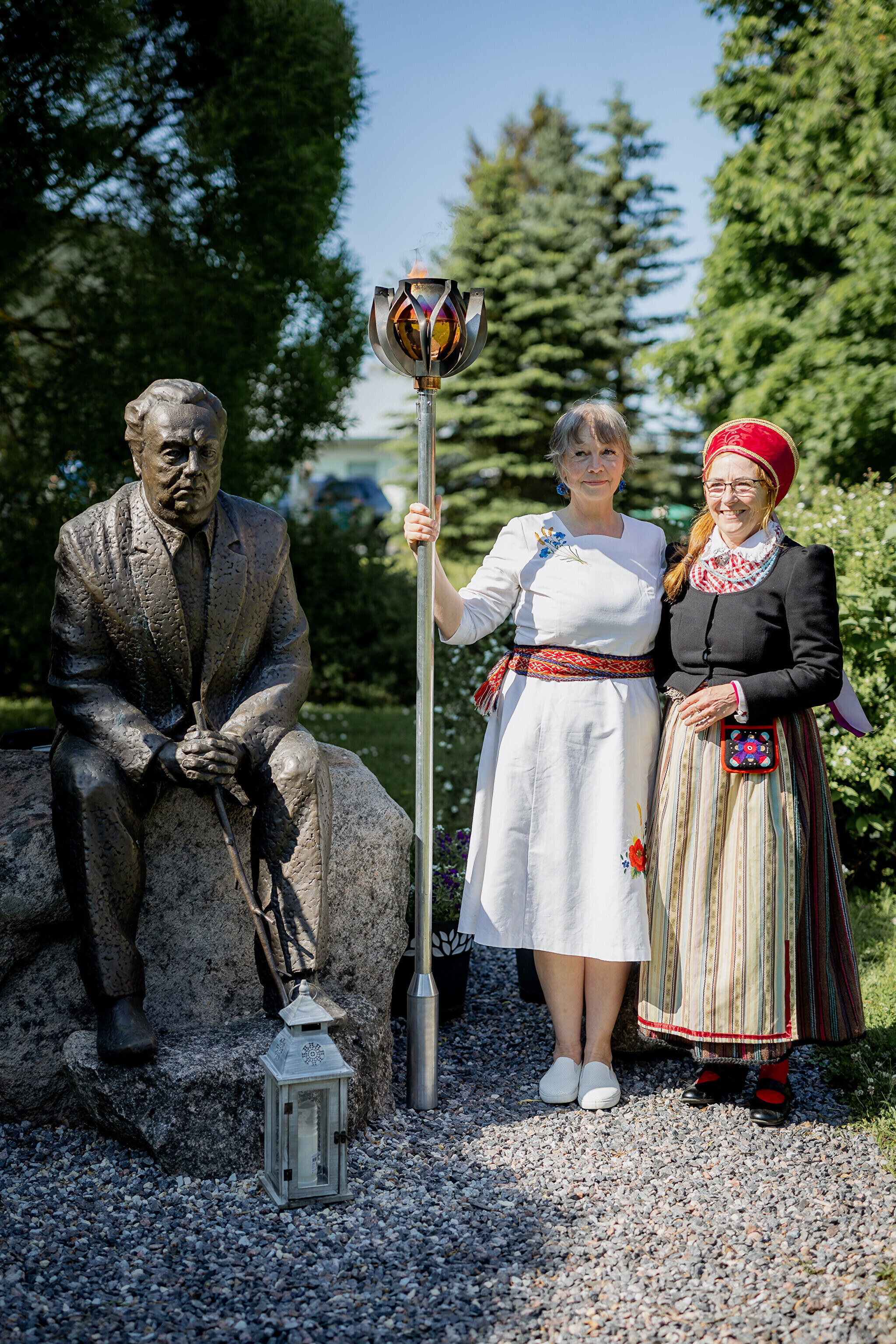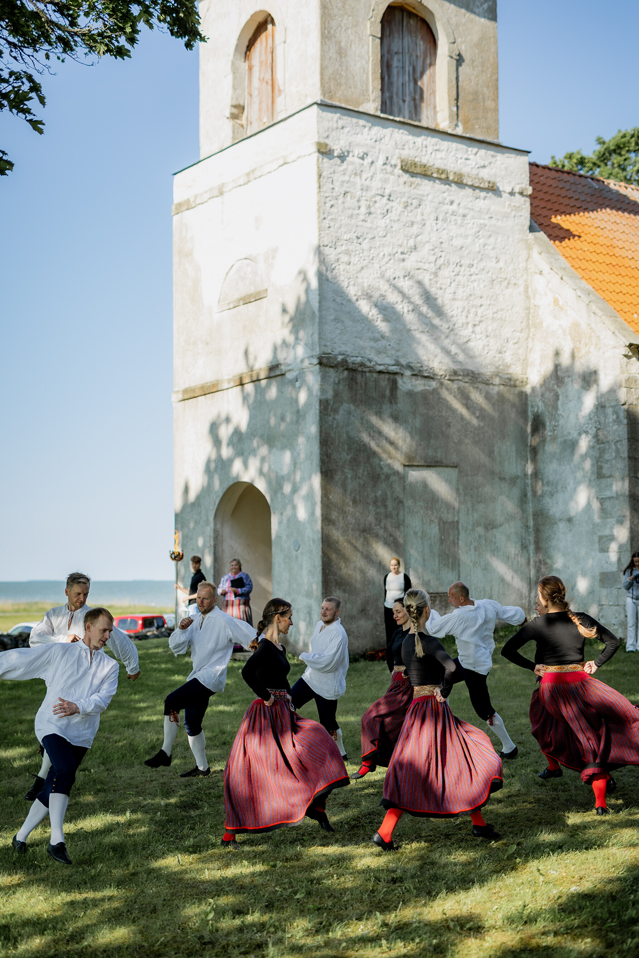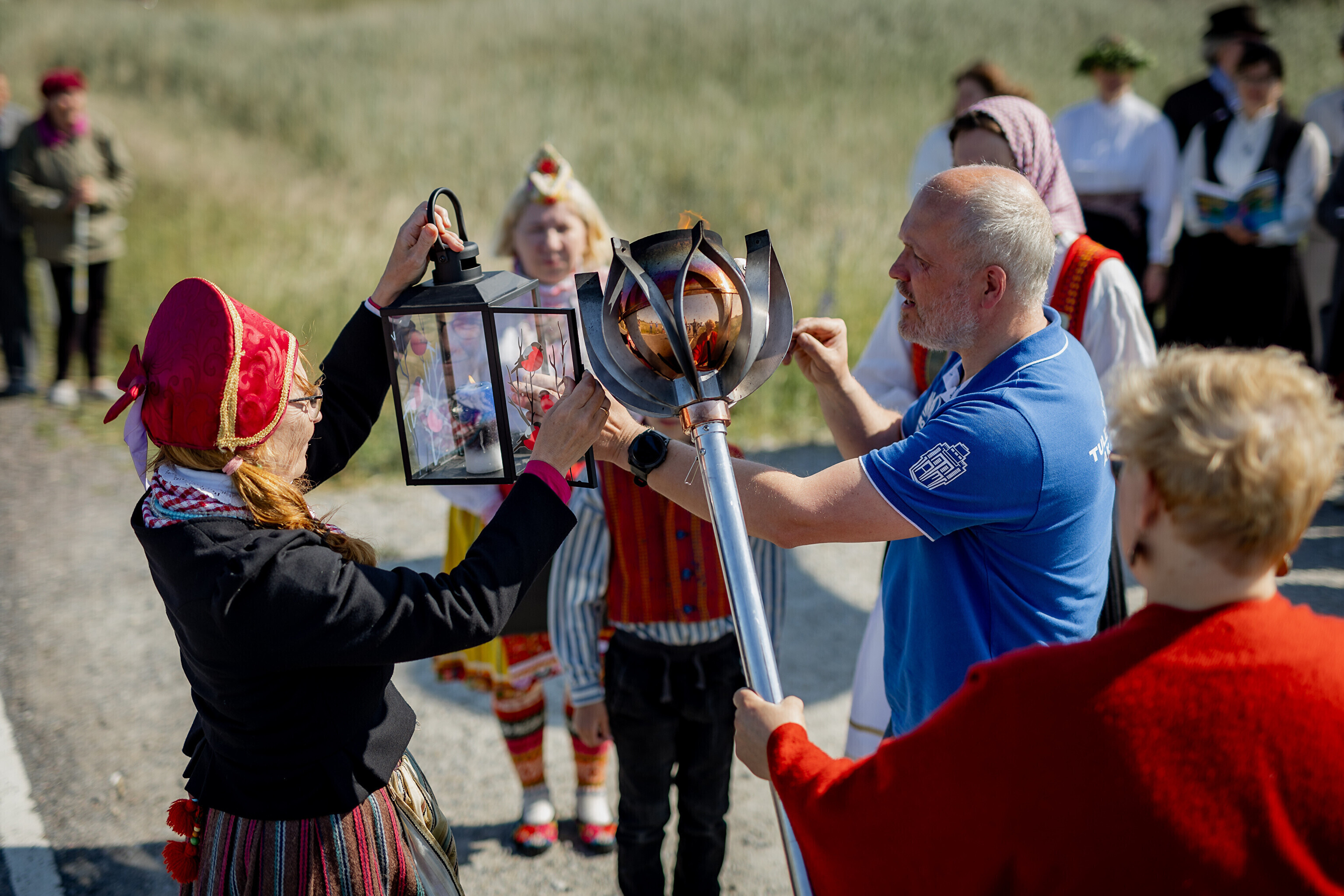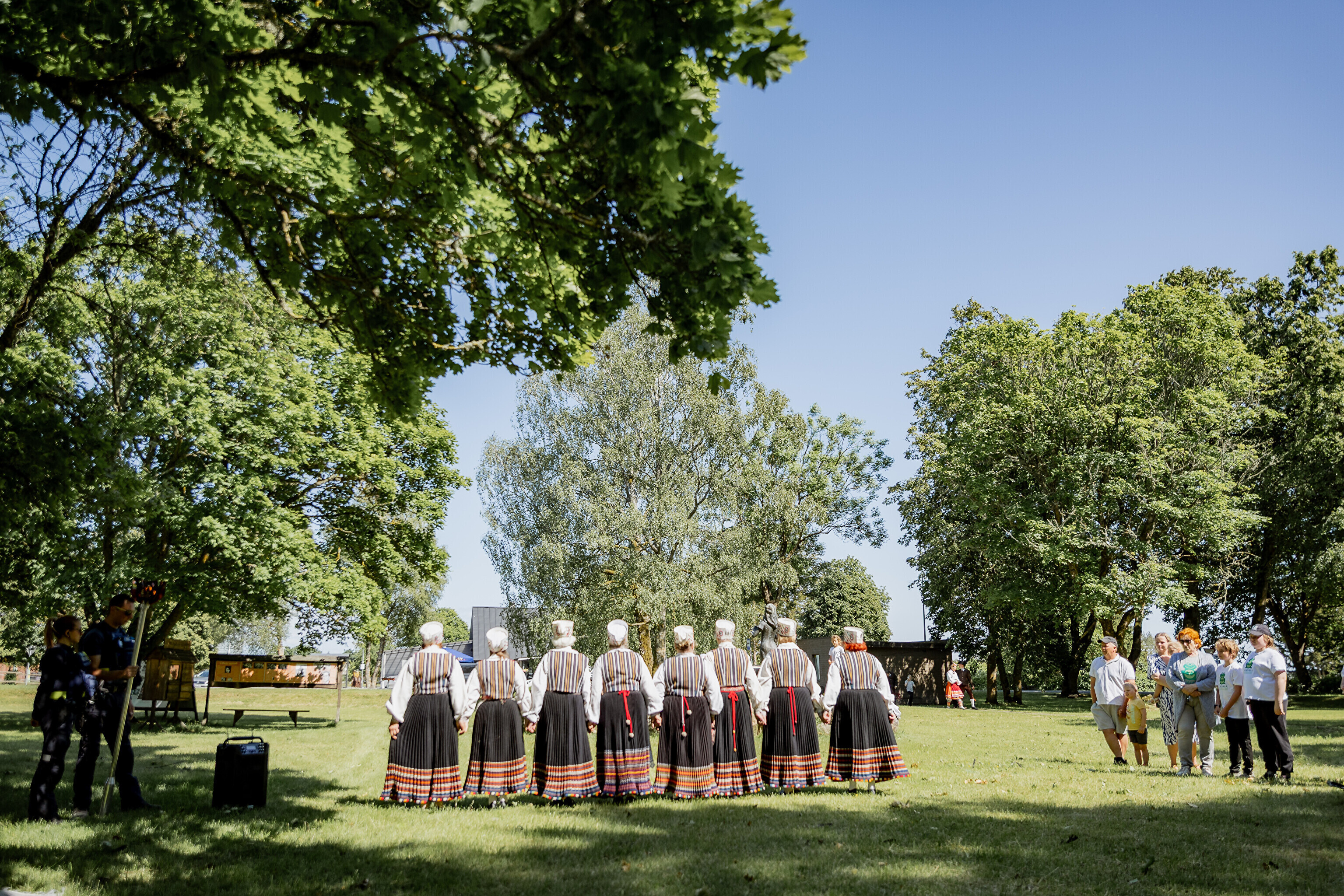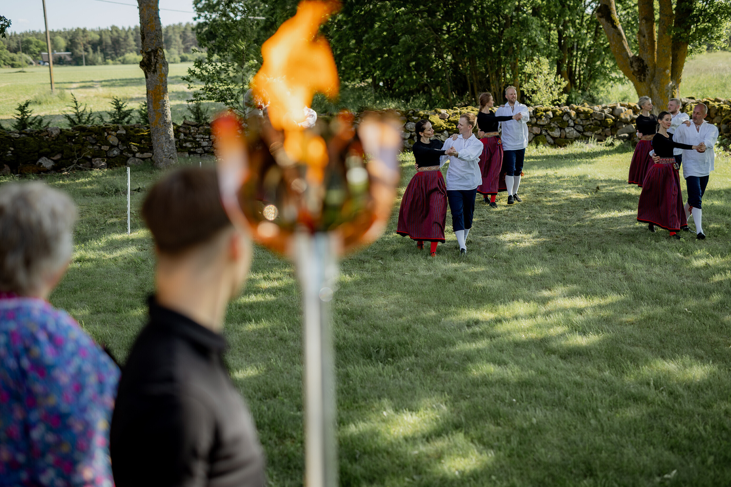 Путешествие огня по острову завершилось душевными встречами: в церкви Яани почтили память солиста ансамбля OORT, собирателя фольклора и автора песен Александера Сюнтера, под музыку которого народные танцоры из группы NOH увлекли публику. На Хиевалья, на родине писателя Хейно Вяли, его поэзию читала Айна Томсон. Затем огонь прибыл в деревню Ыэсте.