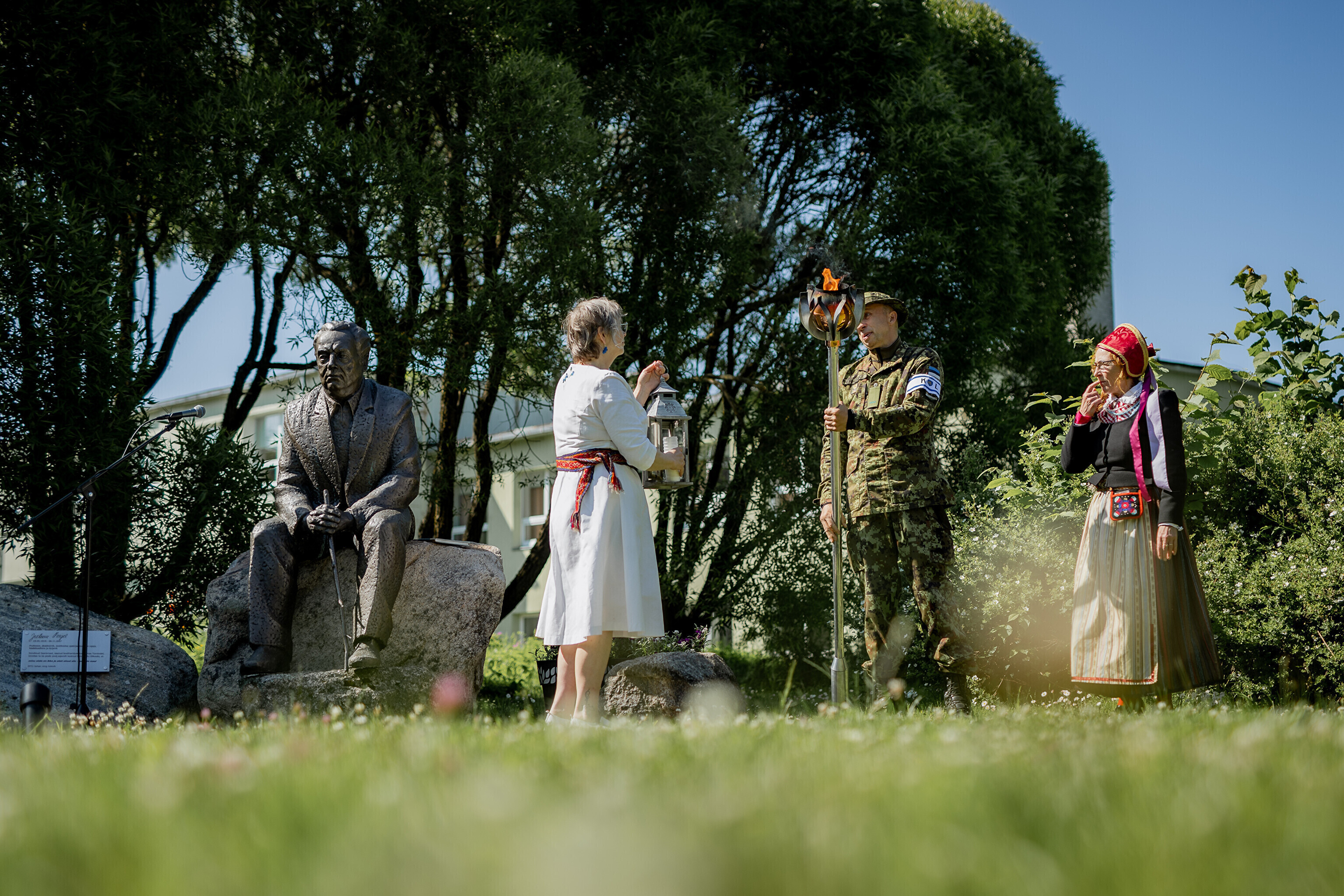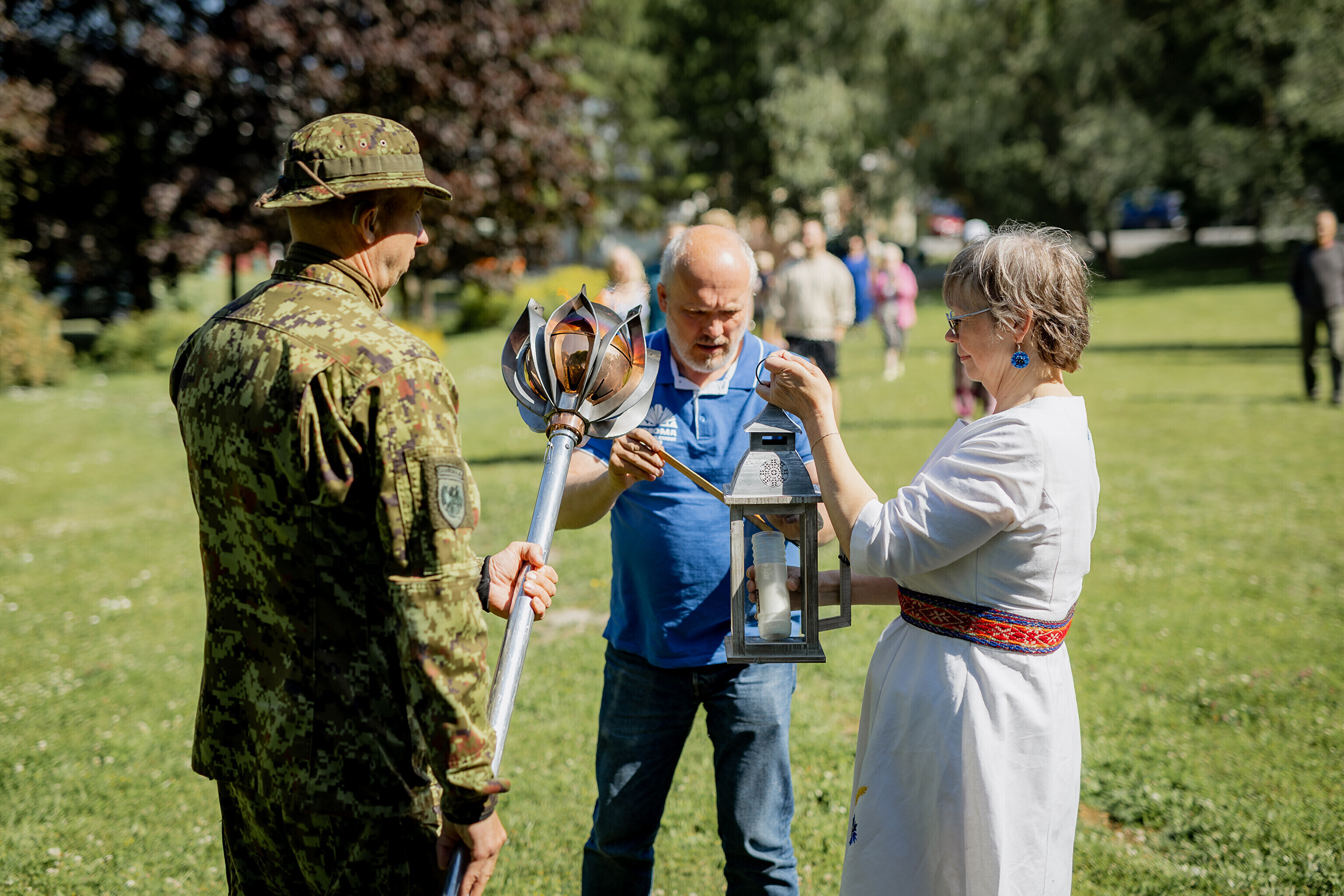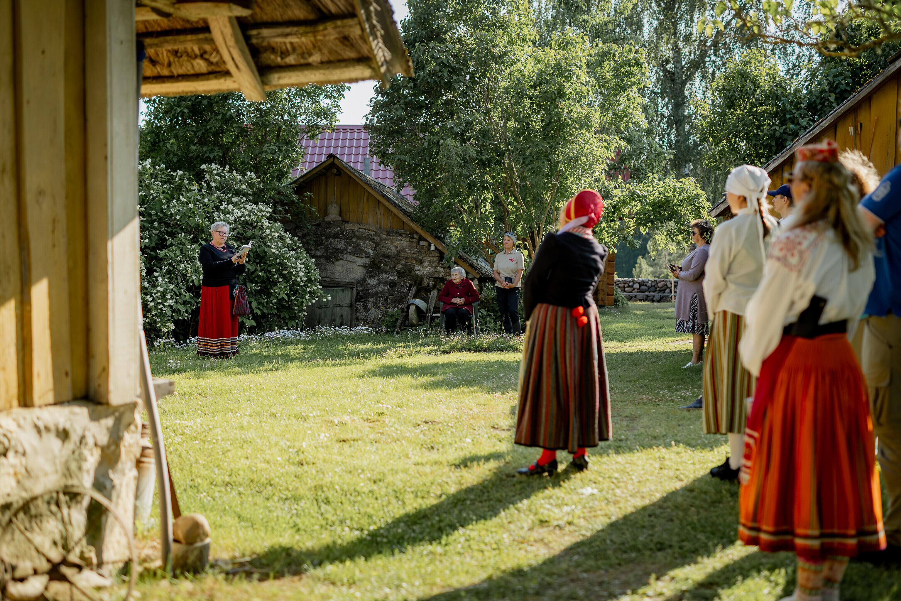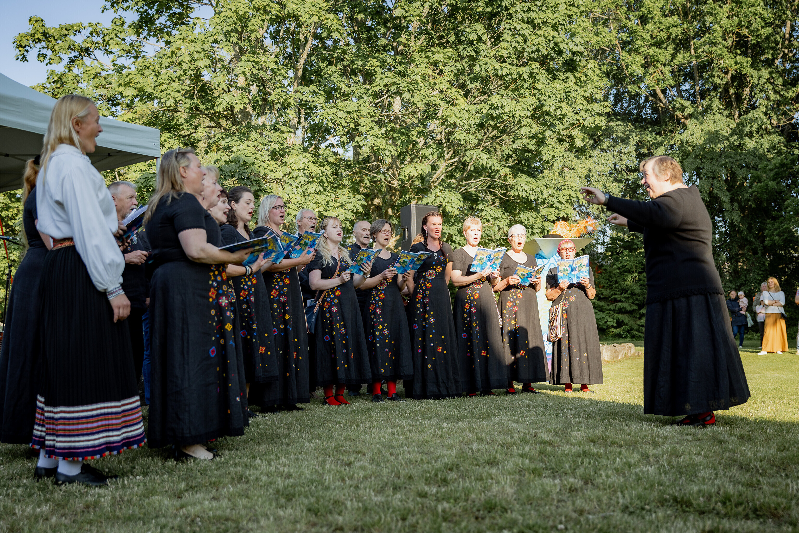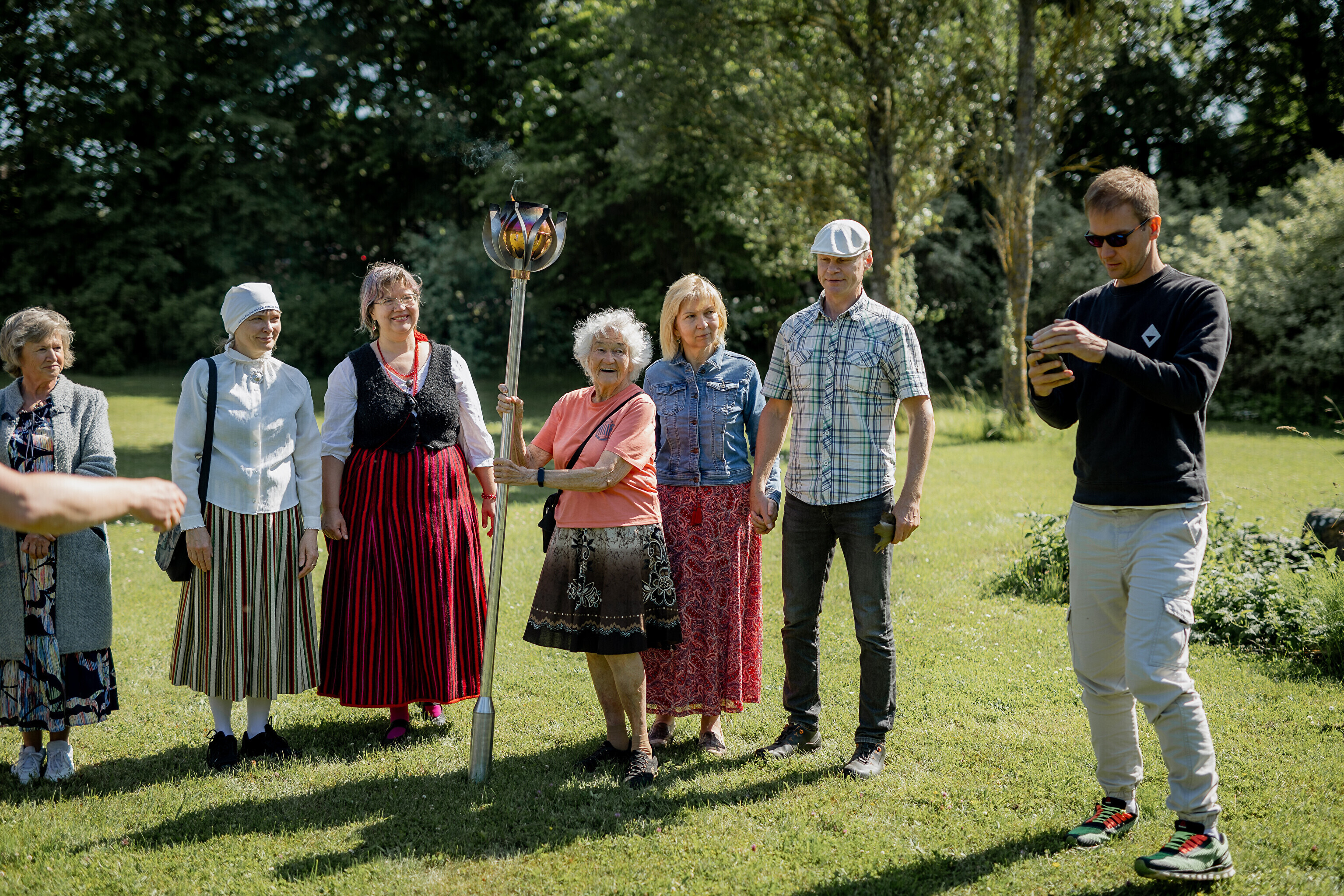 Путешествие огня по острову завершилось душевными встречами: в церкви Яани почтили память солиста ансамбля OORT, собирателя фольклора и автора песен Александера Сюнтера, под музыку которого народные танцоры из группы NOH увлекли публику. На Хиевалья, на родине писателя Хейно Вяли, его поэзию читала Айна Томсон. Затем огонь прибыл в деревню Ыэсте.