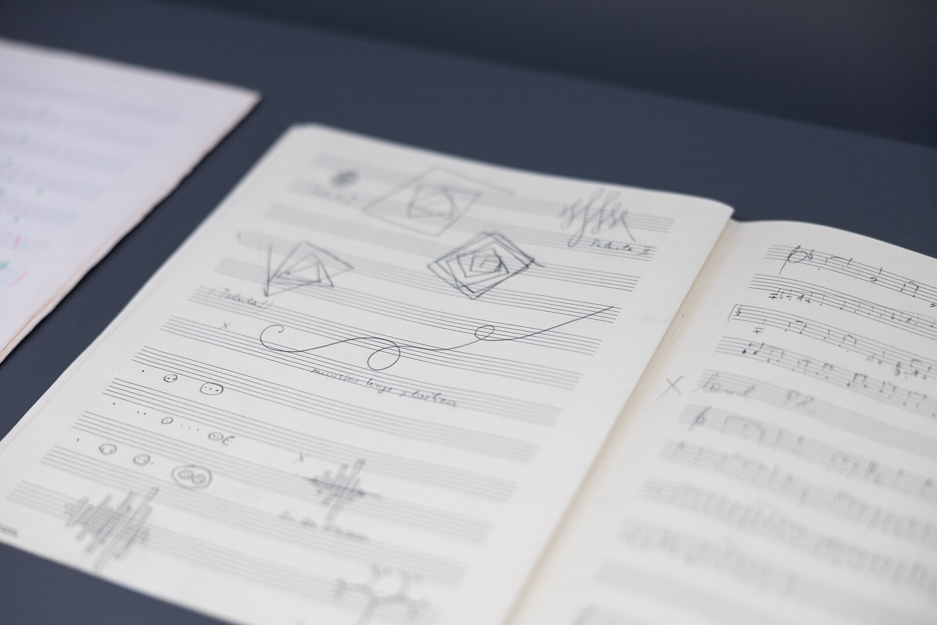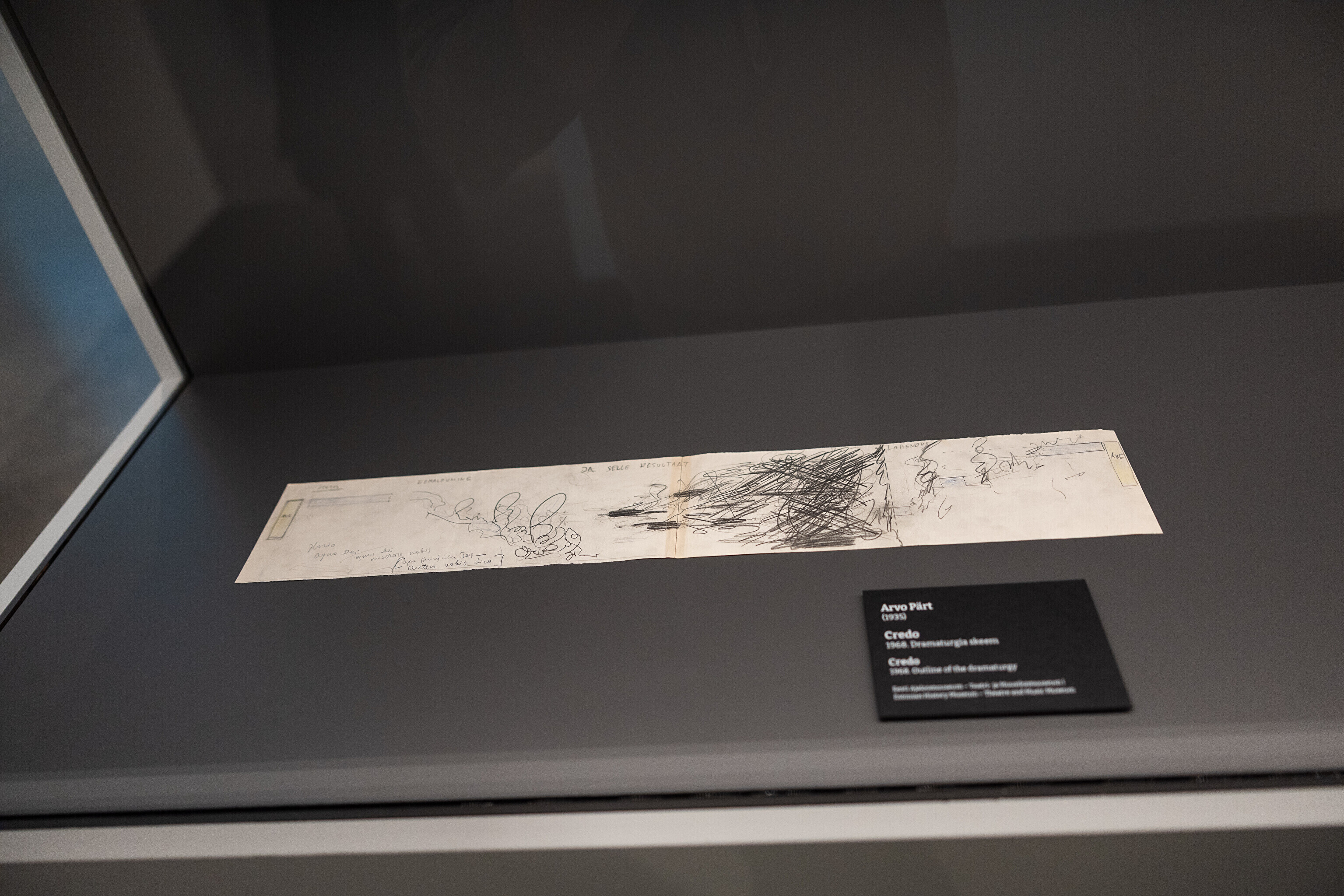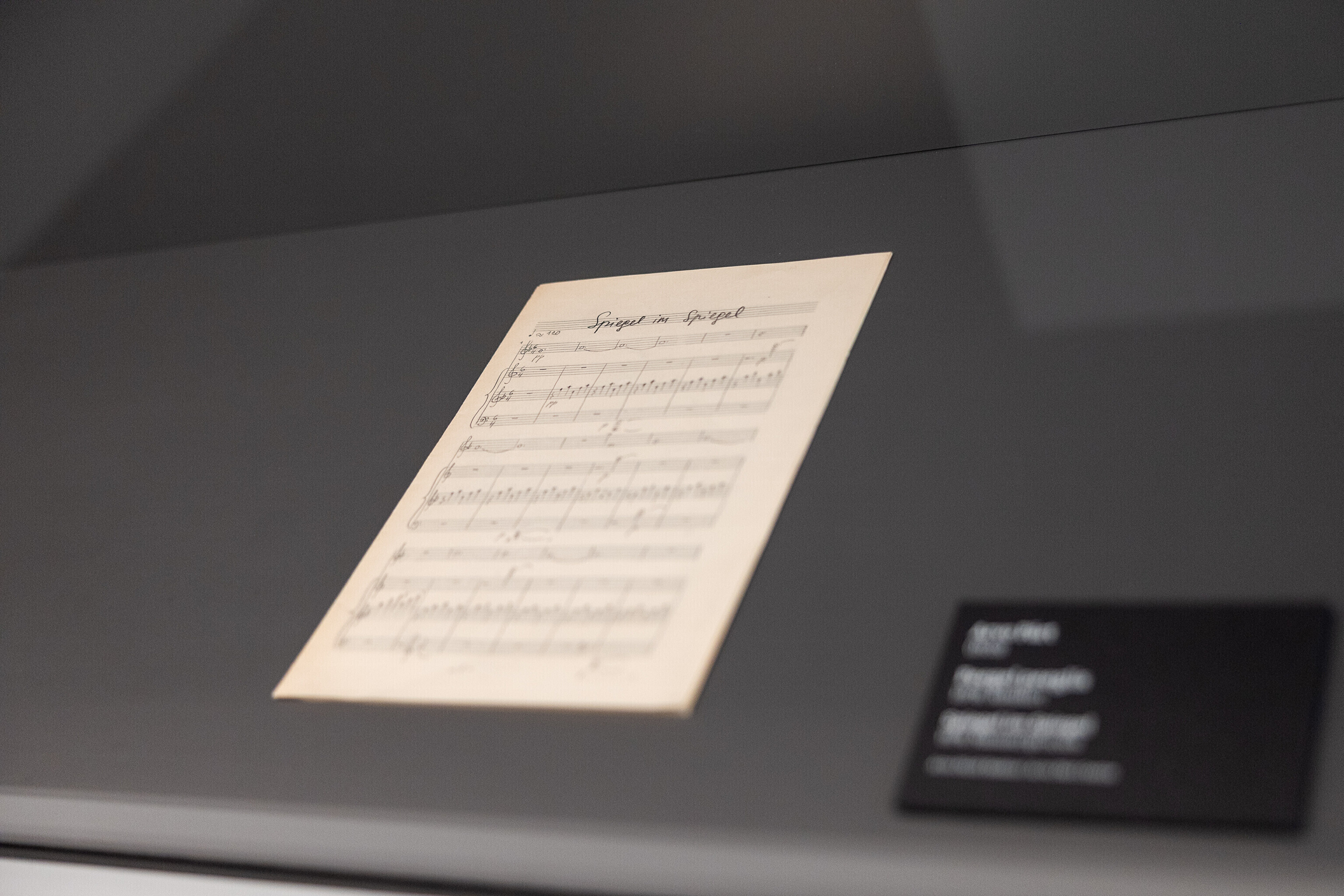 Название выставки "Spiegel im Spiegel" ("Зеркало в зеркале") заимствовано из одноимённой работы Арво Пярта, которому в этом году исполнилось 90 лет. На выставке представлены рукописи произведений Арво Пярта и музыкальные дневники из коллекций Центра Арво Пярта и экспонаты Музея театра и музыки Исторического музея, которые дают представление о визуальном творческом процессе Пярта.