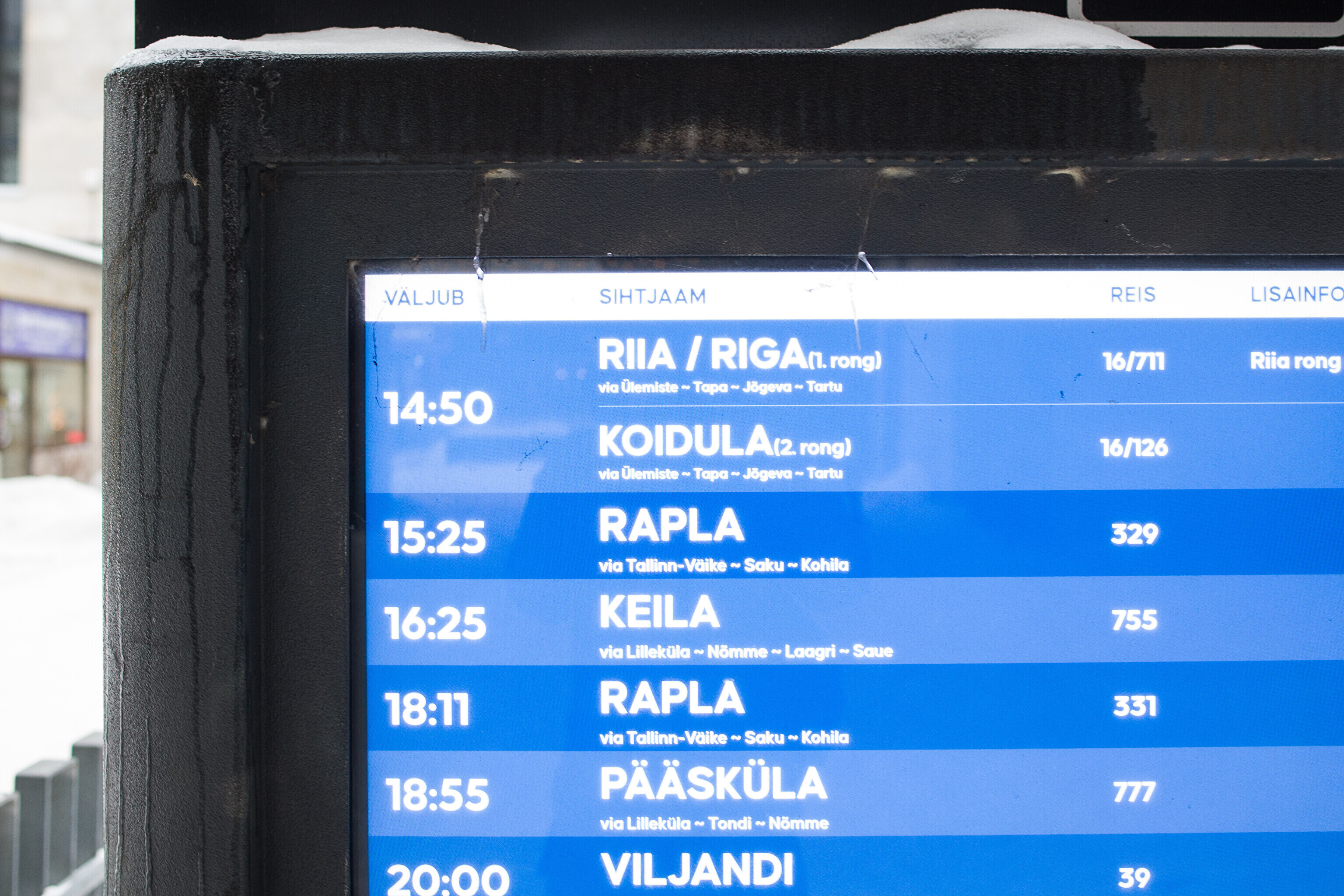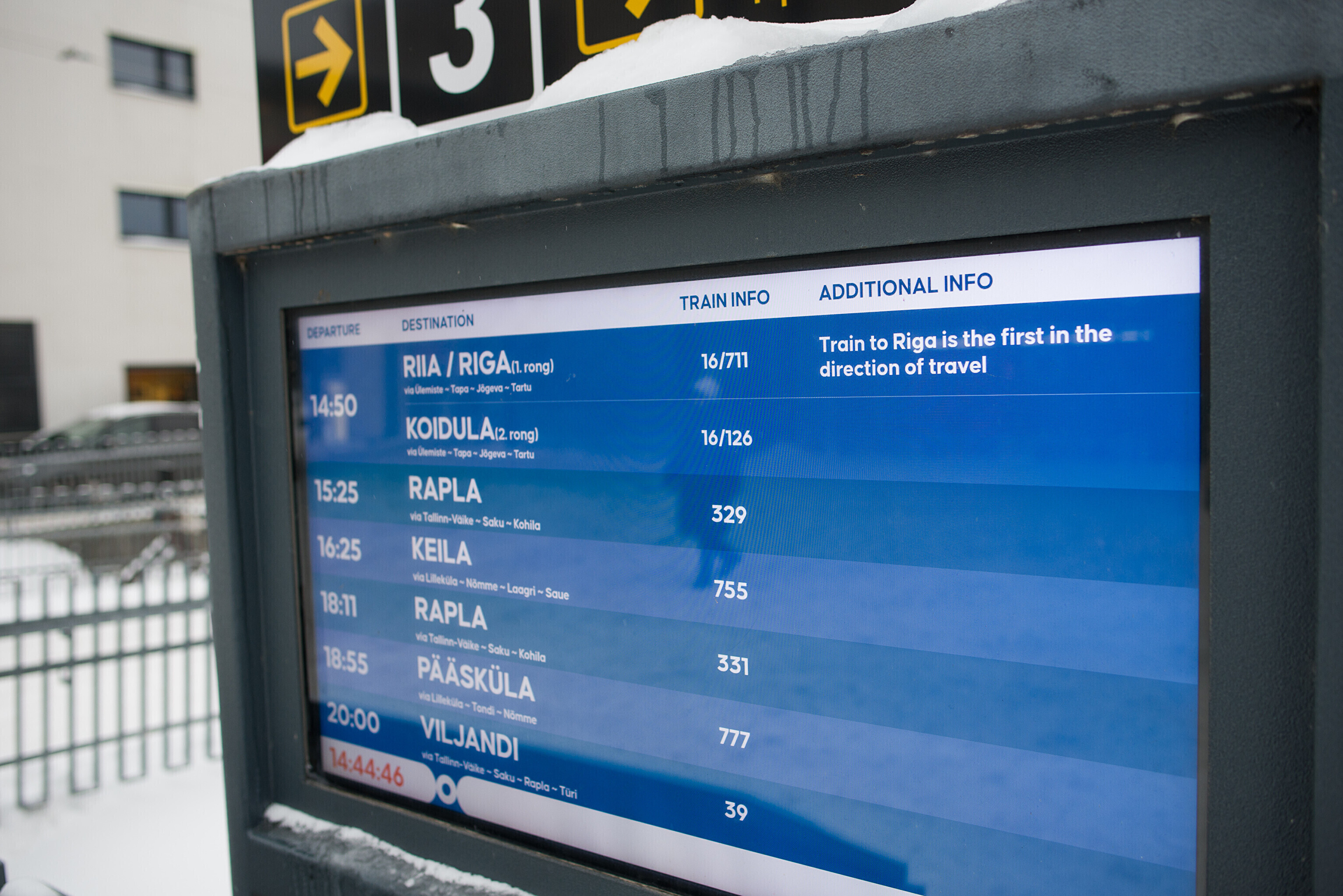 С 12 января поезд по маршруту Таллинн - Тарту - Рига отправляется из Таллинна в 14:50, из Тарту - в 17:05 и прибывает в Ригу в 20:46. Из Риги поезд отправляется в 7:38, прибывает в Тарту в 11:25 и в Таллинн в 13:57. Первый рейс в направлении Рига - Тарту - Таллинн состоится 13 января в 7:38.