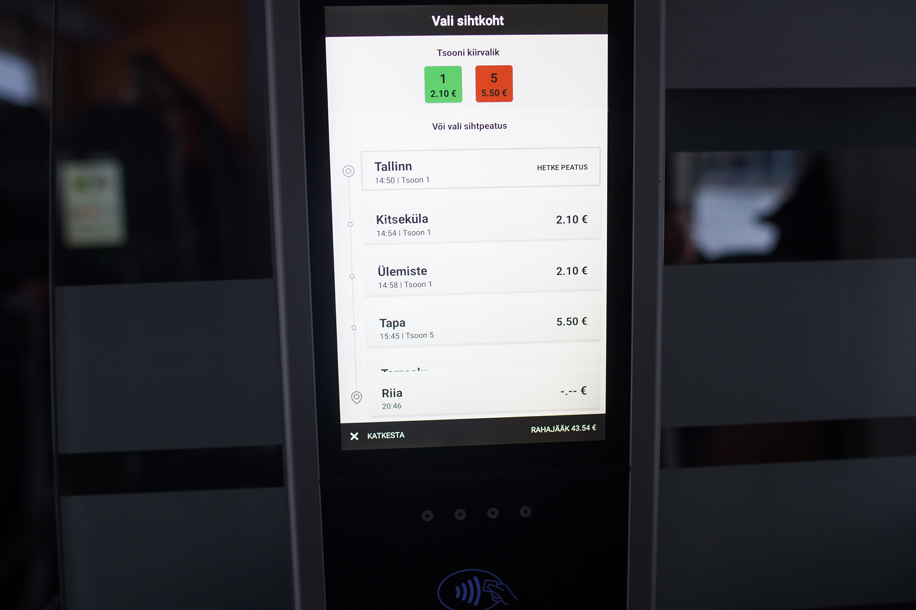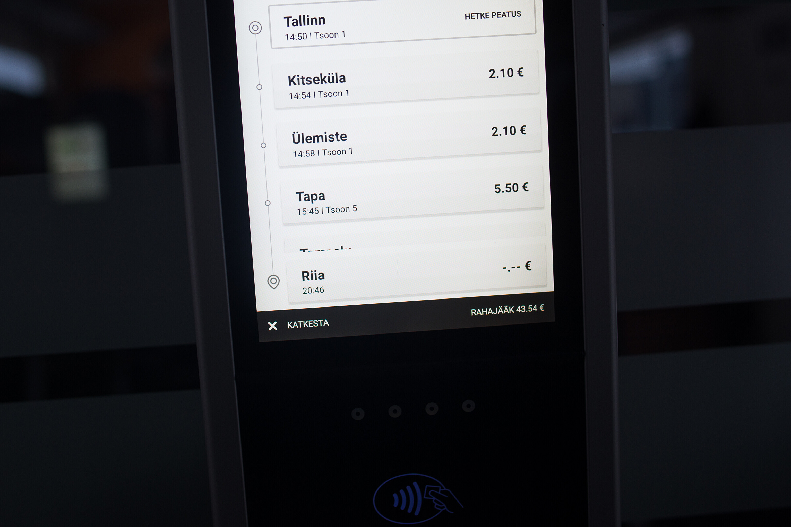 Остановки поезда: Таллинн, Китсекюла, Юлемисте, Тапа, Тамсалу, Йыгева, Тарту, Аардла, Ропка, Ныо, Тыравере, Элва, Палупера, Пука, Мягисте, Кеэни, Сангасте, Валга, Валмиера, Цесис, Сигулда, Земитаны и Рига.