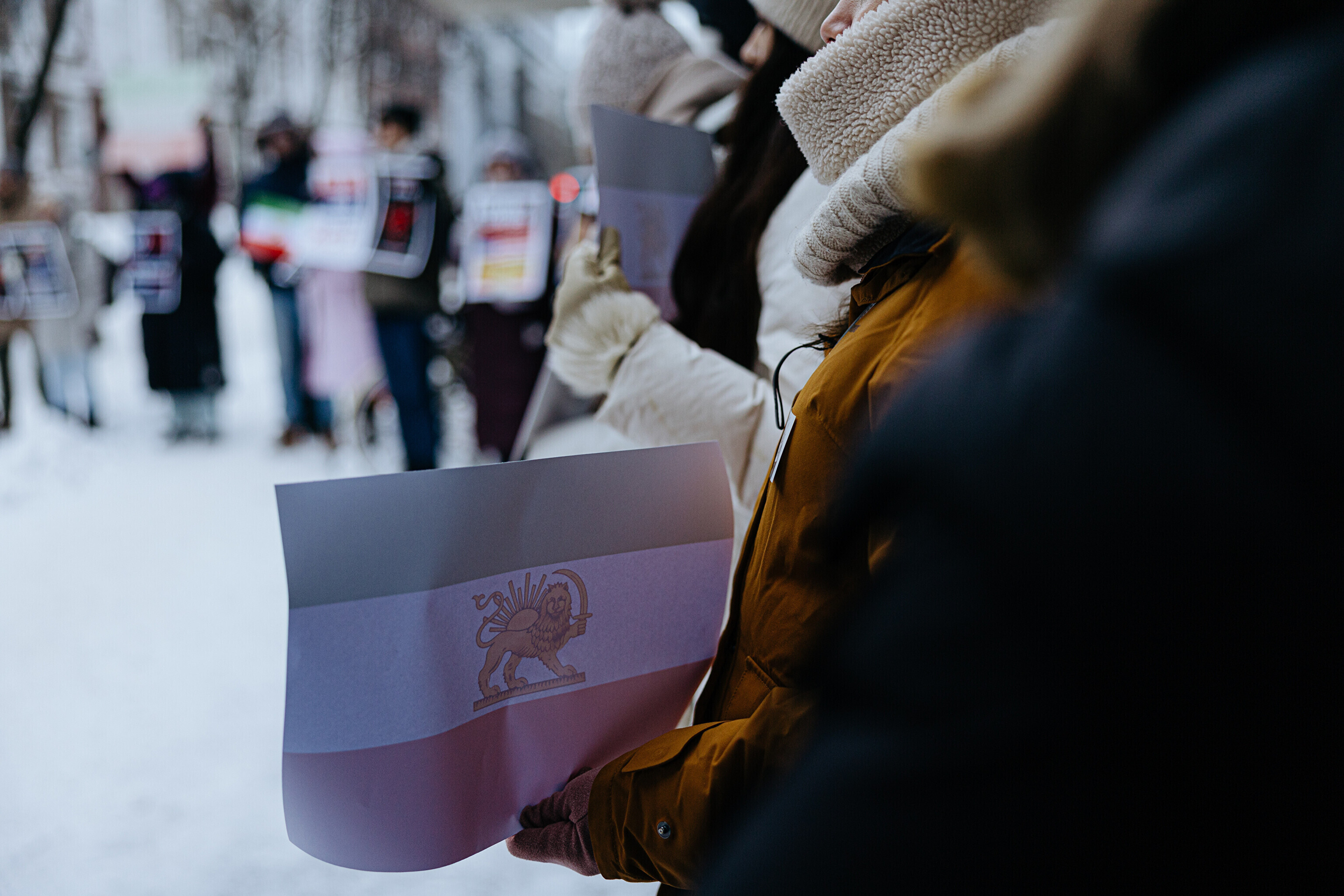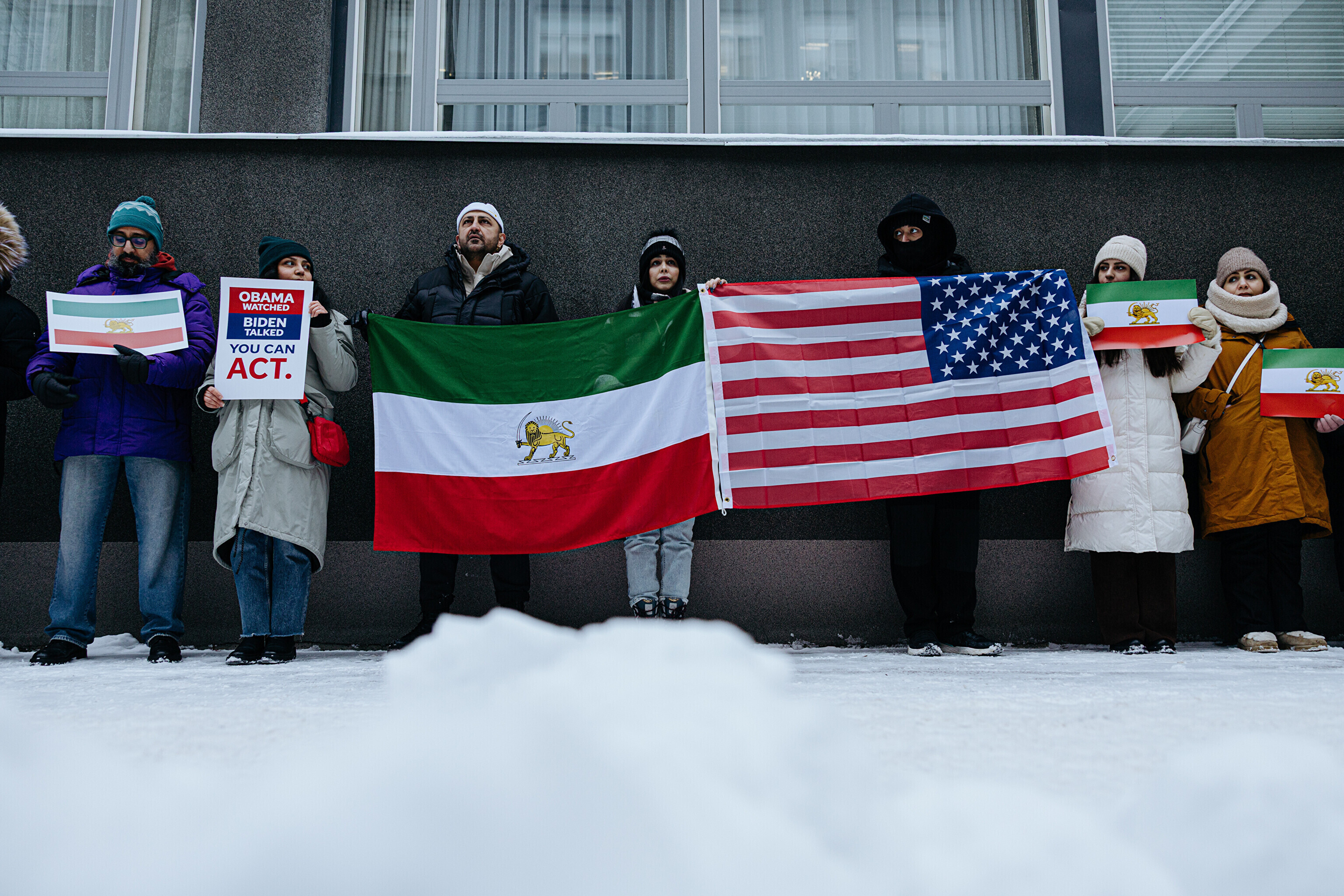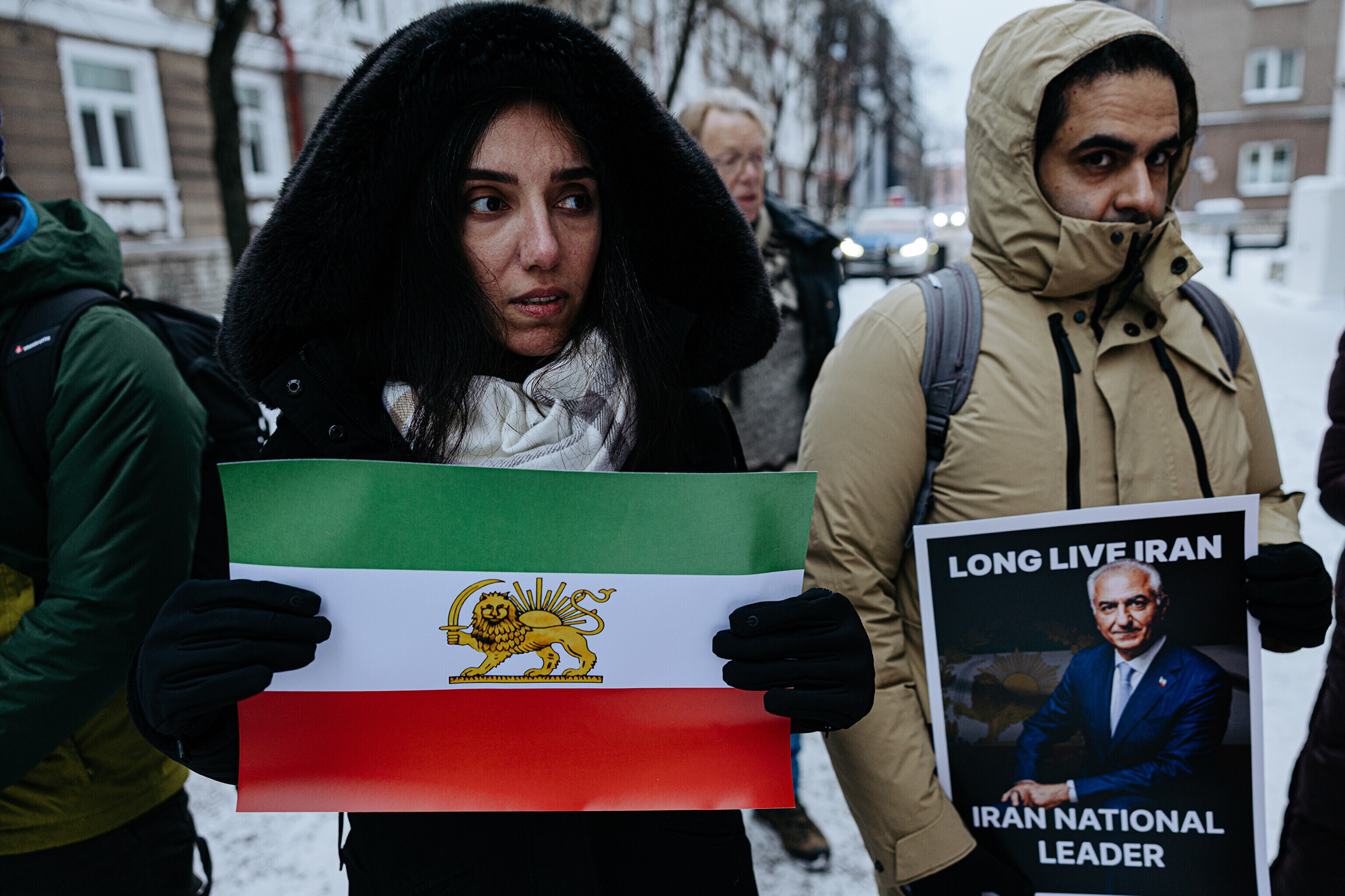 На акции присутствовало около 30-40 человек, которые держали американские и иранские флаги времен доисламистского режима, а также лозунги в поддержку изгнанного наследного принца Ирана Резы Пахлави.
