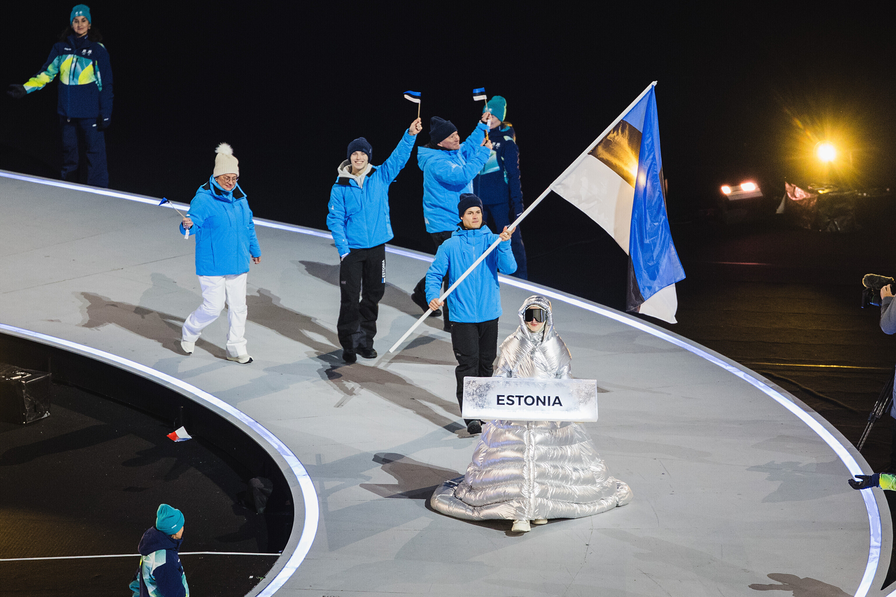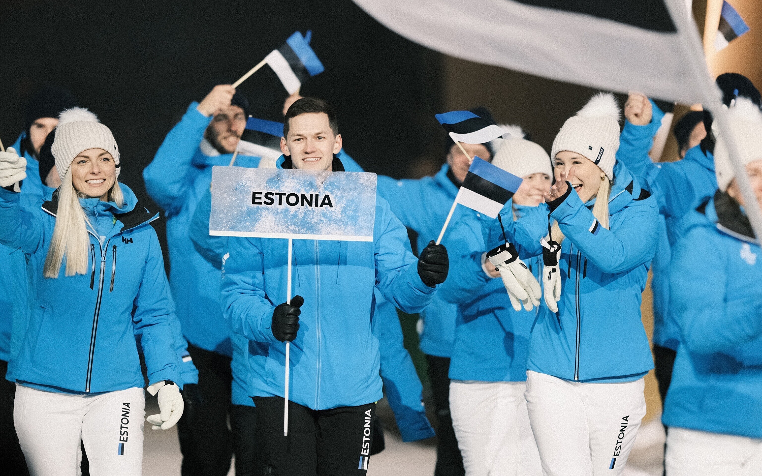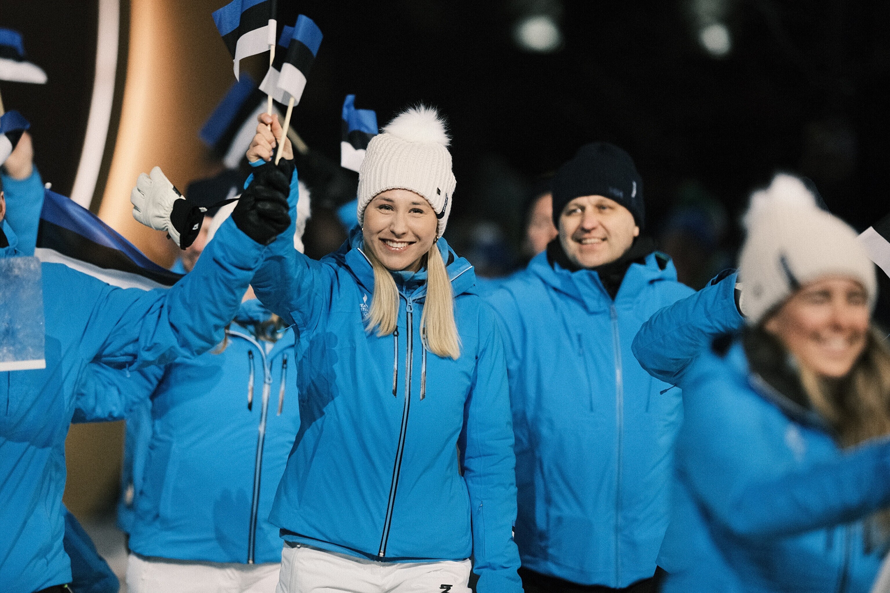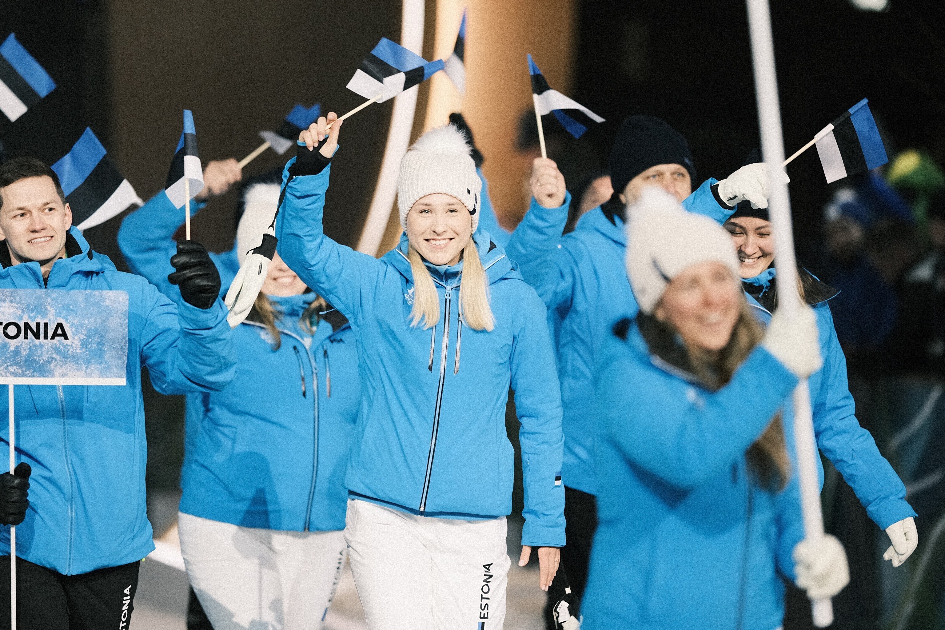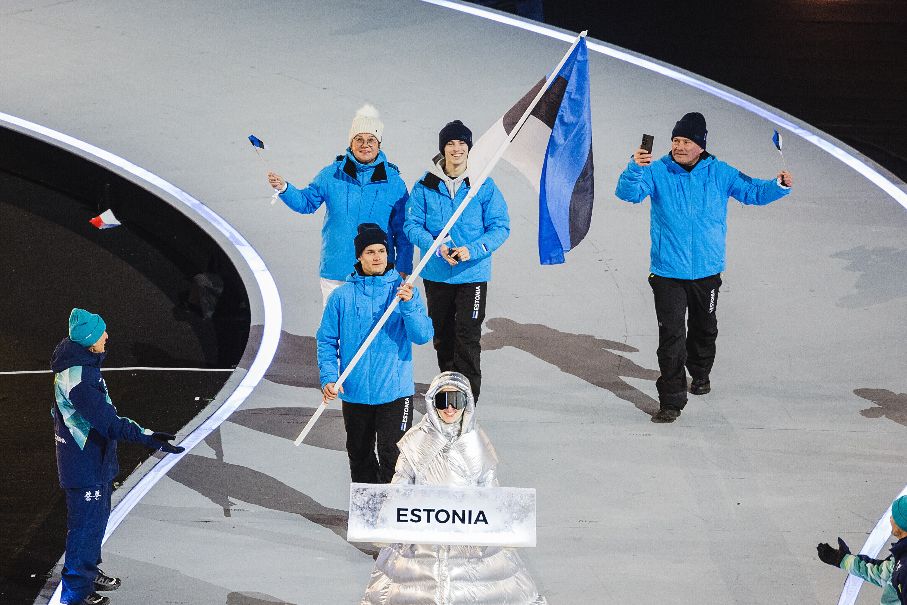 Флаг Эстонии на церемонии открытия несли биатлонистка Йоханна Талихярм и конькобежец Мартен Лийв.