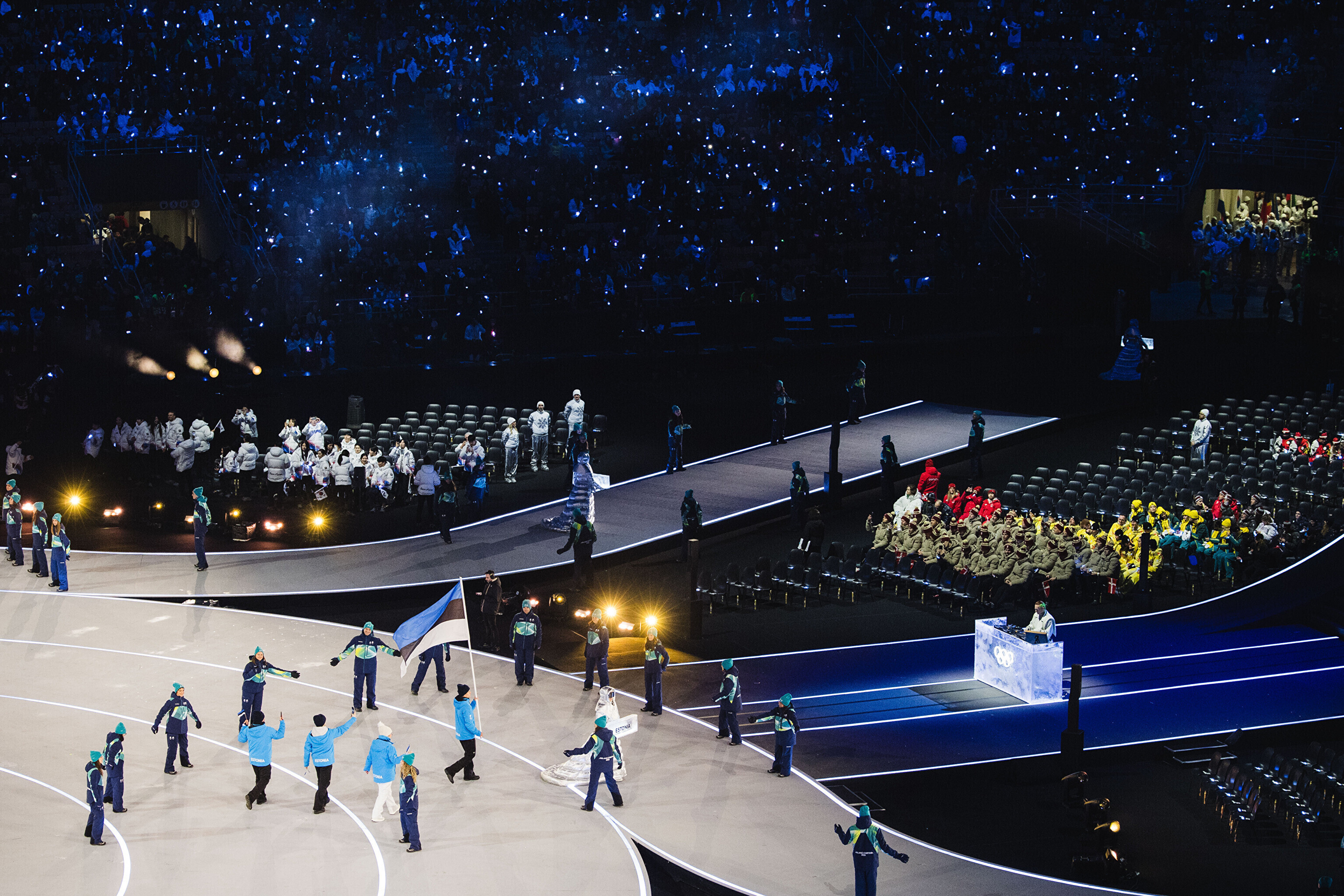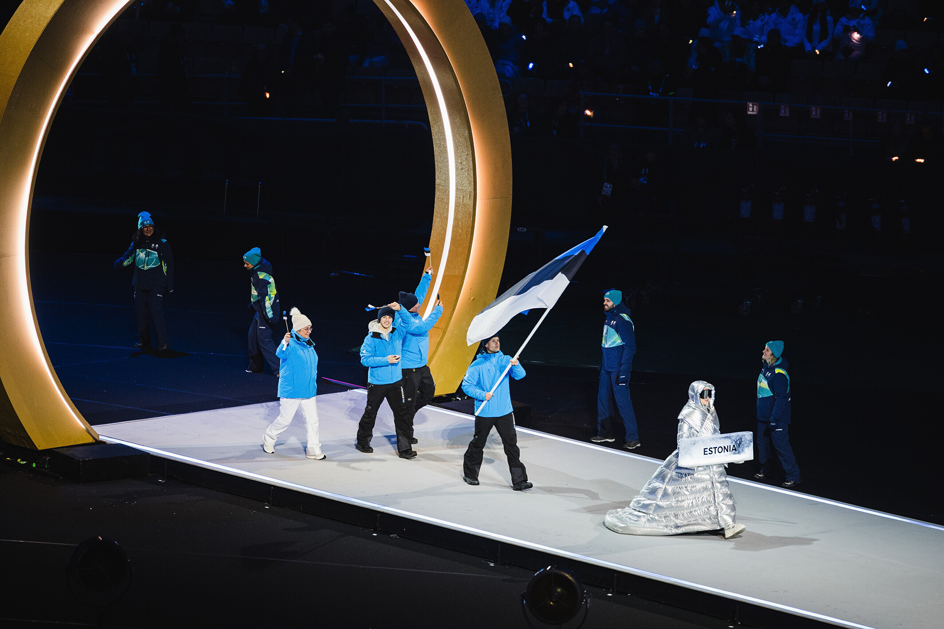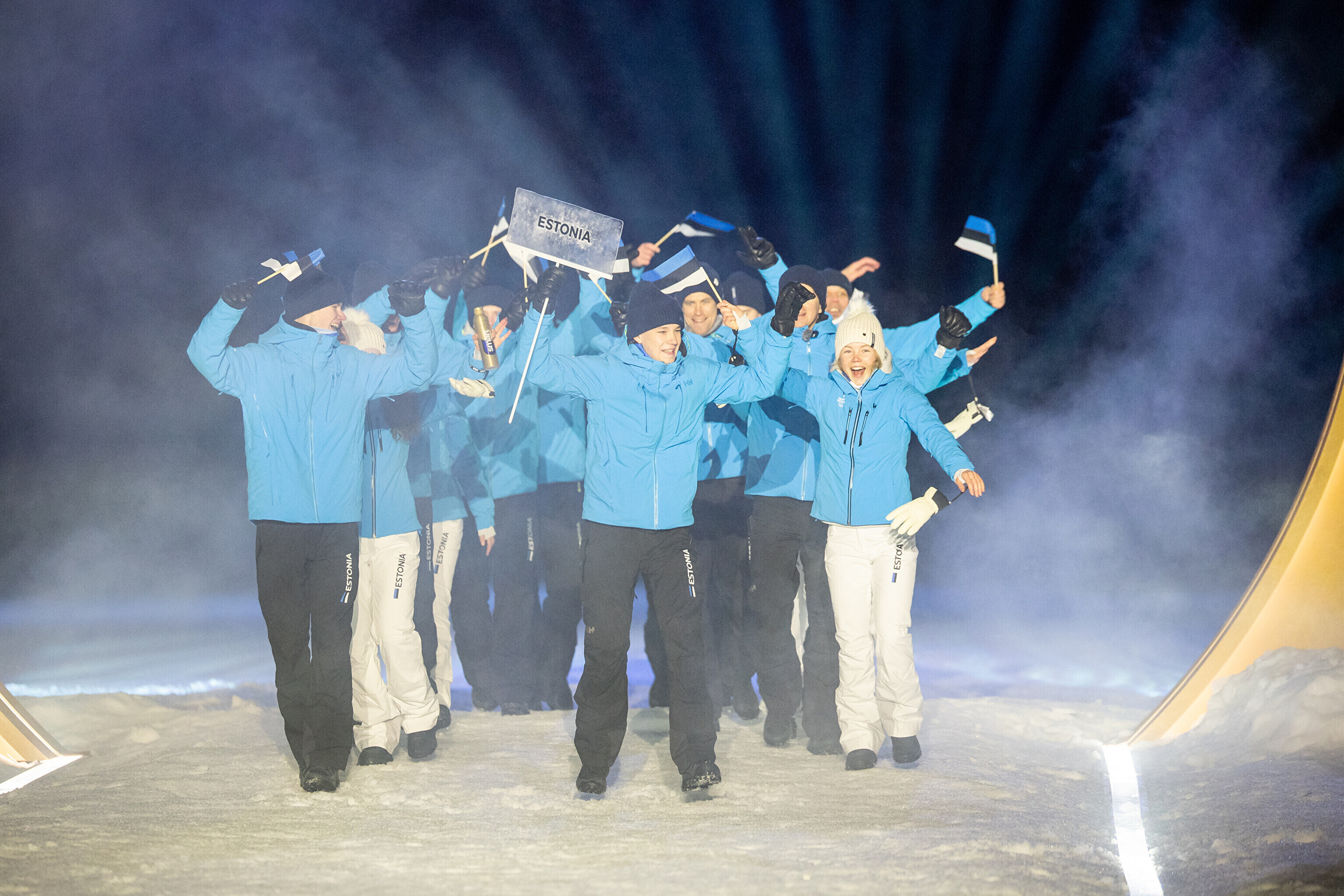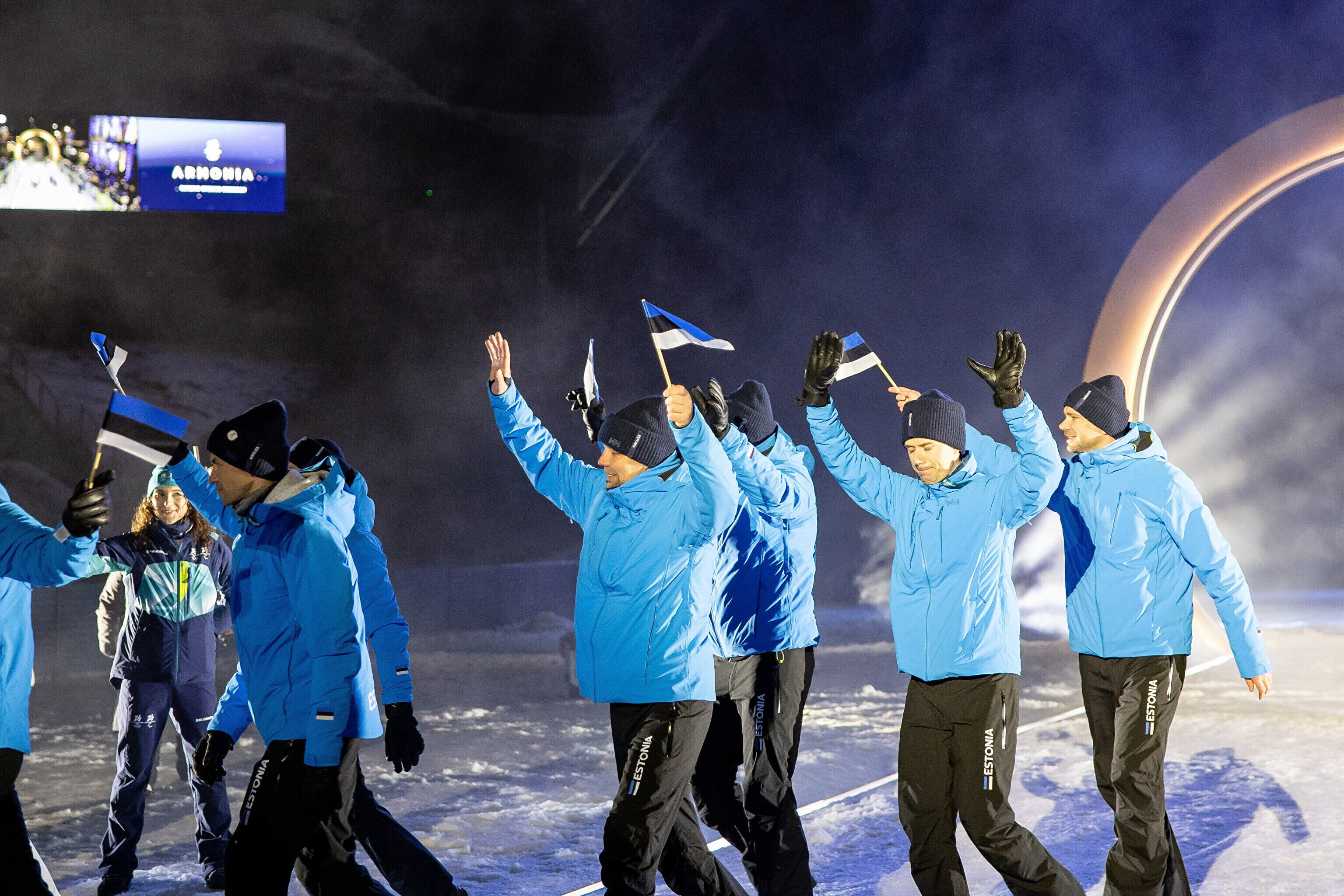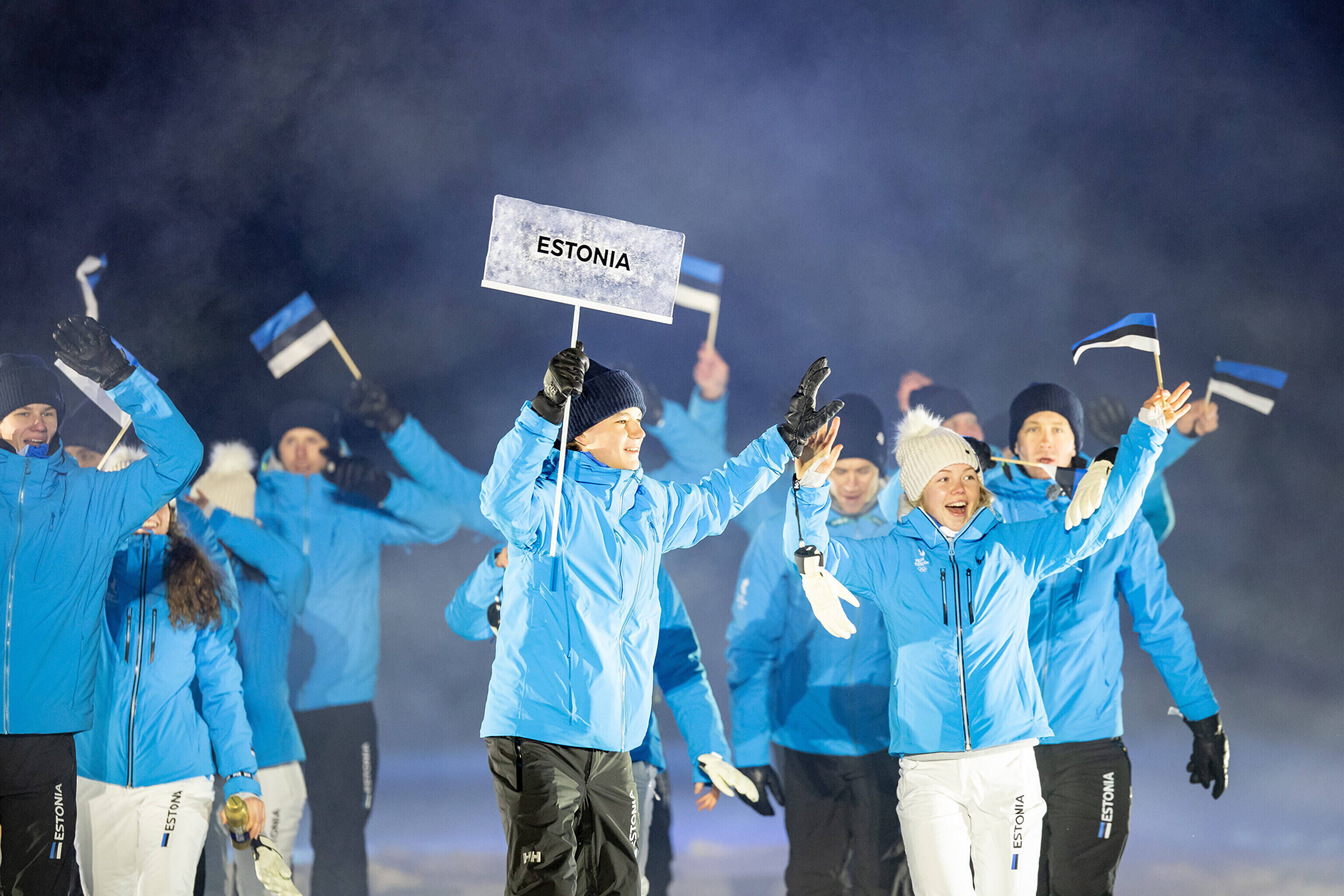 Флаг Эстонии на церемонии открытия несли биатлонистка Йоханна Талихярм и конькобежец Мартен Лийв.