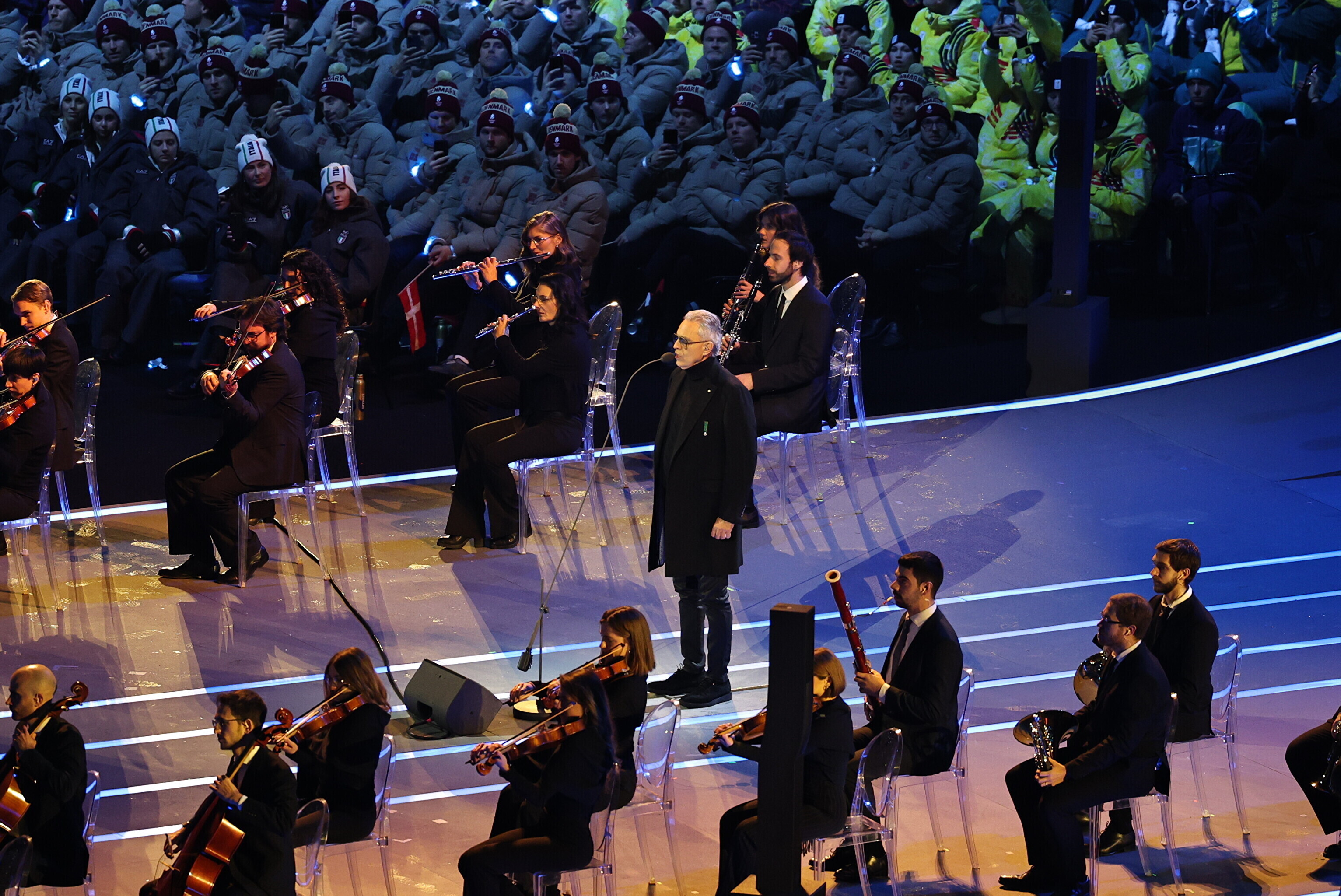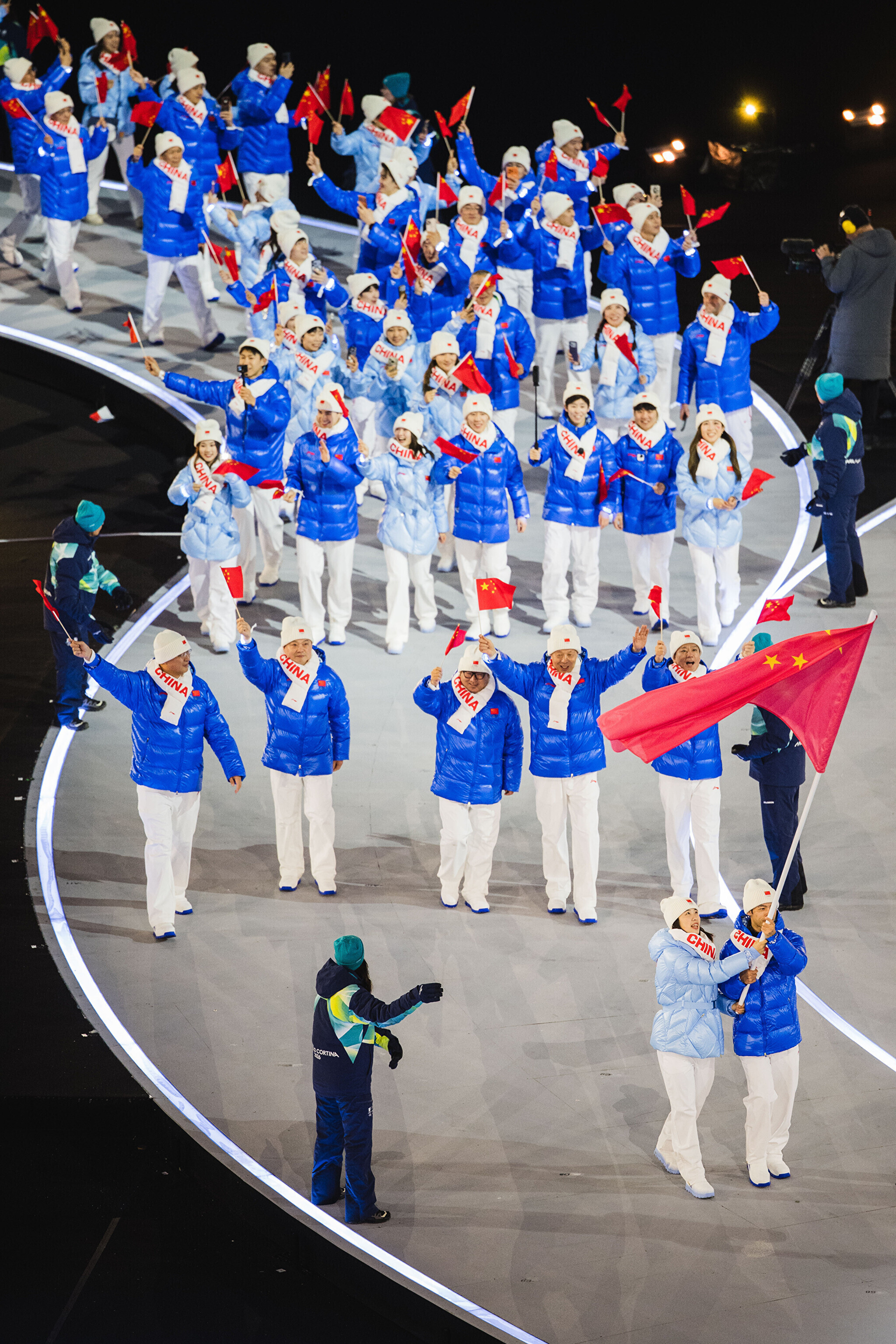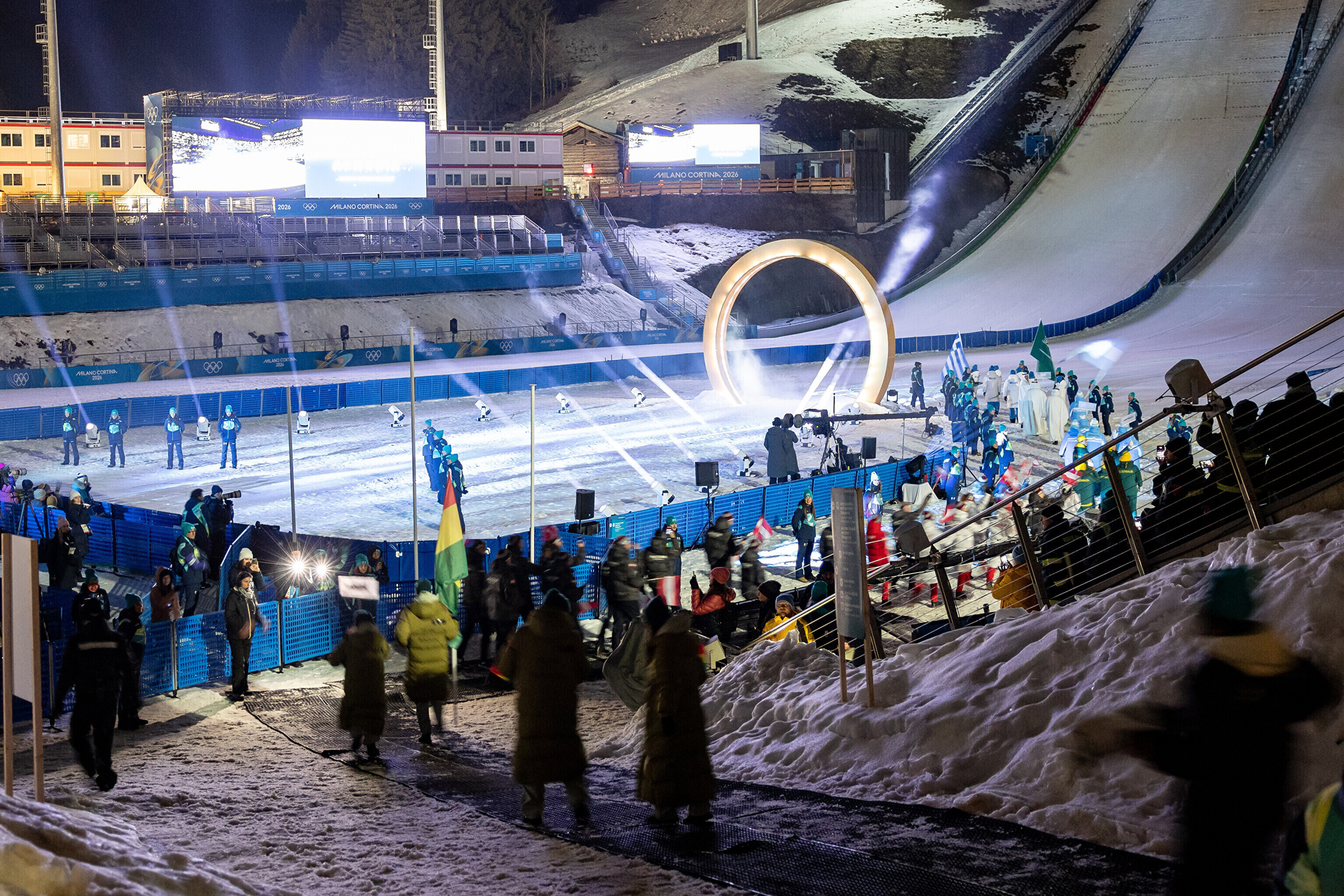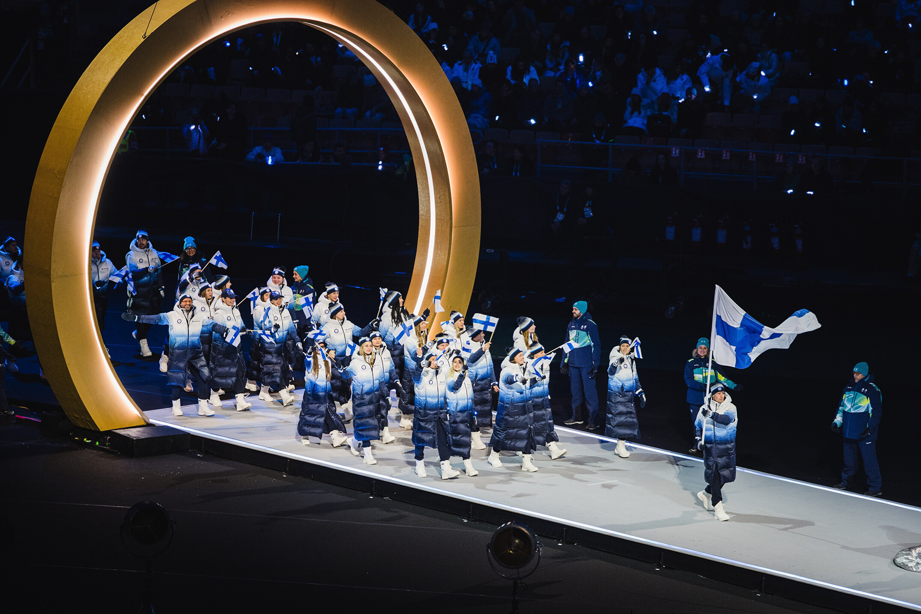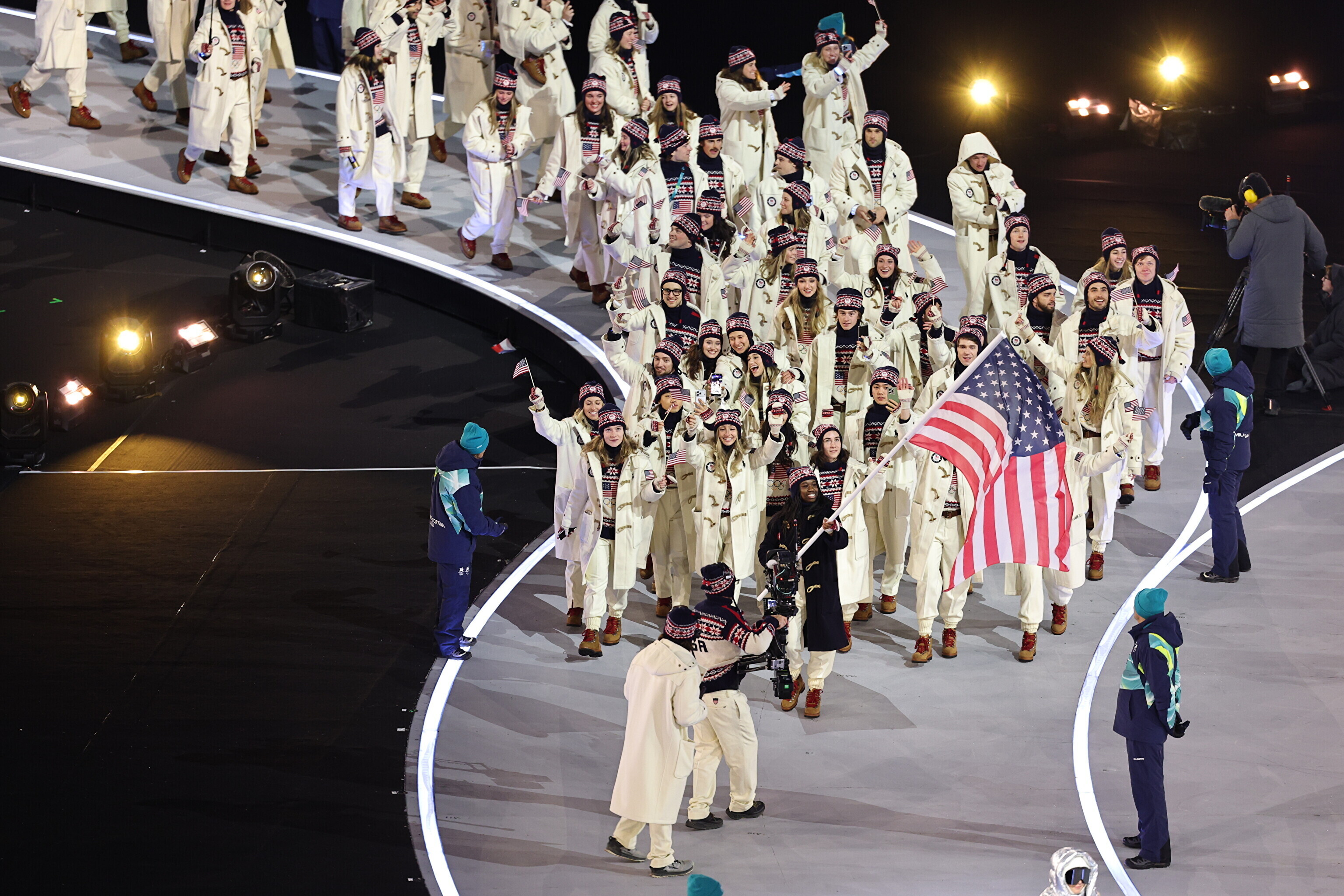 Однако спортсмены не шли рядом: церемония открытия состоялась одновременно в четырех локациях - в Милане, Кортина-д'Ампеццо, Ливиньо и Предаццо. Лийв вынес флаг на стадионе "Сан-Сиро" в Милане, а Талихярм - в олимпийской деревне Кортина-д'Ампеццо.