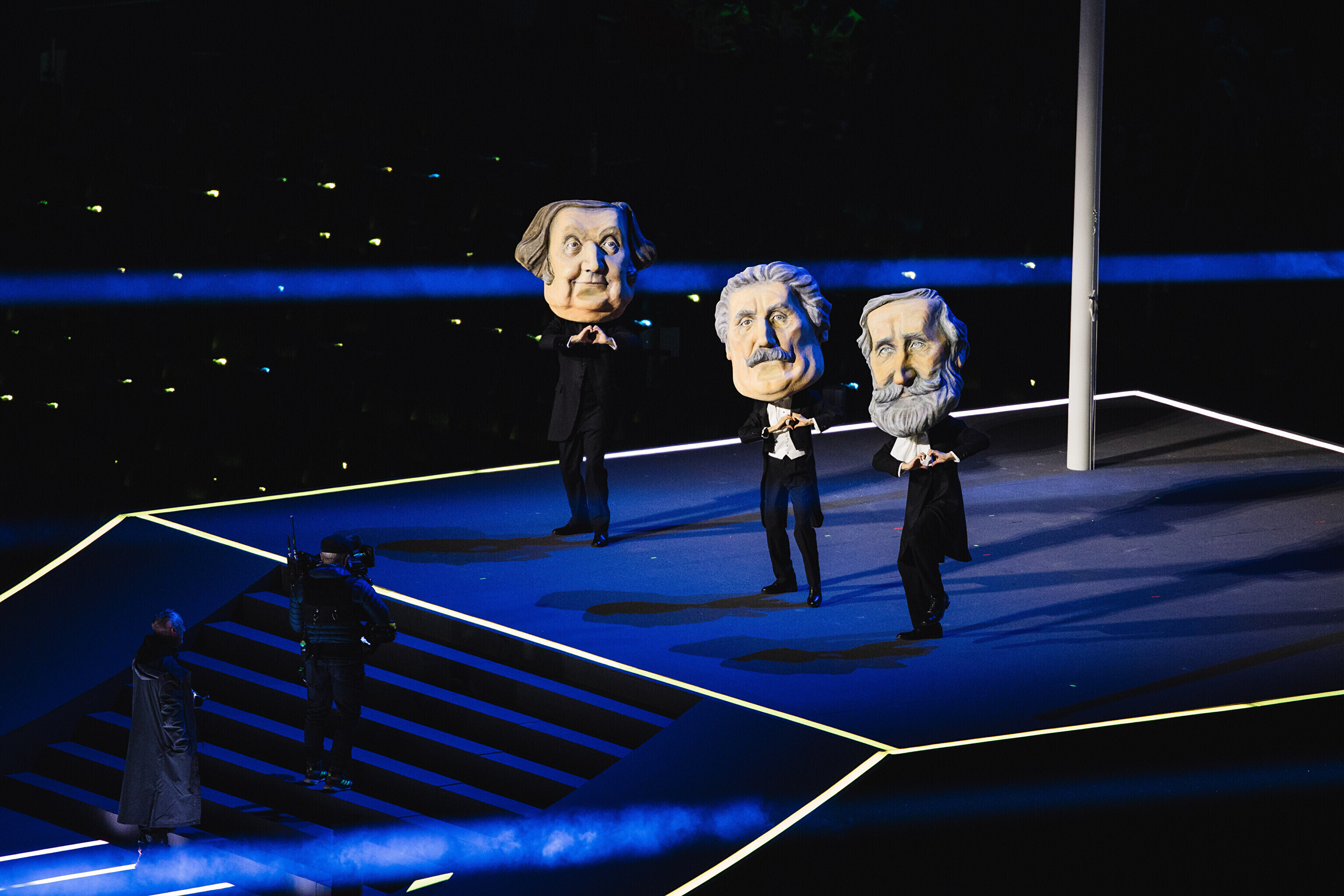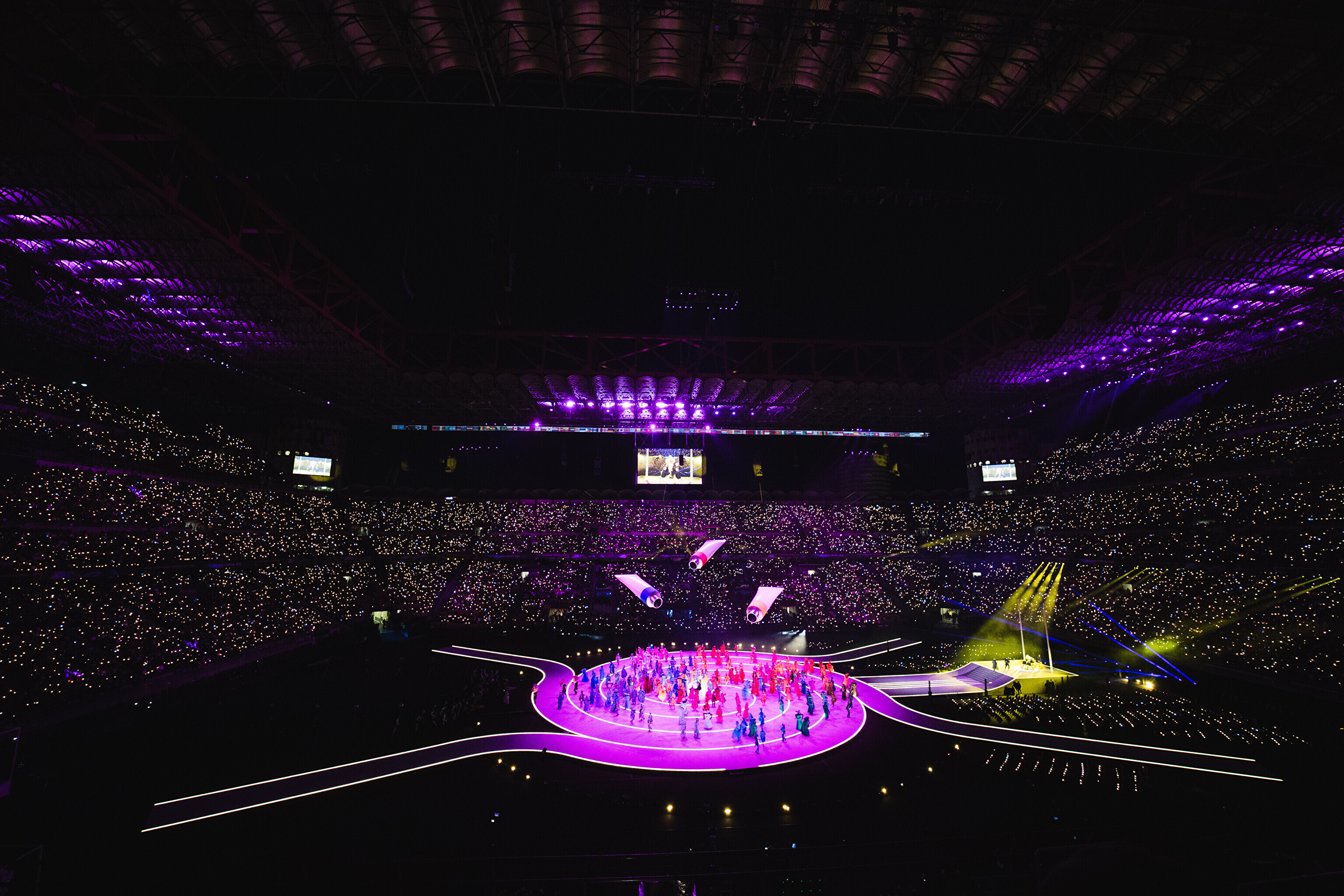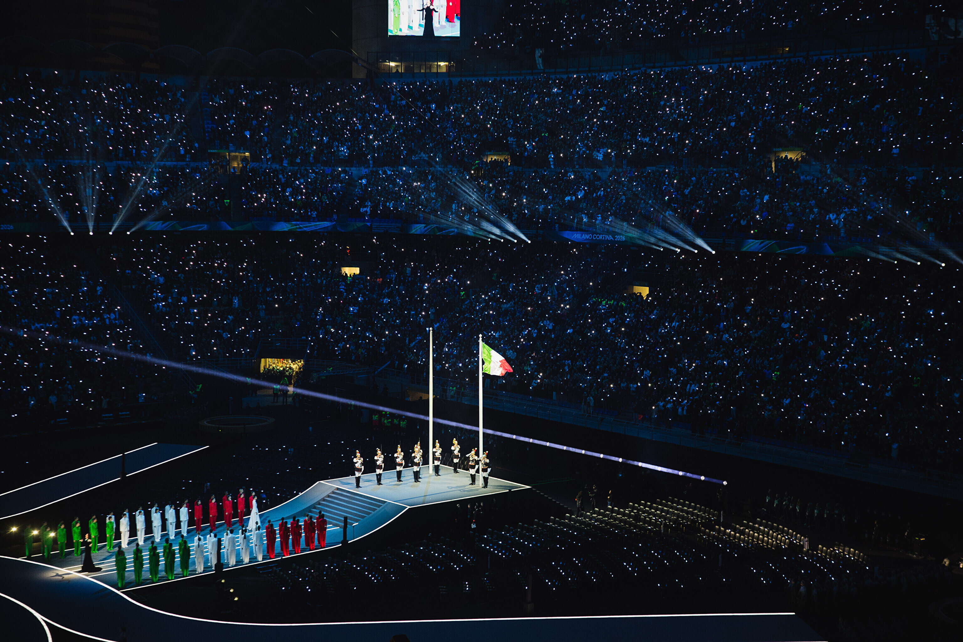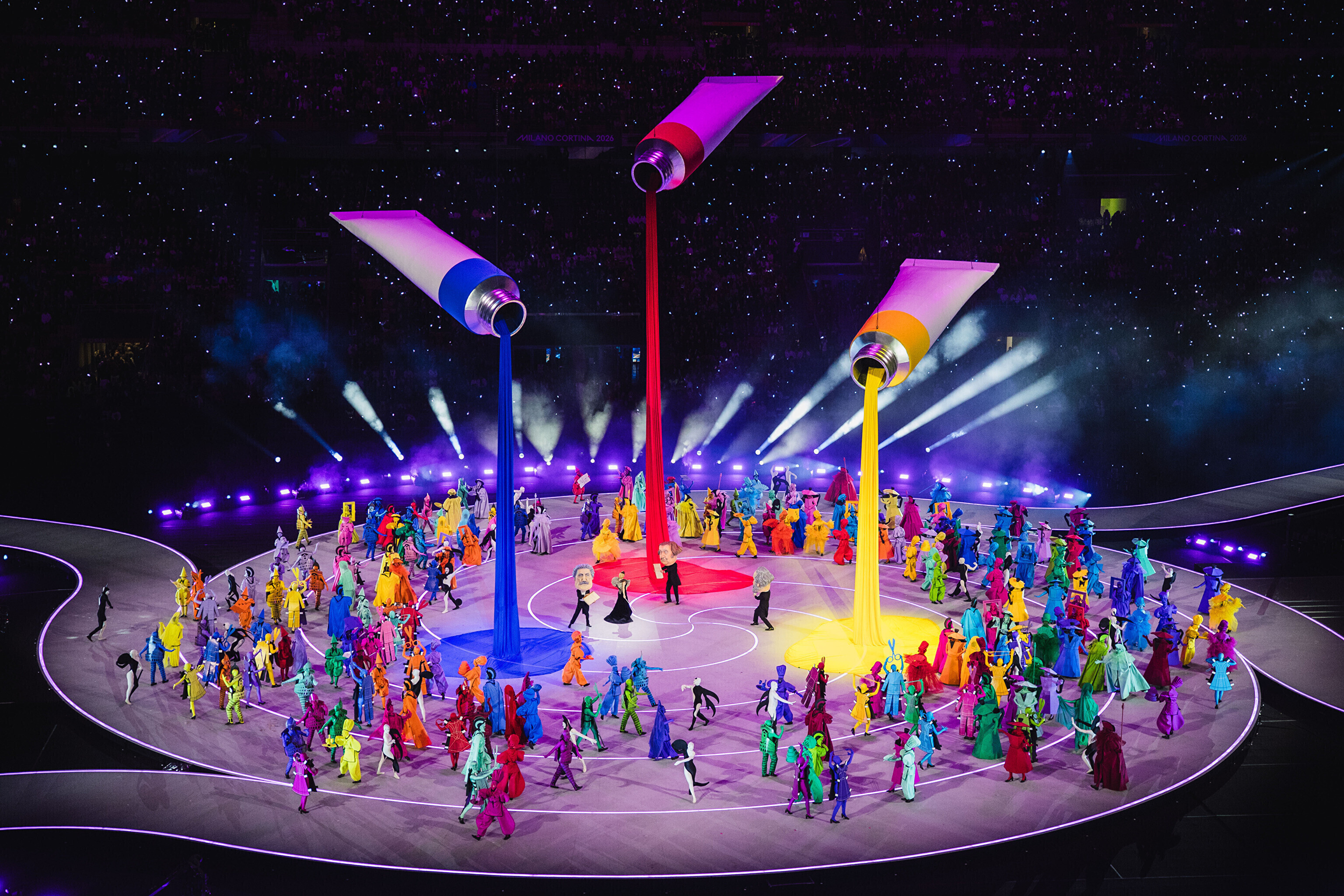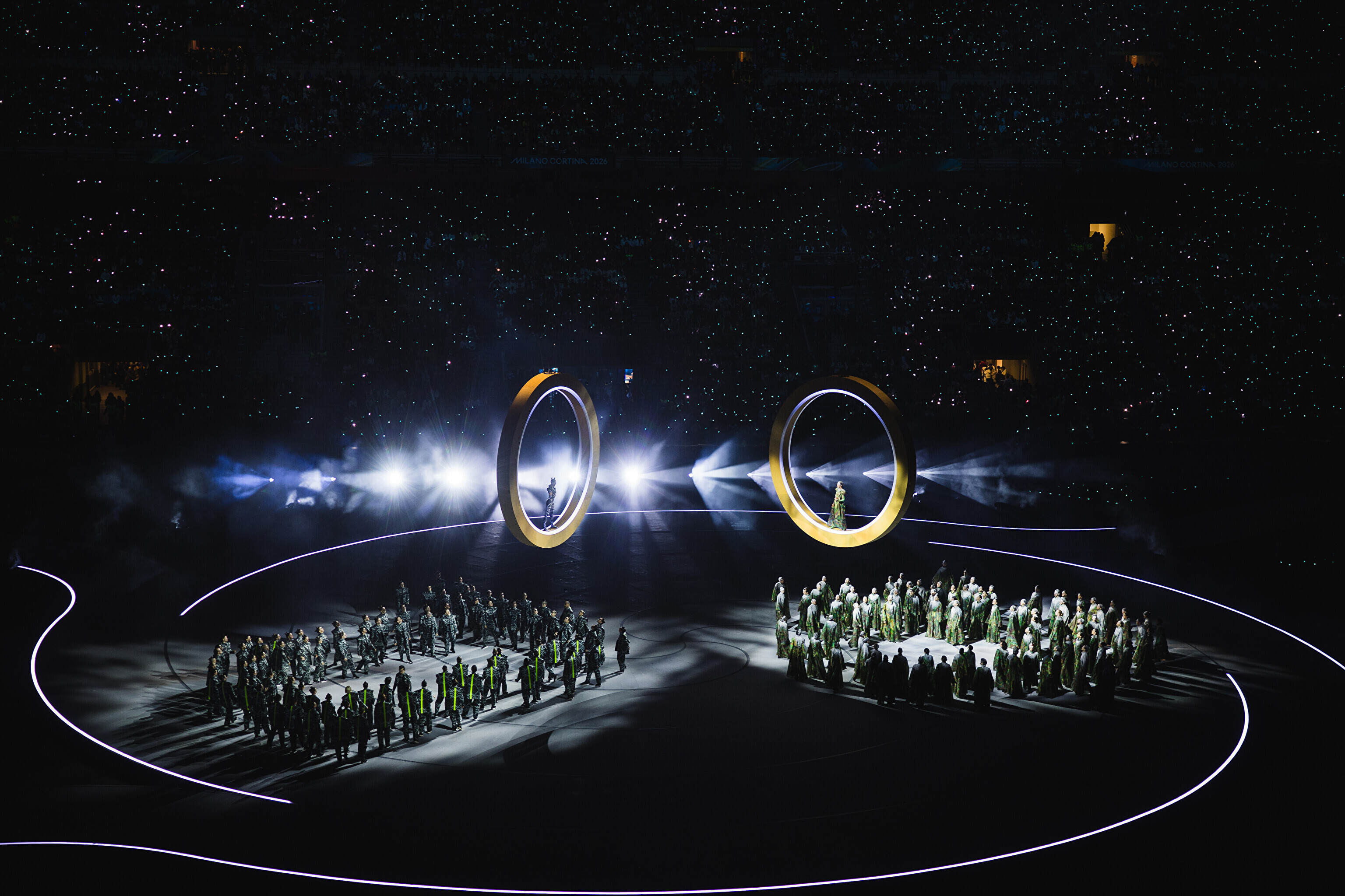 Основная церемония состоялась на "Сан-Сиро", а спортсмены, зрители и местные жители по всей стране были вовлечены в празднование. Хедлайнерами церемонии стали американская певица Мэрайя Кэри и итальянский тенор Андреа Бочелли, появившийся на сцене незадолго перед зажжением огня.