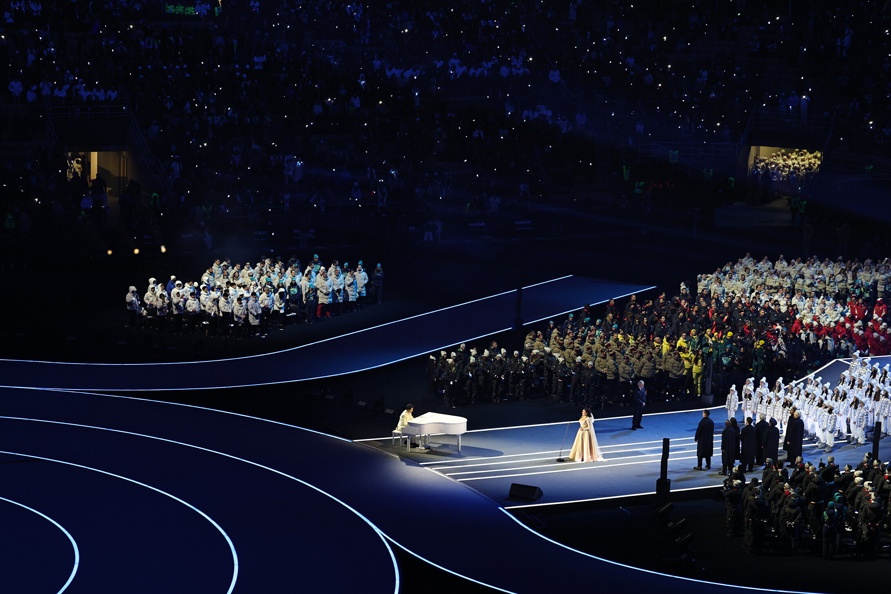Олимпийский гимн исполнил китайский пианист Лан Лан. Вокальную часть доверили меццо-сопрано Чечилии Бартоли.