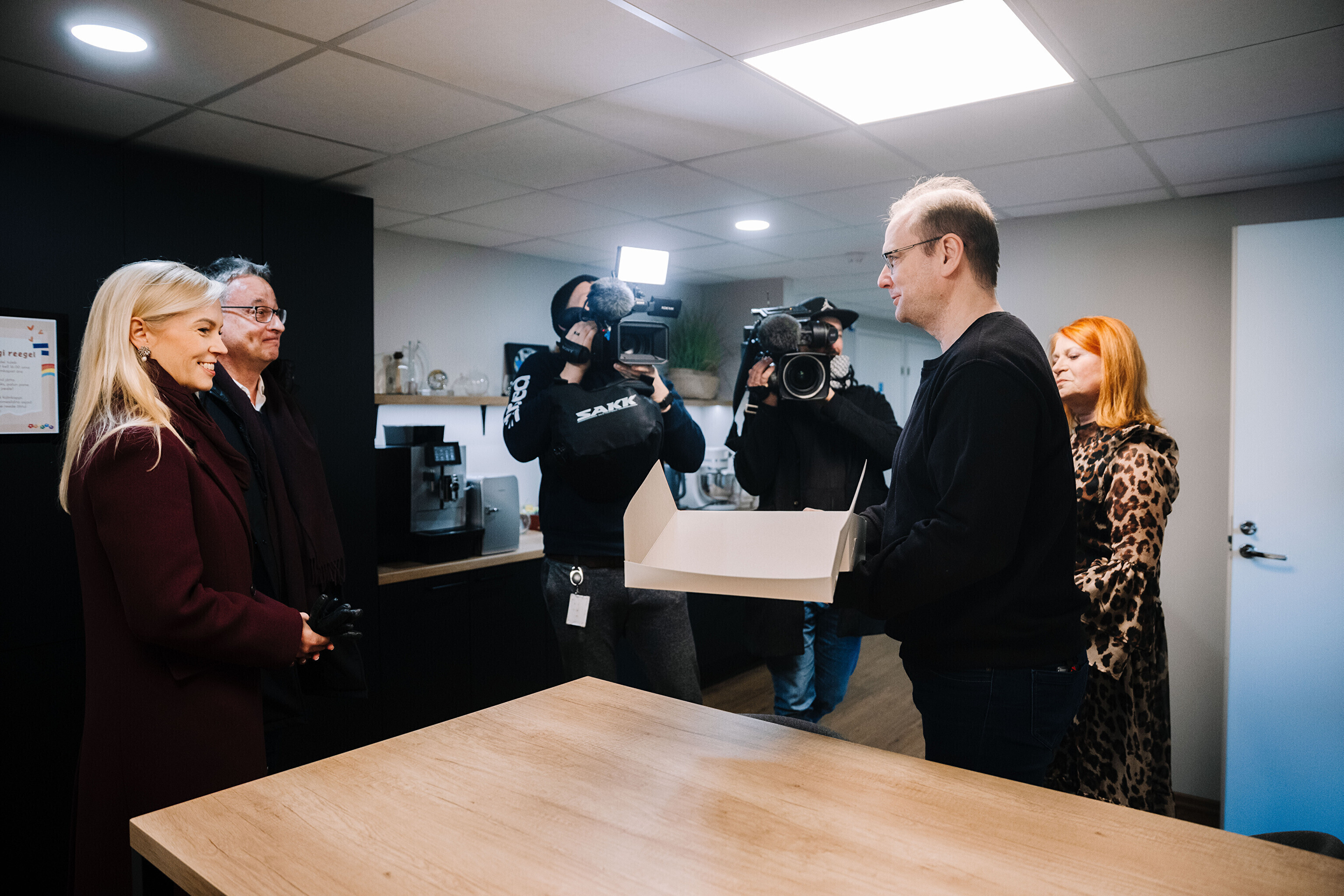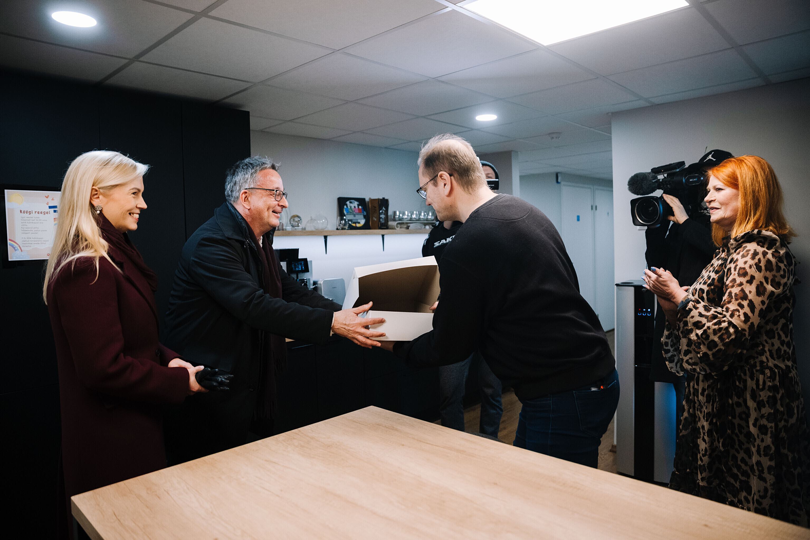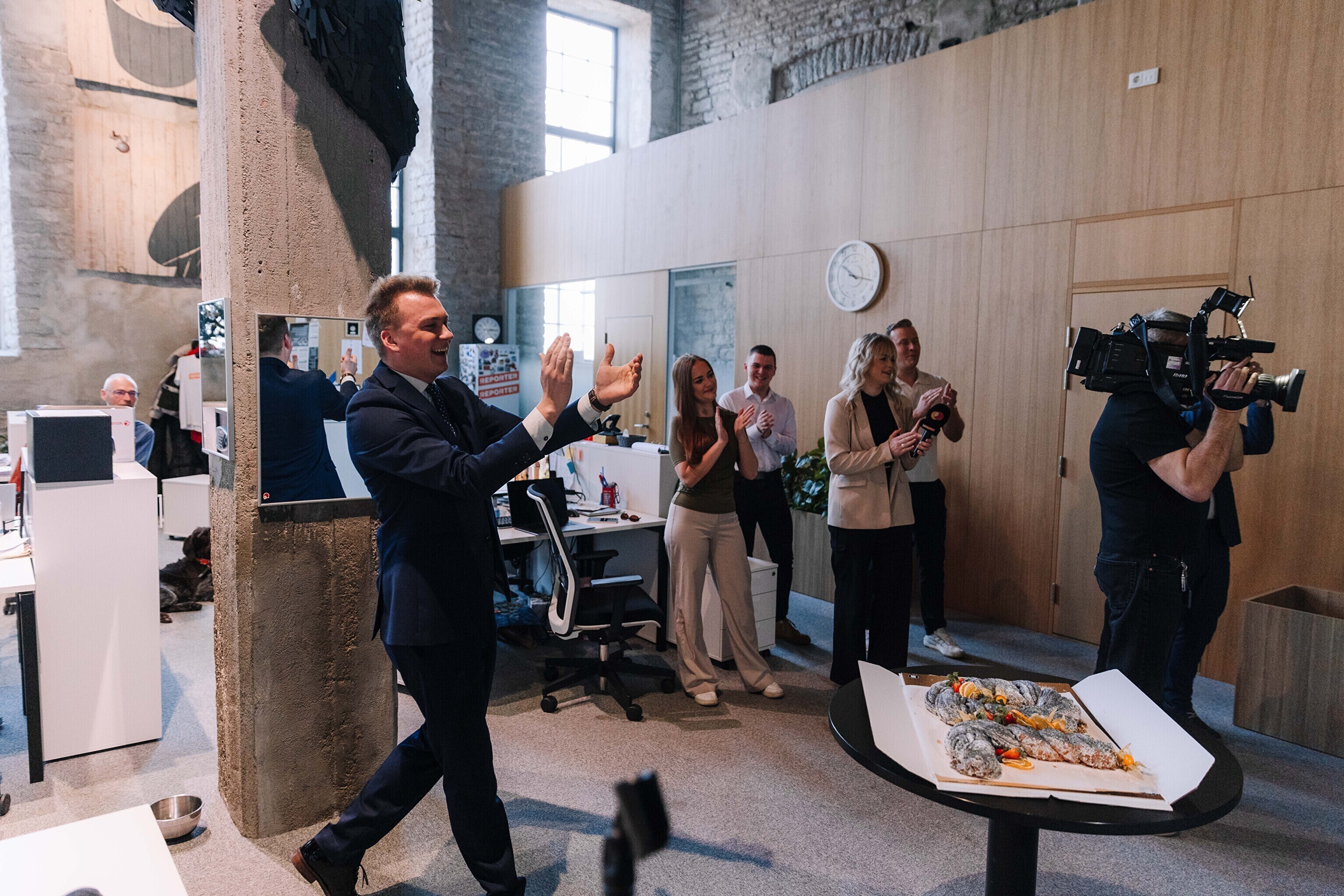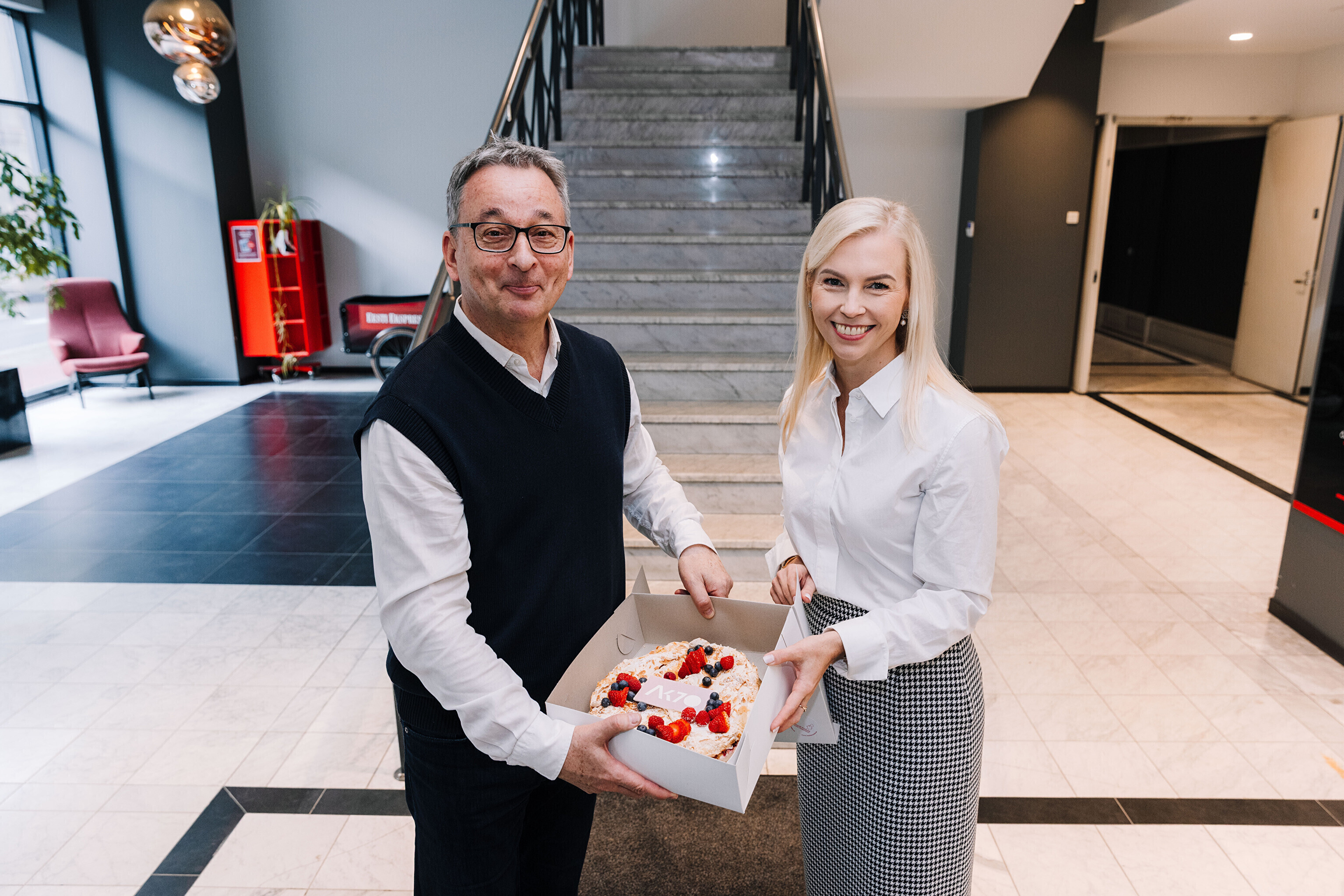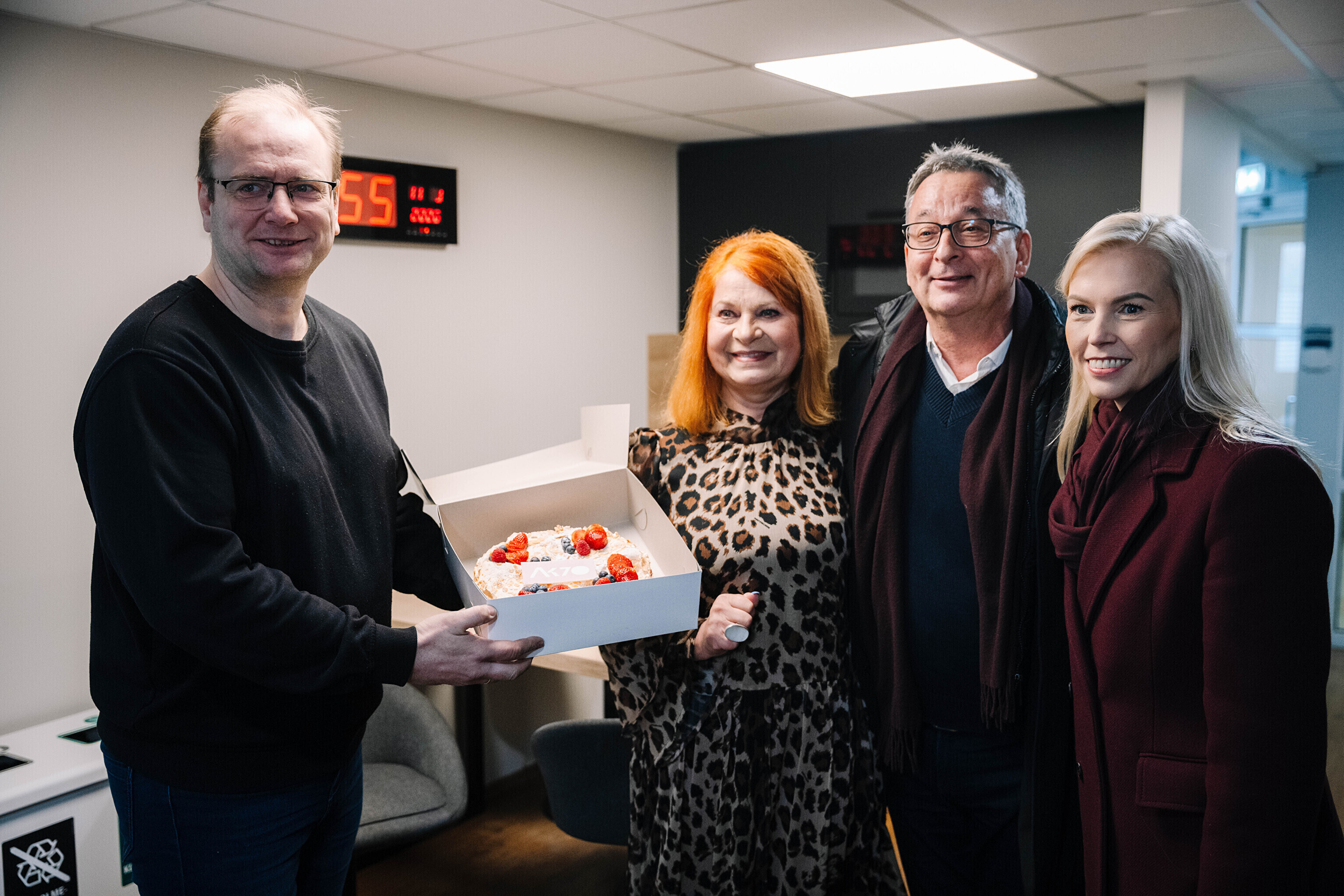 В честь 70-летия "Актуальной камеры" руководитель телевизионных новостей Лийзу Лассь и редактор-ведущий Маргус Саар доставили праздничный торт в редакции Delfi, Postimees, Õhtuleht, Kanal 2 и TV3.