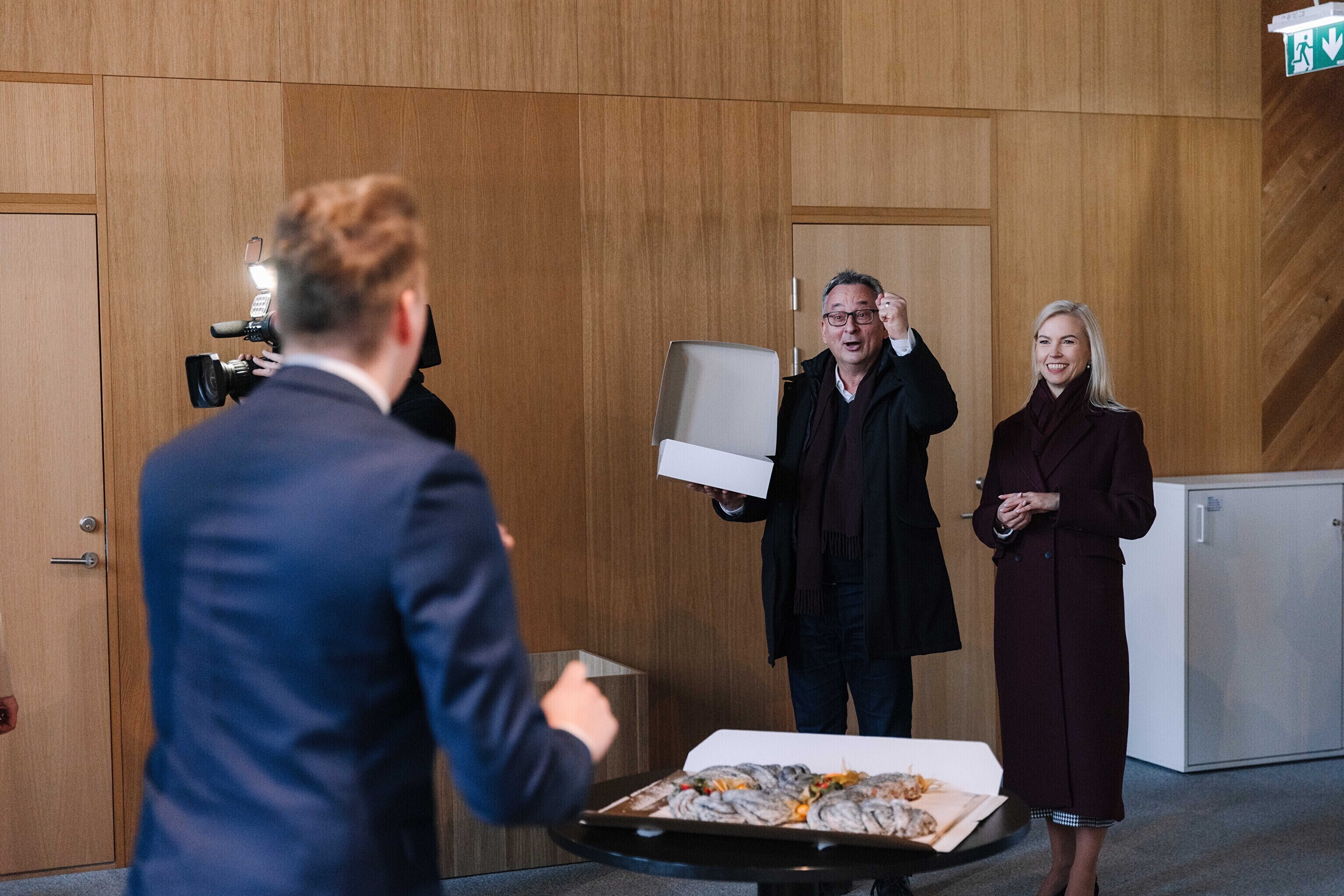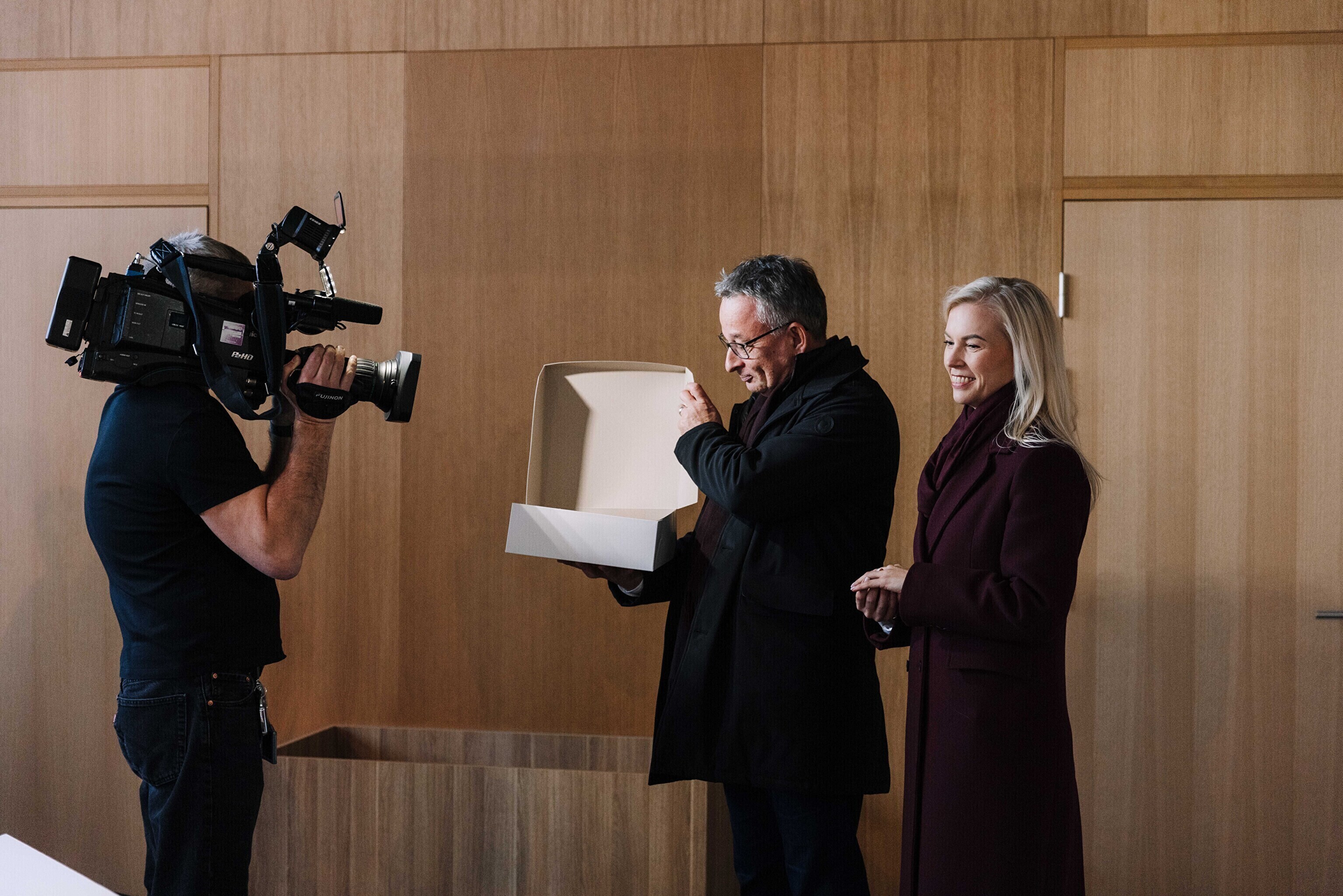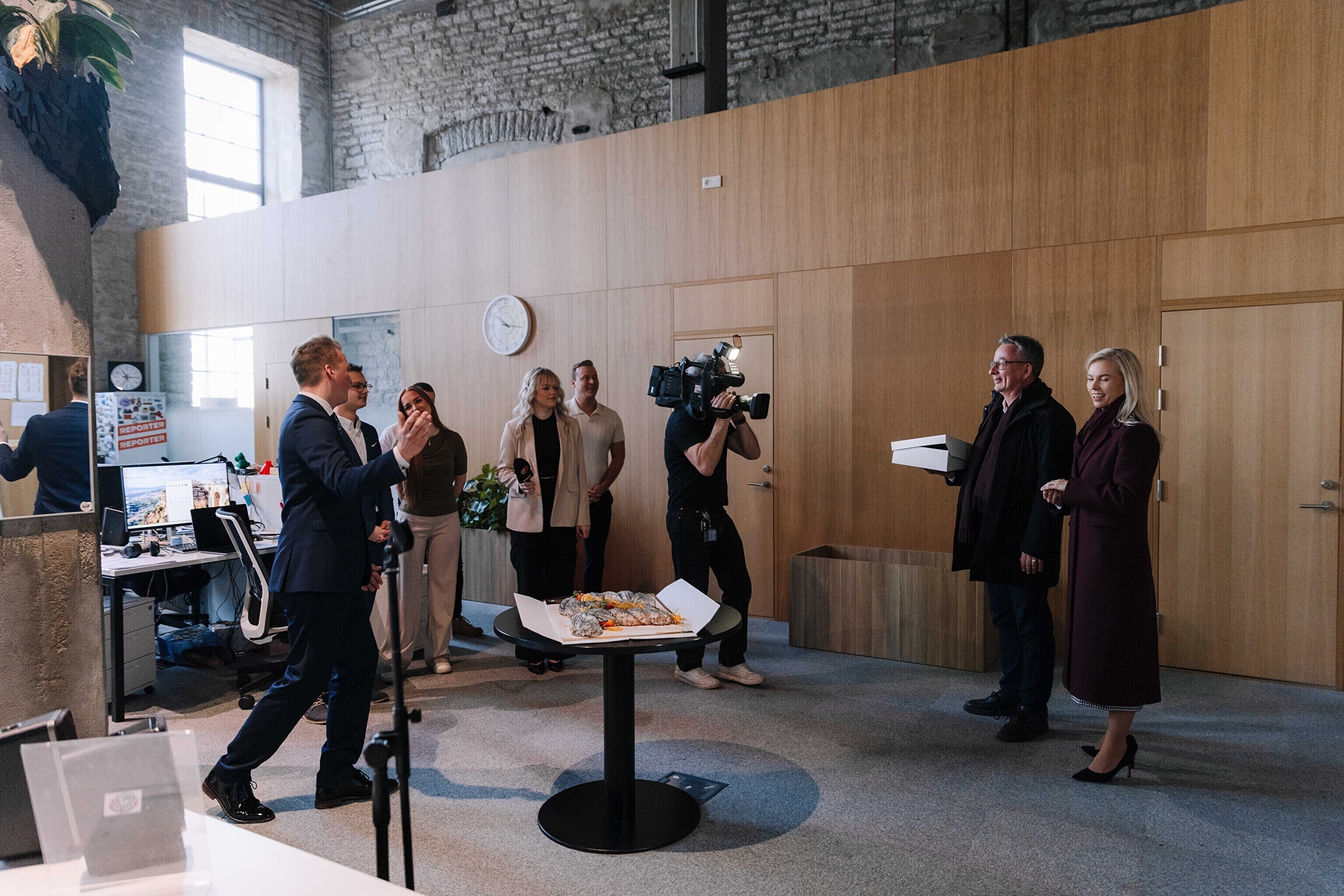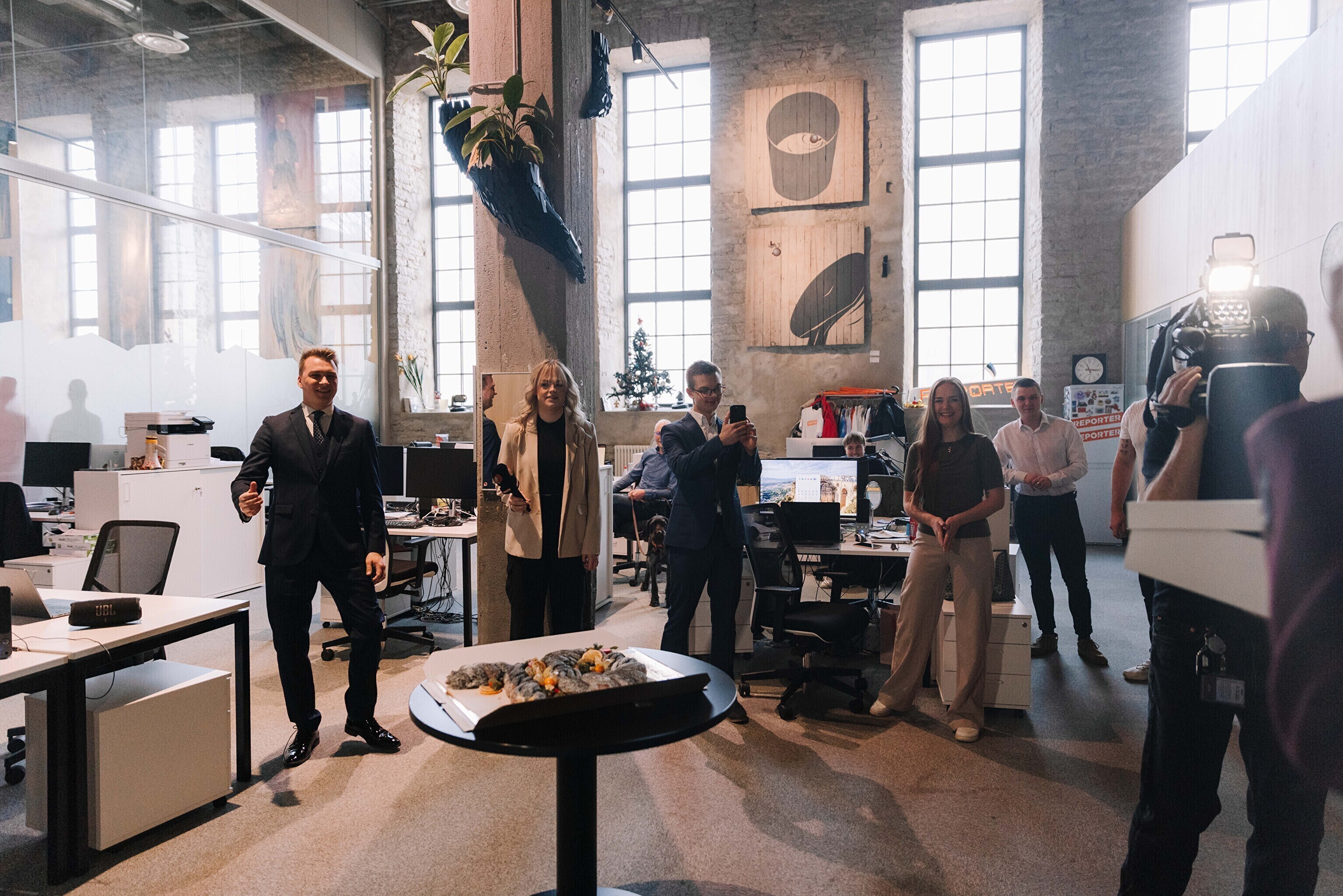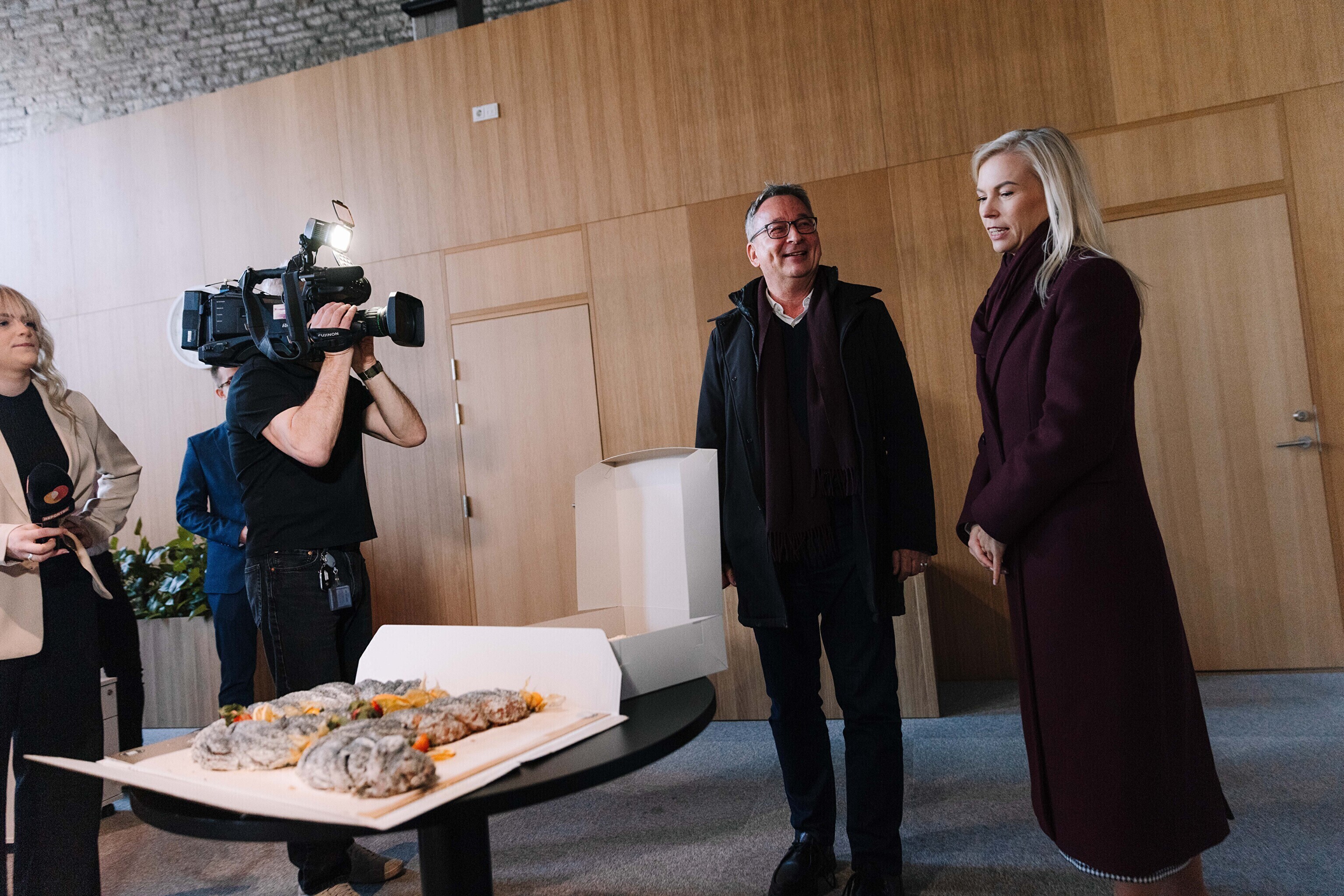 В честь 70-летия "Актуальной камеры" руководитель телевизионных новостей Лийзу Лассь и редактор-ведущий Маргус Саар доставили праздничный торт в редакции Delfi, Postimees, Õhtuleht, Kanal 2 и TV3.