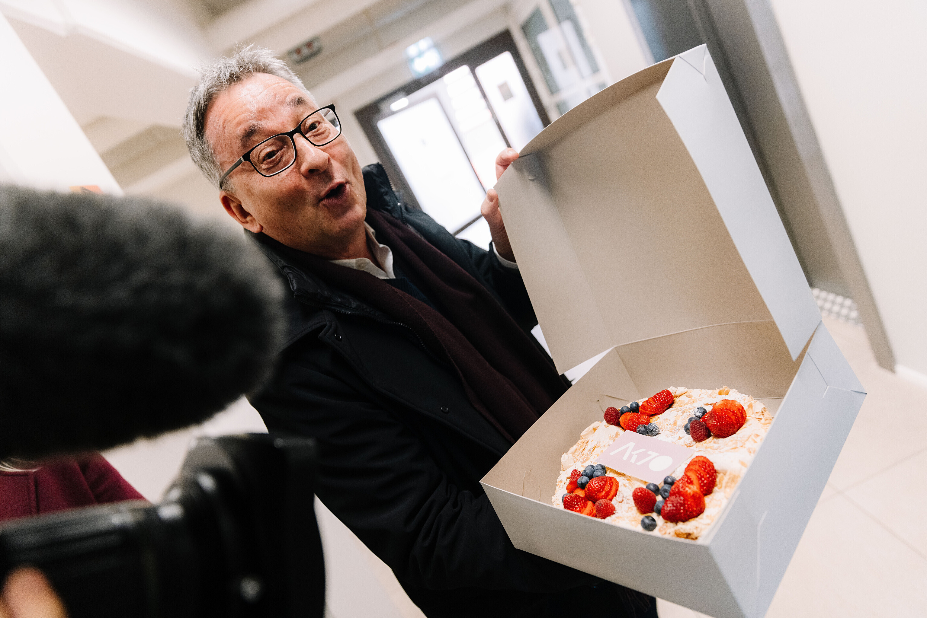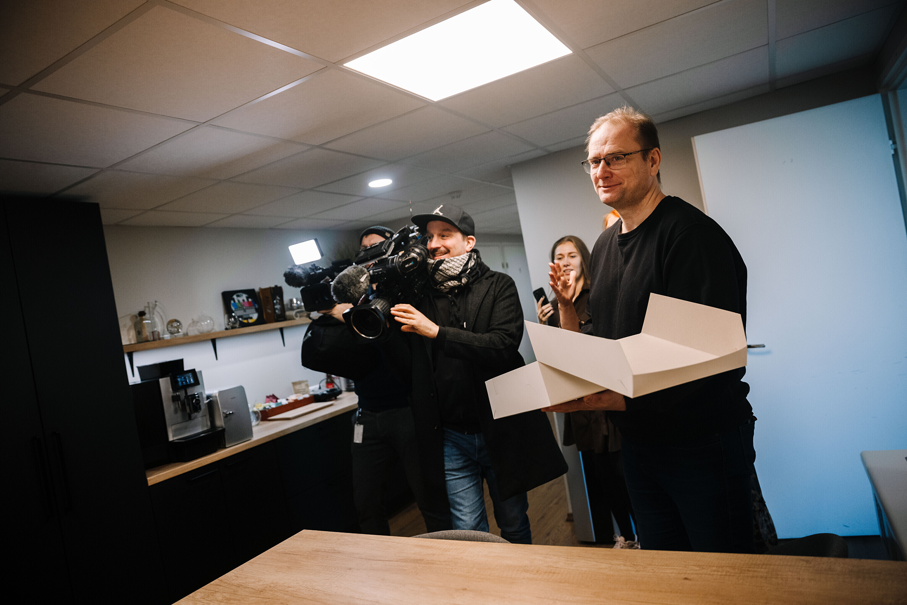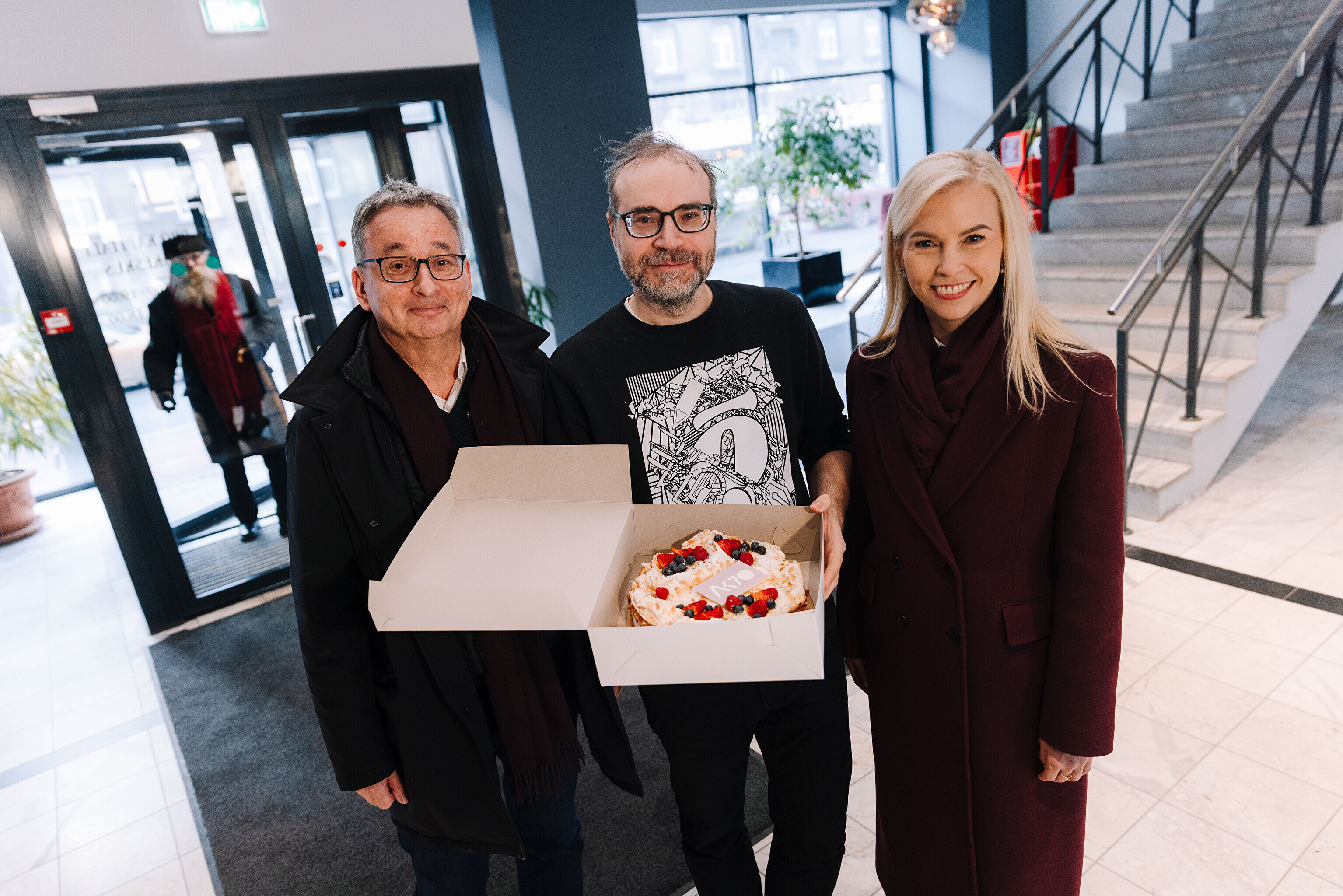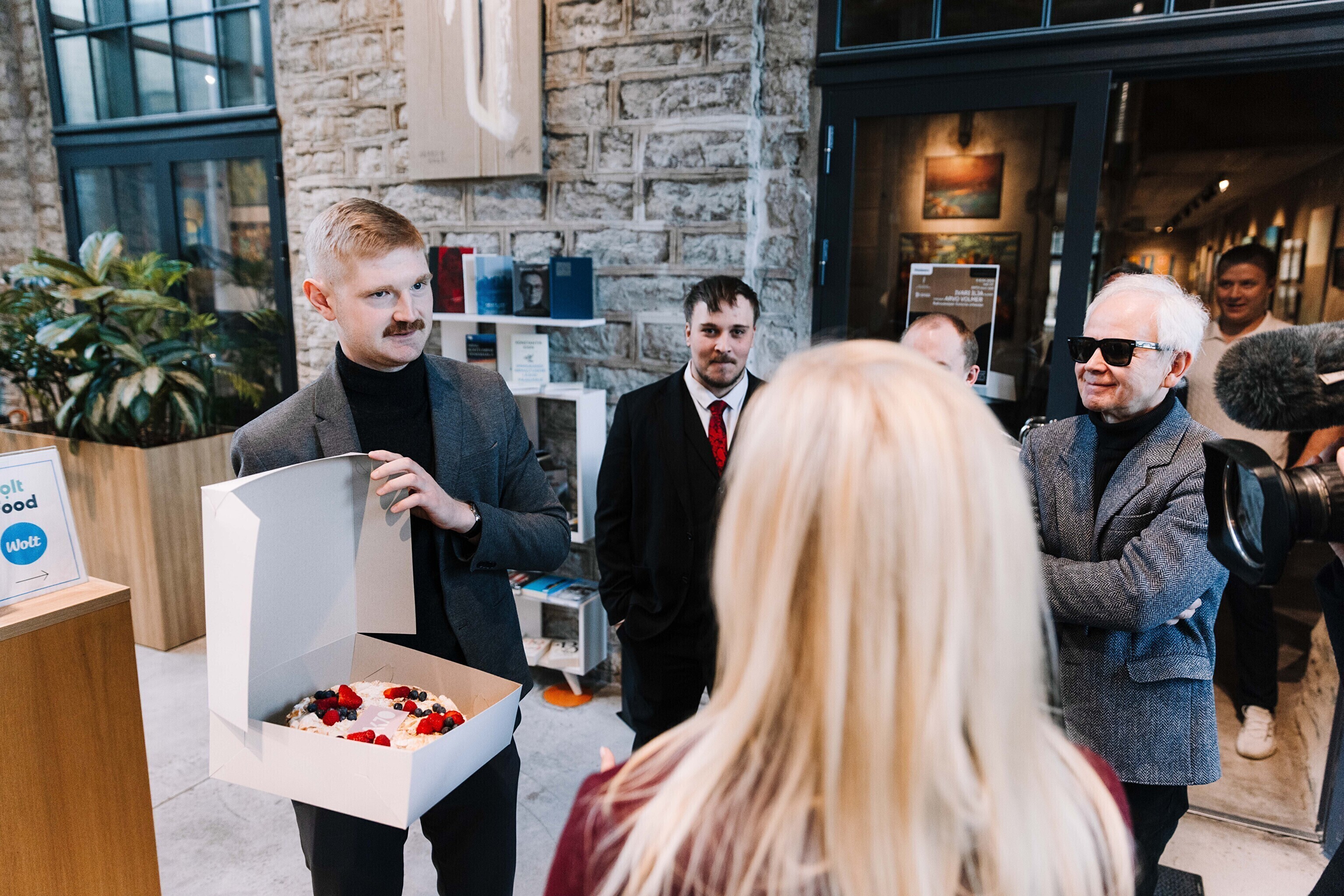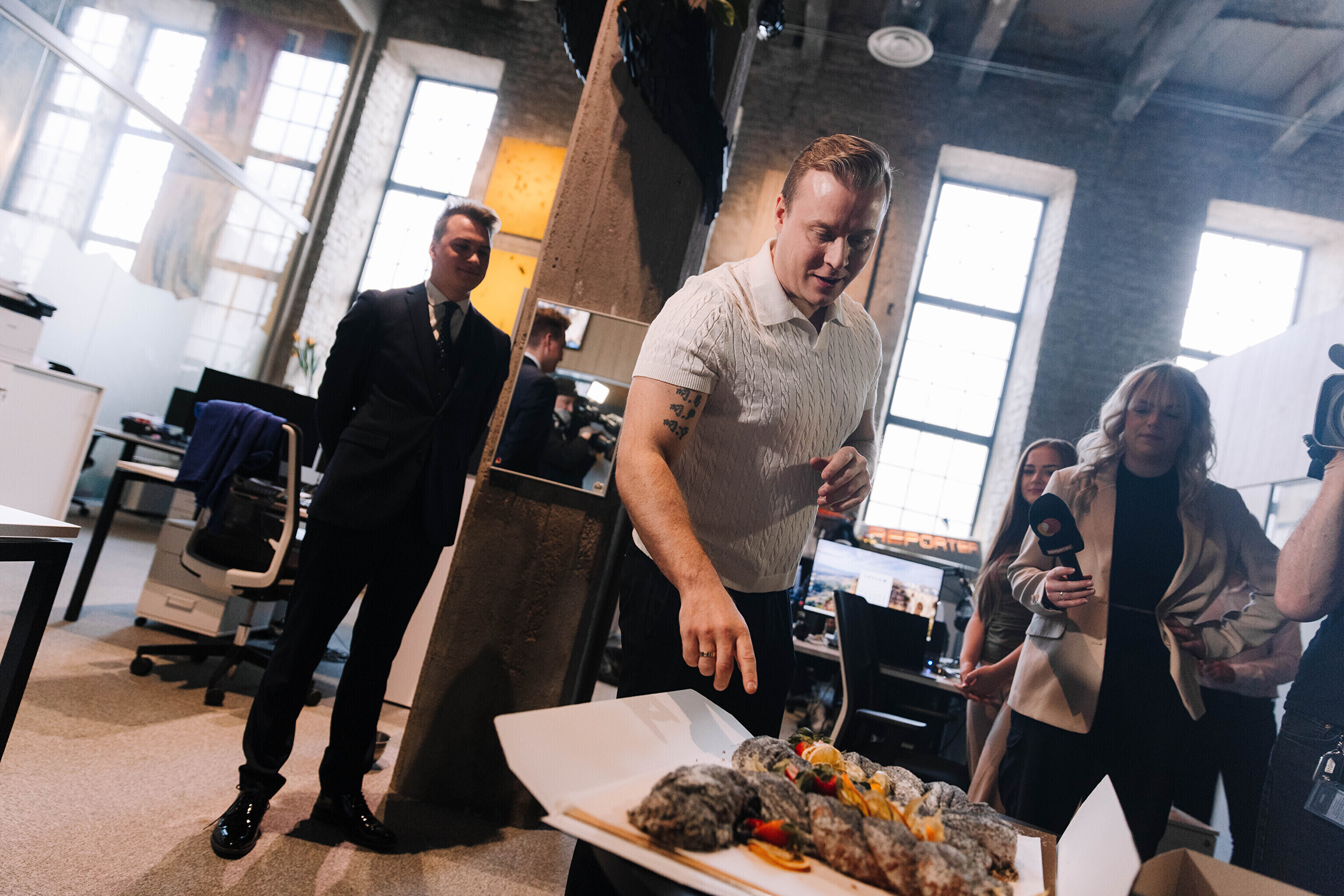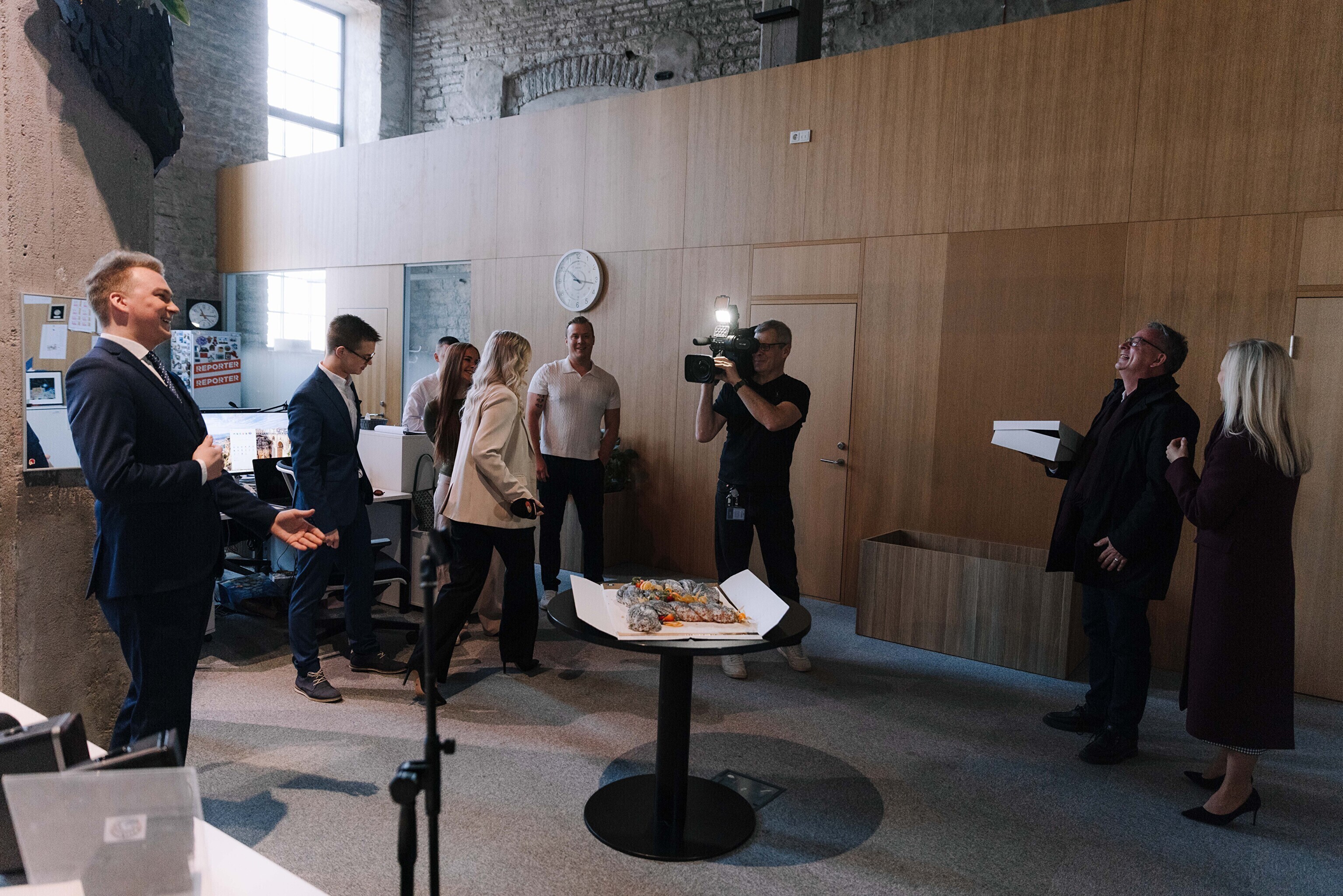 В честь 70-летия "Актуальной камеры" руководитель телевизионных новостей Лийзу Лассь и редактор-ведущий Маргус Саар доставили праздничный торт в редакции Delfi, Postimees, Õhtuleht, Kanal 2 и TV3.