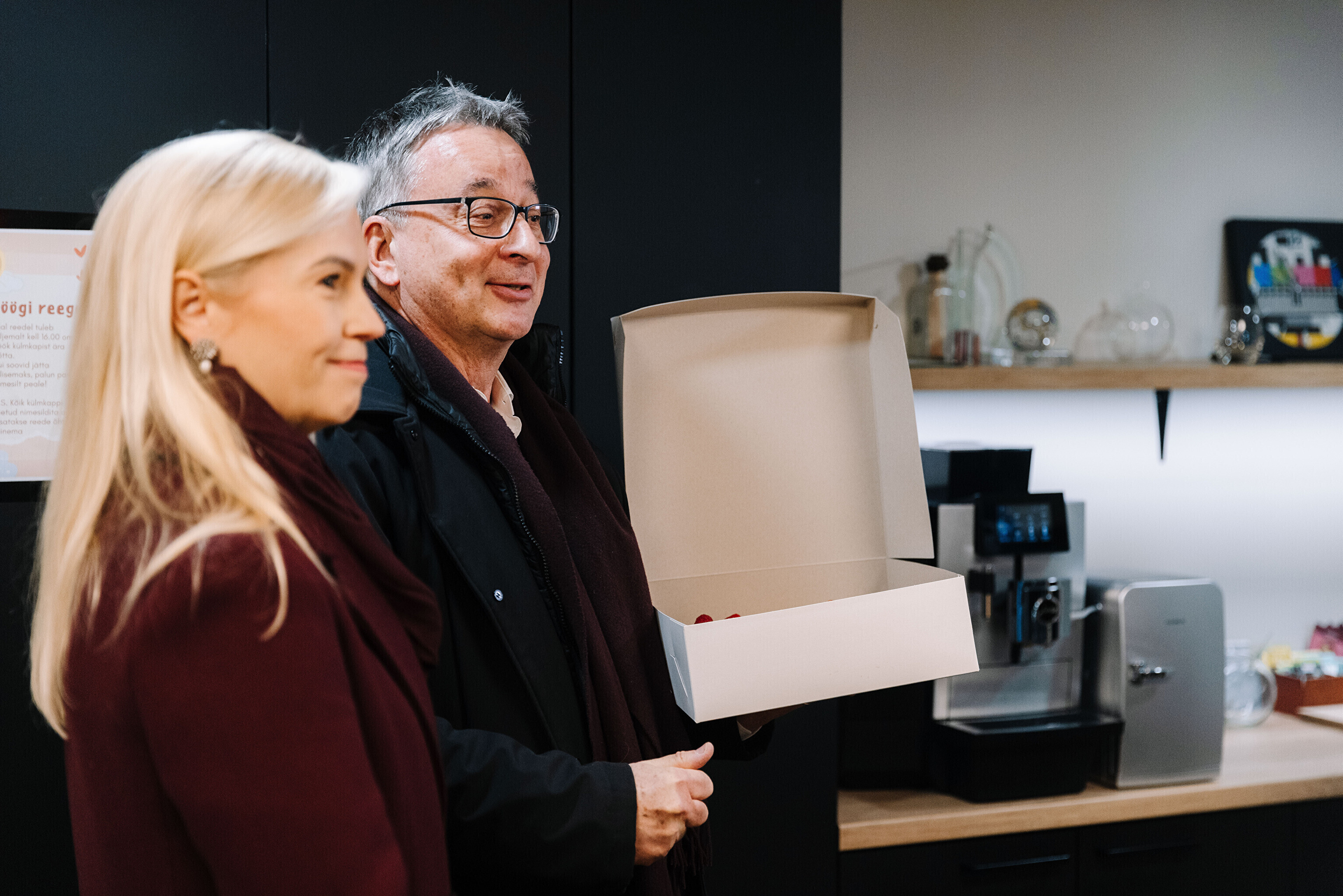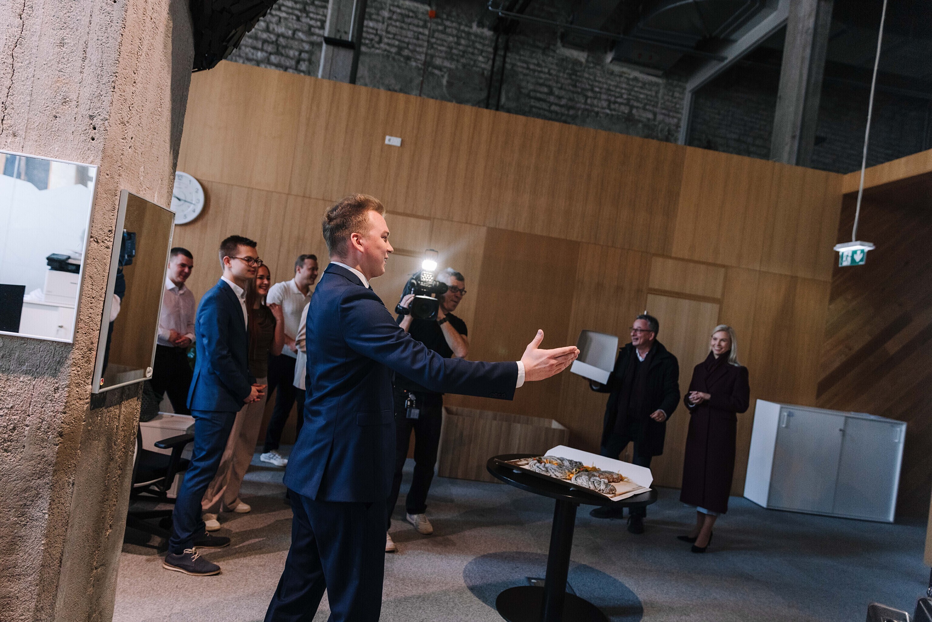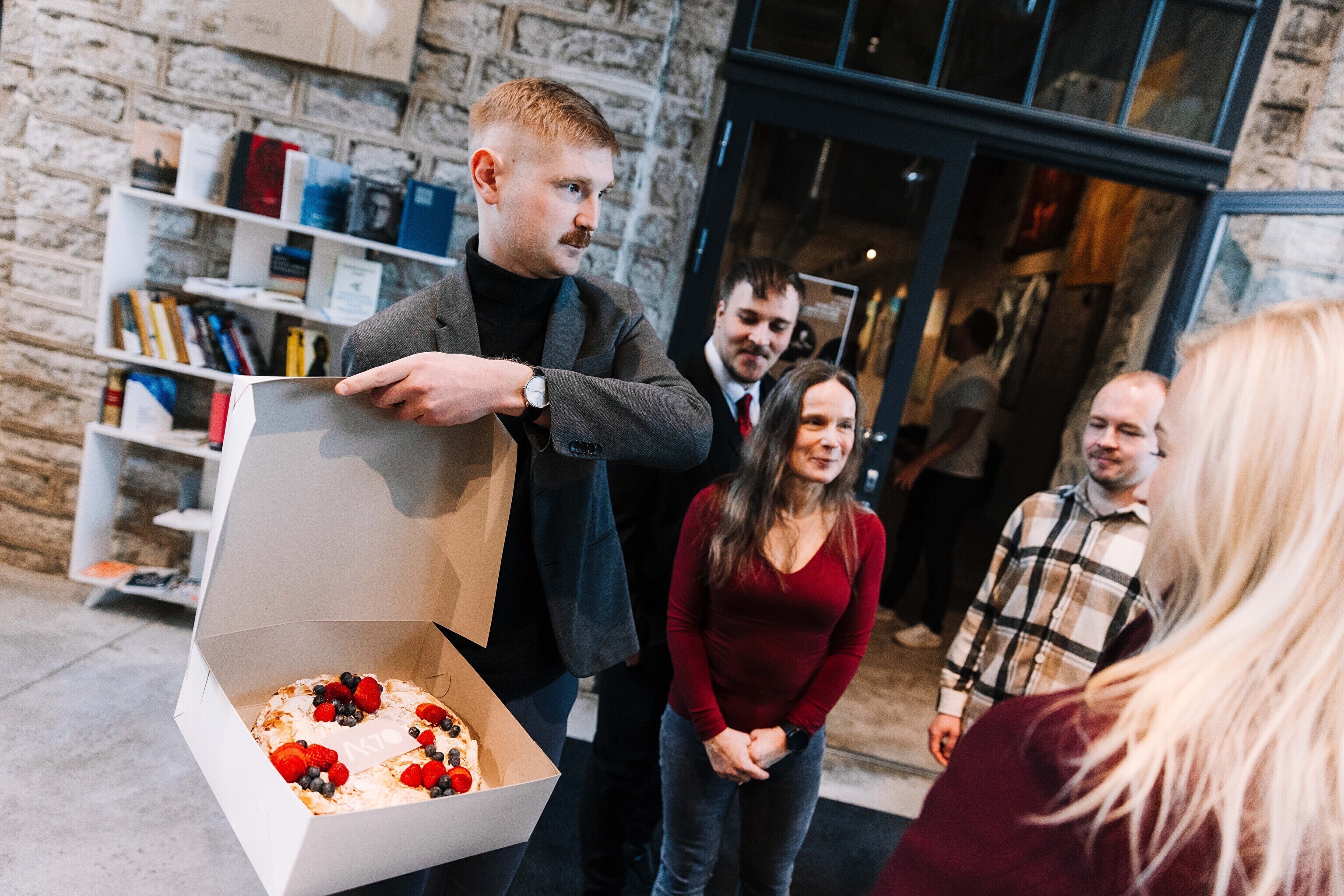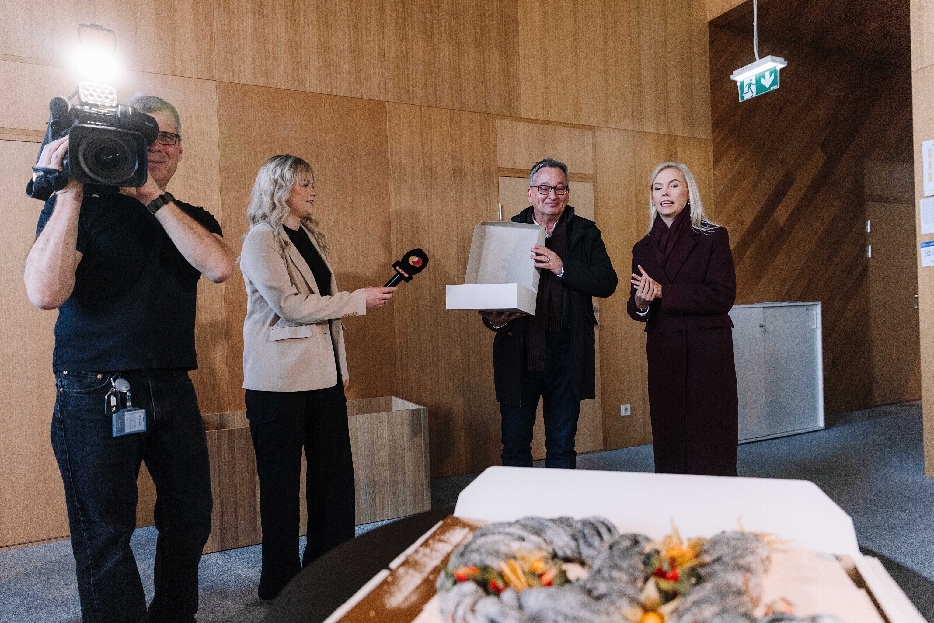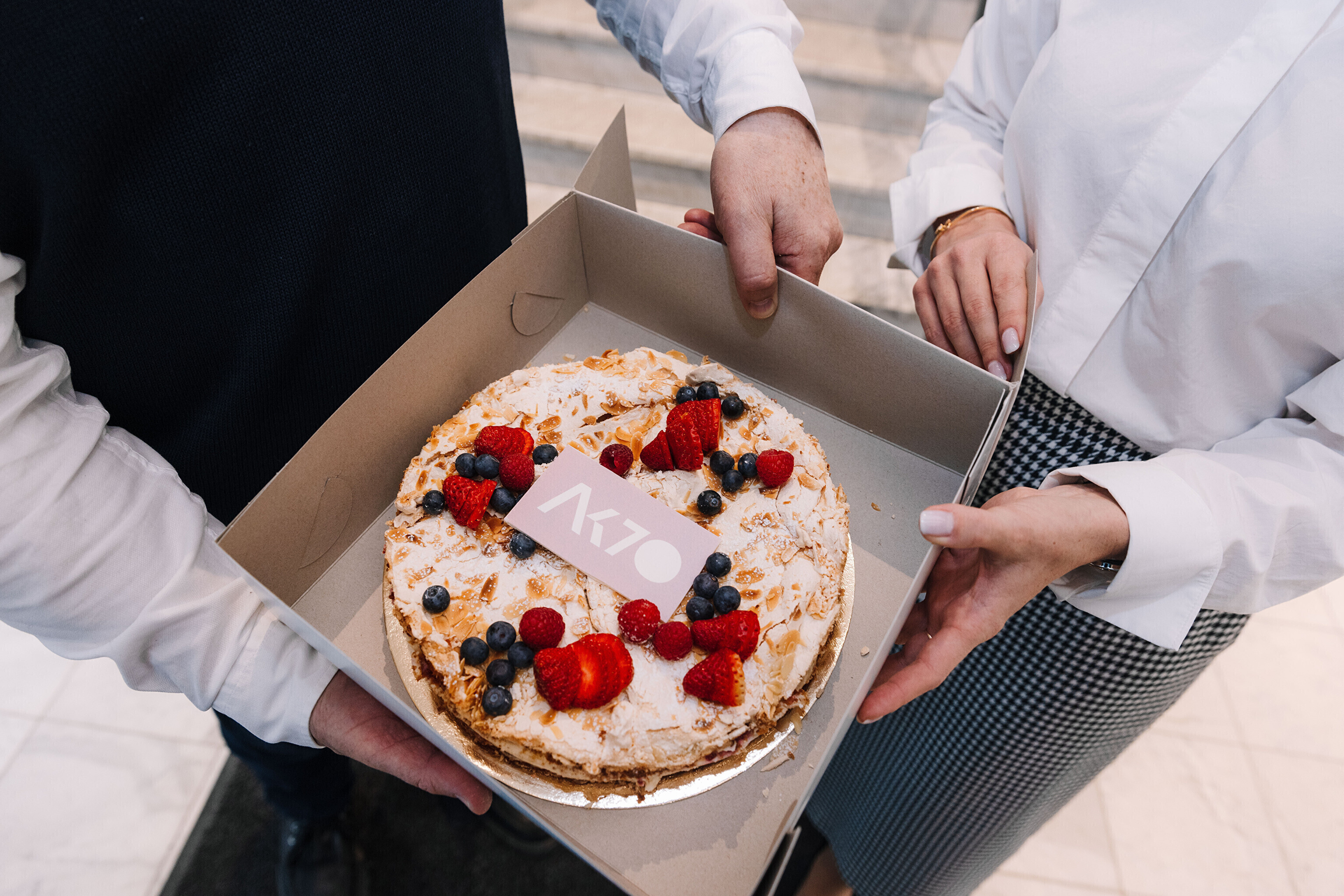 В честь 70-летия "Актуальной камеры" руководитель телевизионных новостей Лийзу Лассь и редактор-ведущий Маргус Саар доставили праздничный торт в редакции Delfi, Postimees, Õhtuleht, Kanal 2 и TV3.