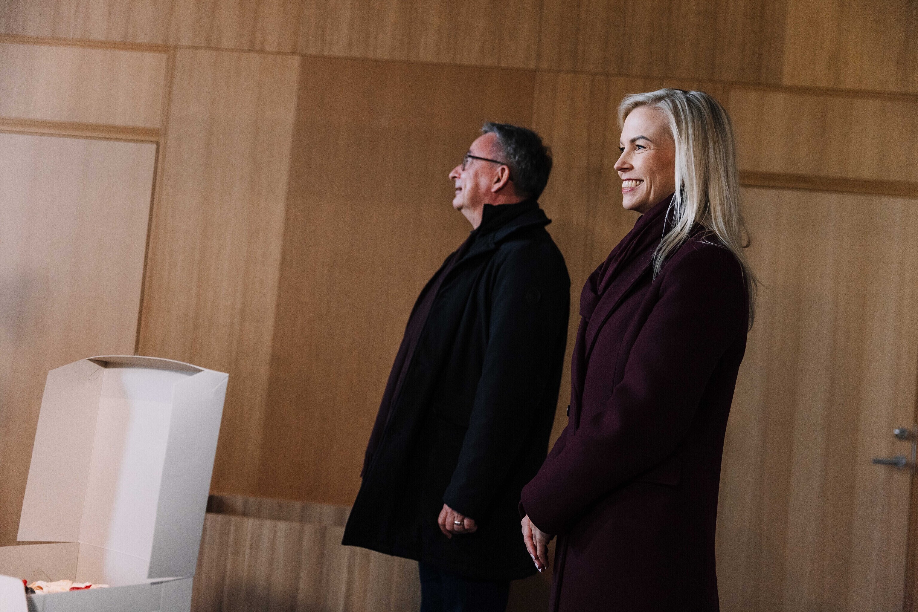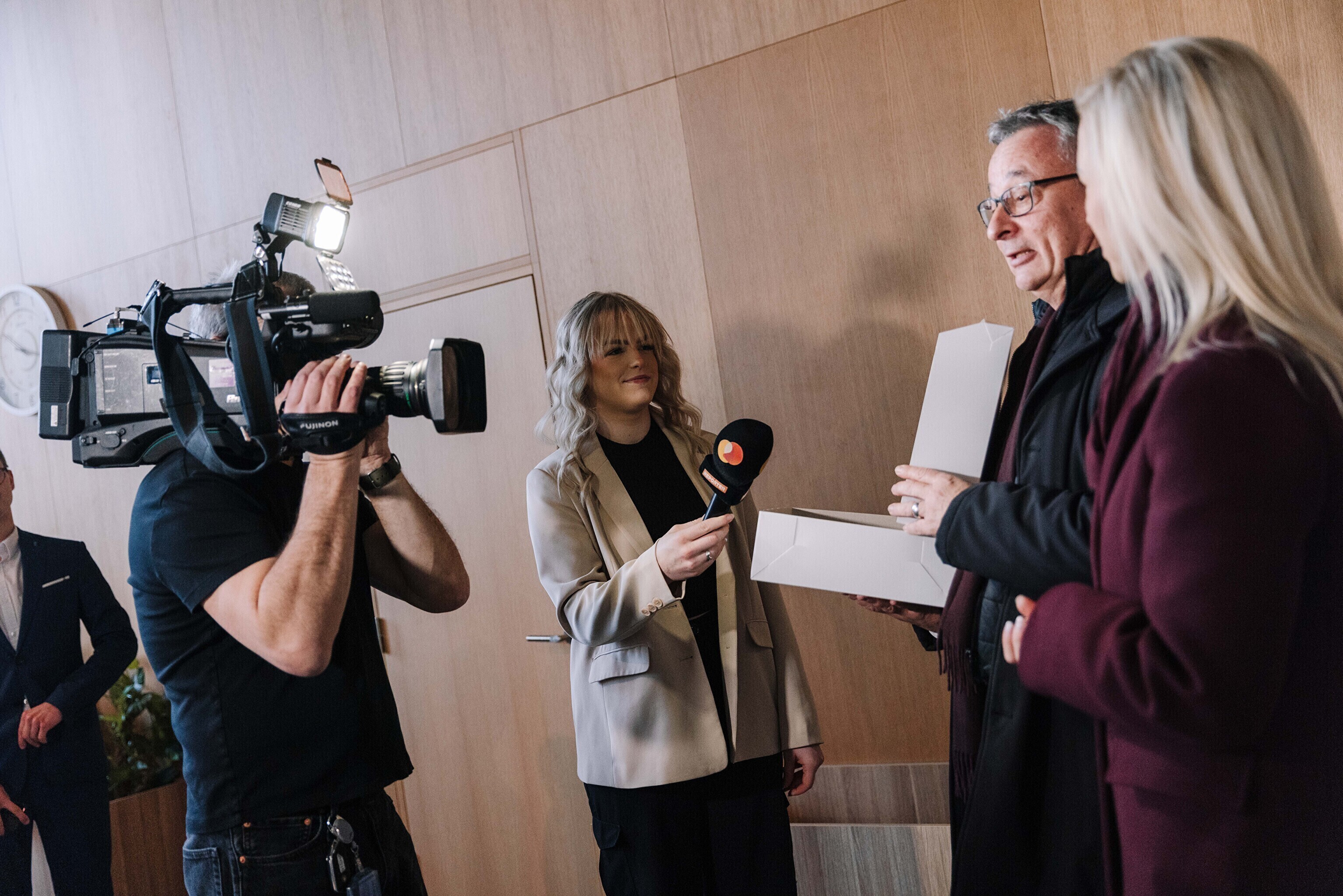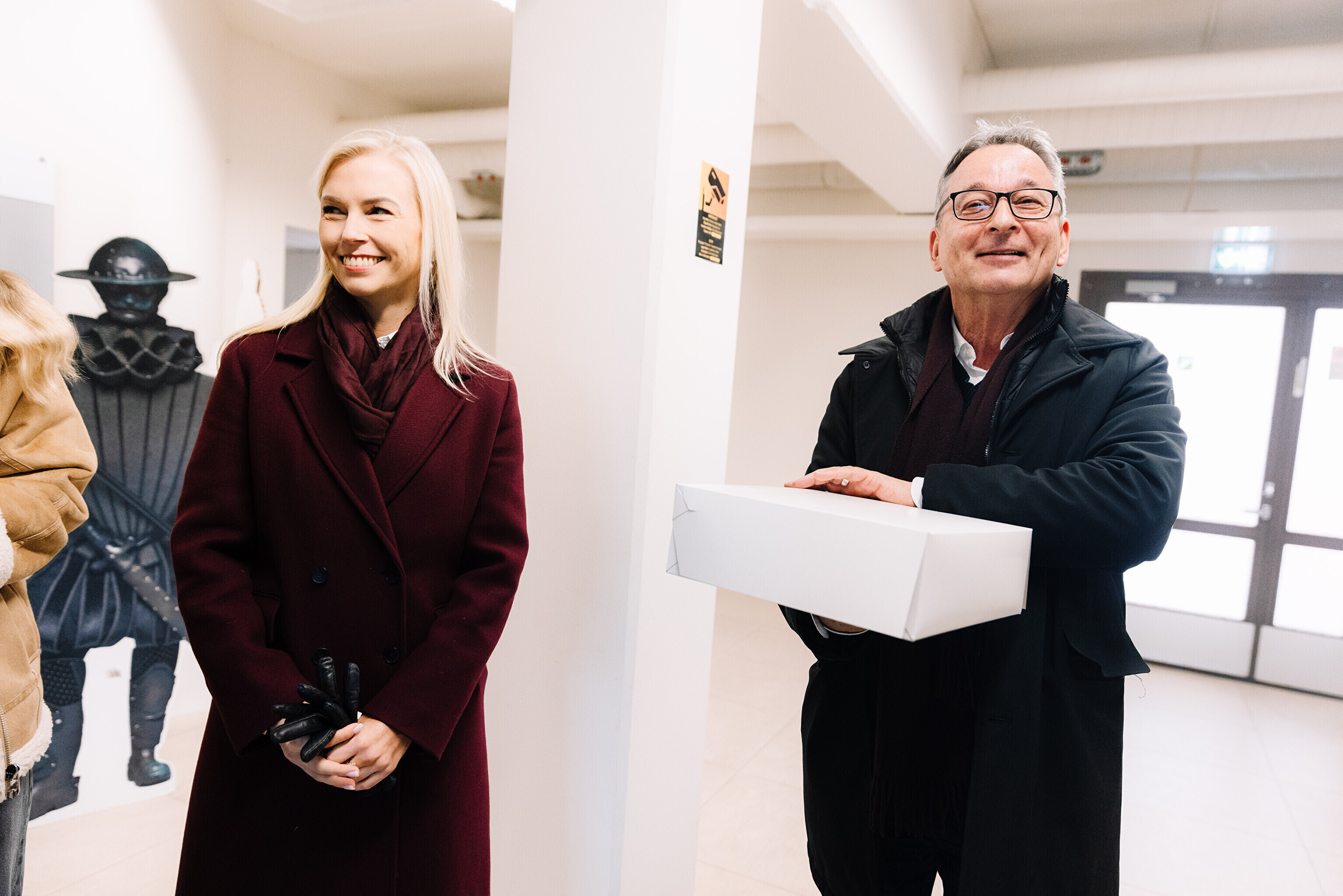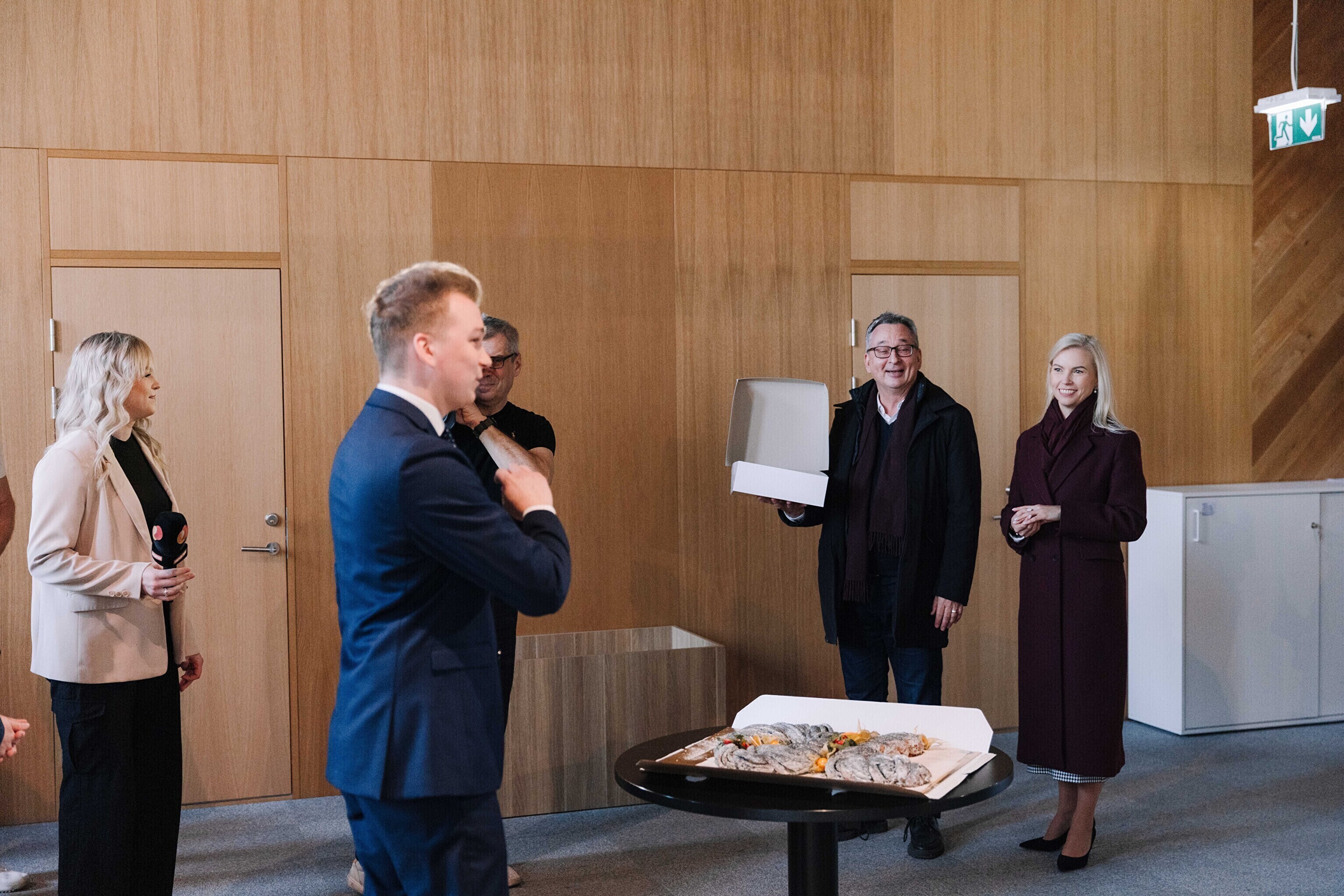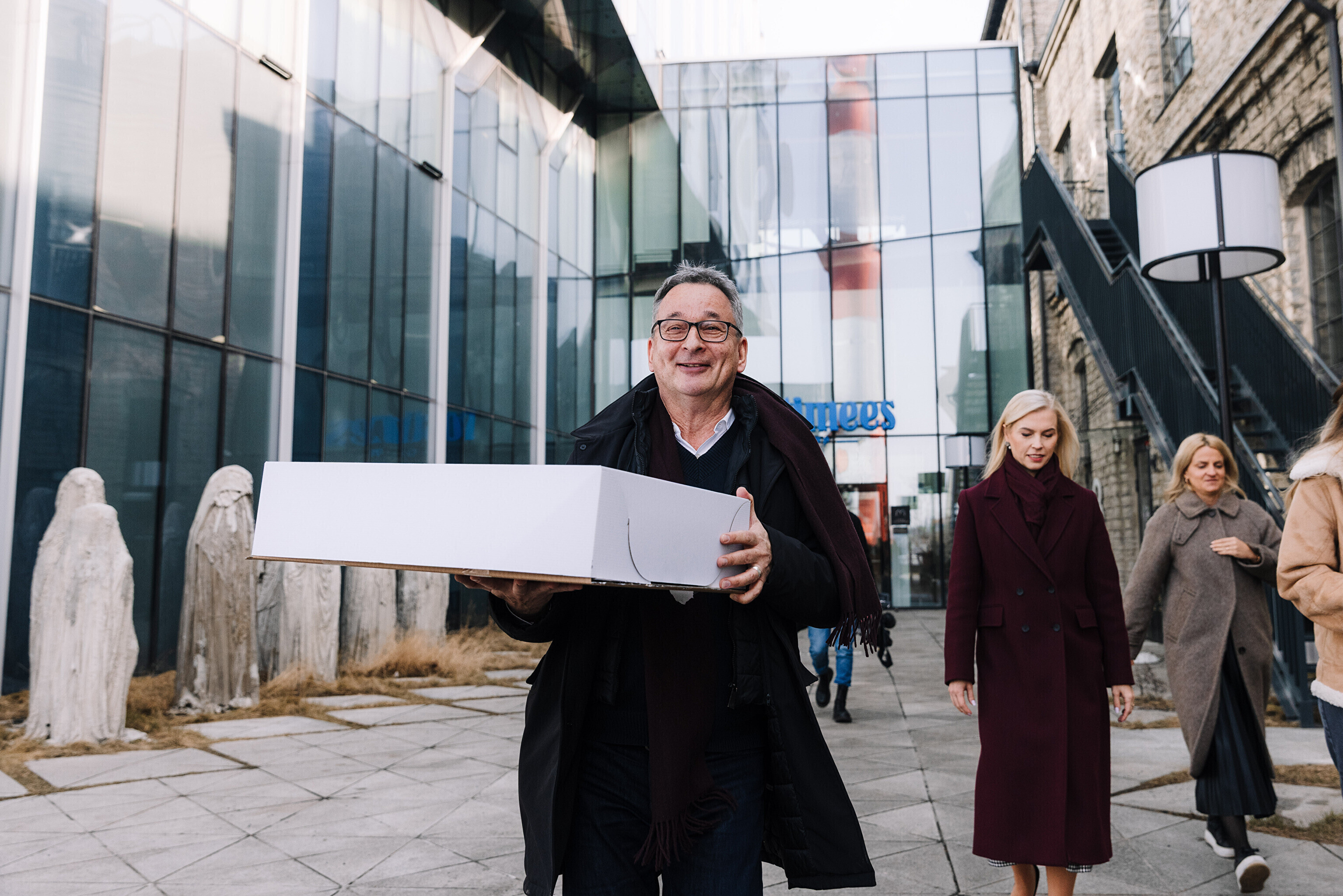 В честь 70-летия "Актуальной камеры" руководитель телевизионных новостей Лийзу Лассь и редактор-ведущий Маргус Саар доставили праздничный торт в редакции Delfi, Postimees, Õhtuleht, Kanal 2 и TV3.