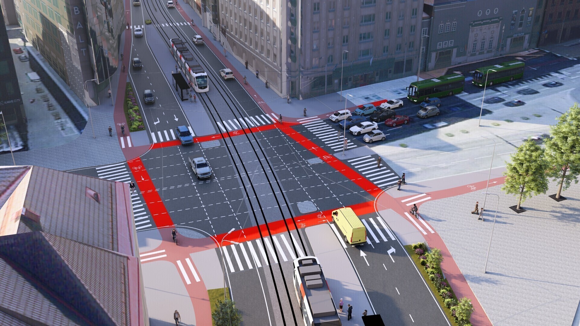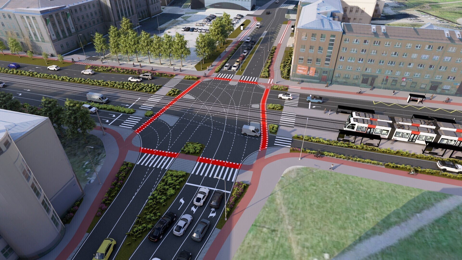 Также планируется создать выделенные коридоры и остановки общественного транспорта, где будут останавливаться как автобусы, так и трамваи. Это необходимо для того, чтобы общественный транспорт мог двигаться быстрее и более равномерно.
