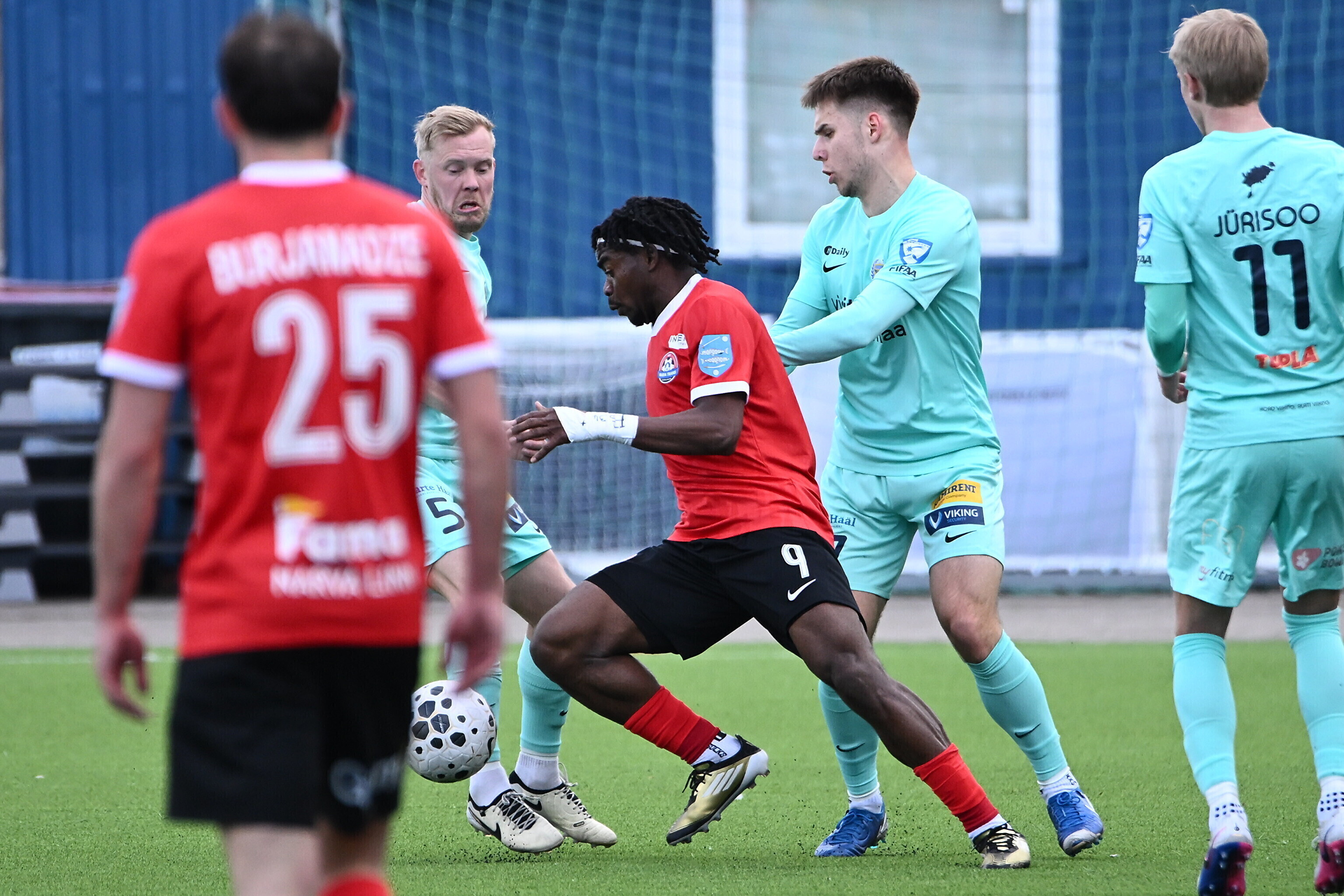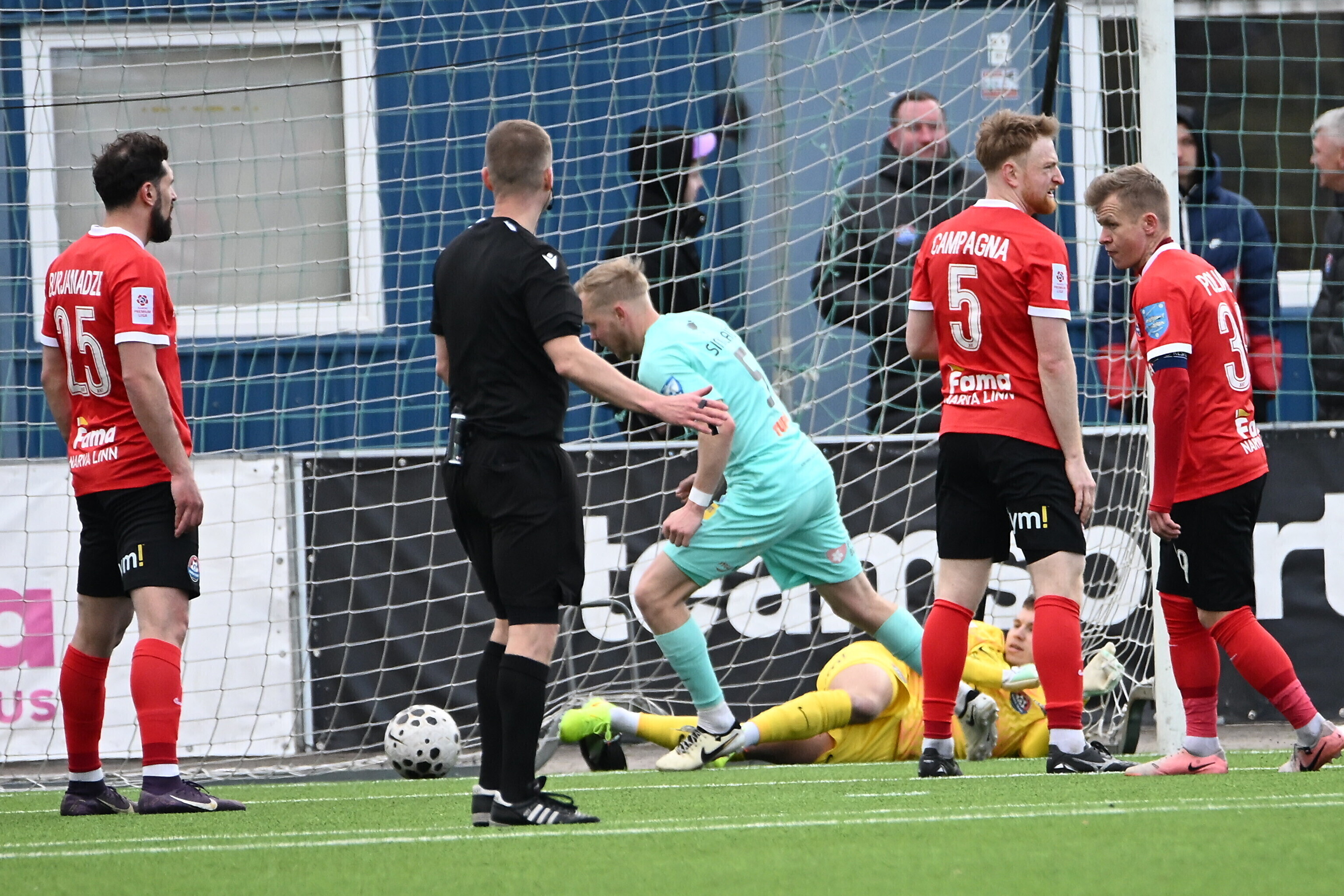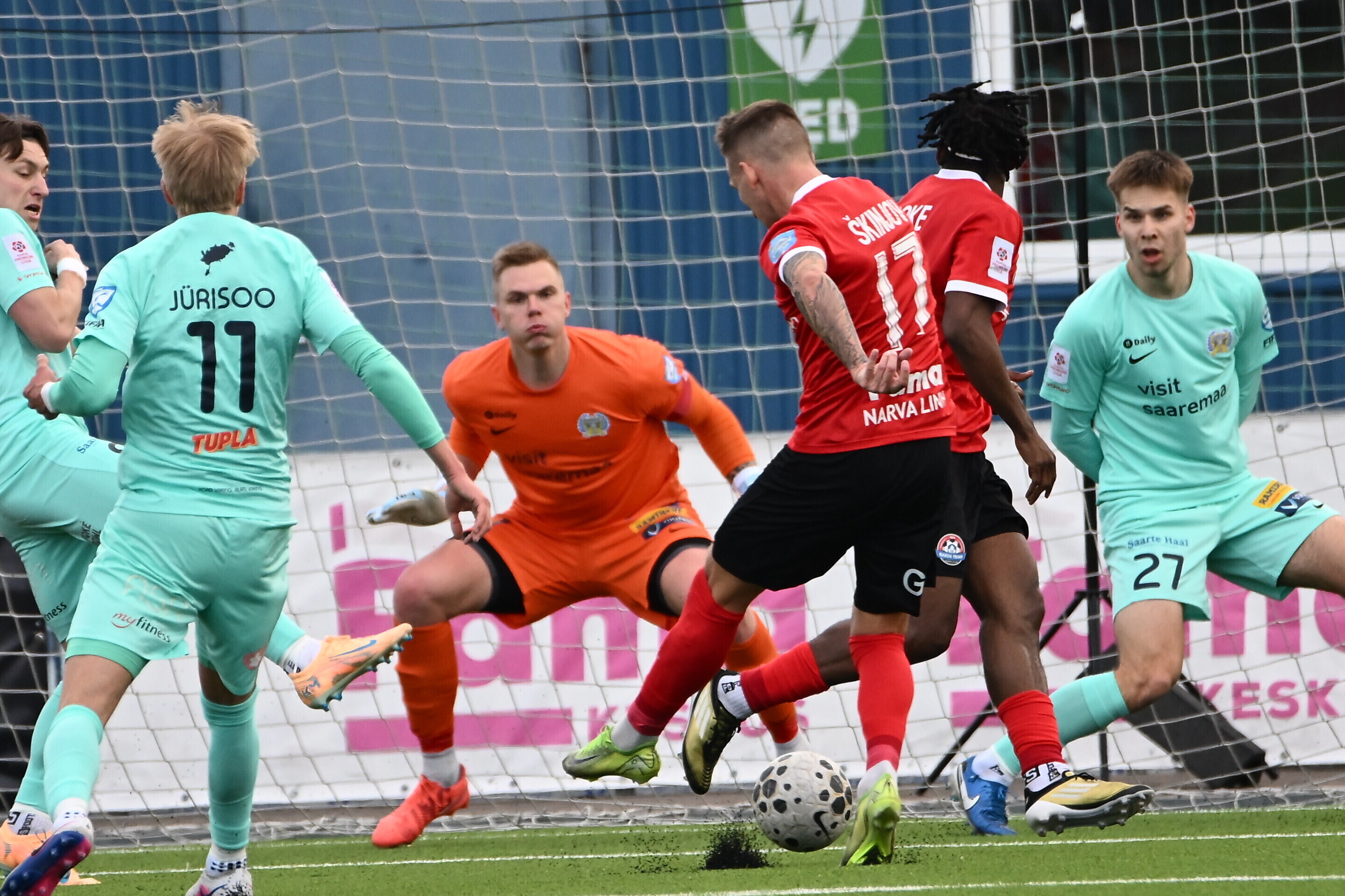 Счет в поединке, прошедшем на стадионе "Калев-Фама", на 15-й минуте открыл футболист гостей Андеро Киви, который воспользовался разрезающим пасом в штрафную. Незадолго до перерыва хозяева отыгрались: после розыгрыша углового Шалва Буржанадзе точным ударом головы замкнул навес.