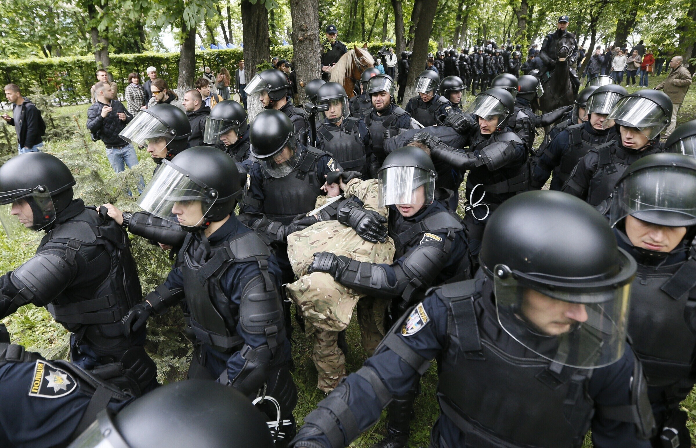 По окончанию акции полиция Киева сообщила о задержании 24 человек в офисе ОУН, которые и забрасывали через окна участников акции. Кроме того, подчеркнули в полиции, задержан еще один человек, пытавшийся развернуть баннер "с советской символикой". По факту инцидентов возле офиса ОУН начато уголовное производство, сообщил директор департамента коммуникаций МВД Украины Артем Шевченко.