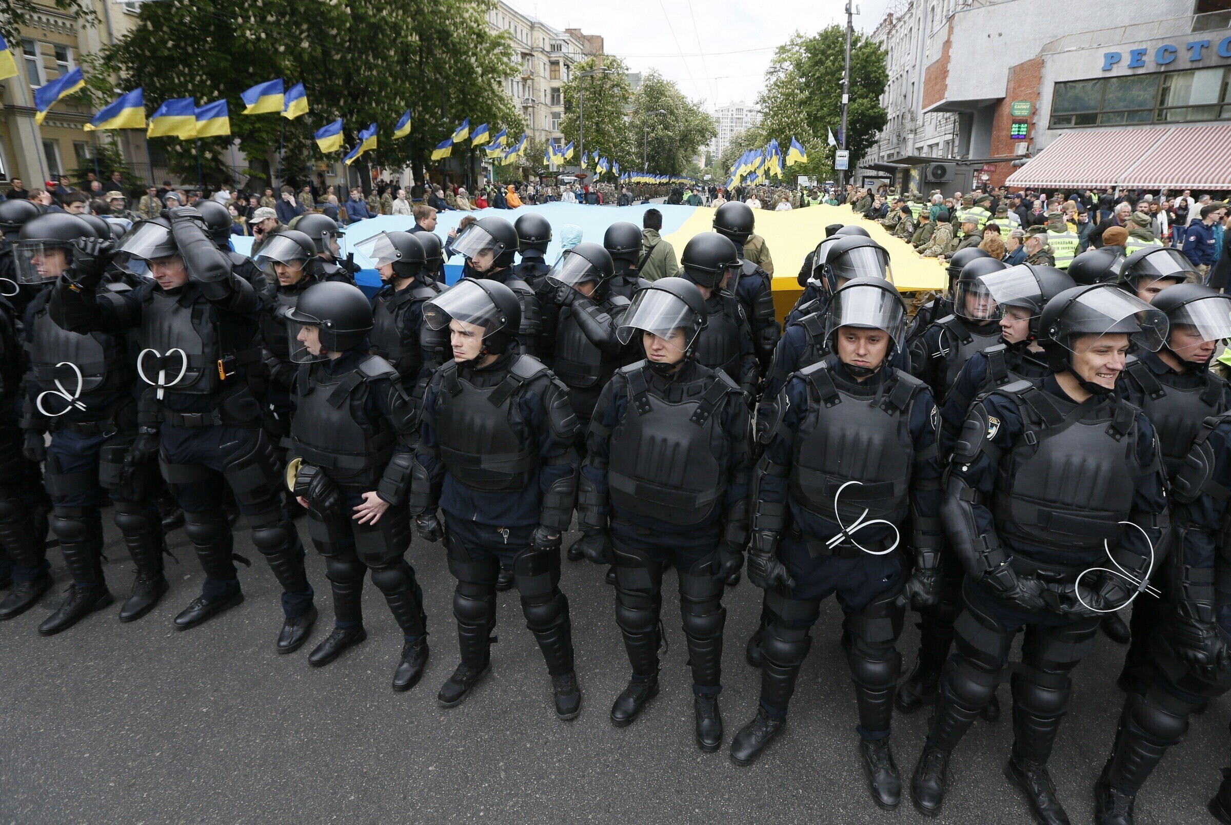 По данным полиции, в колонне было около трех тысяч человек, организаторы заявили о 20 000 участников. С двух сторон колонну держали в оцеплении военнослужащие и полиция. Ее сопровождали представители организации украинских националистов (ОУН) с портретом своего лидера Степана Бандеры и лозунгом "Бандера придет — порядок наведет".