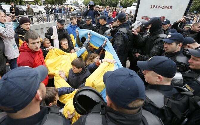 После прохождения колонны проукраинские активисты развернули огромный украинский флаг и стали скандировать "Бандера и Шухевич — герои Украины" и "Украина превыше всего".
