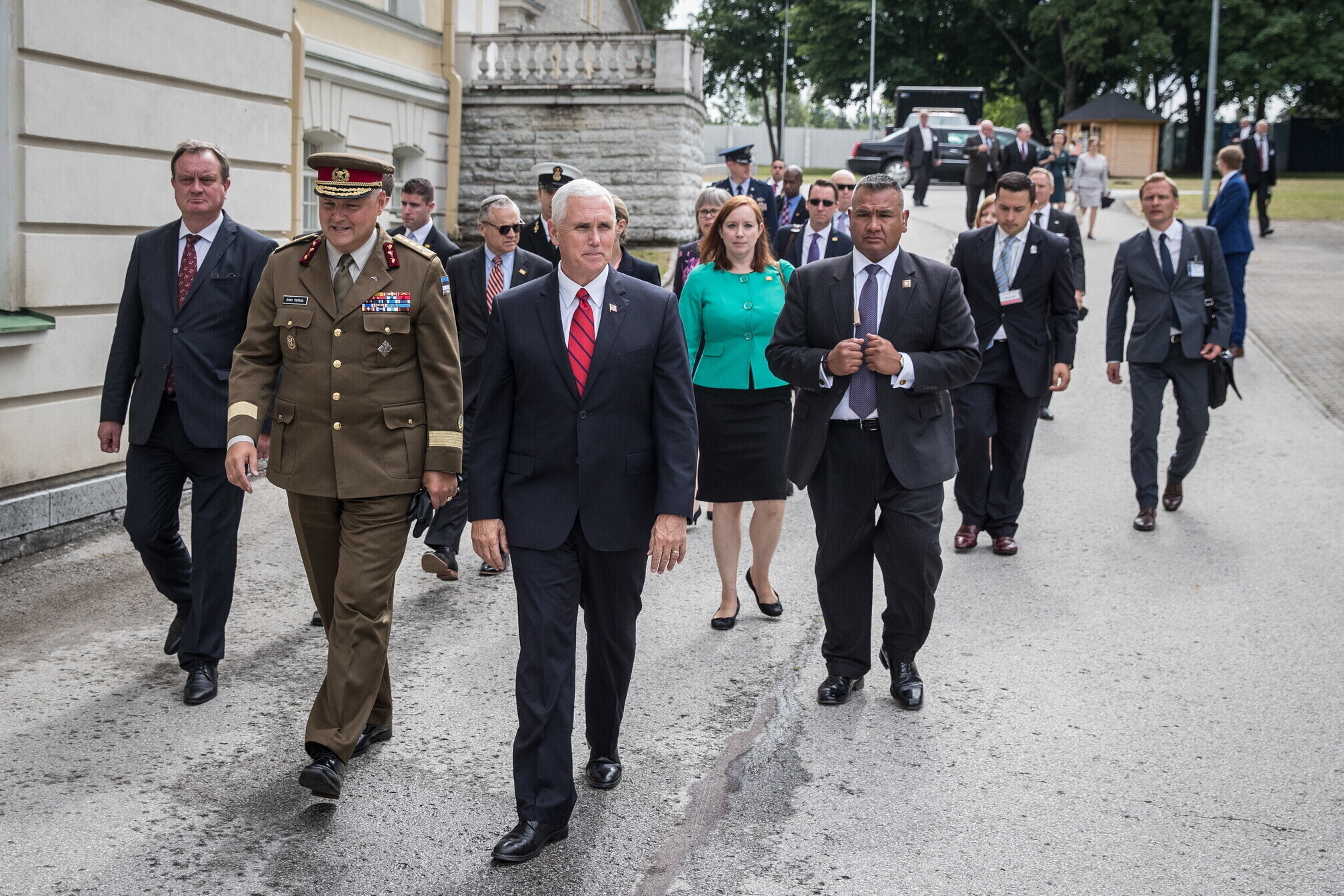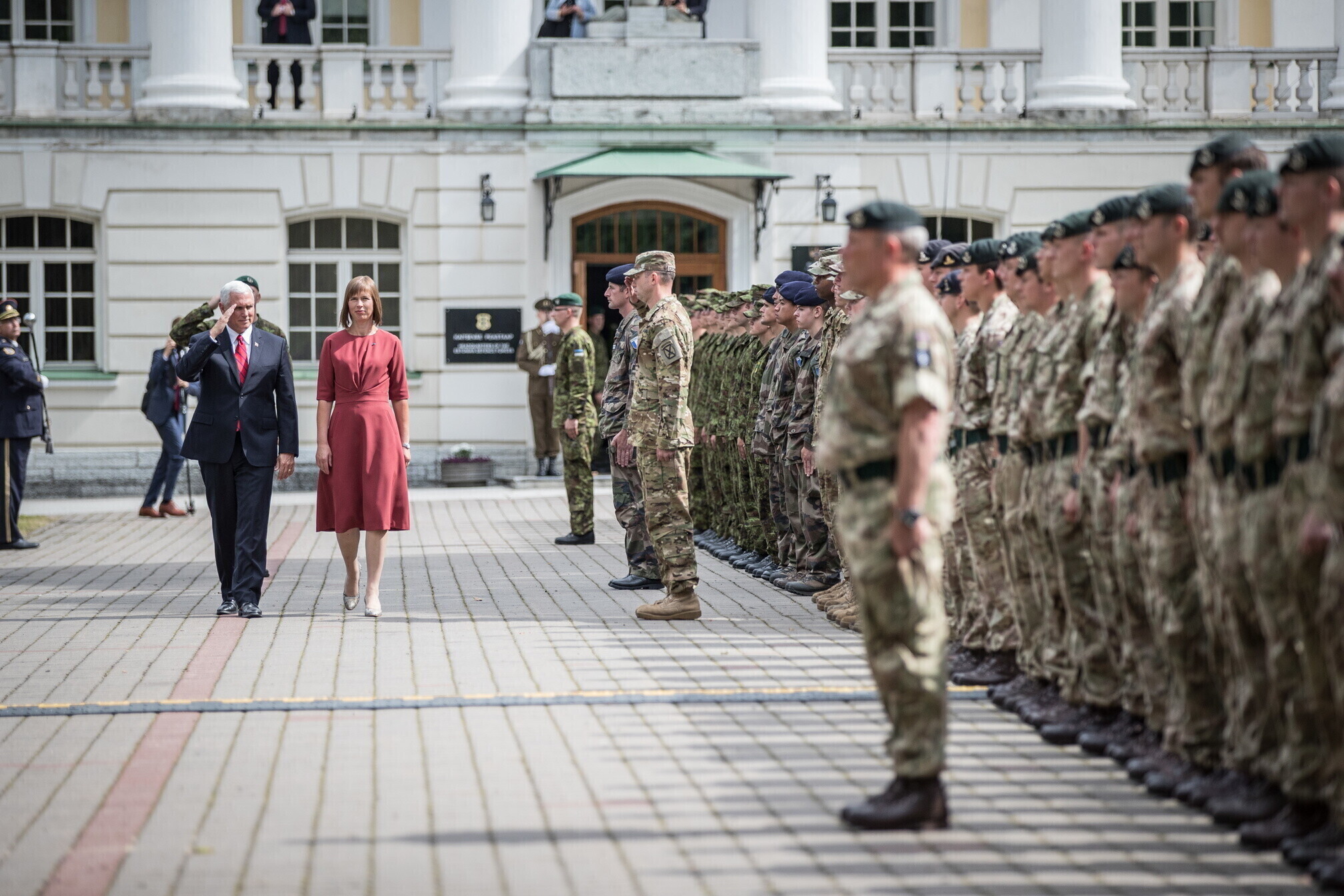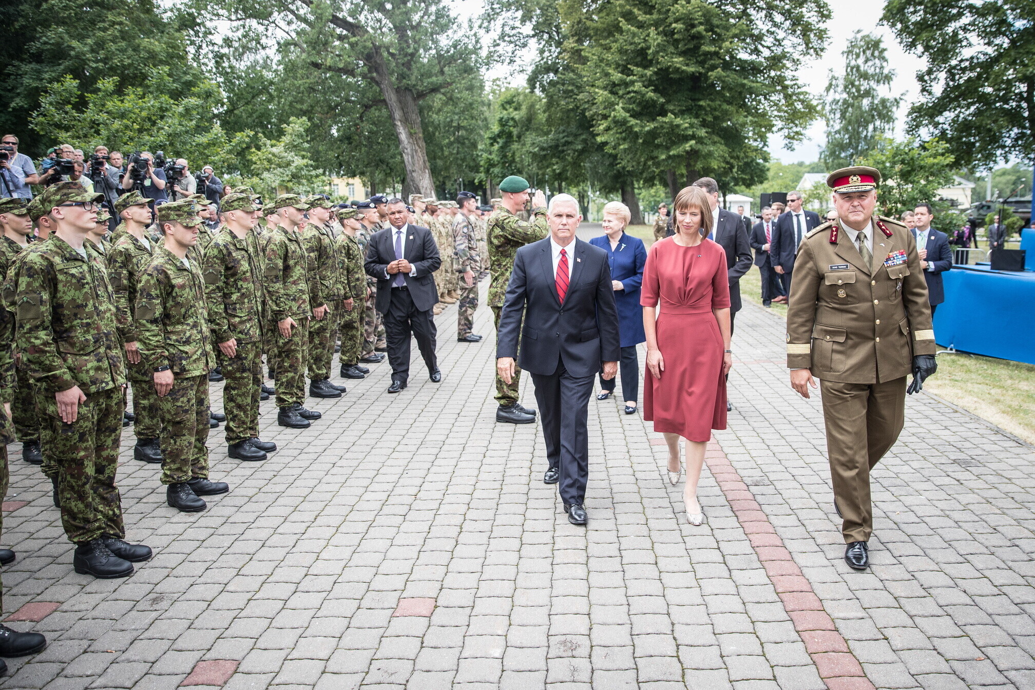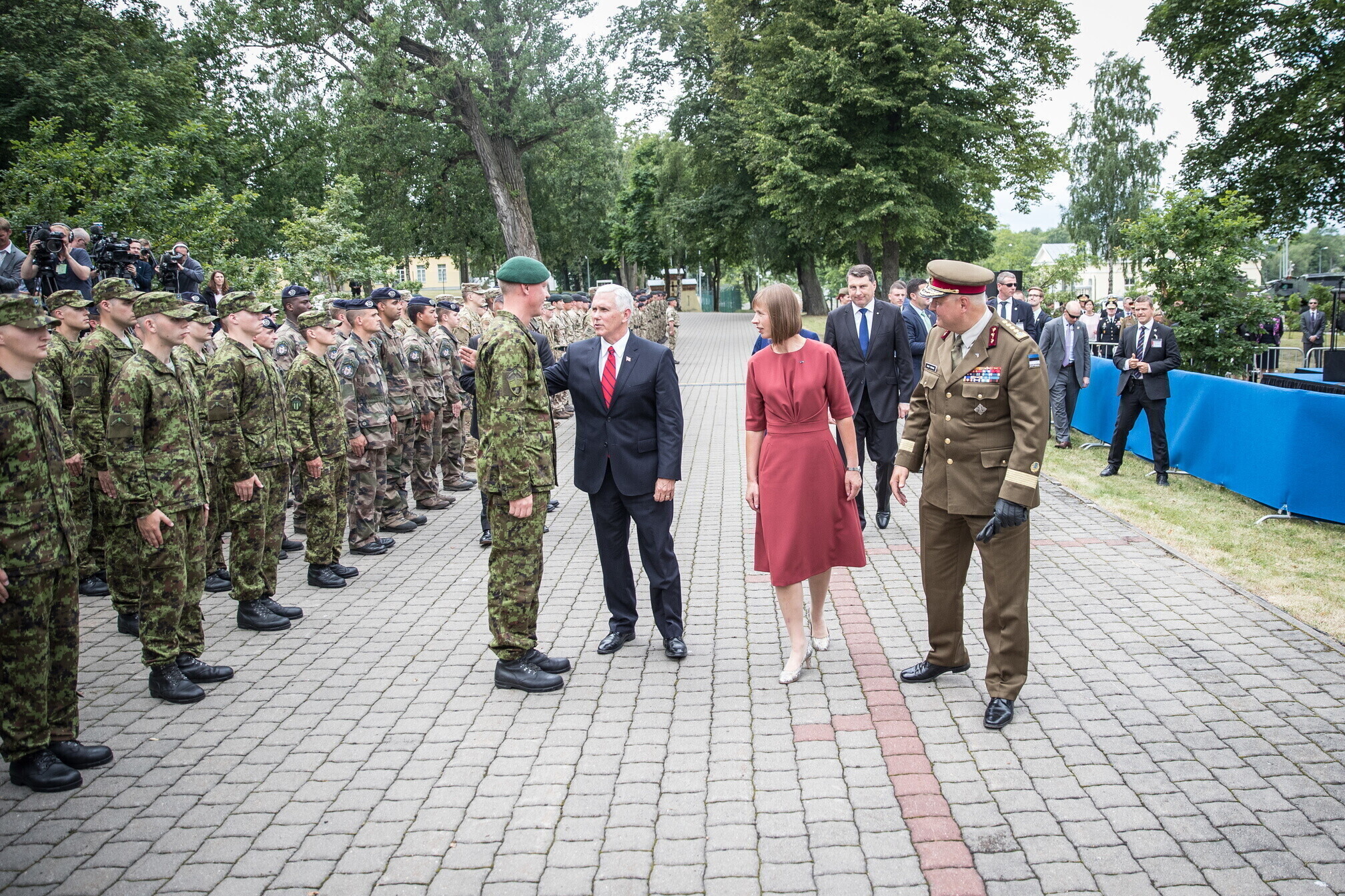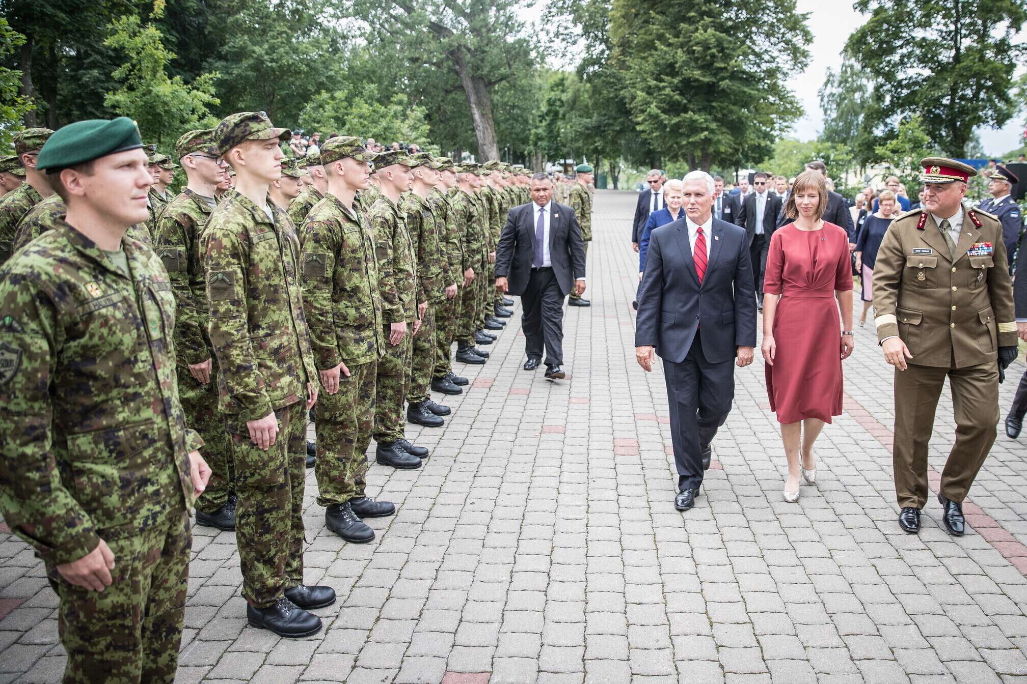Вице-президент США Майк Пенс с командующим Силами обороны Эстонии Рихо Террасом и премьер-министром Юри Ратасом в понедельник принял участие в построении размещенных в Эстонии военнослужащих НАТО и эстонских военных. В своей речи он подтвердил приверженность США статье 5 Североатлантического договора о коллективной обороне.