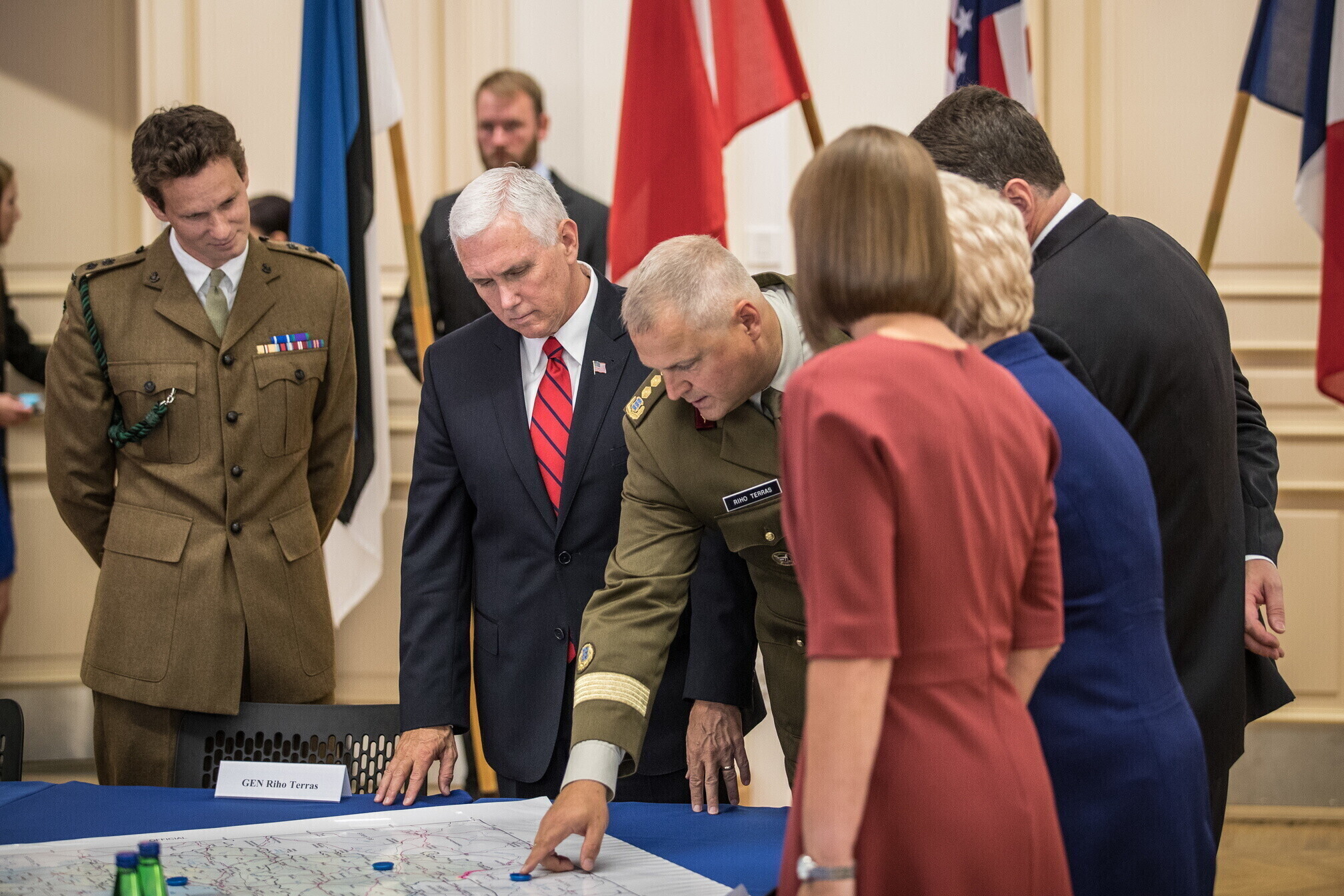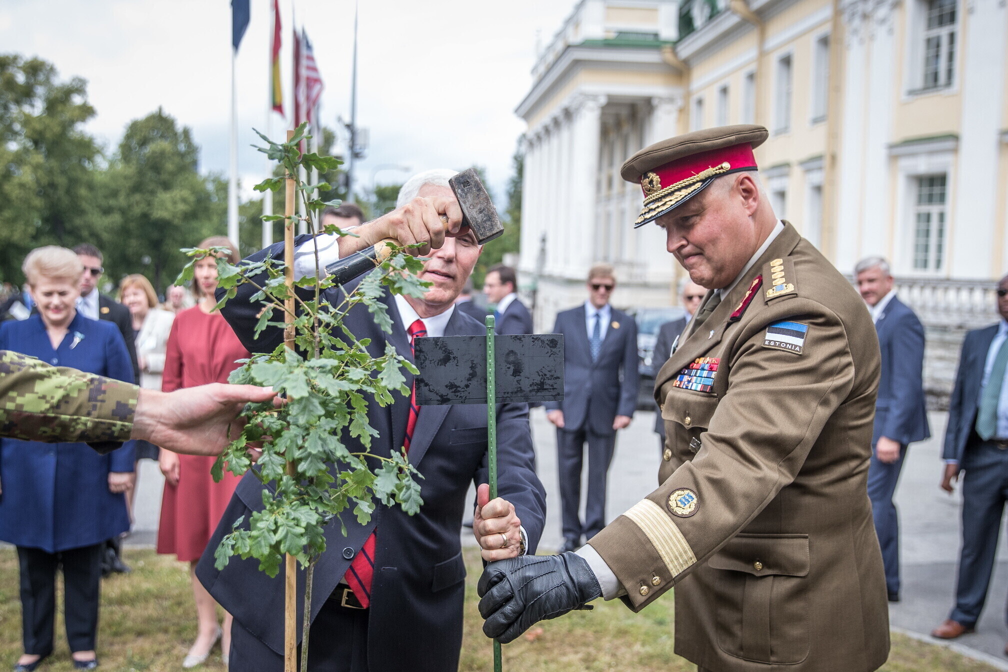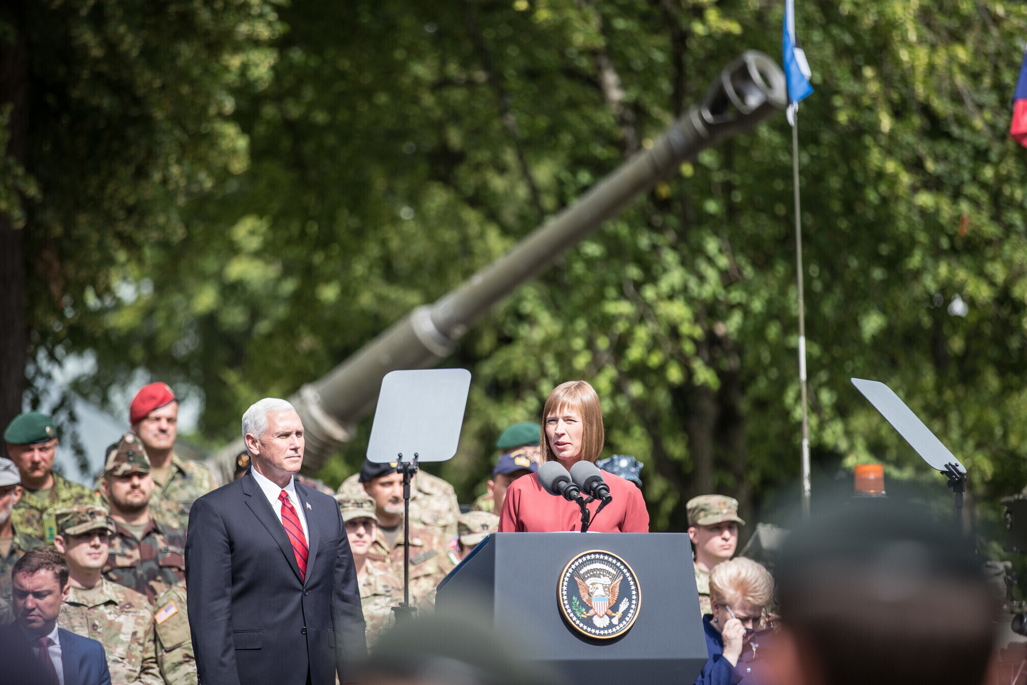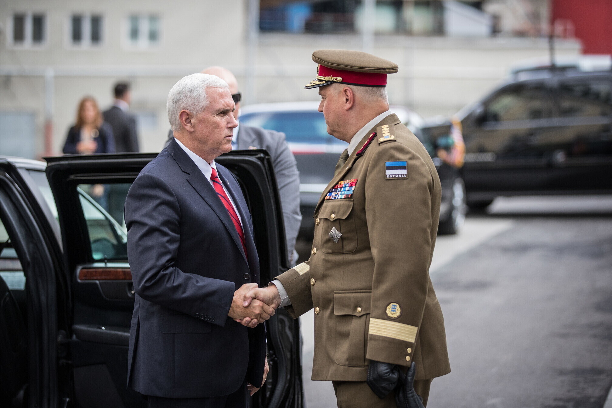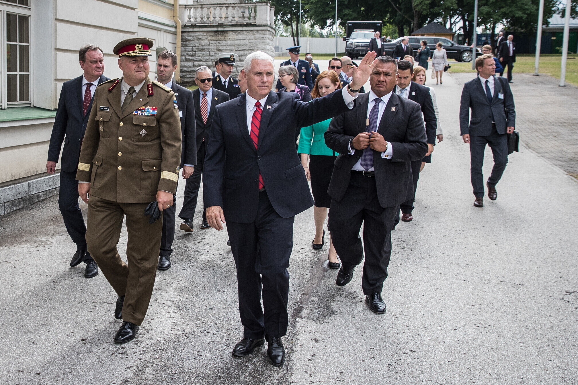 Вице-президент США Майк Пенс с командующим Силами обороны Эстонии Рихо Террасом и премьер-министром Юри Ратасом в понедельник принял участие в построении размещенных в Эстонии военнослужащих НАТО и эстонских военных. В своей речи он подтвердил приверженность США статье 5 Североатлантического договора о коллективной обороне.