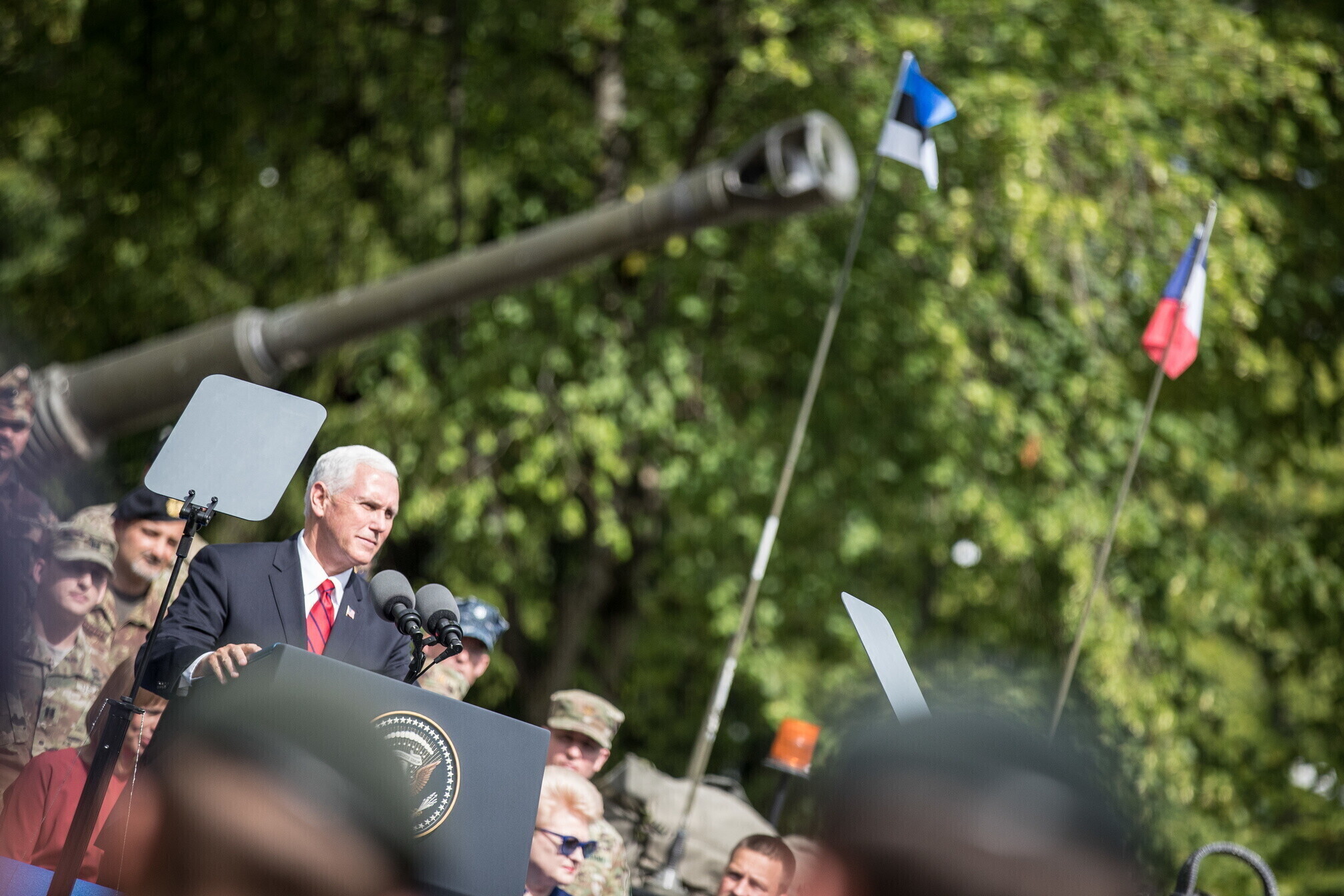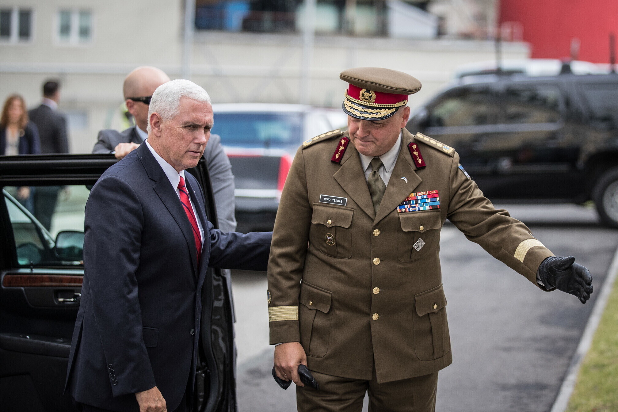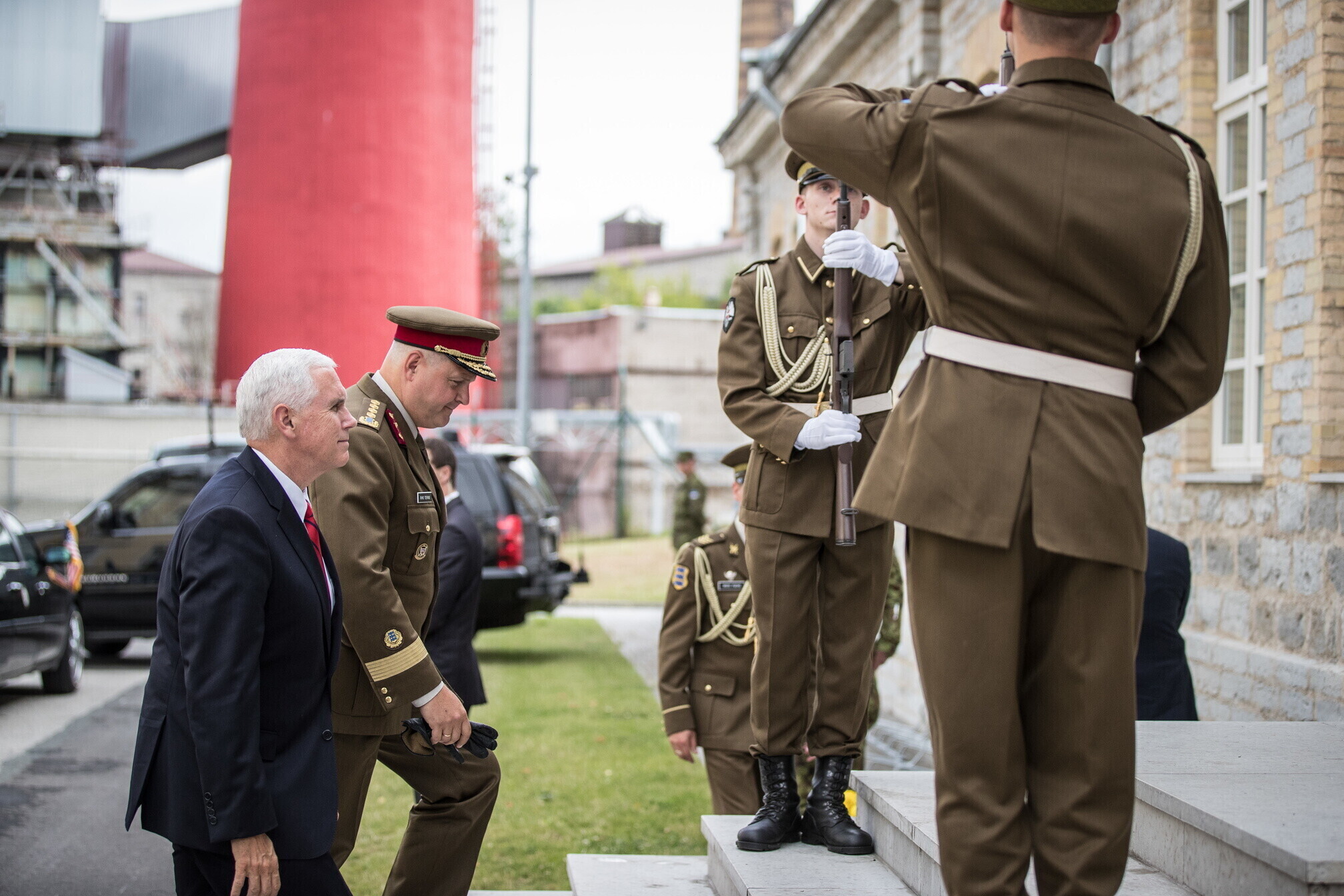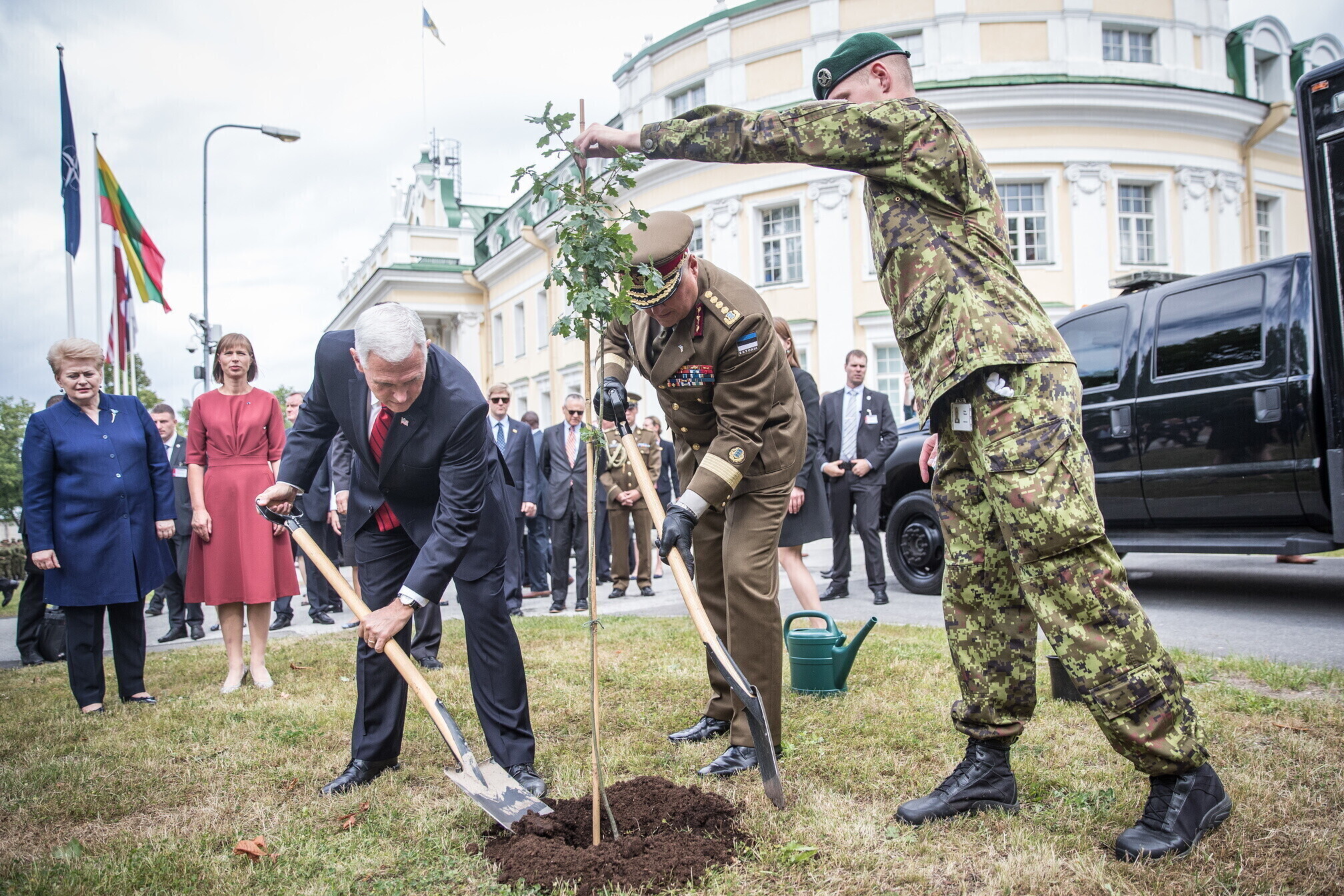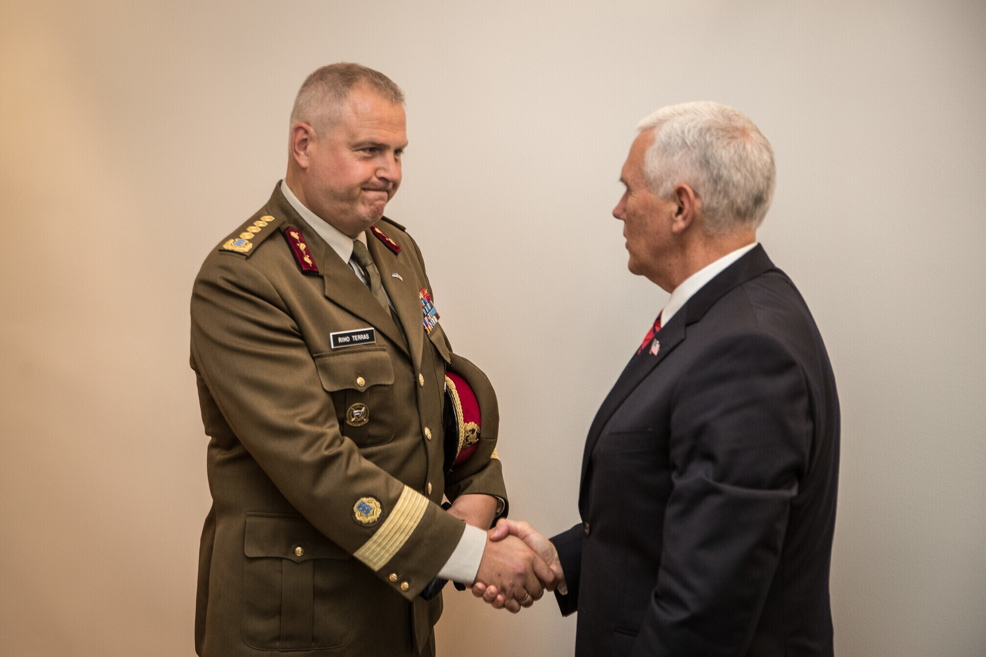 Вице-президент США Майк Пенс с командующим Силами обороны Эстонии Рихо Террасом и премьер-министром Юри Ратасом в понедельник принял участие в построении размещенных в Эстонии военнослужащих НАТО и эстонских военных. В своей речи он подтвердил приверженность США статье 5 Североатлантического договора о коллективной обороне.