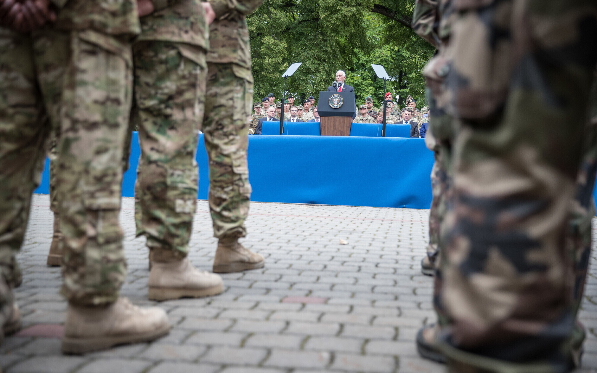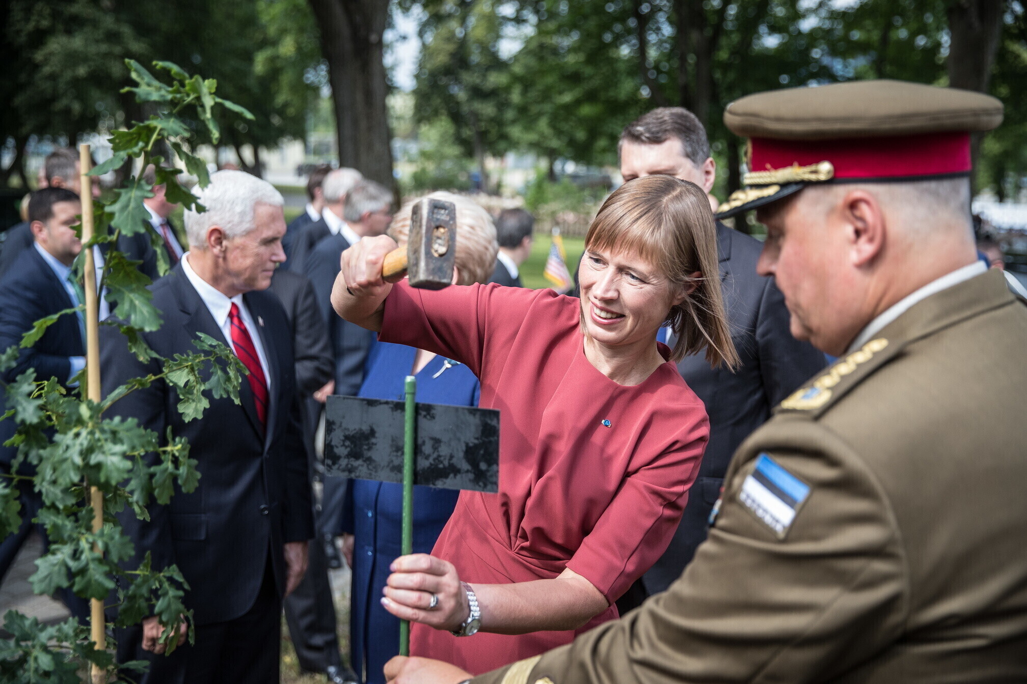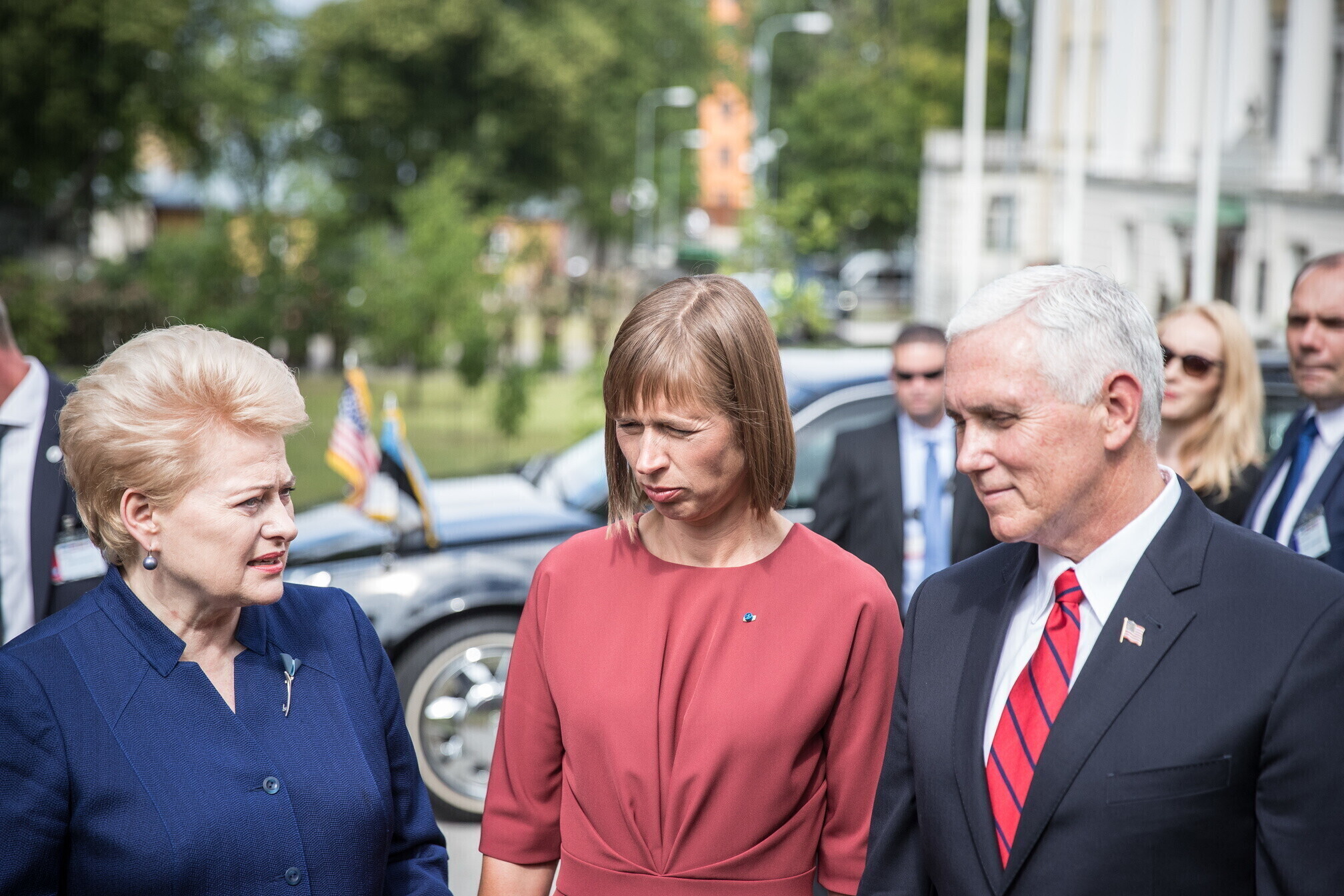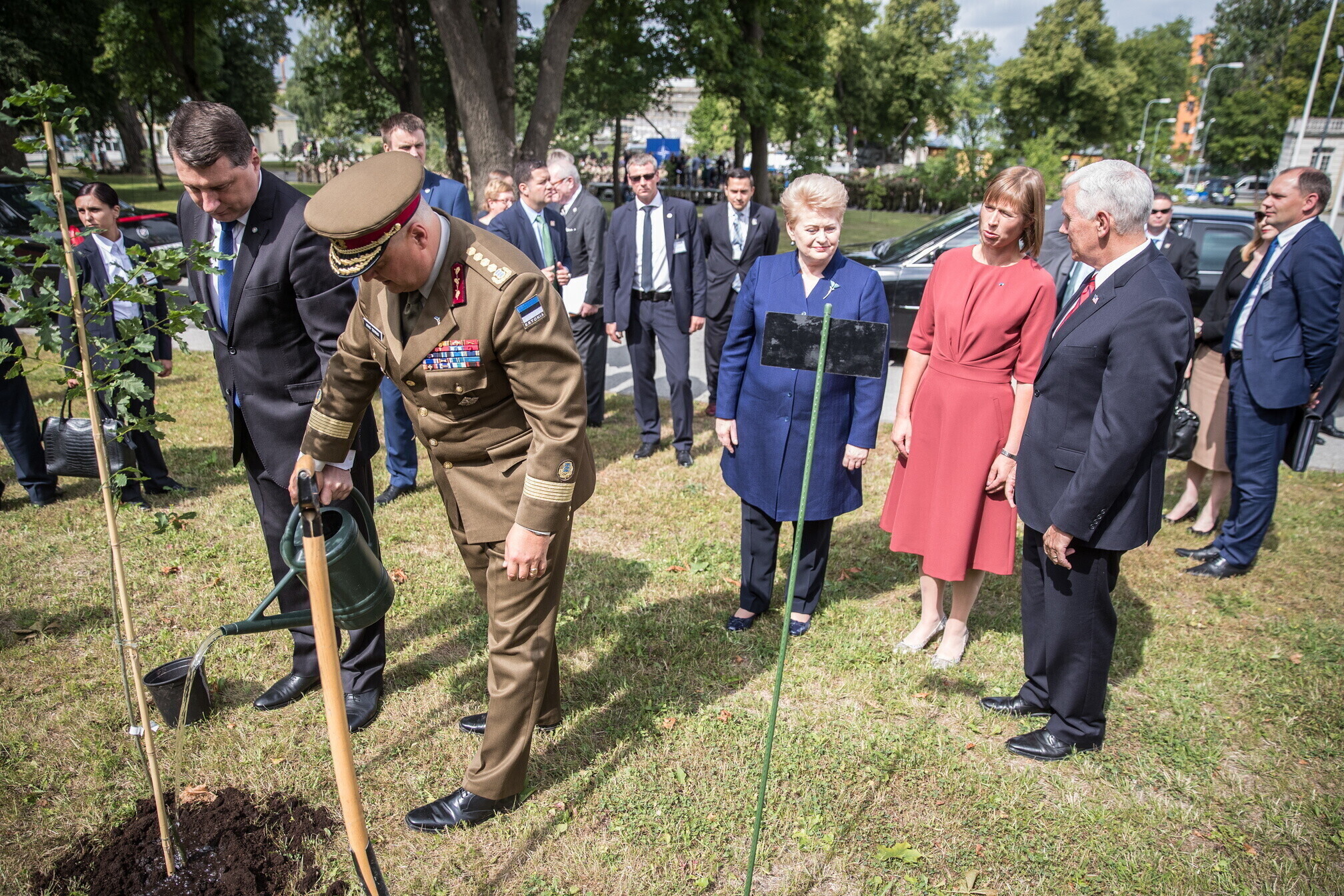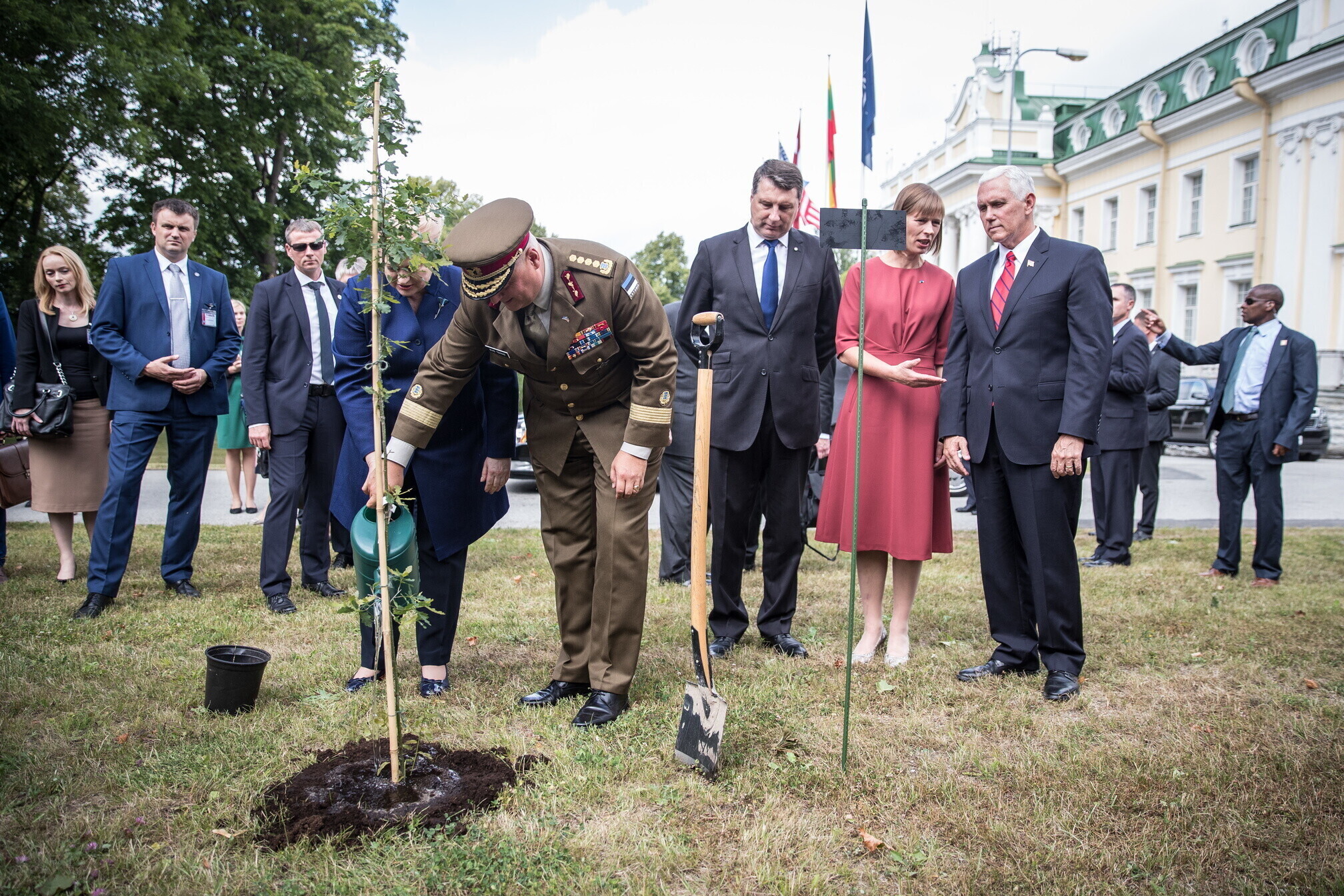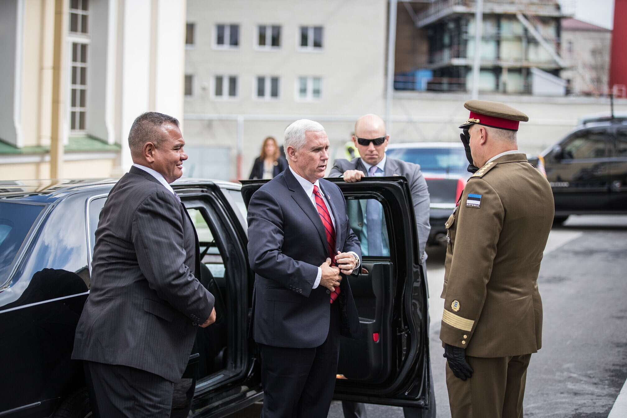 Вице-президент США Майк Пенс с командующим Силами обороны Эстонии Рихо Террасом и премьер-министром Юри Ратасом в понедельник принял участие в построении размещенных в Эстонии военнослужащих НАТО и эстонских военных. В своей речи он подтвердил приверженность США статье 5 Североатлантического договора о коллективной обороне.