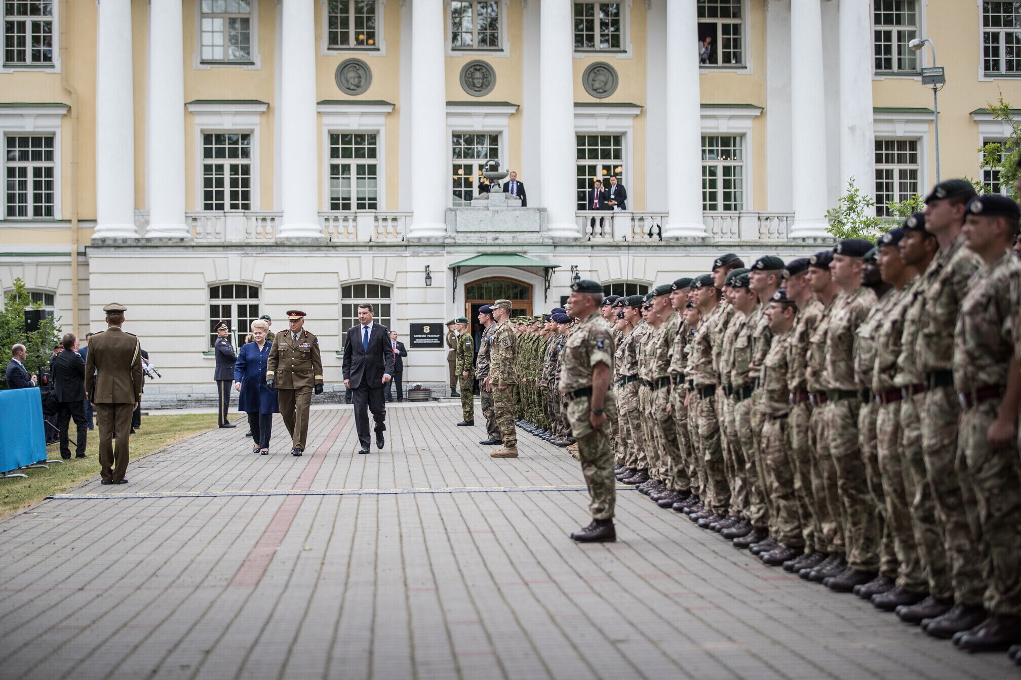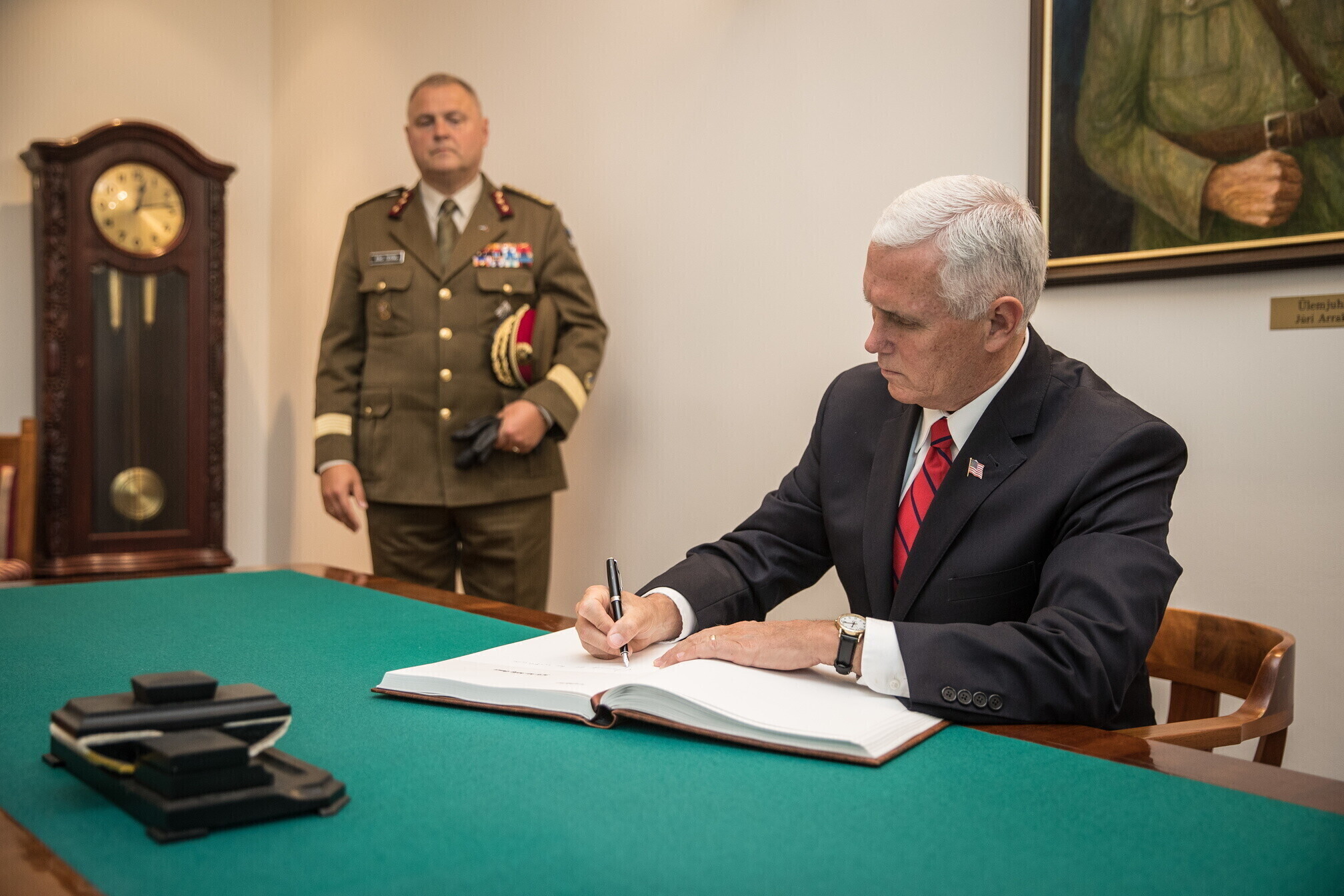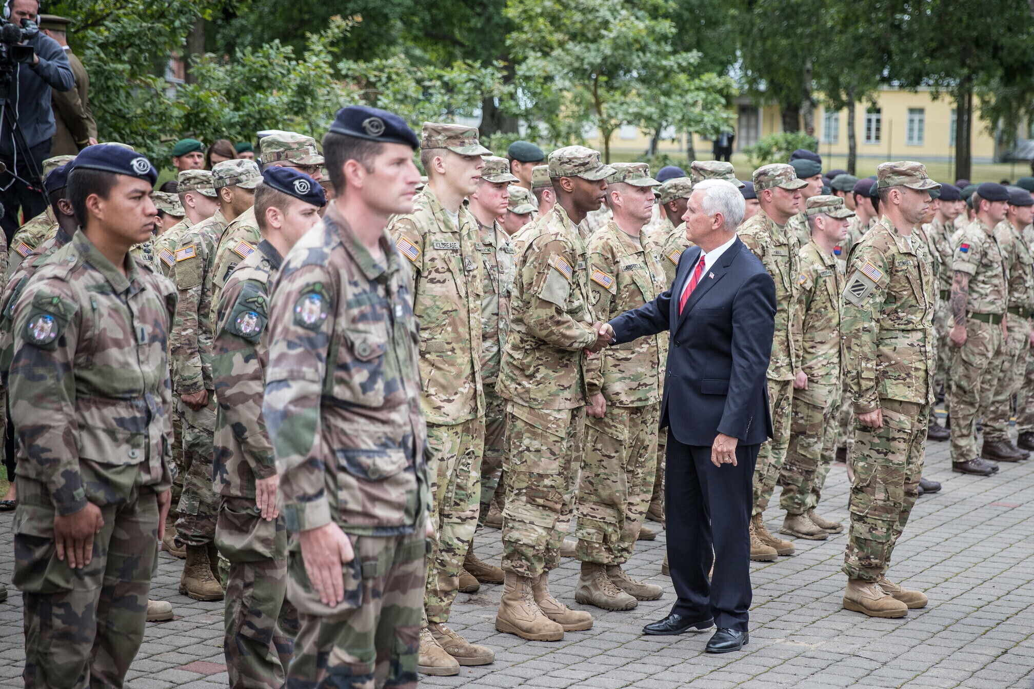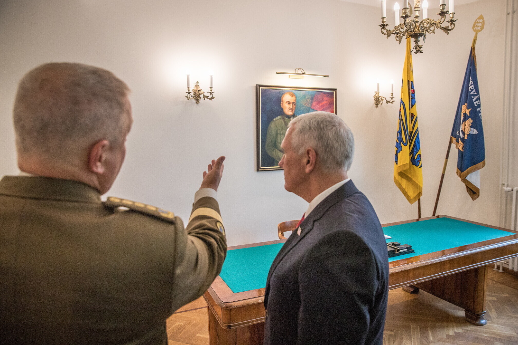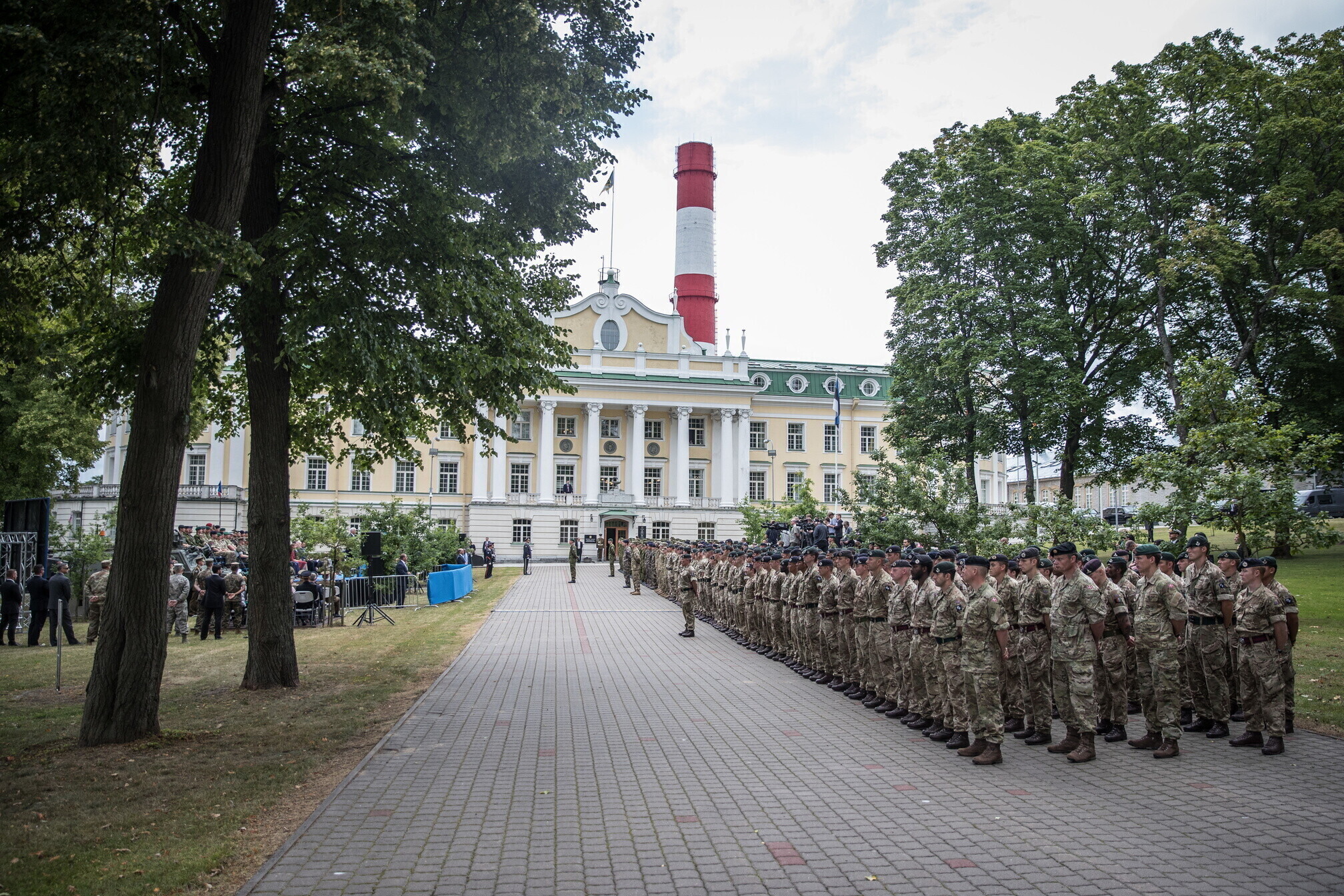 Вице-президент США Майк Пенс с командующим Силами обороны Эстонии Рихо Террасом и премьер-министром Юри Ратасом в понедельник принял участие в построении размещенных в Эстонии военнослужащих НАТО и эстонских военных. В своей речи он подтвердил приверженность США статье 5 Североатлантического договора о коллективной обороне.
